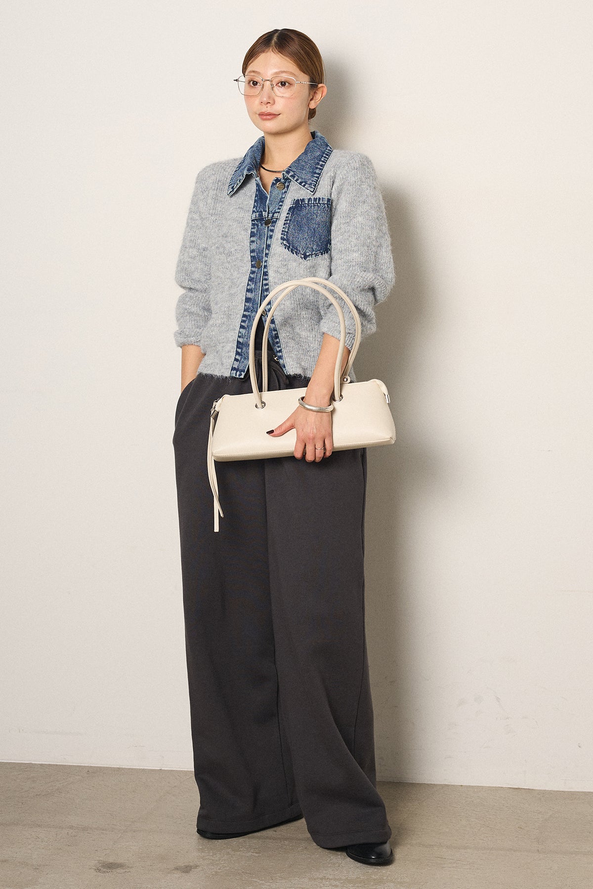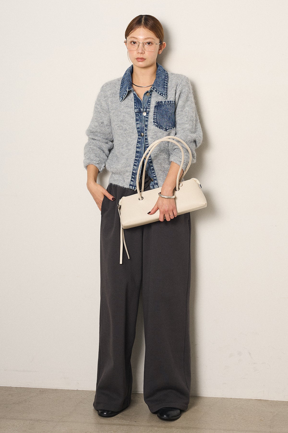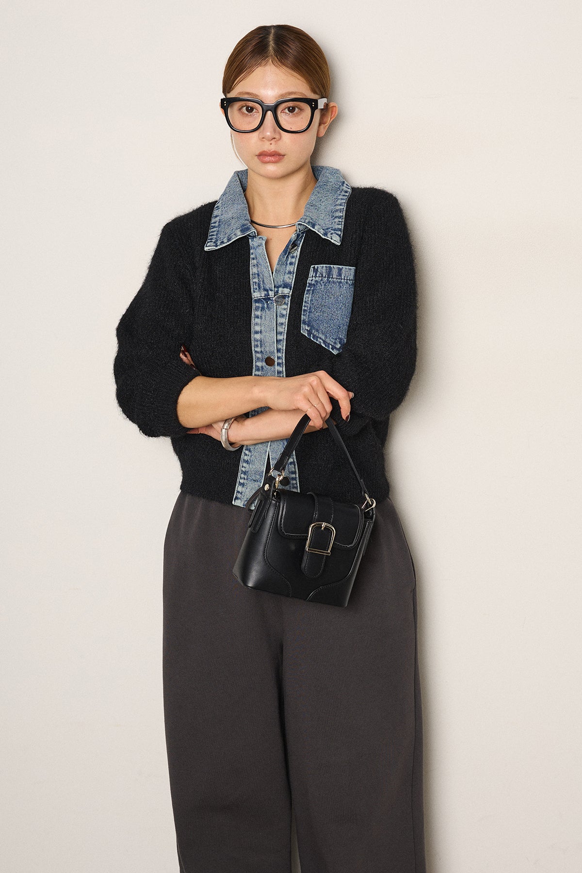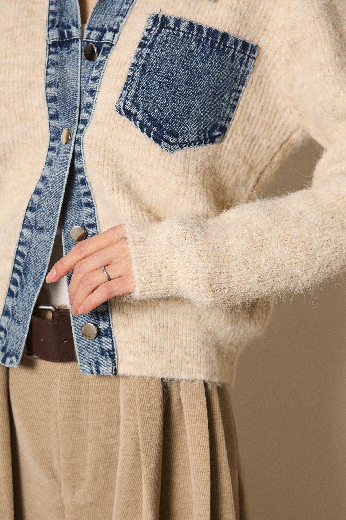 襟・前立て・胸ポケットにデニムを切り替えた、カーディガンとシャツの良さを一枚で楽しめるデザイン。ニットの柔らかさにデニムのアクセントが映え、シンプルに羽織るだけで存在感のあるスタイリングに。フロントは開けても閉めてもバランス良く着られ、ボトムにタックパンツやロングスカートを合わせるとこなれたムードに仕上がります。普段のニットに変化を付けたい日に取り入れたい一着です。」