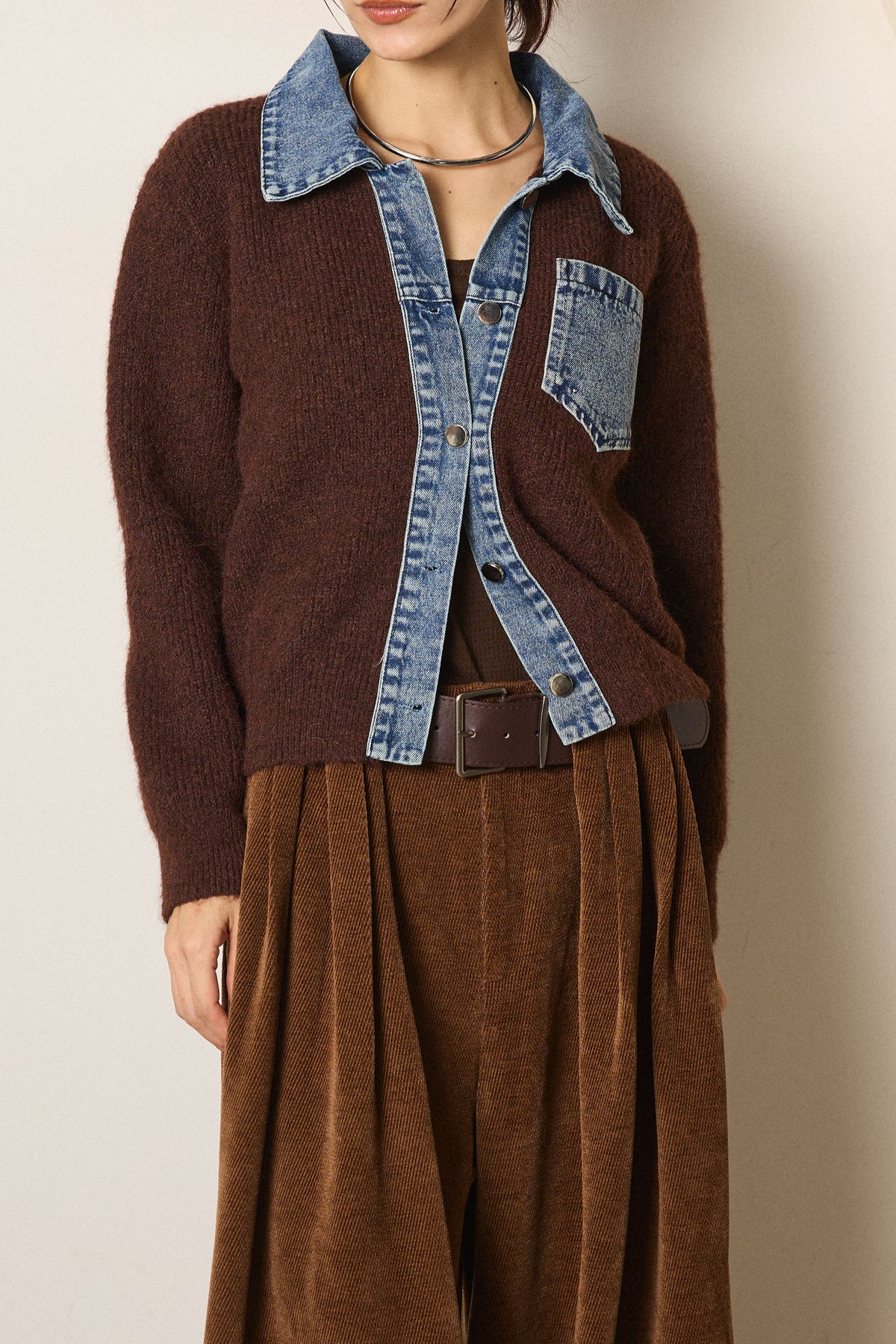 ◆ 襟付きデニム切替ニットカーディガン