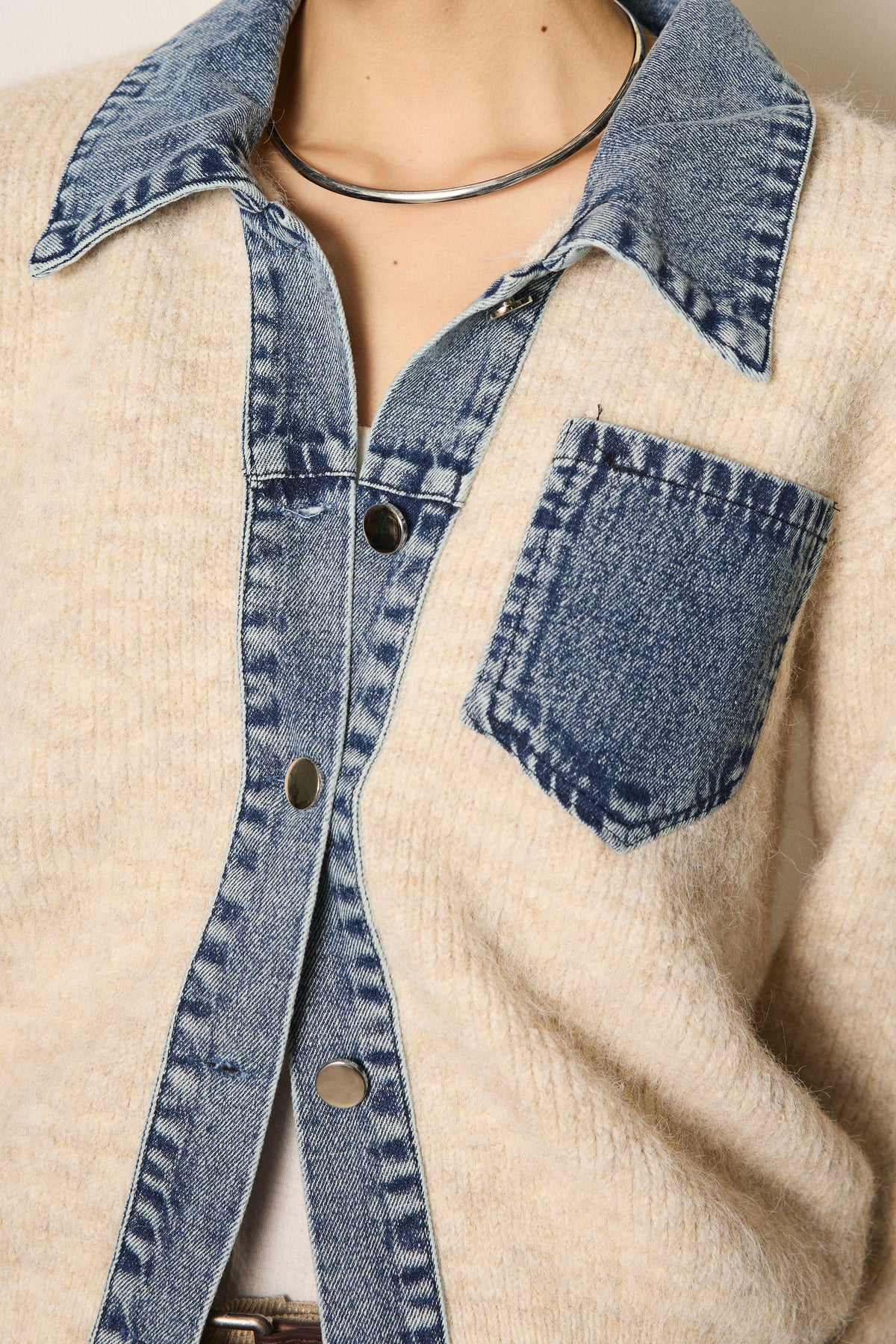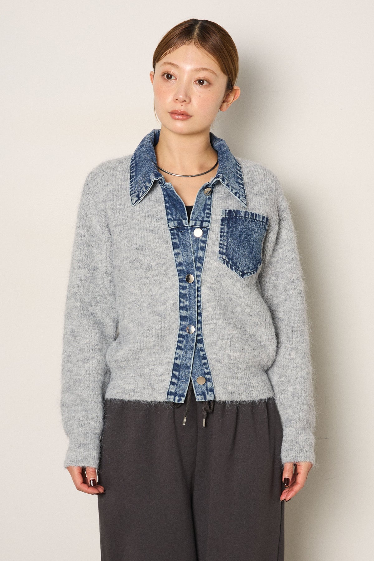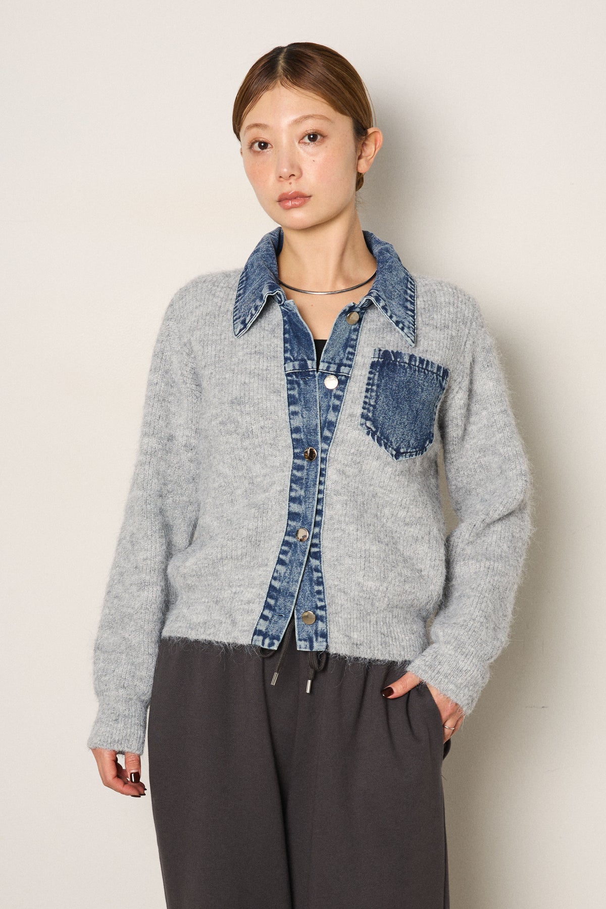 襟付きデニム切替ニットカーディガン