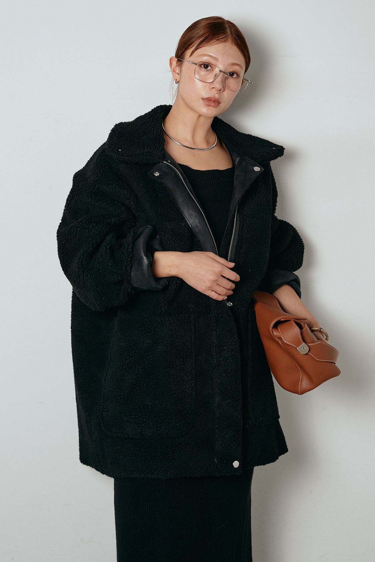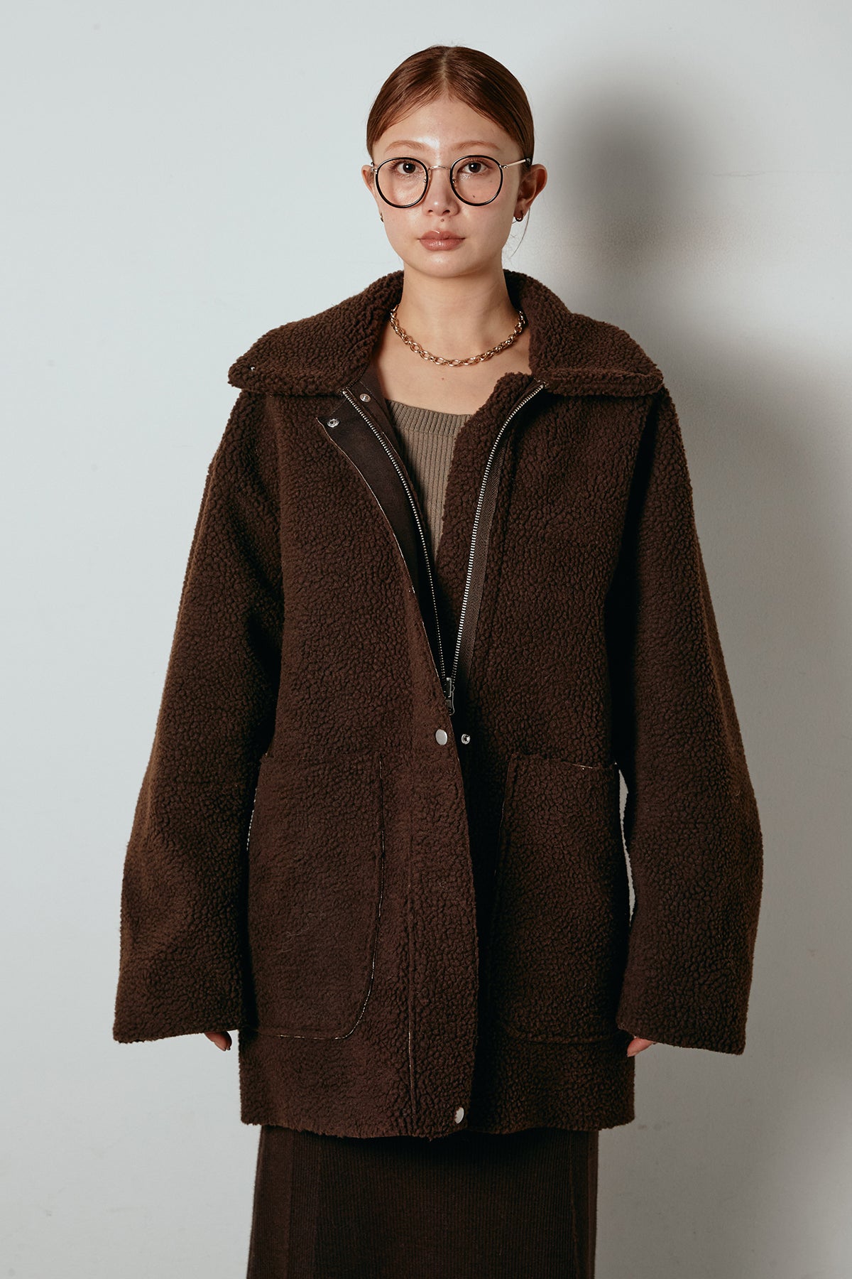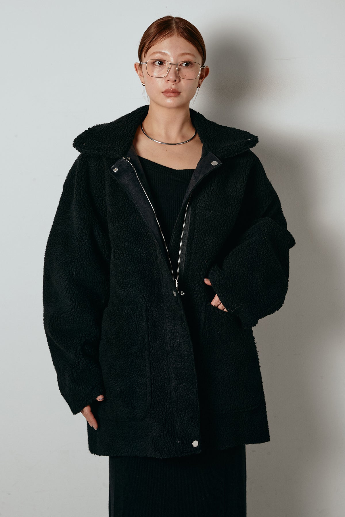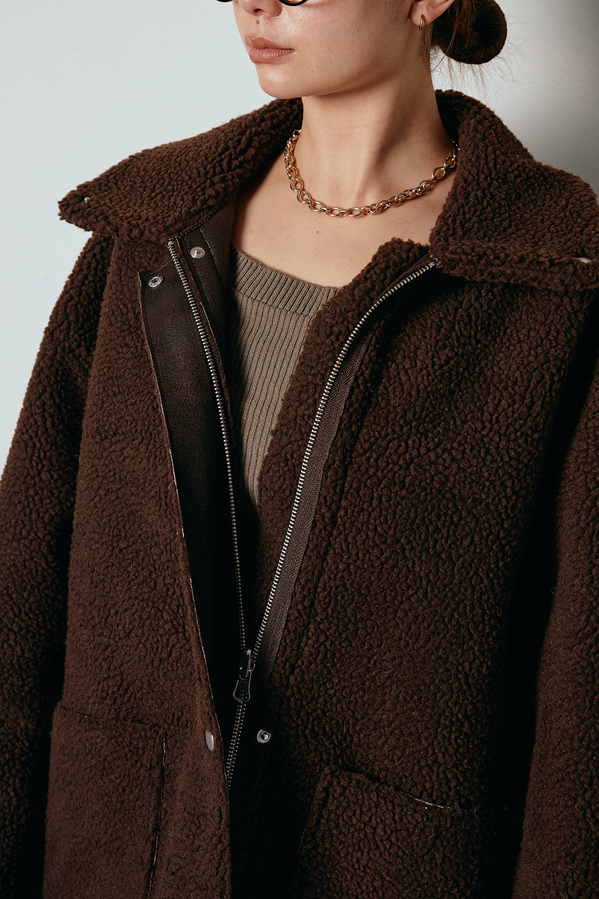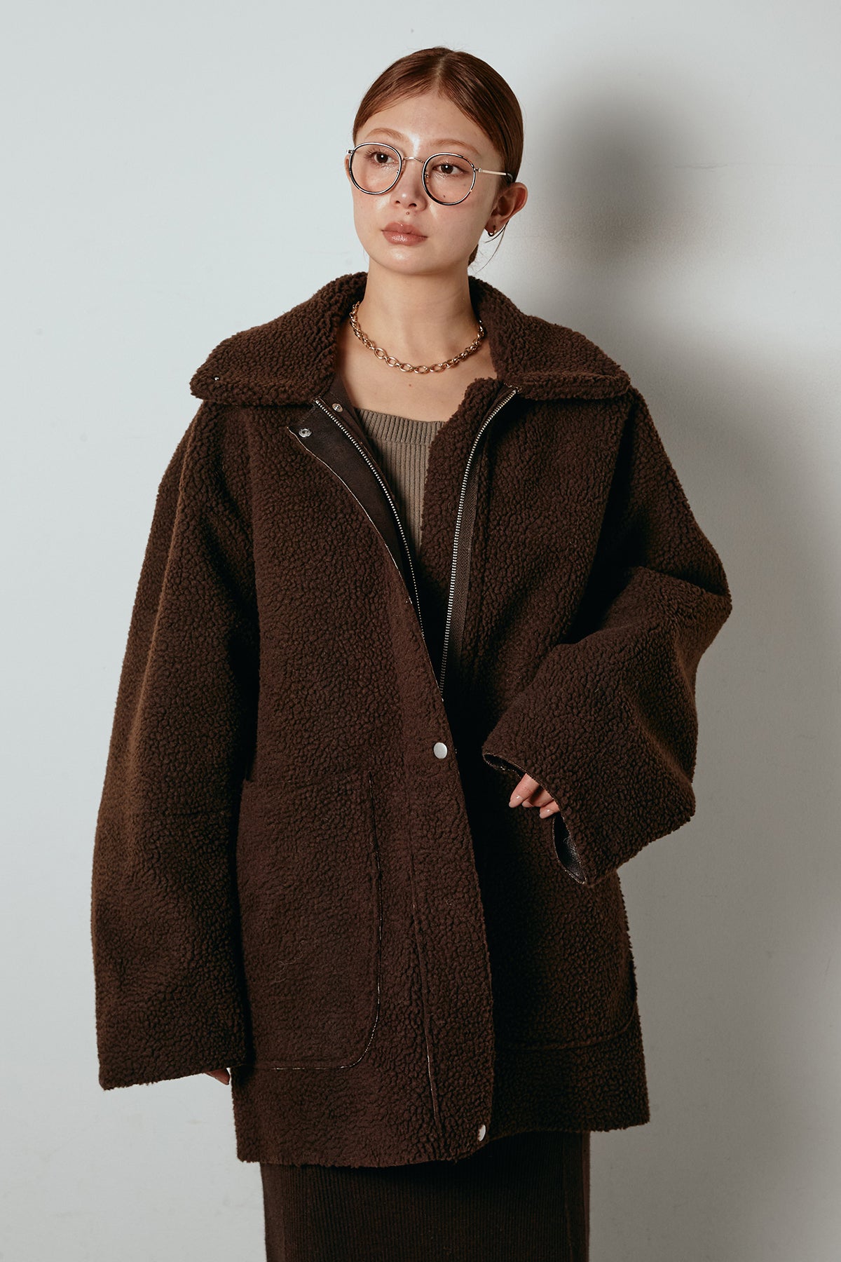 ふんわりと暖かなボア面と、滑らかな質感のエコムートン面を楽しめるリバーシブルコート。気分やスタイリングに合わせて印象を変えられ、1枚で幅広い着こなしに活躍します。ゆとりのあるシルエットが抜け感をつくりつつ、ジップとスナップで防寒性も確保。ヒップが隠れる着丈でバランスが取りやすく、パンツにもスカートにも合わせやすい万能アウターです。