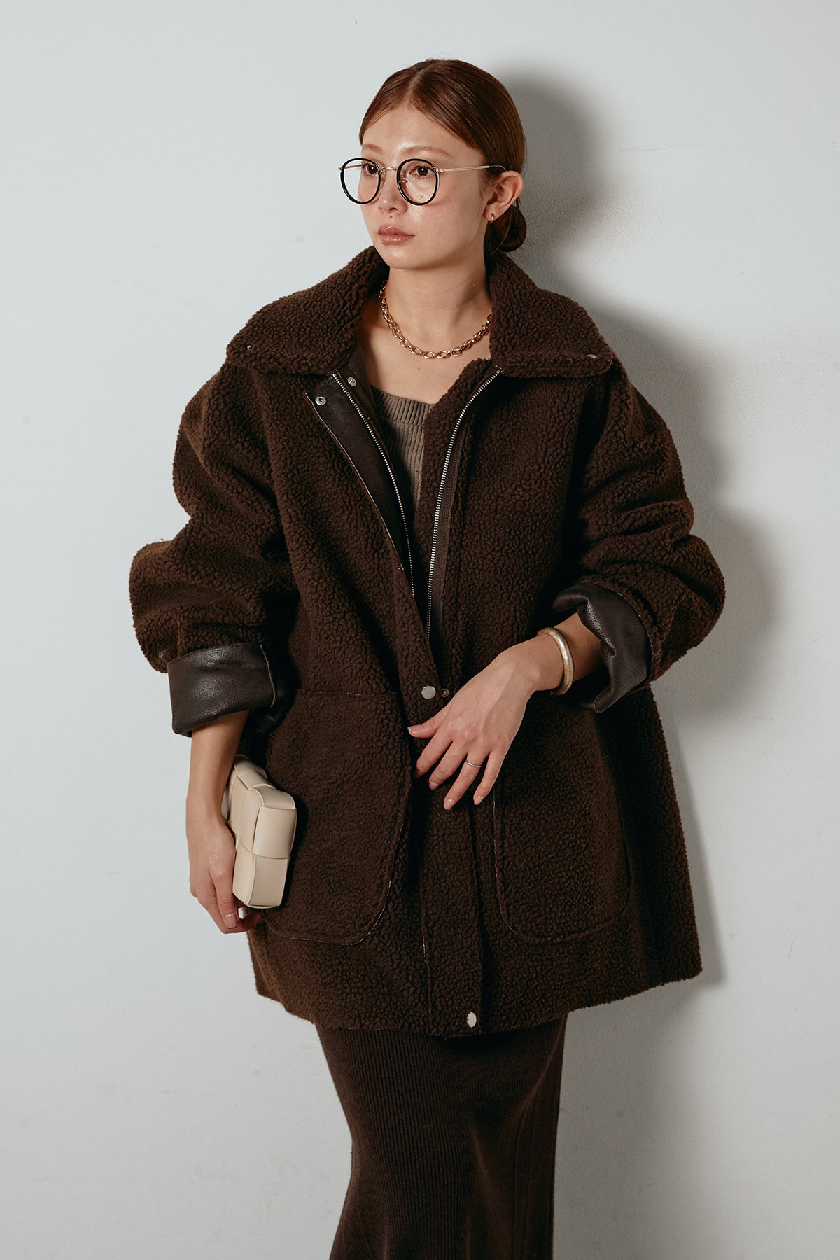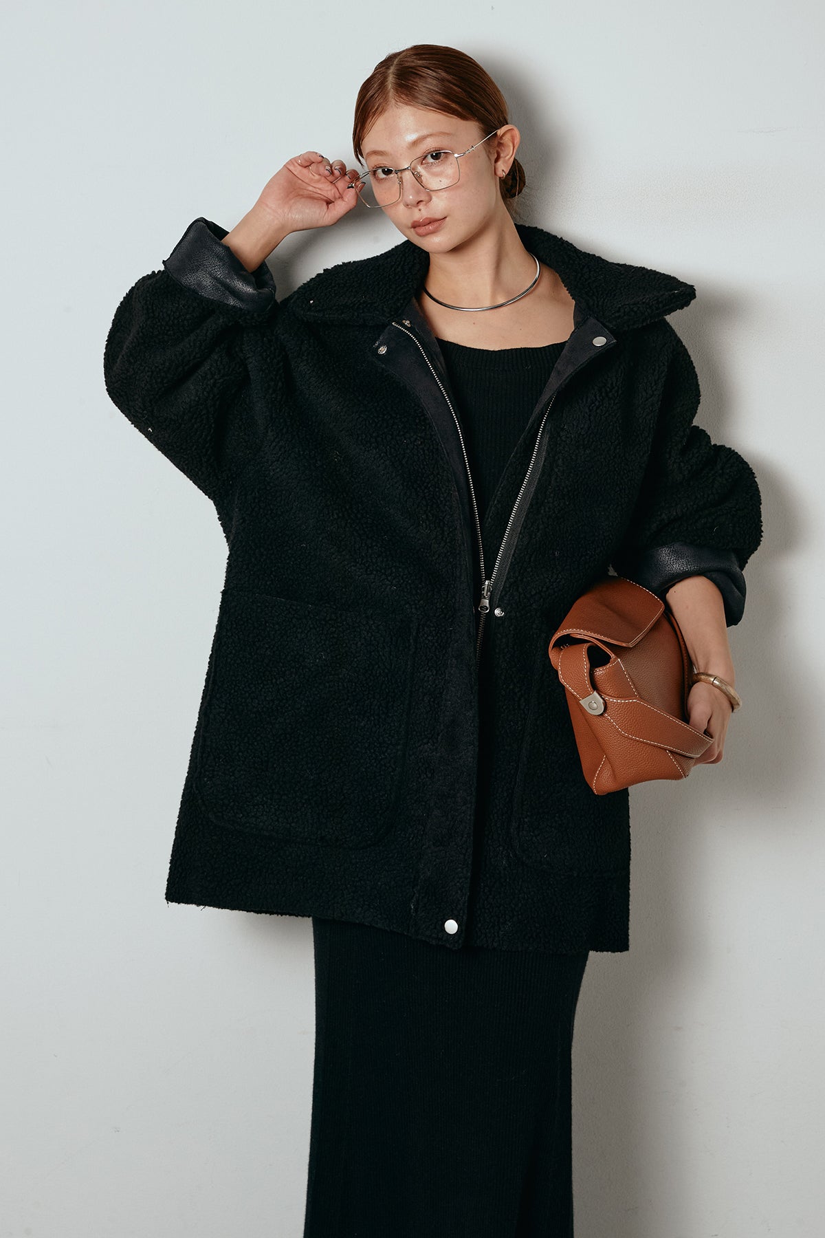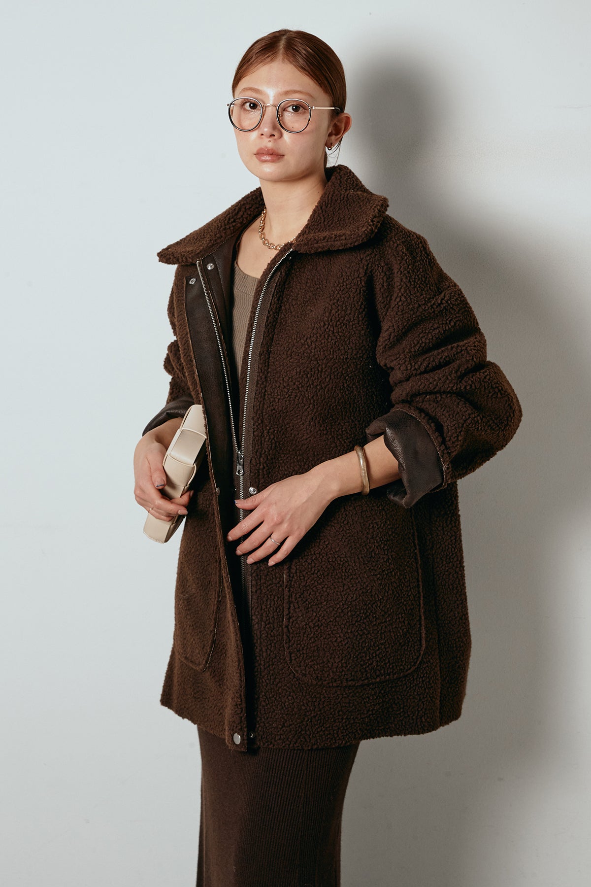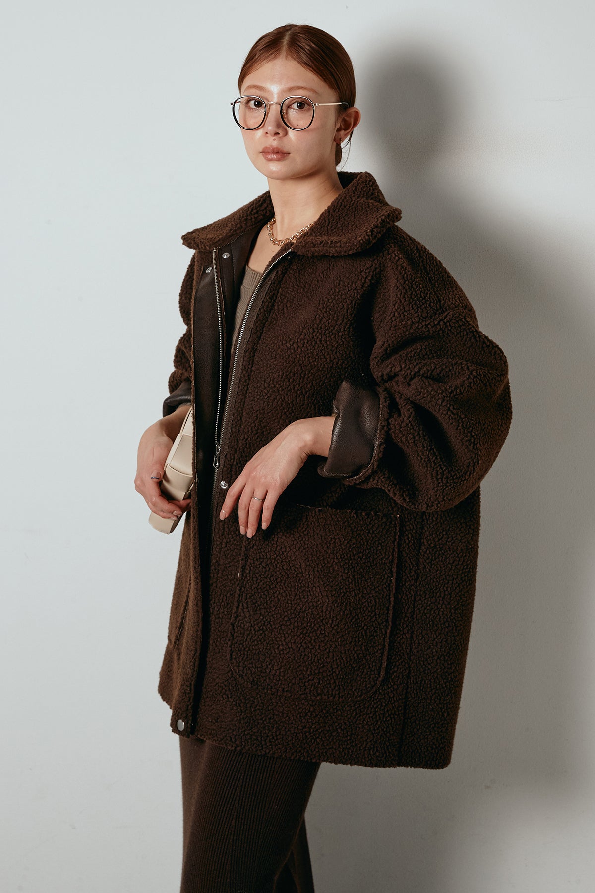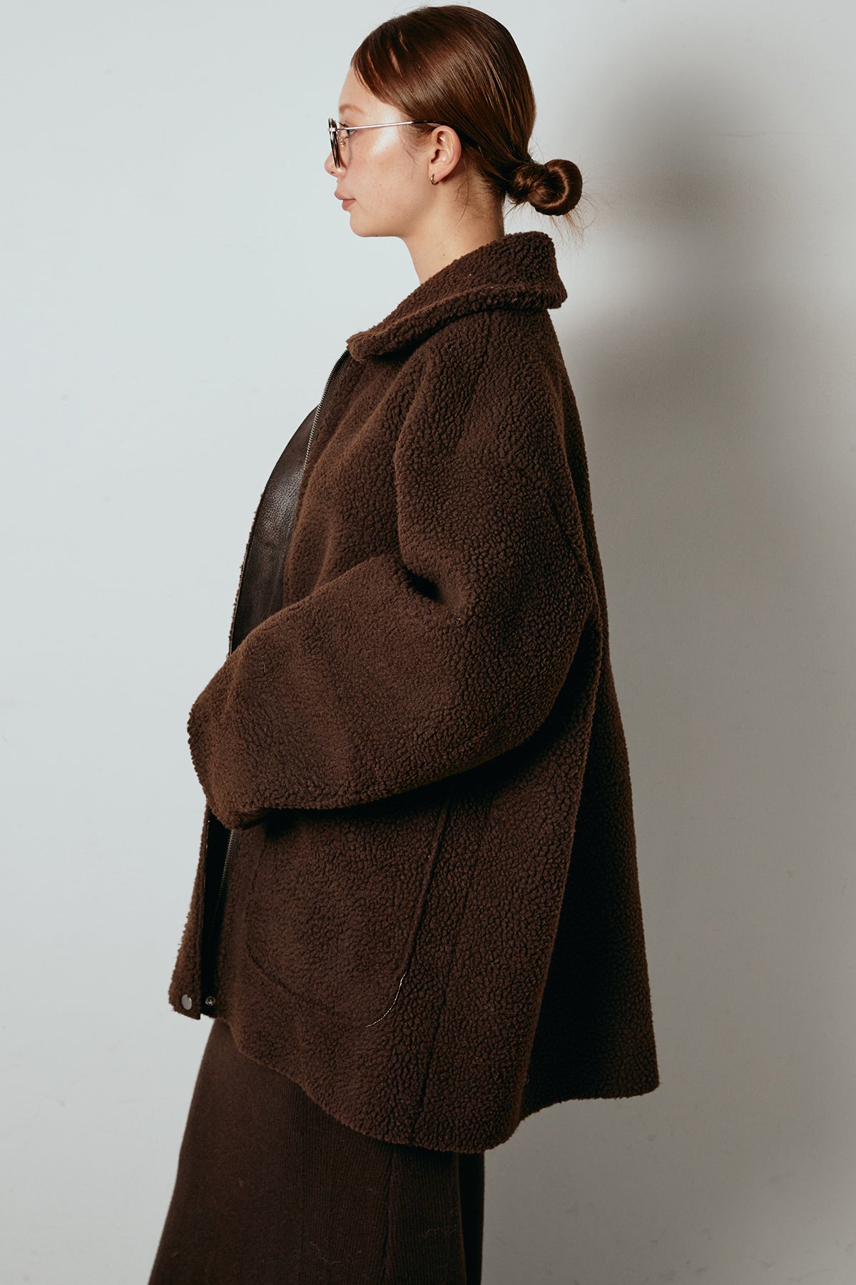 ふんわりと暖かなボア面と、滑らかな質感のエコムートン面を楽しめるリバーシブルコート。気分やスタイリングに合わせて印象を変えられ、1枚で幅広い着こなしに活躍します。ゆとりのあるシルエットが抜け感をつくりつつ、ジップとスナップで防寒性も確保。ヒップが隠れる着丈でバランスが取りやすく、パンツにもスカートにも合わせやすい万能アウターです。