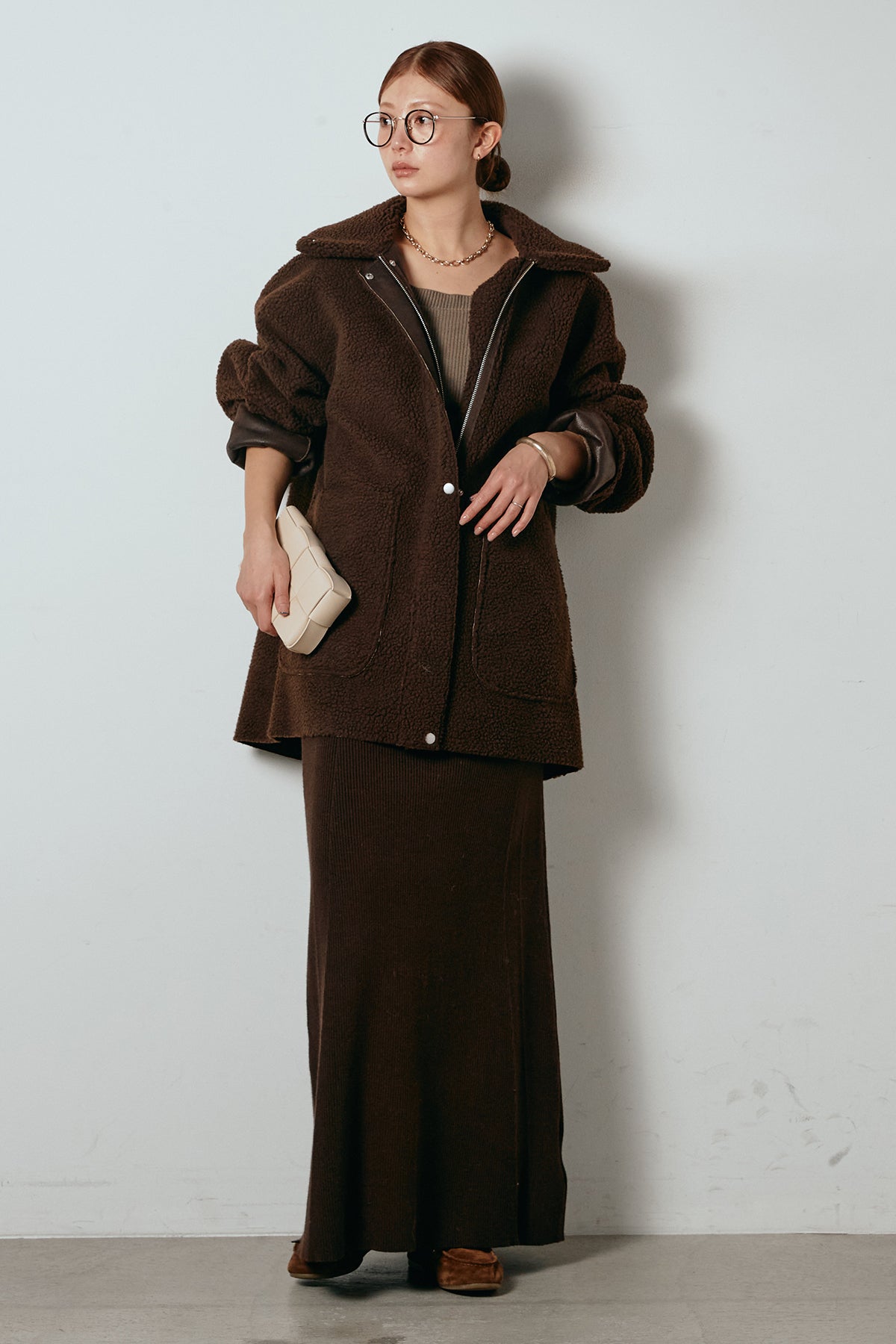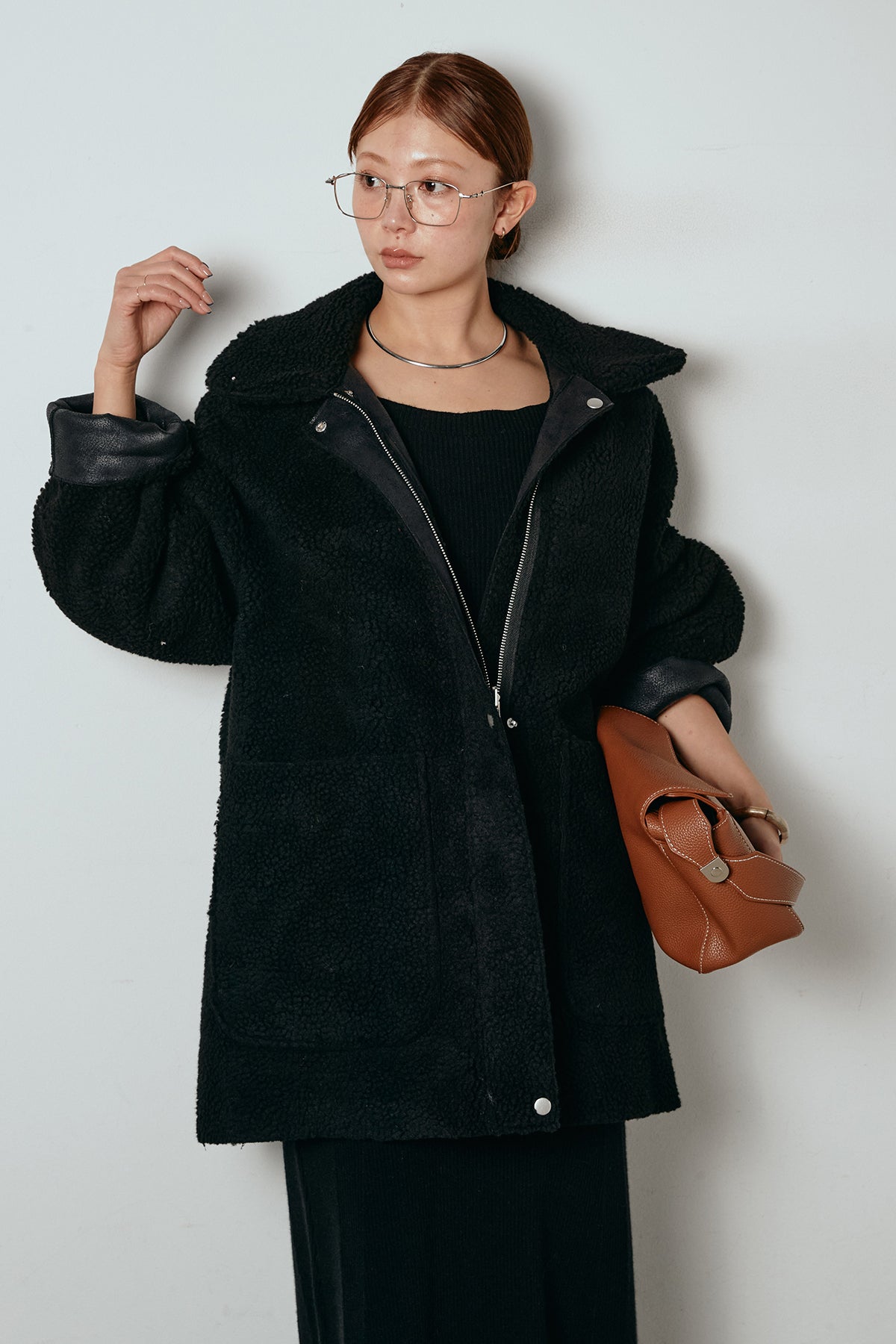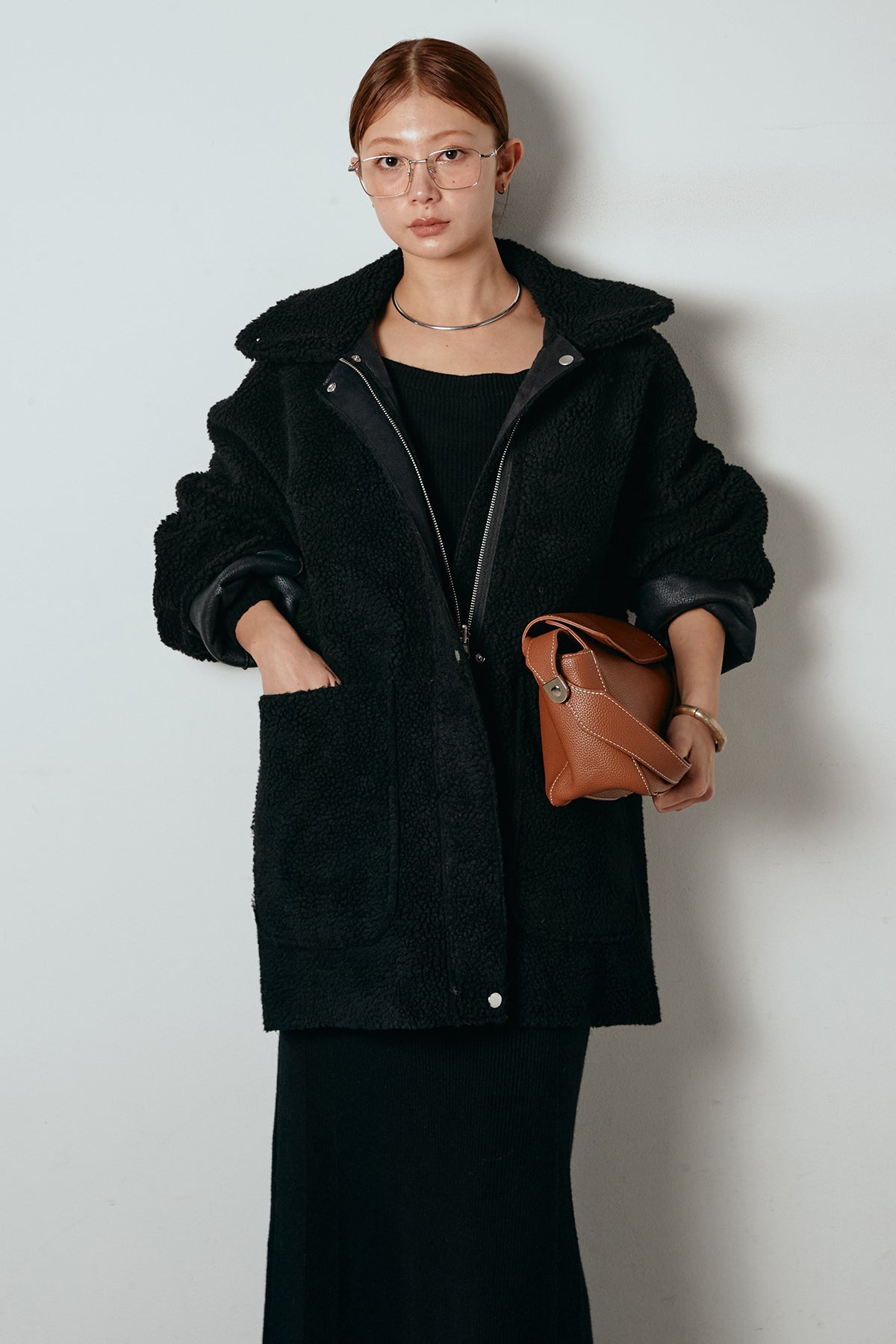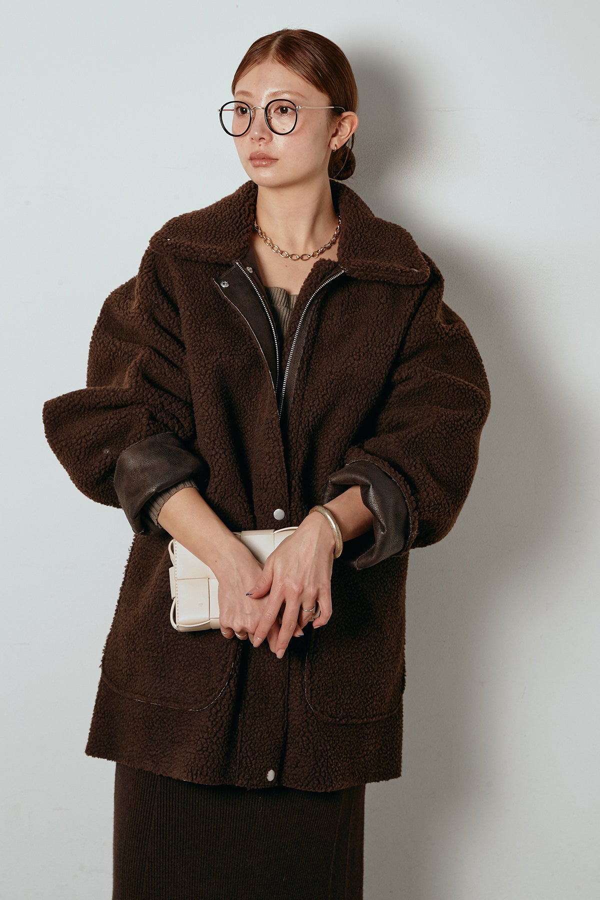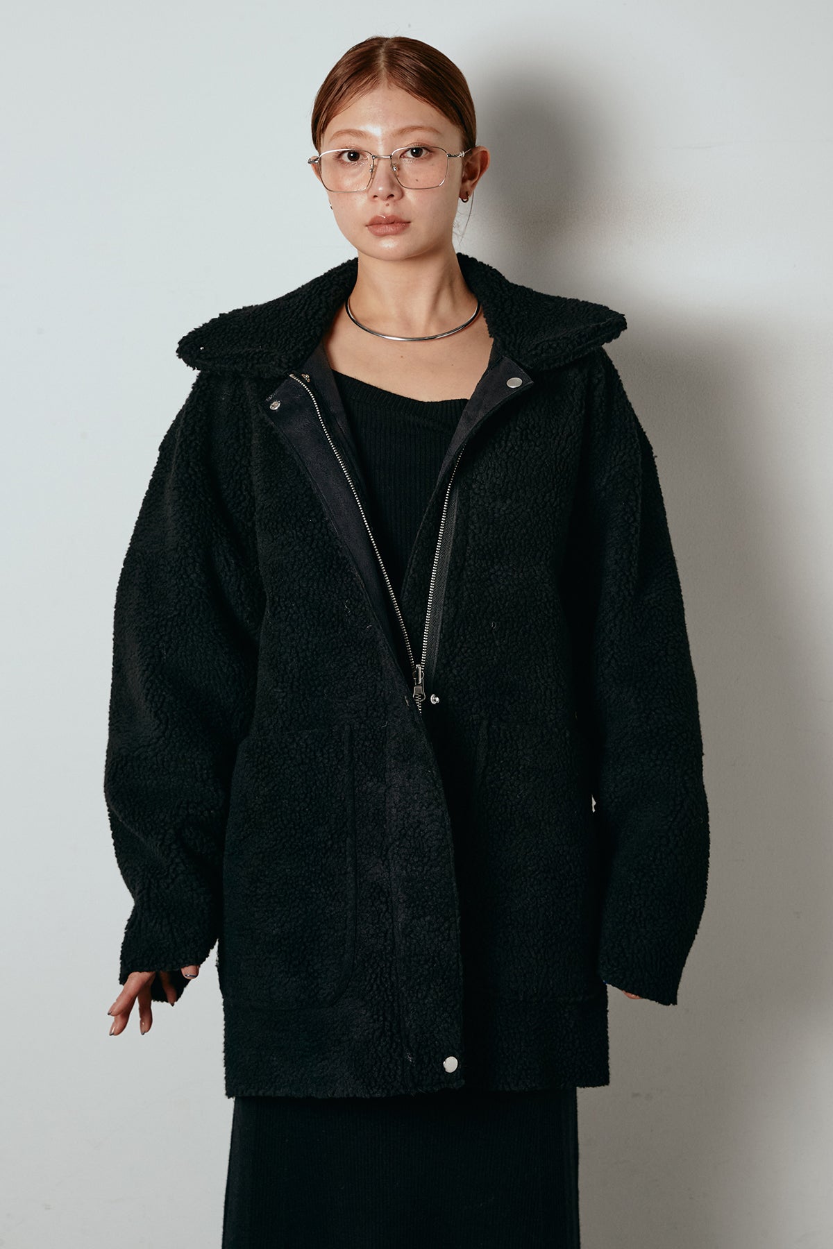 ふんわりと暖かなボア面と、滑らかな質感のエコムートン面を楽しめるリバーシブルコート。気分やスタイリングに合わせて印象を変えられ、1枚で幅広い着こなしに活躍します。ゆとりのあるシルエットが抜け感をつくりつつ、ジップとスナップで防寒性も確保。ヒップが隠れる着丈でバランスが取りやすく、パンツにもスカートにも合わせやすい万能アウターです。