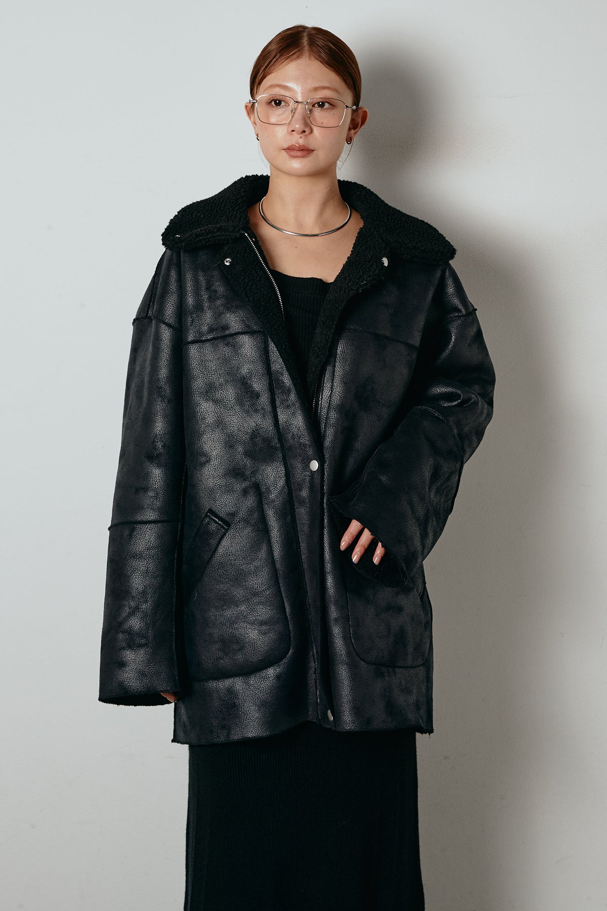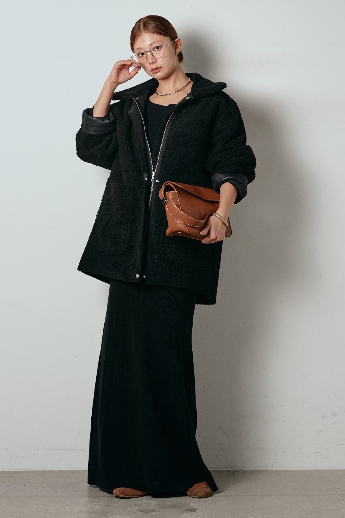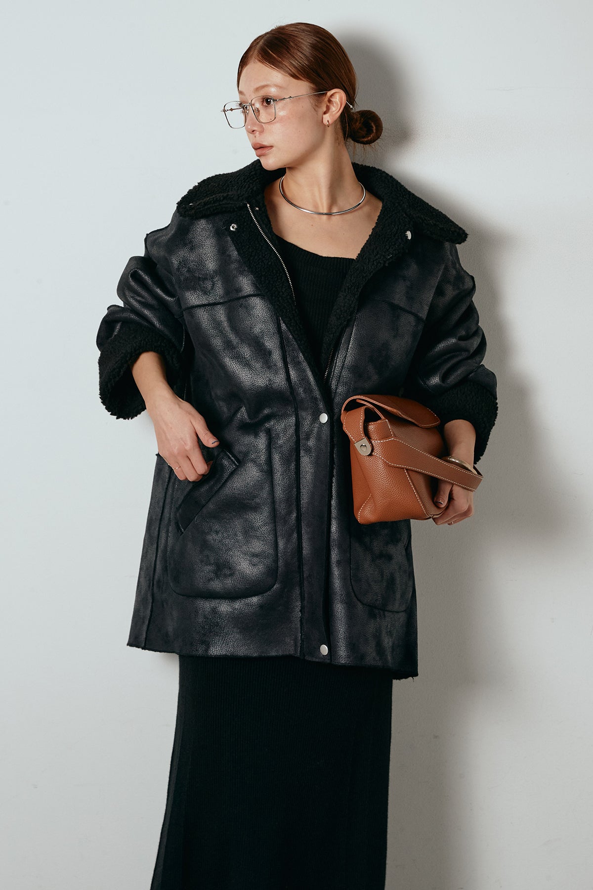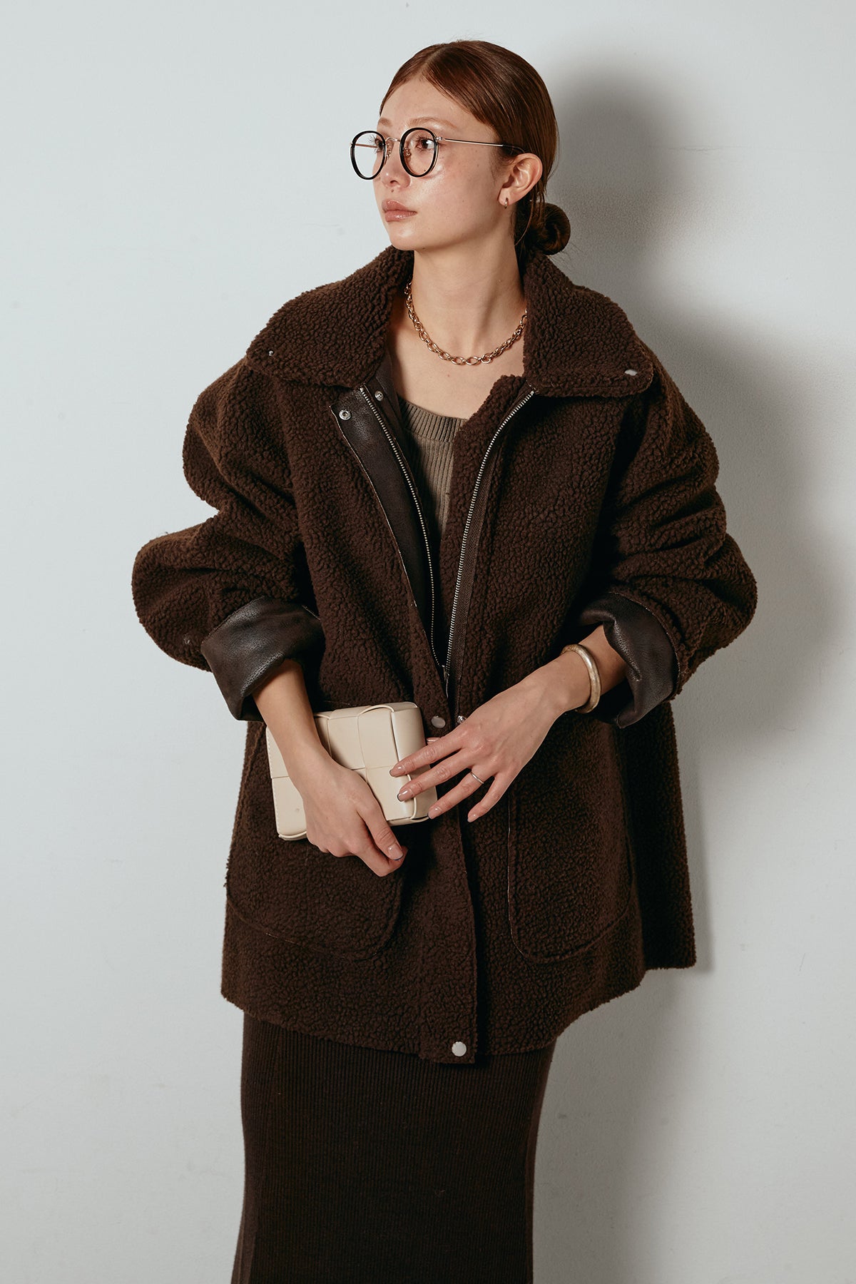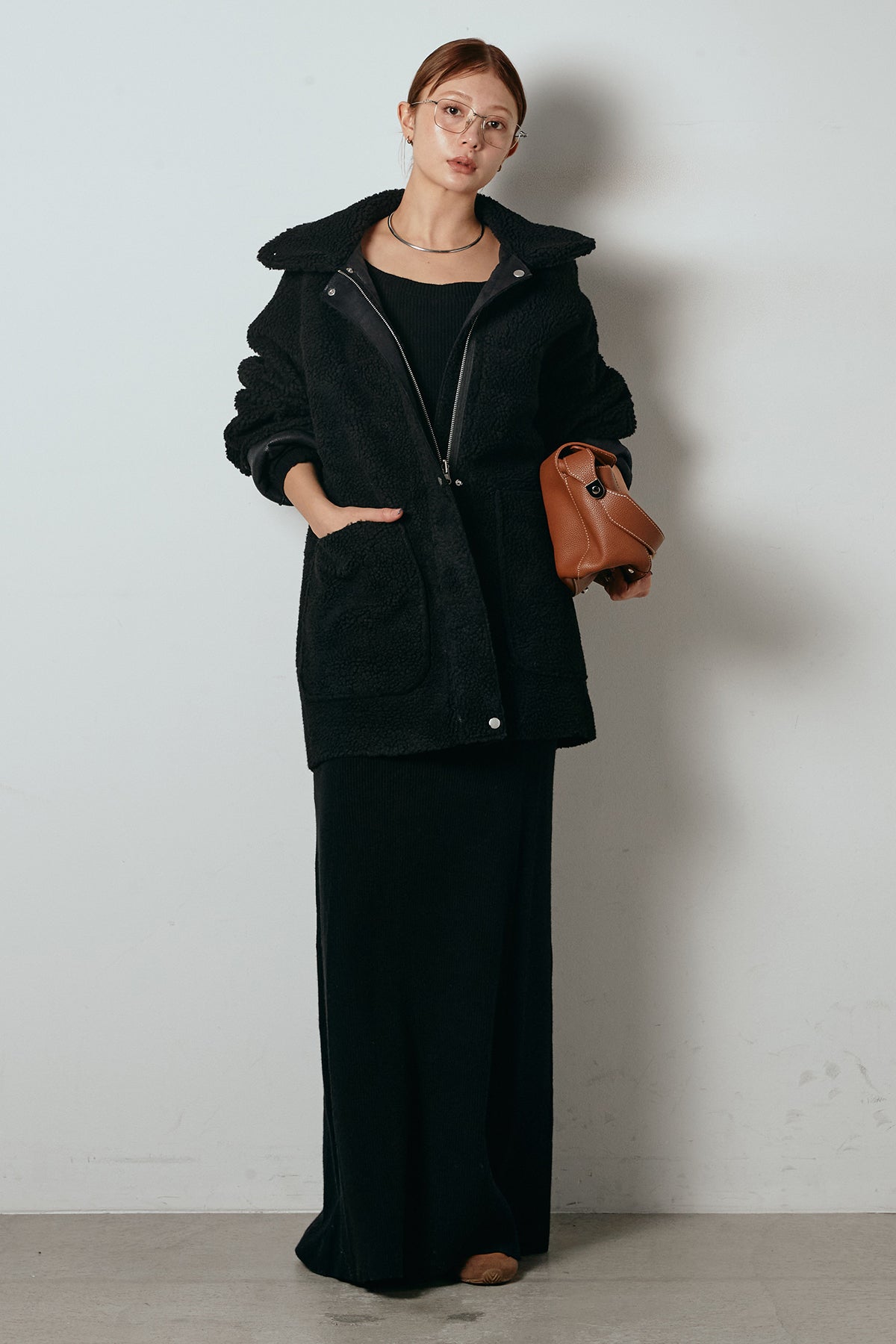 ふんわりと暖かなボア面と、滑らかな質感のエコムートン面を楽しめるリバーシブルコート。気分やスタイリングに合わせて印象を変えられ、1枚で幅広い着こなしに活躍します。ゆとりのあるシルエットが抜け感をつくりつつ、ジップとスナップで防寒性も確保。ヒップが隠れる着丈でバランスが取りやすく、パンツにもスカートにも合わせやすい万能アウターです。