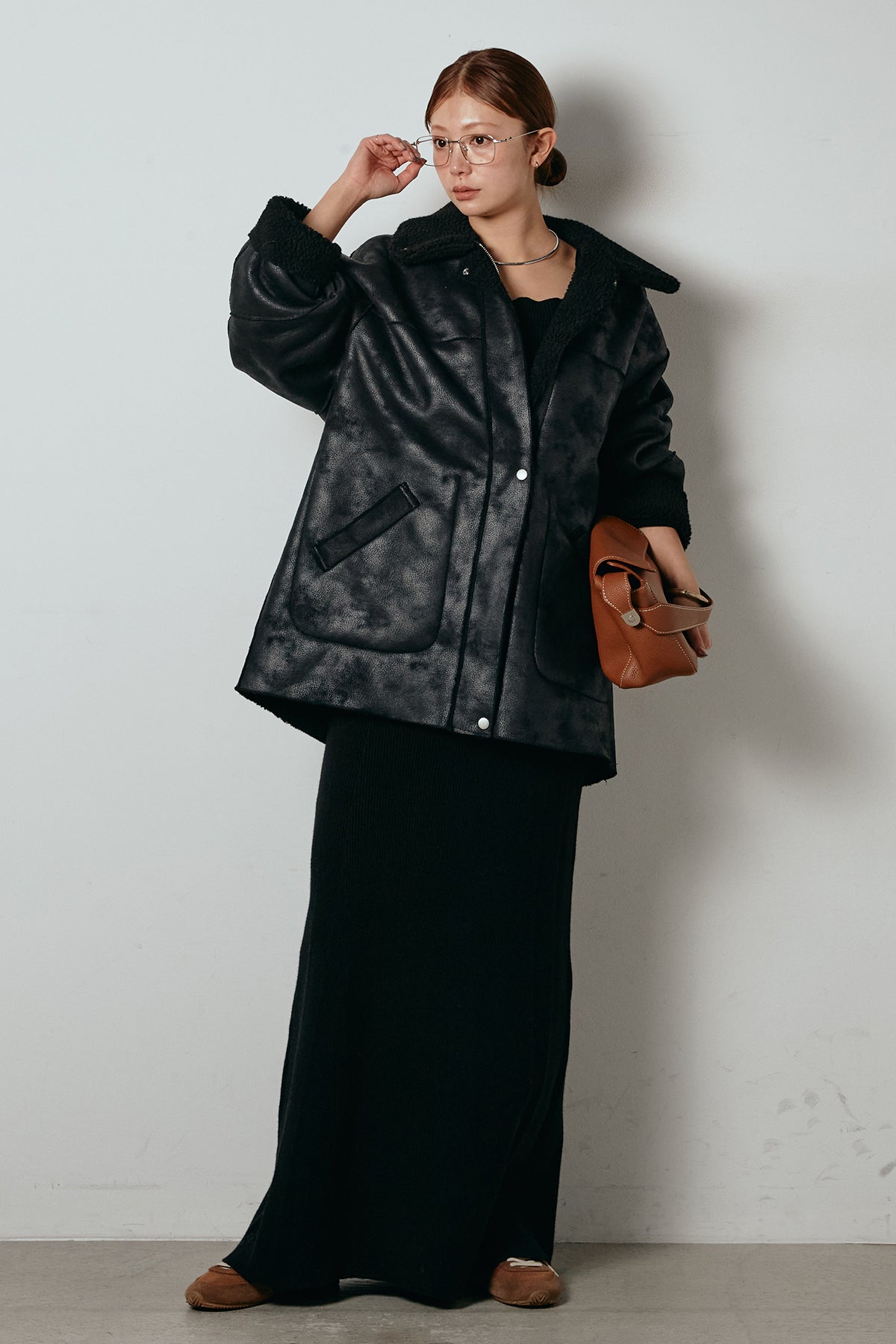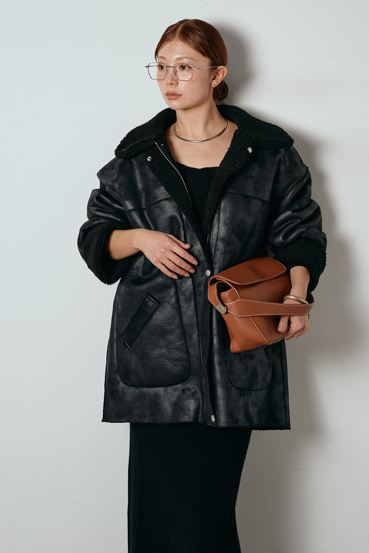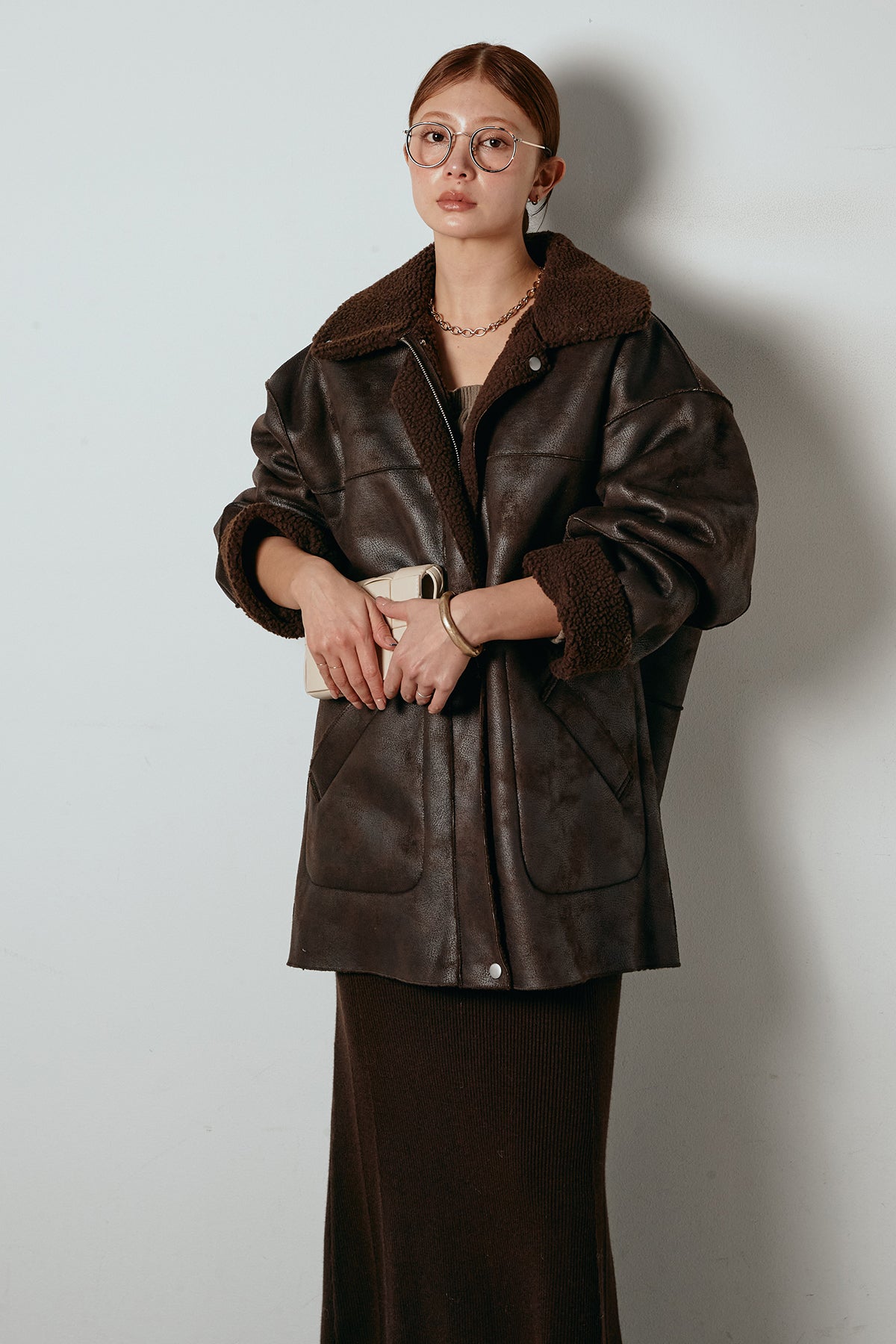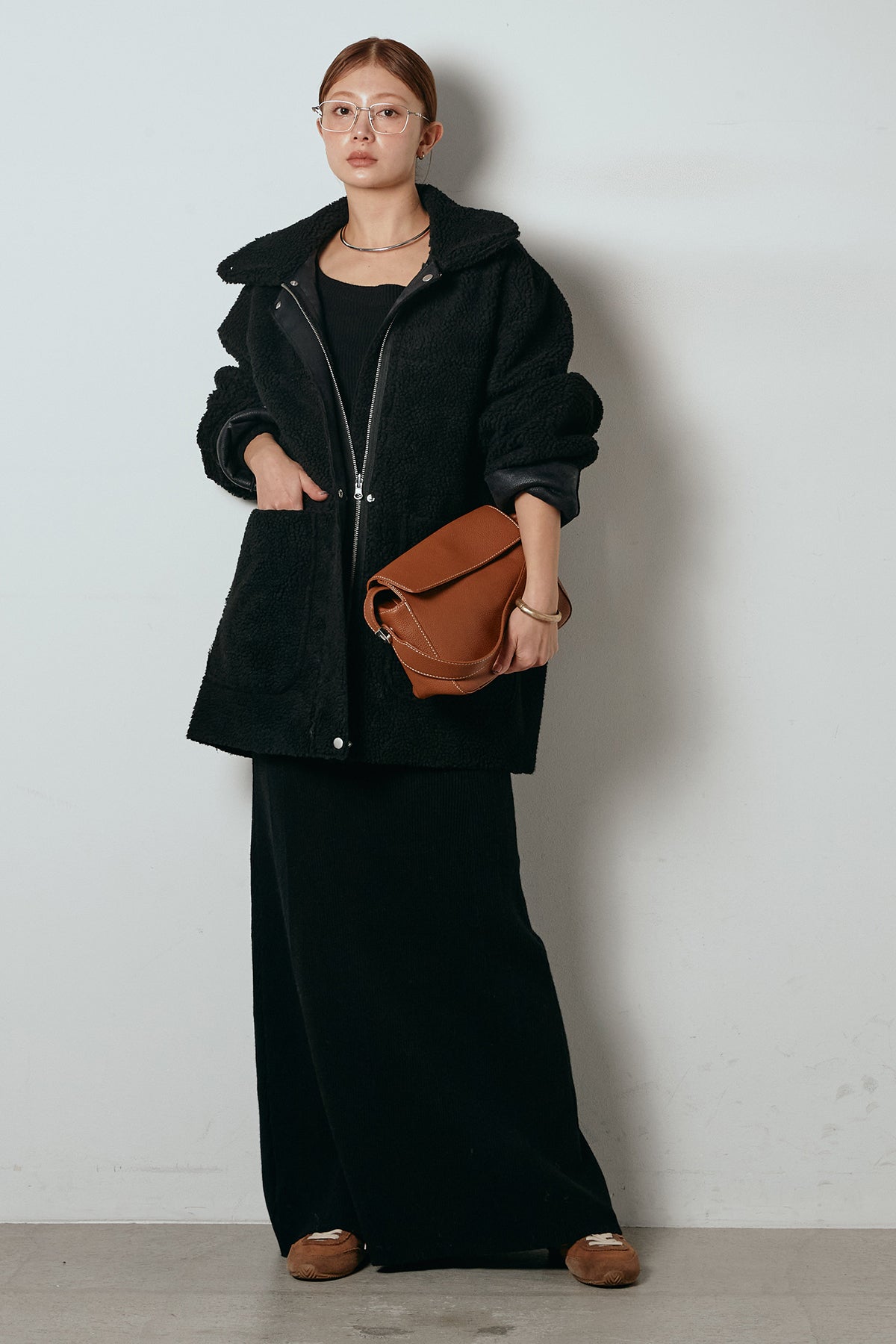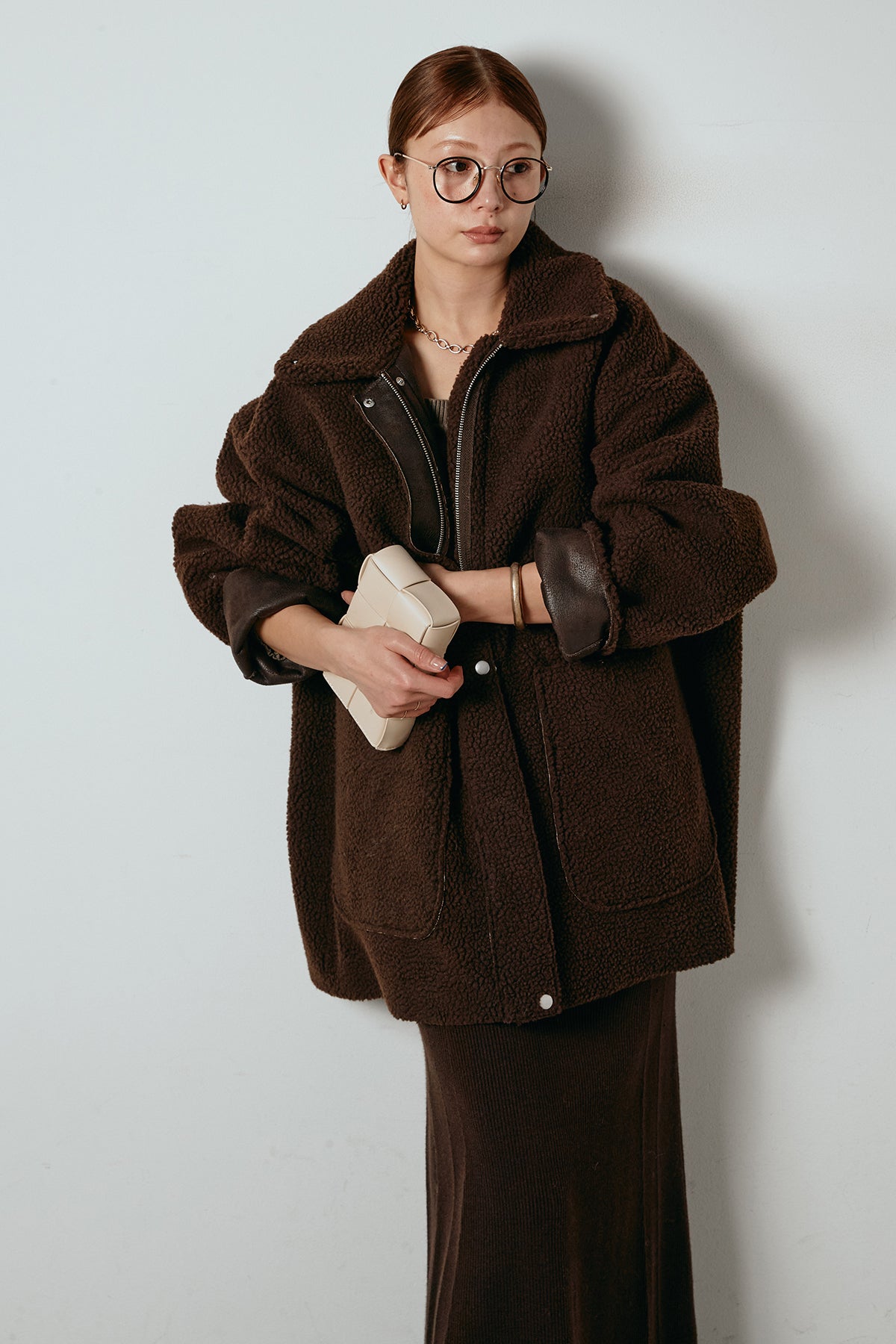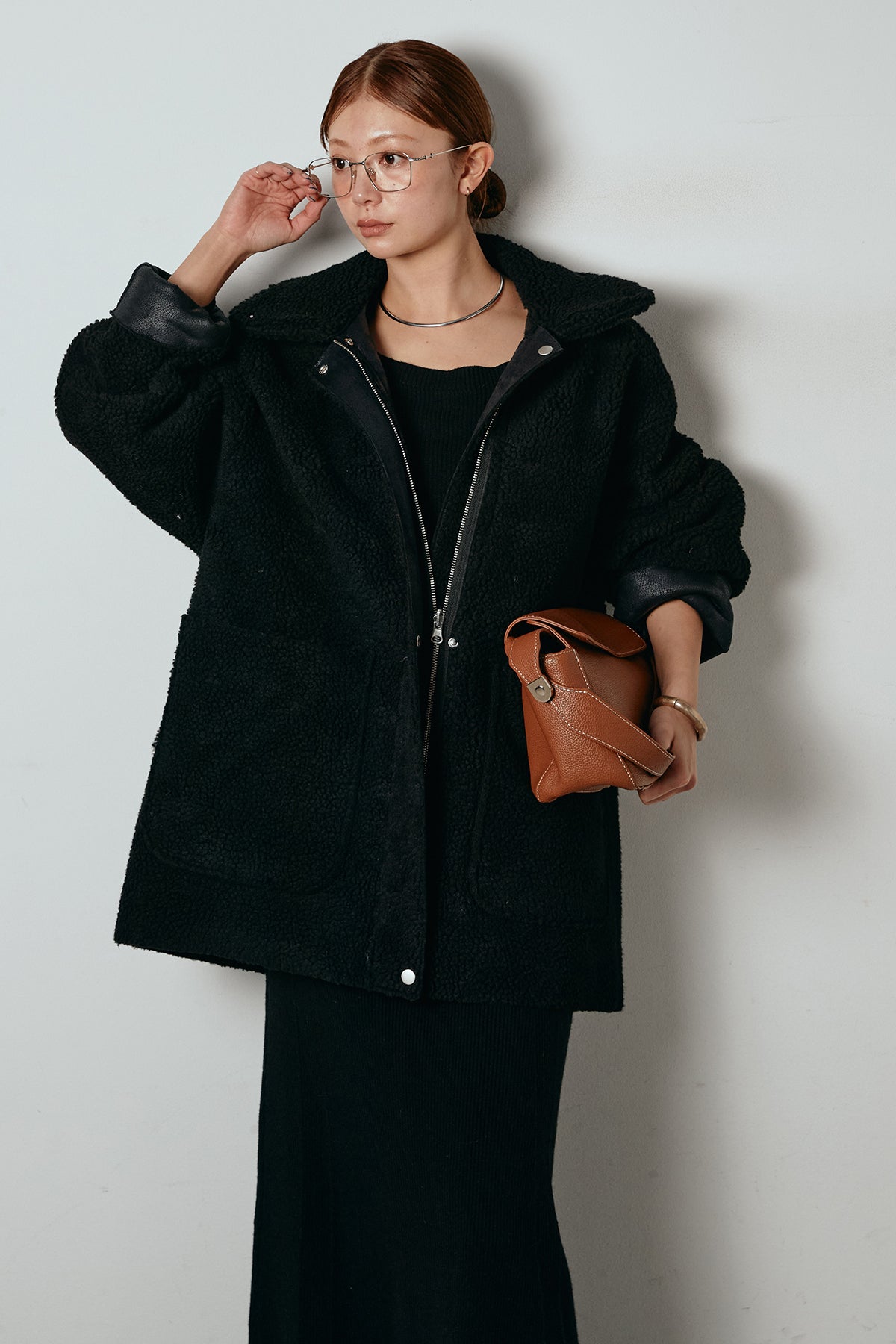 ふんわりと暖かなボア面と、滑らかな質感のエコムートン面を楽しめるリバーシブルコート。気分やスタイリングに合わせて印象を変えられ、1枚で幅広い着こなしに活躍します。ゆとりのあるシルエットが抜け感をつくりつつ、ジップとスナップで防寒性も確保。ヒップが隠れる着丈でバランスが取りやすく、パンツにもスカートにも合わせやすい万能アウターです。