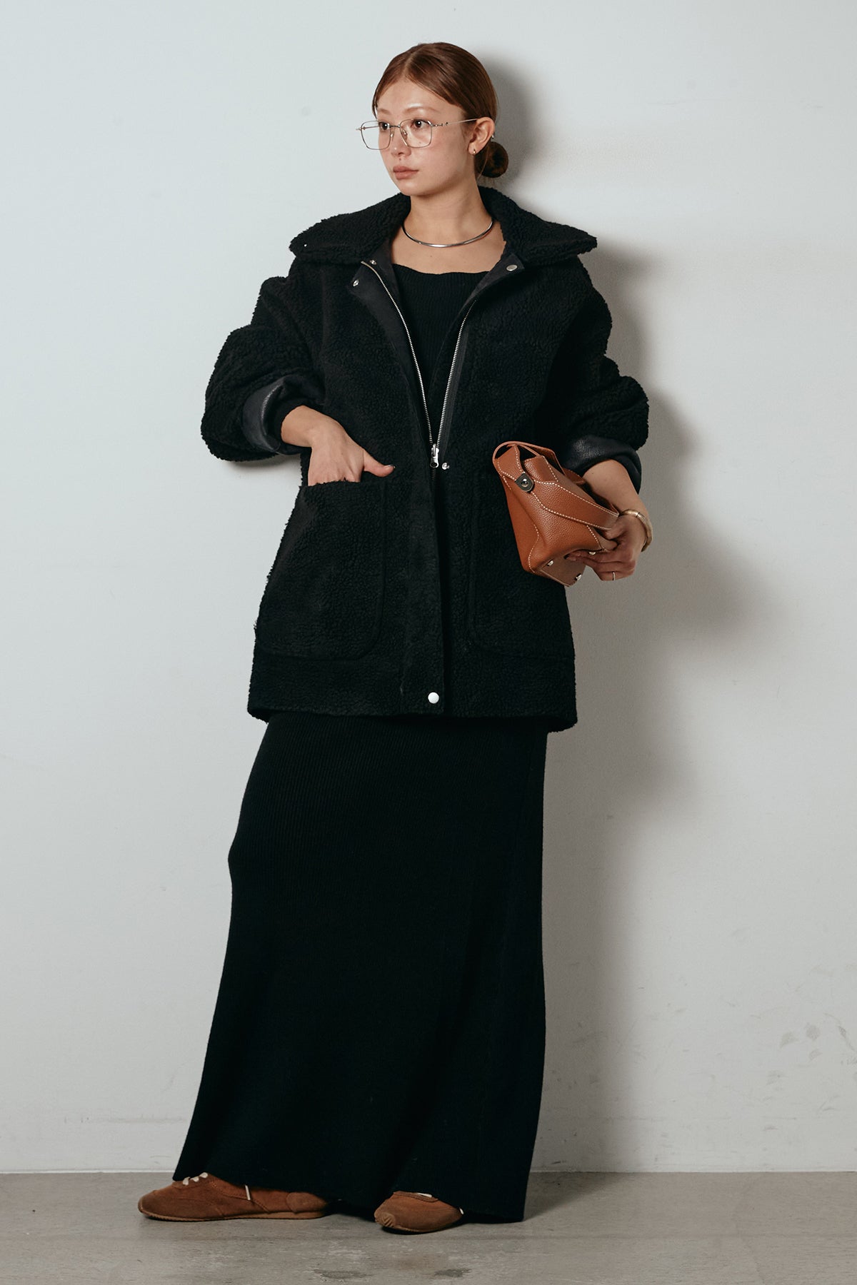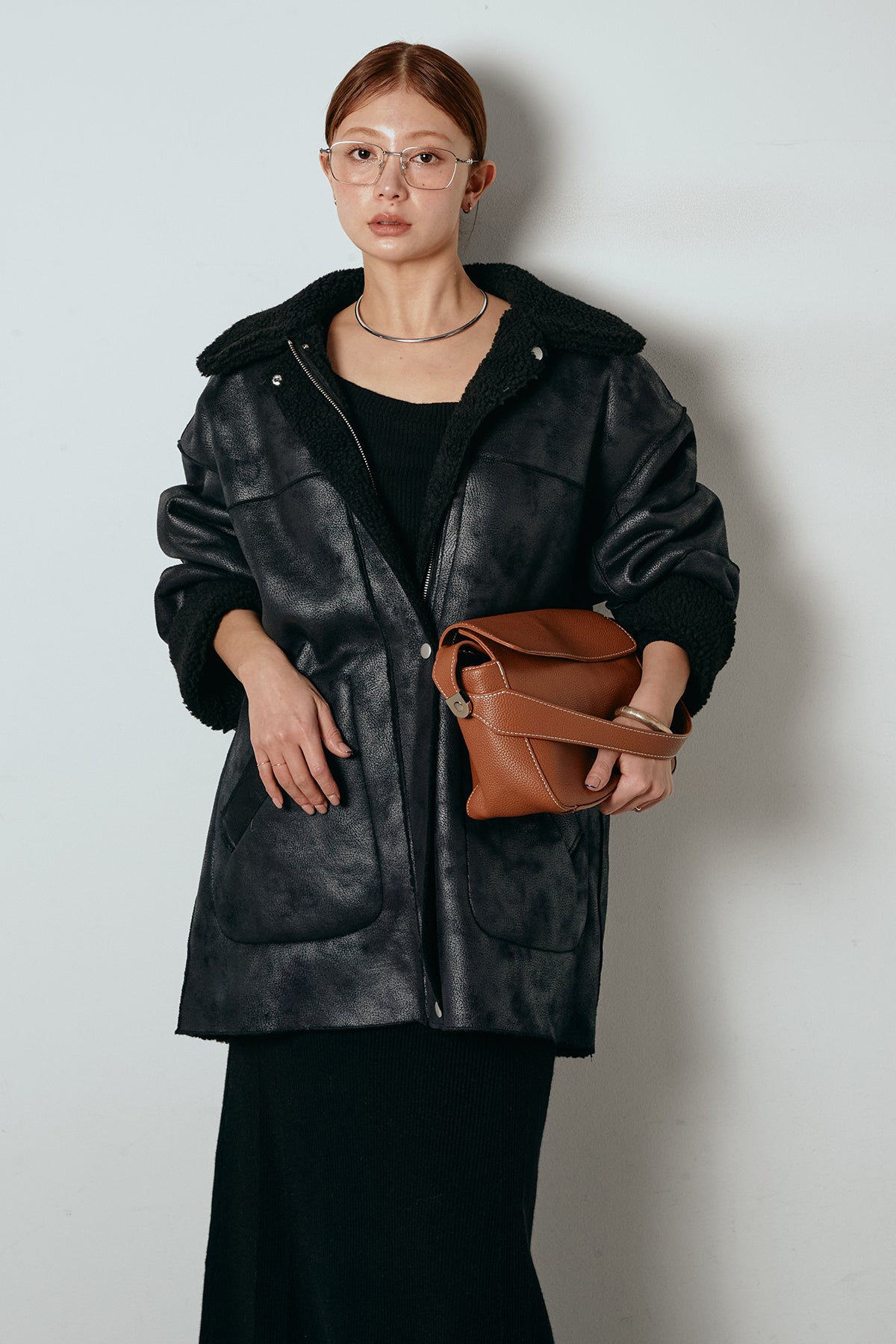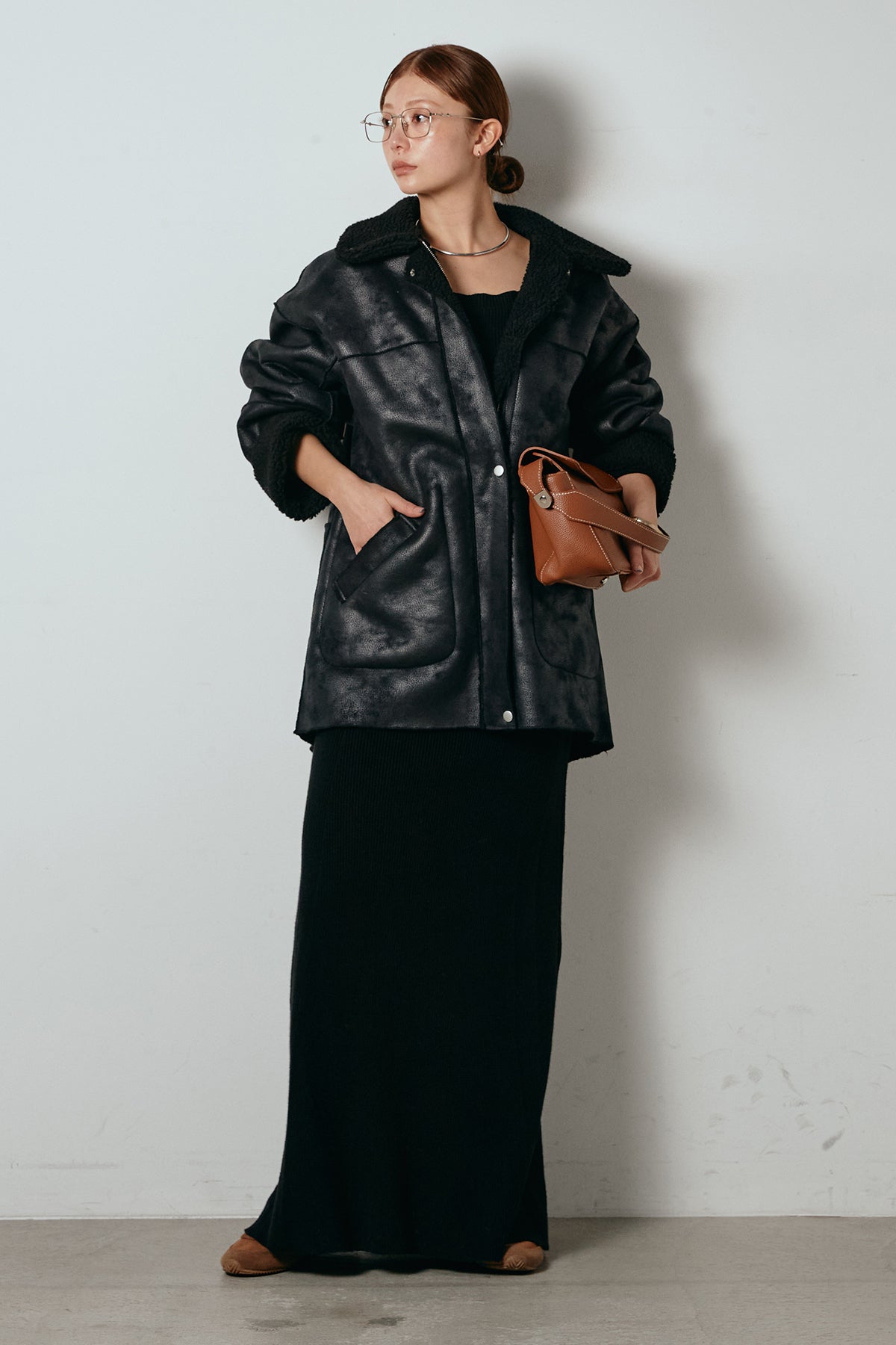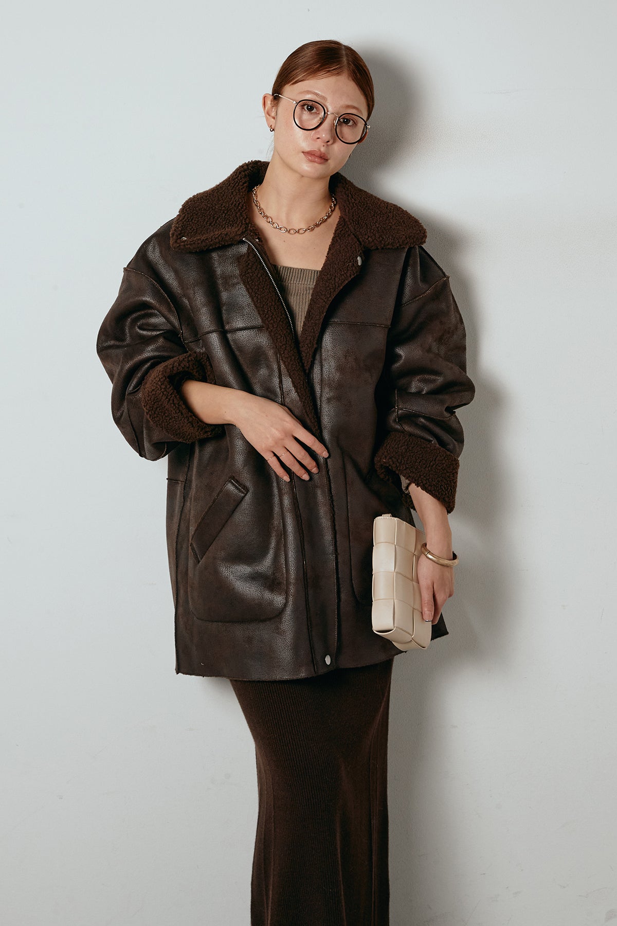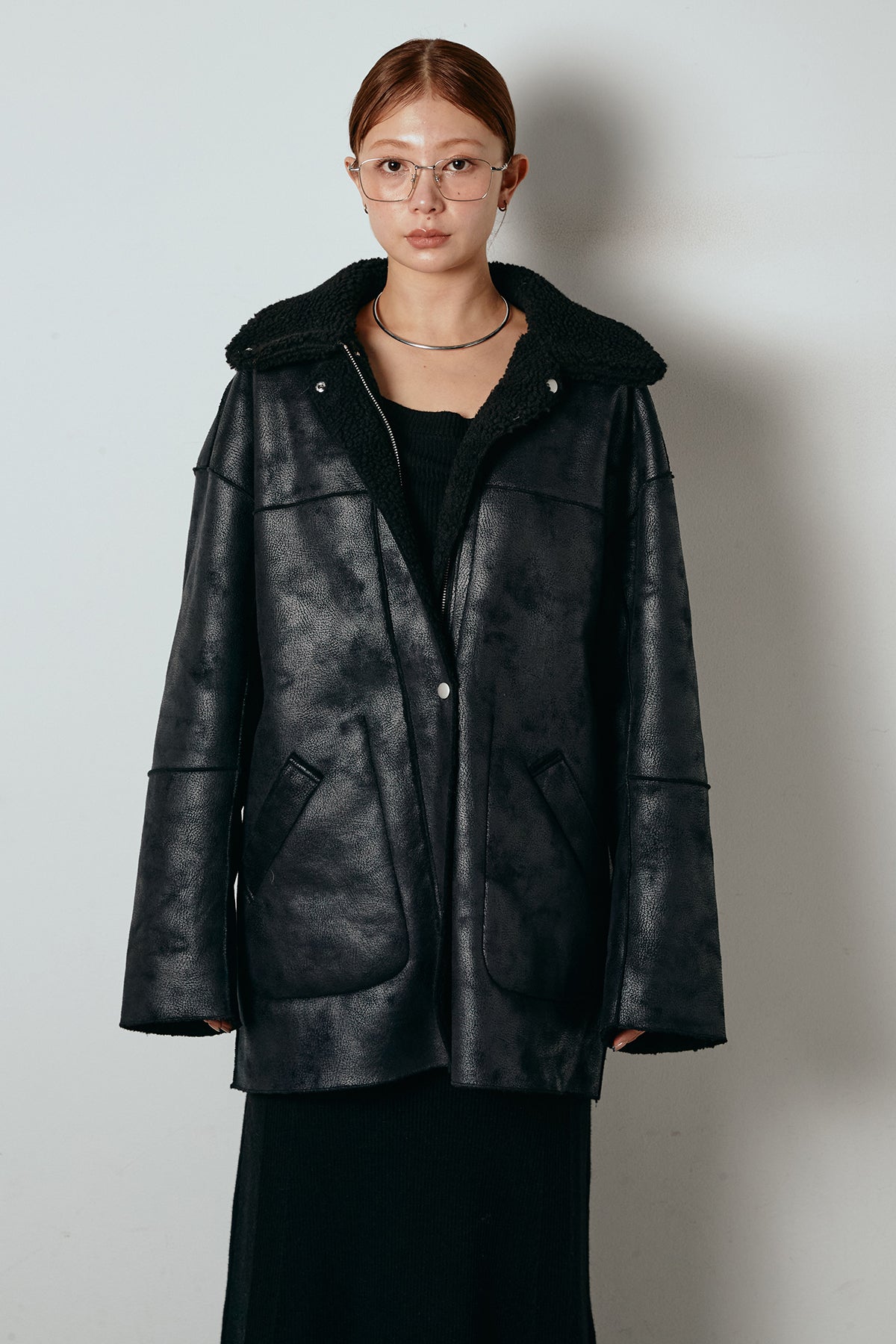 ふんわりと暖かなボア面と、滑らかな質感のエコムートン面を楽しめるリバーシブルコート。気分やスタイリングに合わせて印象を変えられ、1枚で幅広い着こなしに活躍します。ゆとりのあるシルエットが抜け感をつくりつつ、ジップとスナップで防寒性も確保。ヒップが隠れる着丈でバランスが取りやすく、パンツにもスカートにも合わせやすい万能アウターです。