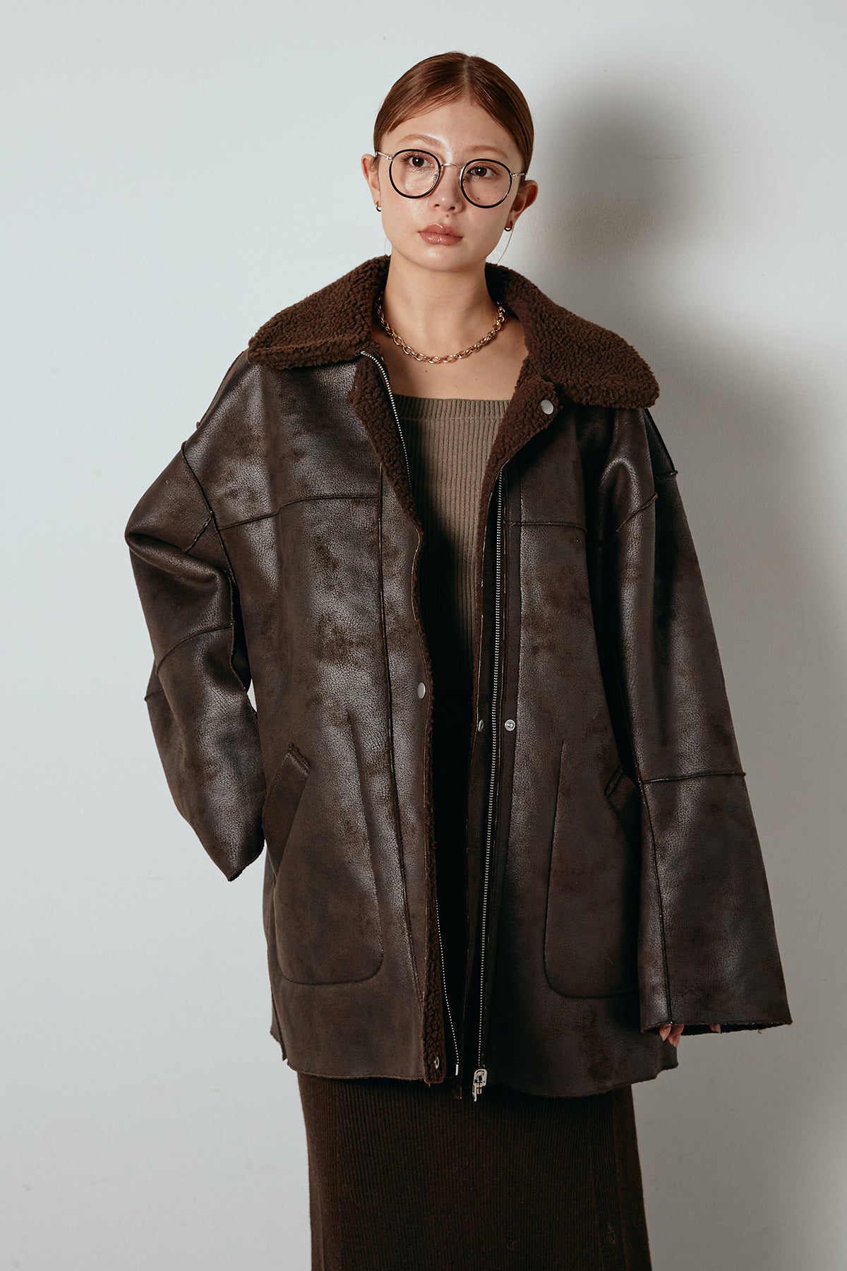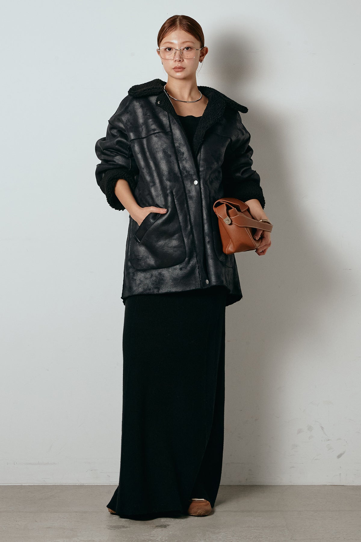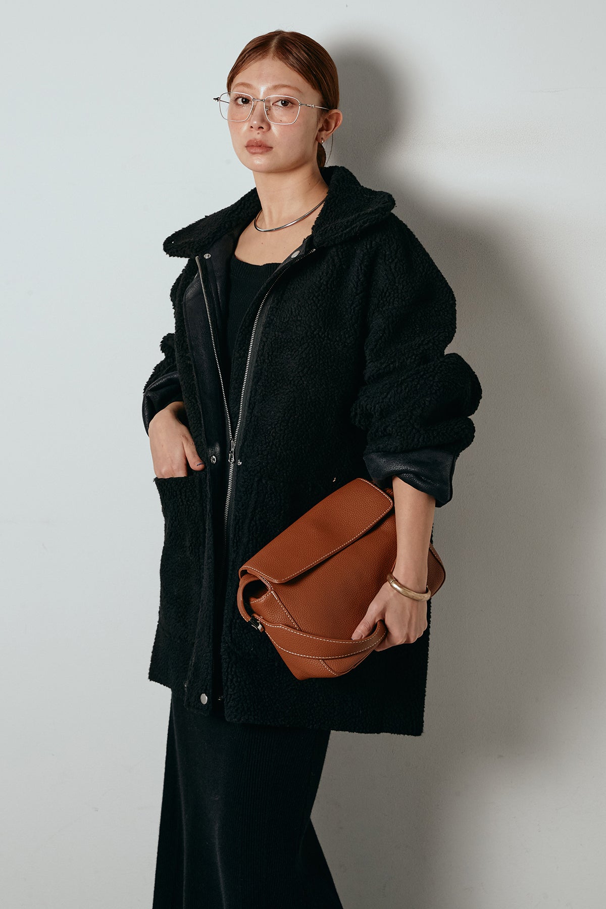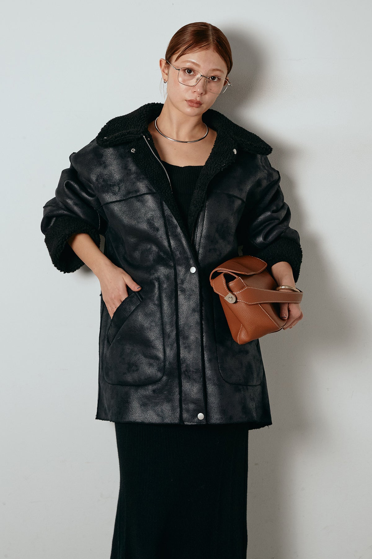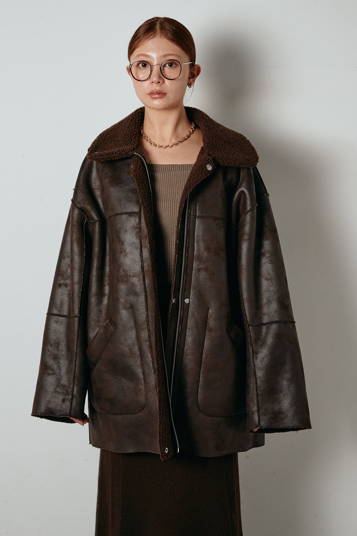 ふんわりと暖かなボア面と、滑らかな質感のエコムートン面を楽しめるリバーシブルコート。気分やスタイリングに合わせて印象を変えられ、1枚で幅広い着こなしに活躍します。ゆとりのあるシルエットが抜け感をつくりつつ、ジップとスナップで防寒性も確保。ヒップが隠れる着丈でバランスが取りやすく、パンツにもスカートにも合わせやすい万能アウターです。