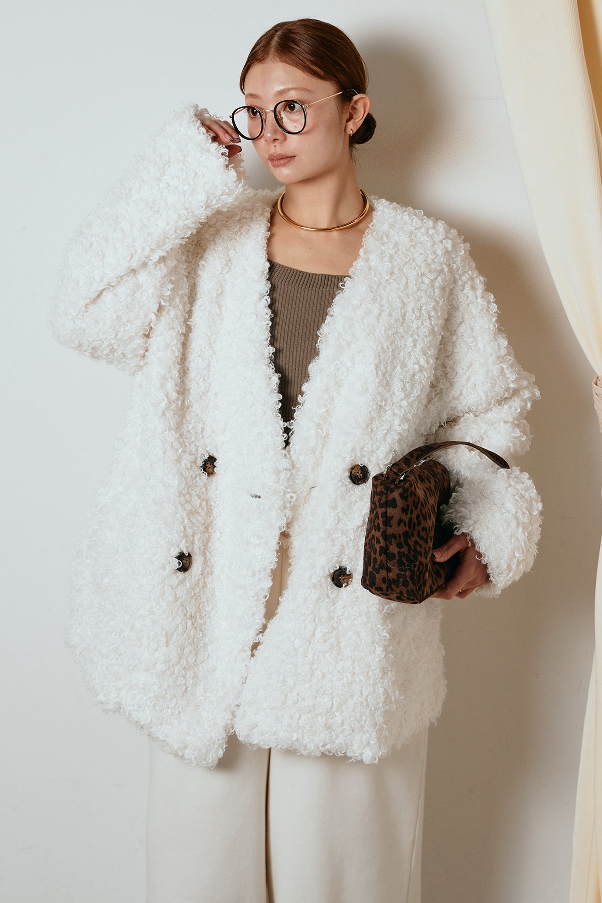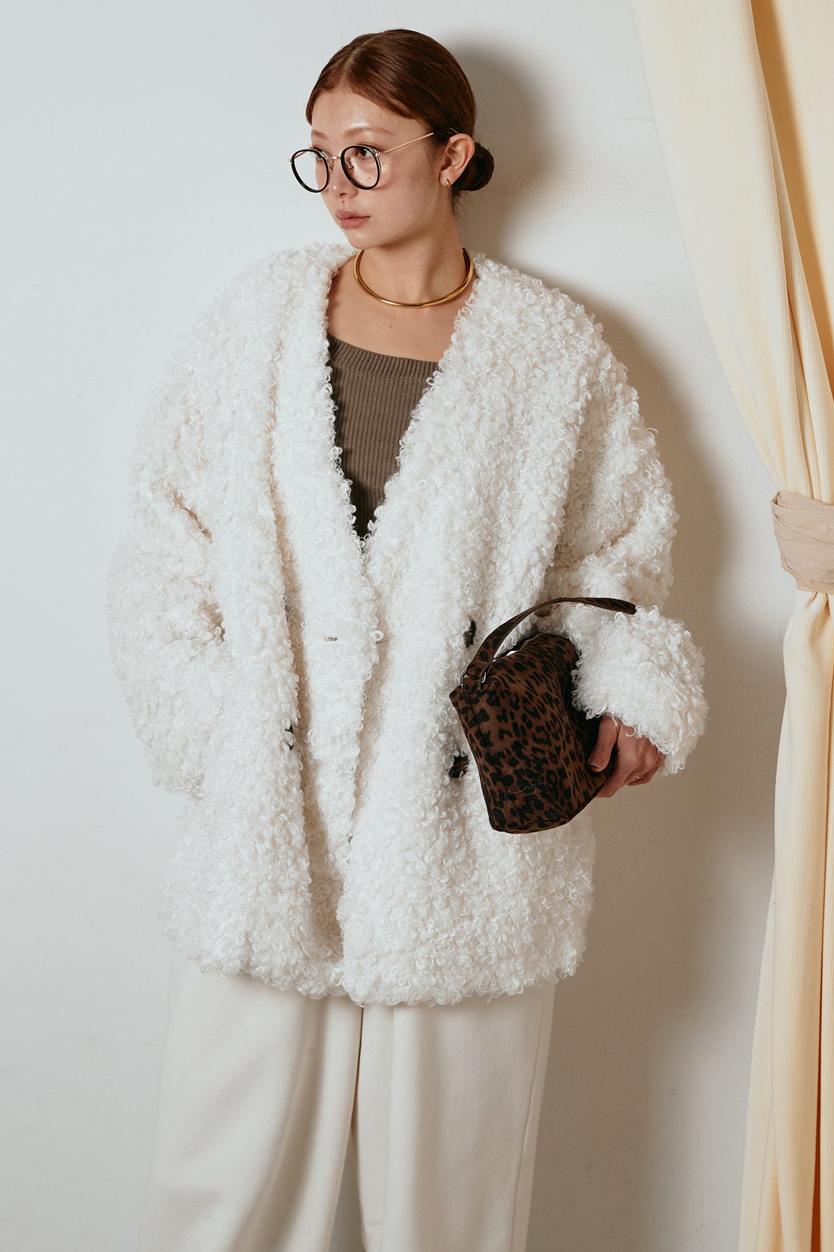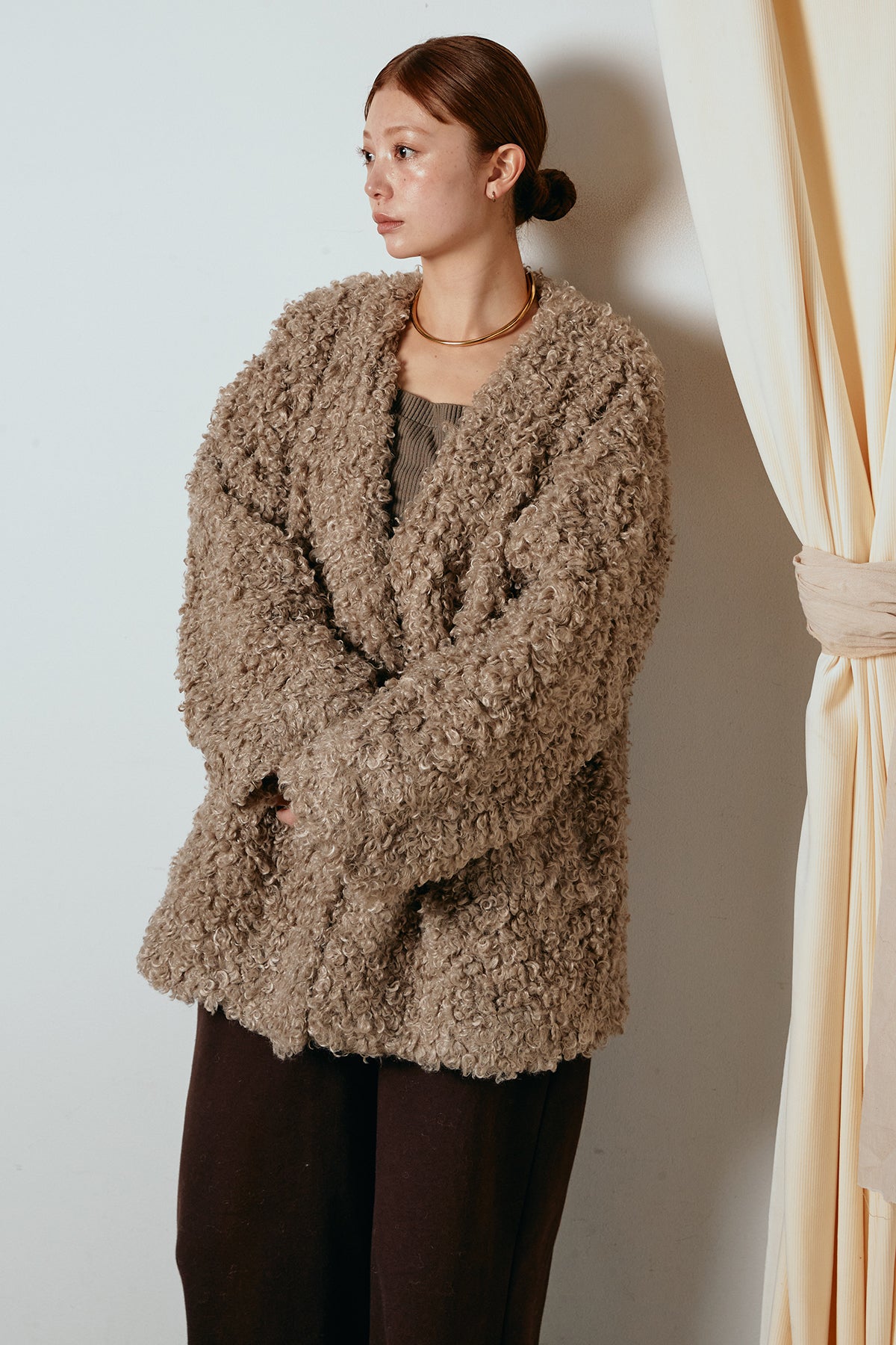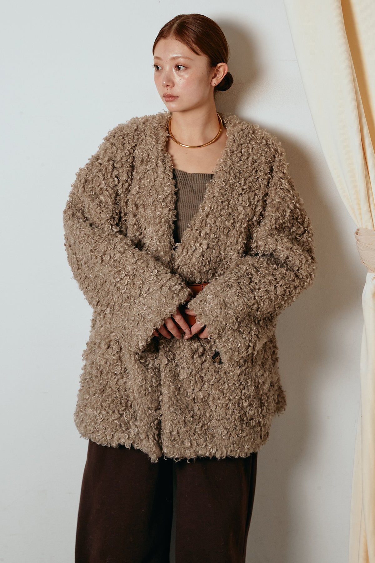 ふんわりとしたシープ調のファーが、優しいボリューム感とあたたかなムードを演出するファージャケット。柔らかな毛足が立体的な表情をつくり、シンプルなスタイリングにも存在感を添えます。前立てはすっきりとしたV開きで、インナーを問わず合わせやすいバランスに。軽やかな着心地ながらもしっかりと暖かく、デイリーからお出かけまで幅広く活躍。羽織るだけで季節感のあるスタイルが完成する一枚です。