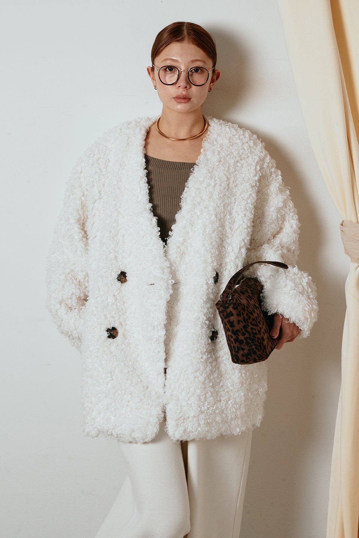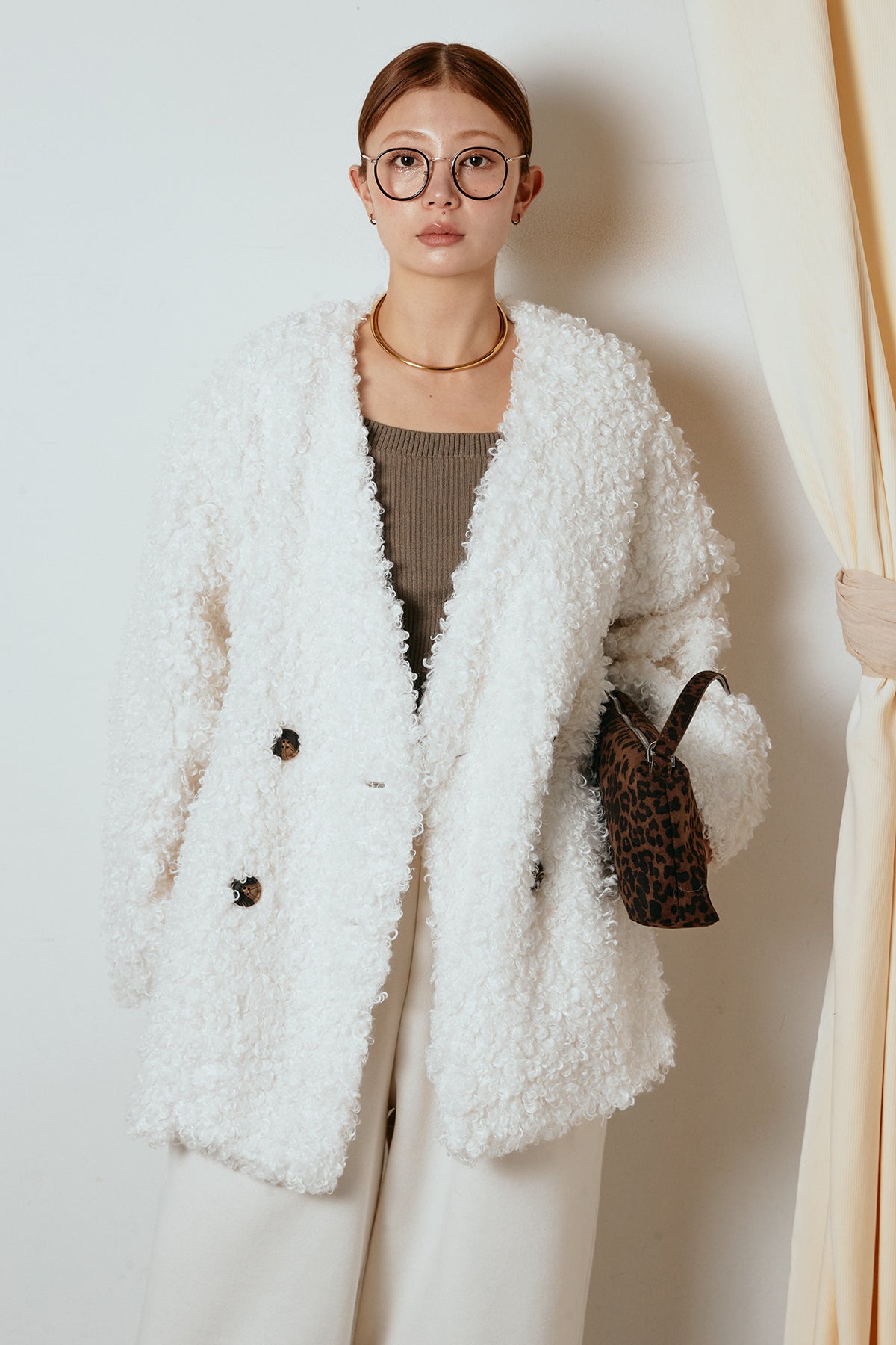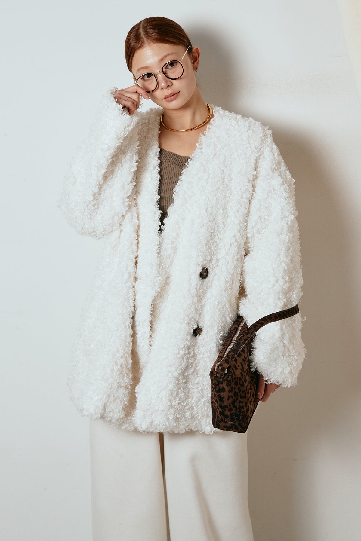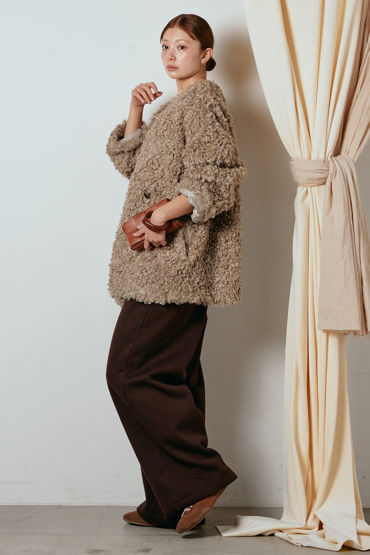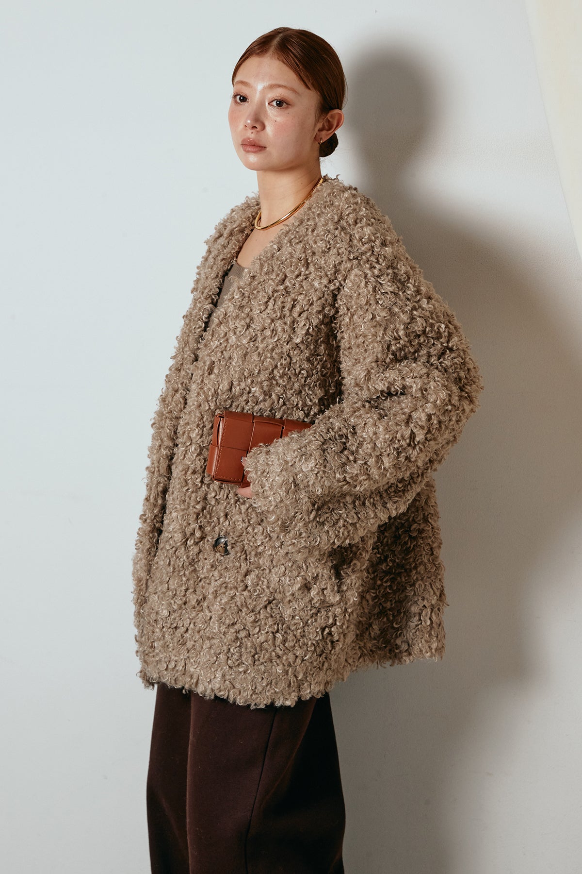 ふんわりとしたシープ調のファーが、優しいボリューム感とあたたかなムードを演出するファージャケット。柔らかな毛足が立体的な表情をつくり、シンプルなスタイリングにも存在感を添えます。前立てはすっきりとしたV開きで、インナーを問わず合わせやすいバランスに。軽やかな着心地ながらもしっかりと暖かく、デイリーからお出かけまで幅広く活躍。羽織るだけで季節感のあるスタイルが完成する一枚です。