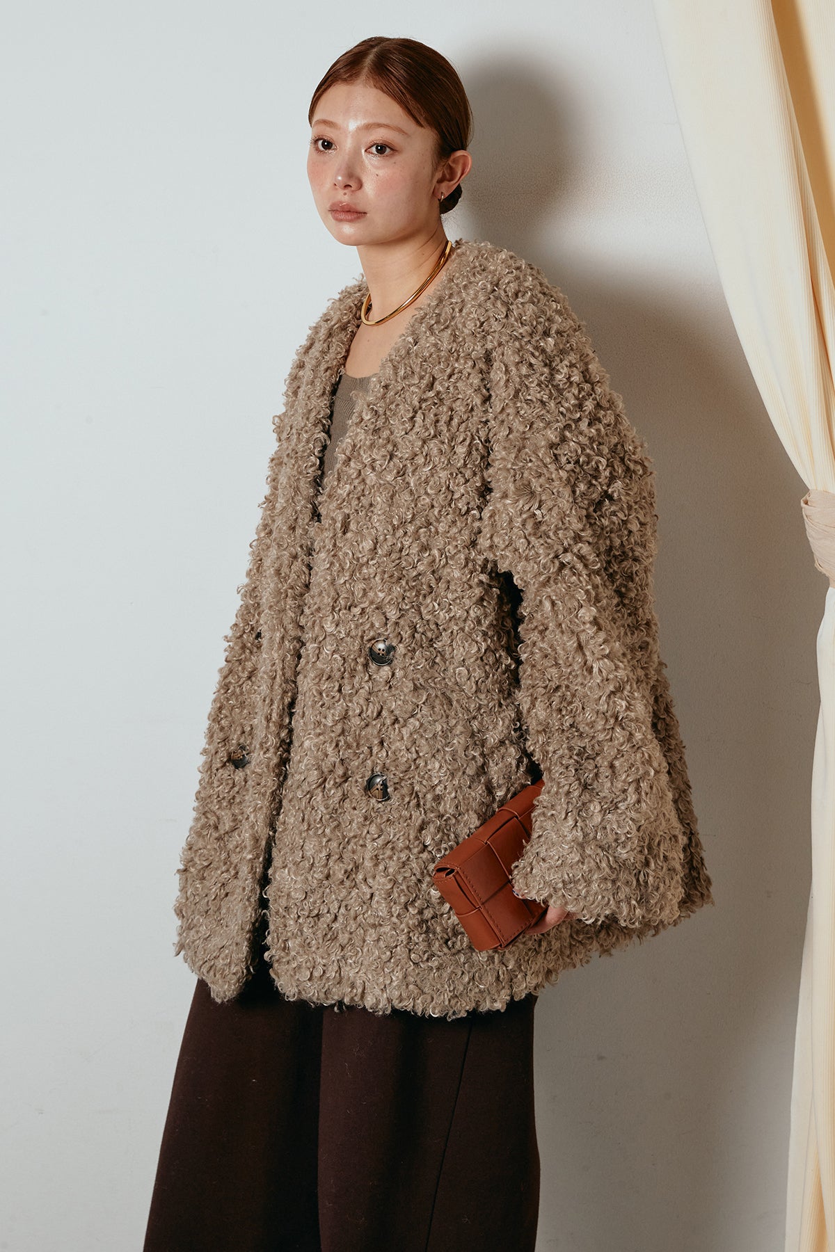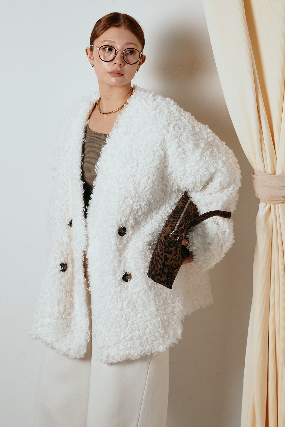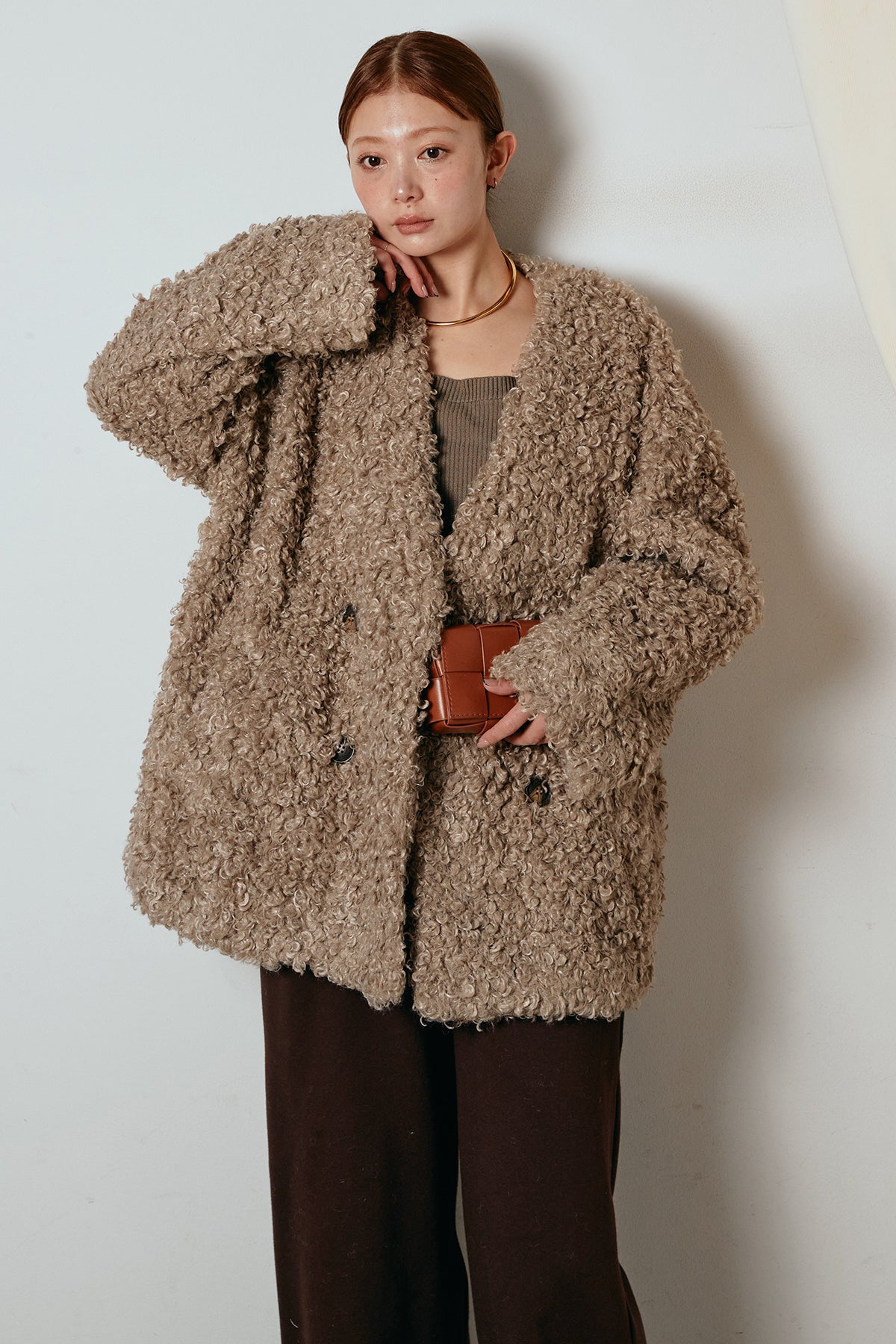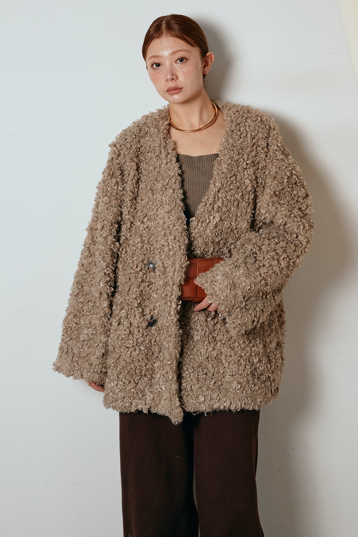 ふんわりとしたシープ調のファーが、優しいボリューム感とあたたかなムードを演出するファージャケット。柔らかな毛足が立体的な表情をつくり、シンプルなスタイリングにも存在感を添えます。前立てはすっきりとしたV開きで、インナーを問わず合わせやすいバランスに。軽やかな着心地ながらもしっかりと暖かく、デイリーからお出かけまで幅広く活躍。羽織るだけで季節感のあるスタイルが完成する一枚です。