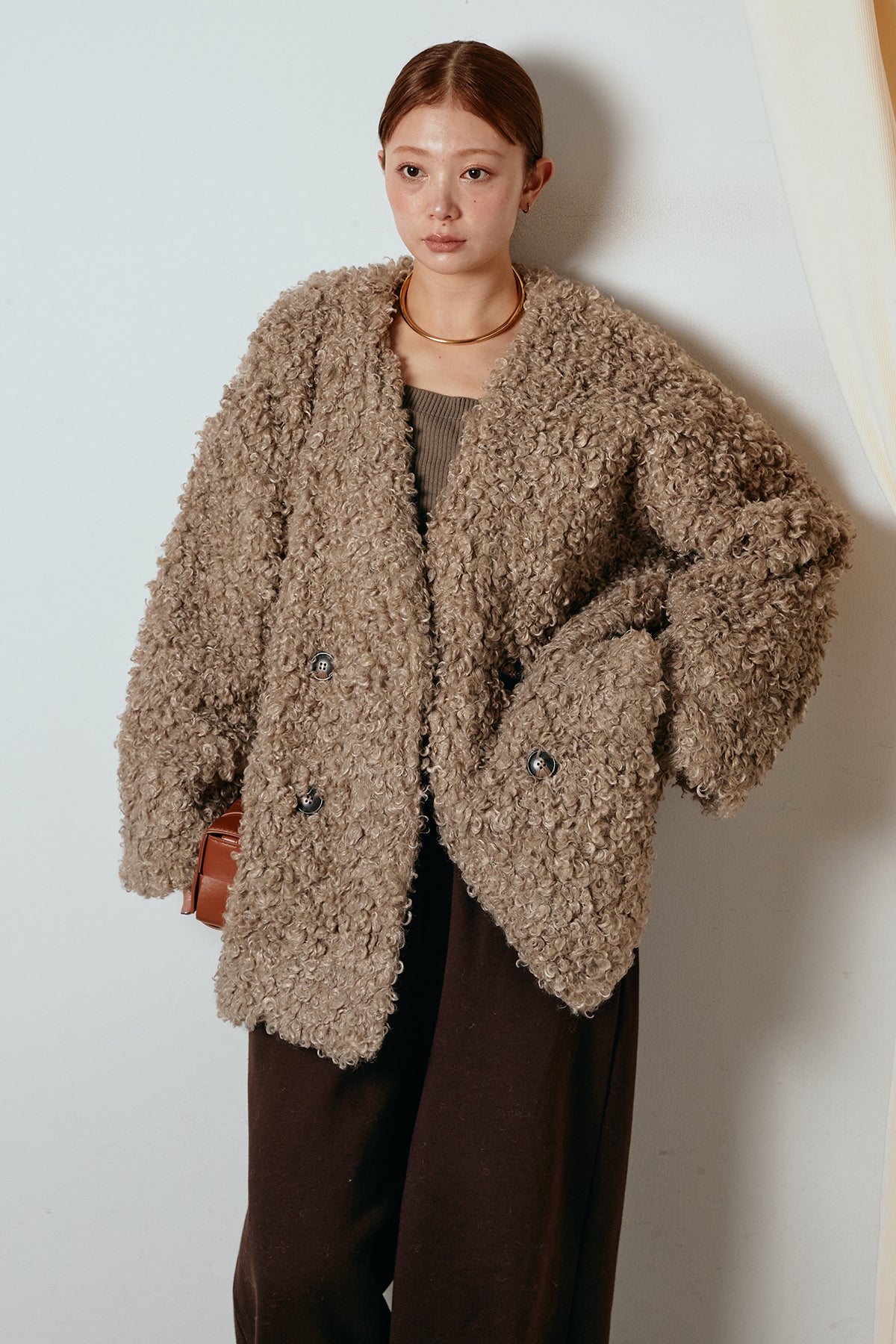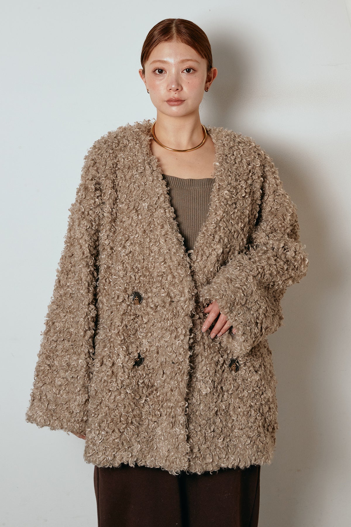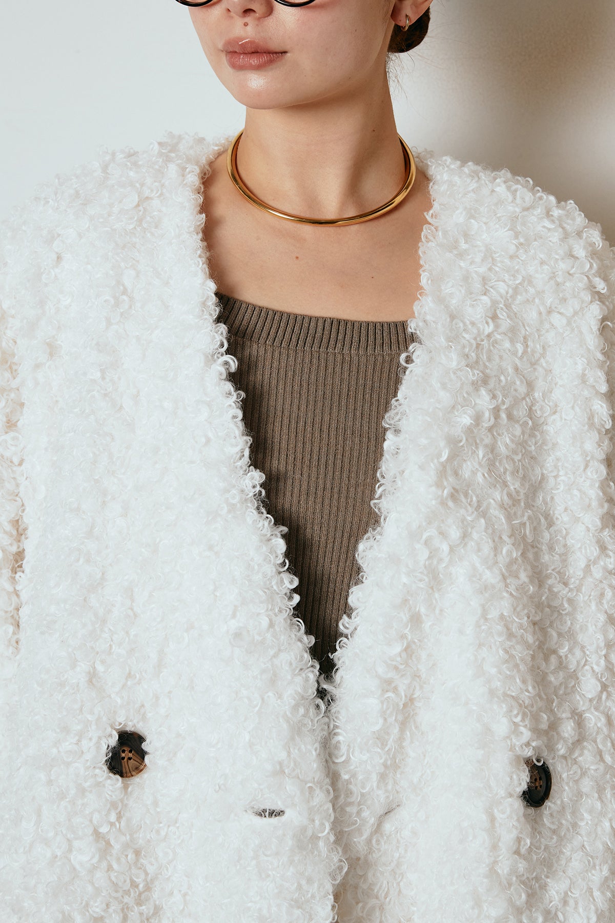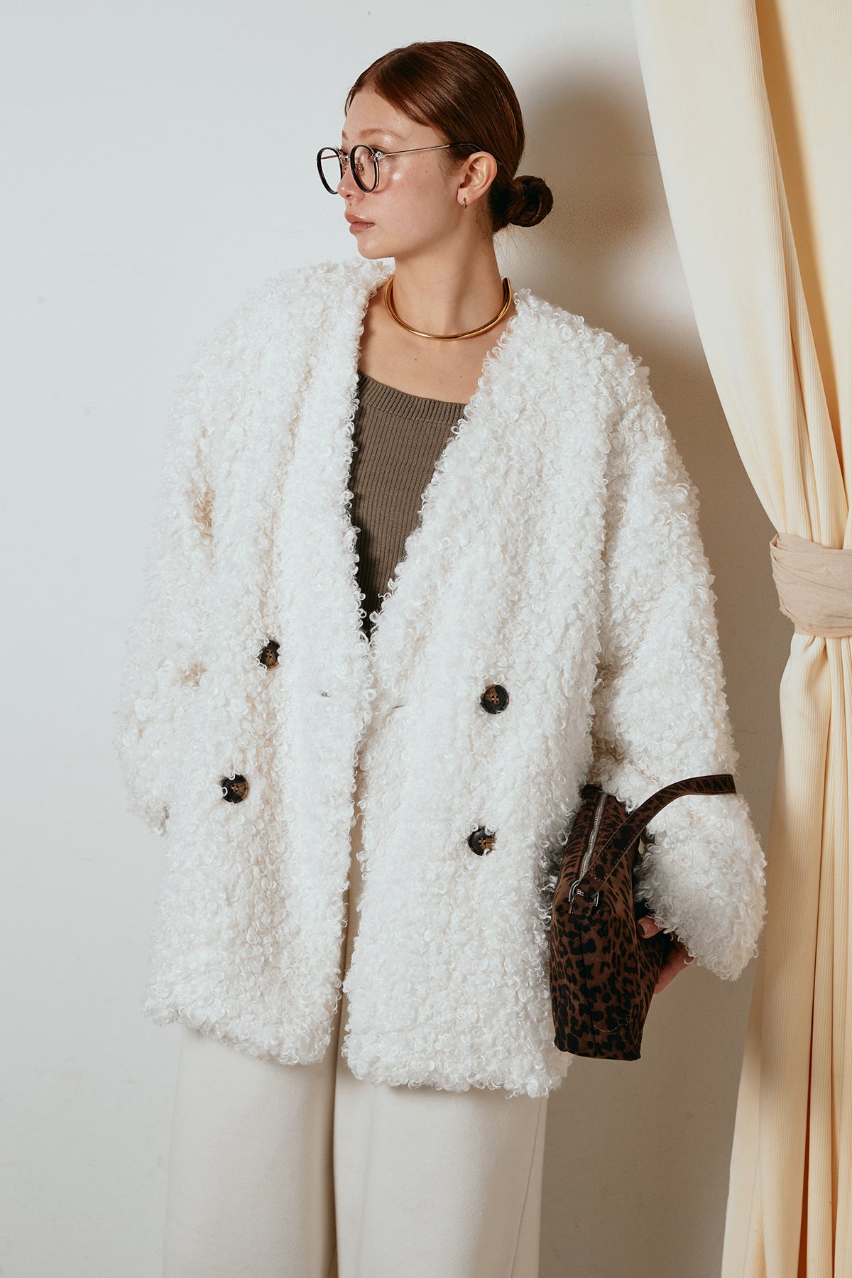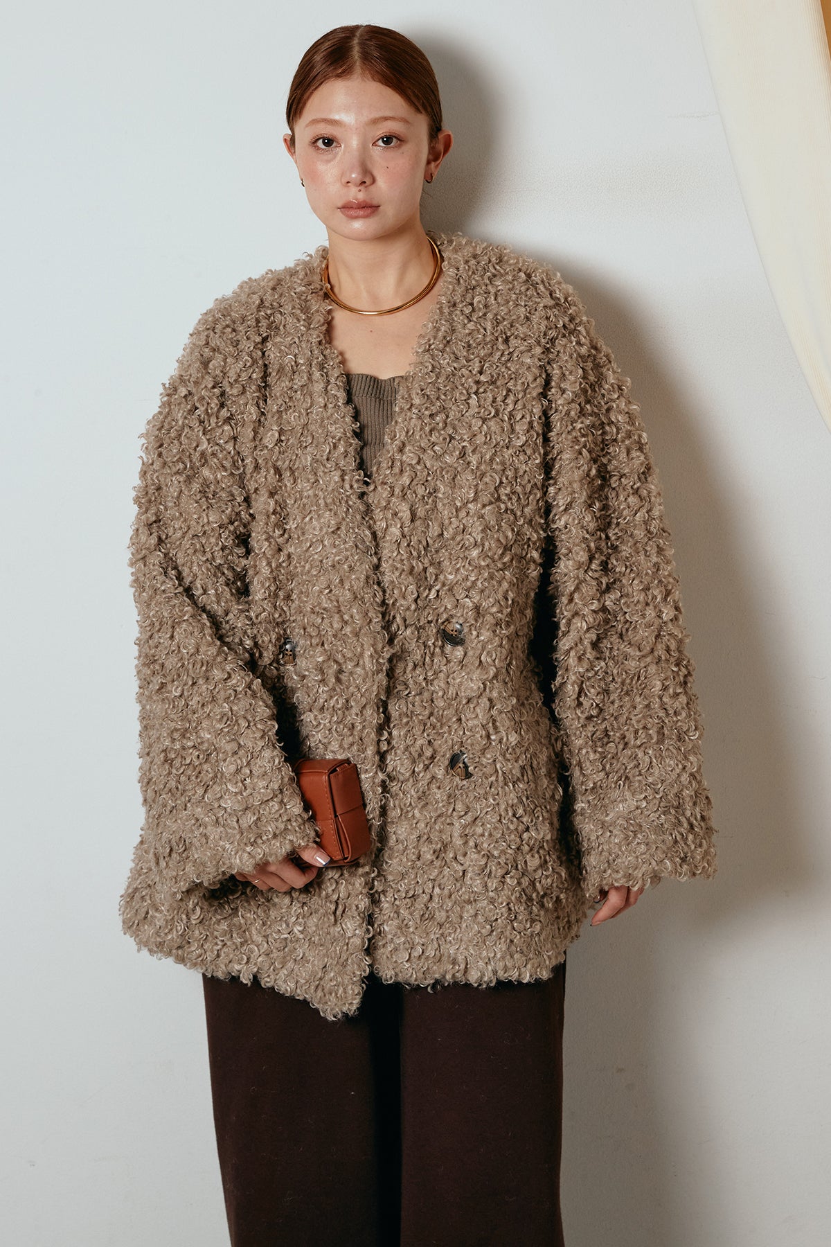 ふんわりとしたシープ調のファーが、優しいボリューム感とあたたかなムードを演出するファージャケット。柔らかな毛足が立体的な表情をつくり、シンプルなスタイリングにも存在感を添えます。前立てはすっきりとしたV開きで、インナーを問わず合わせやすいバランスに。軽やかな着心地ながらもしっかりと暖かく、デイリーからお出かけまで幅広く活躍。羽織るだけで季節感のあるスタイルが完成する一枚です。