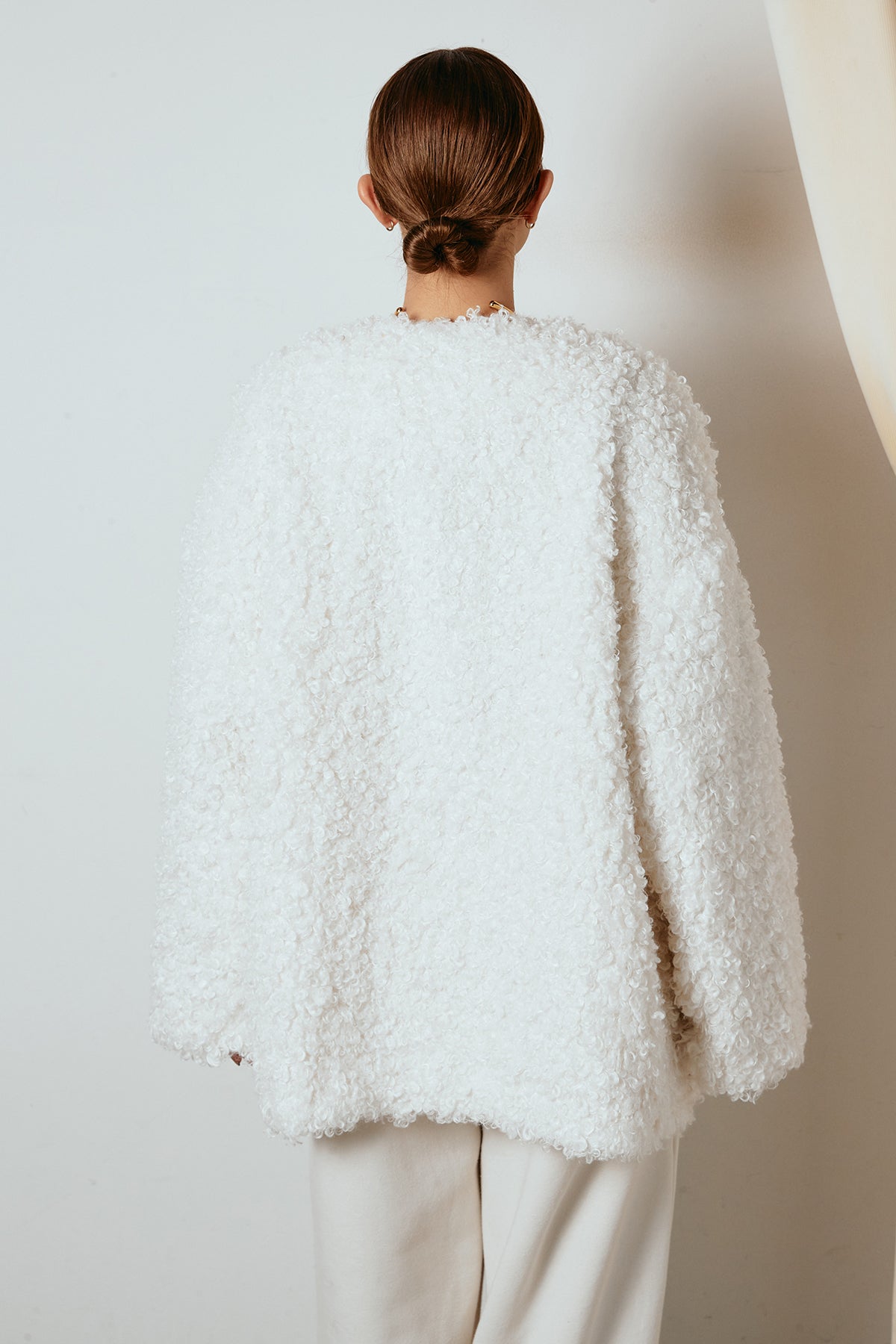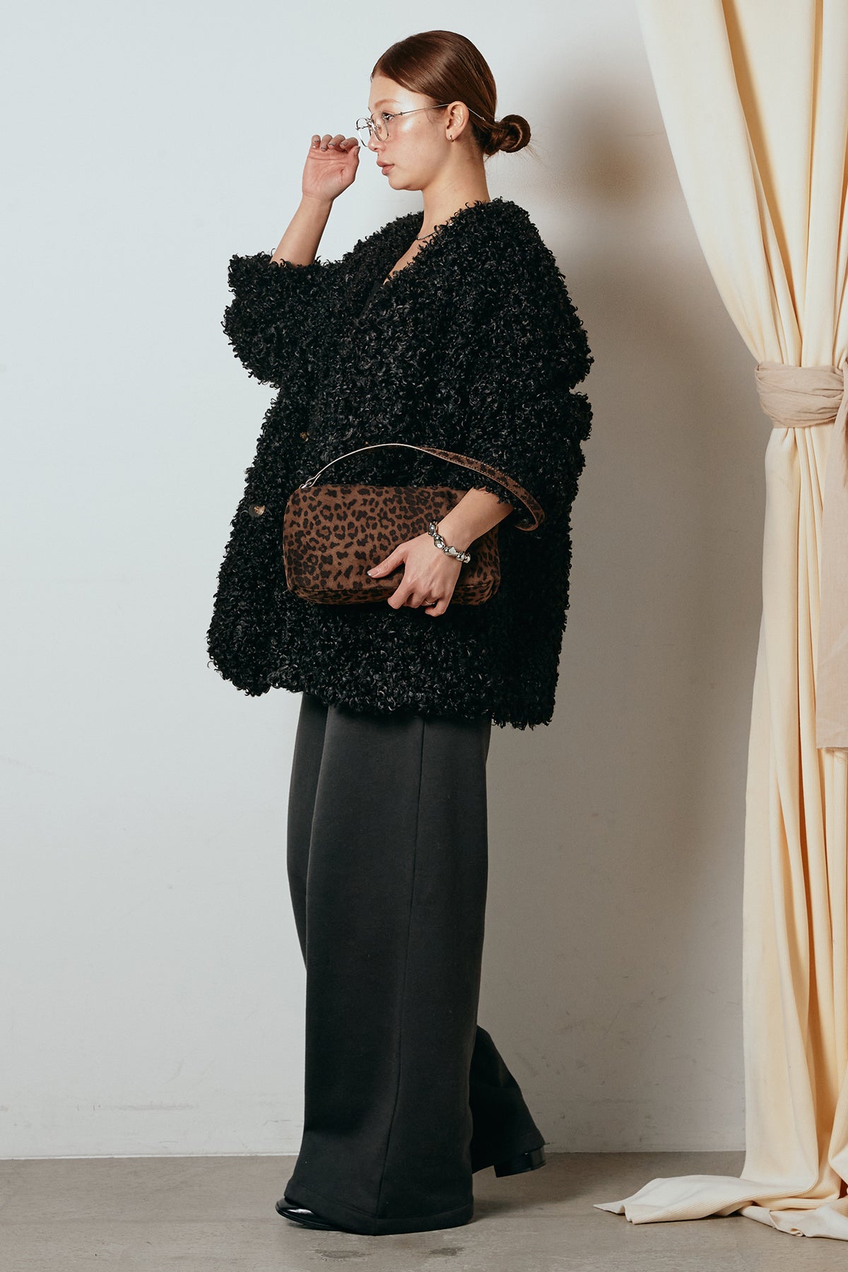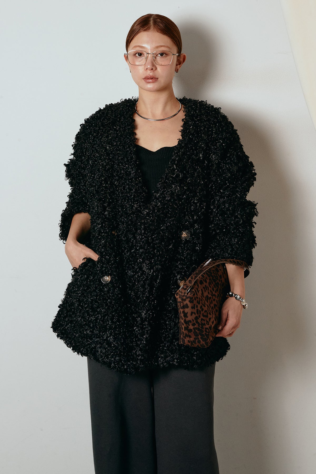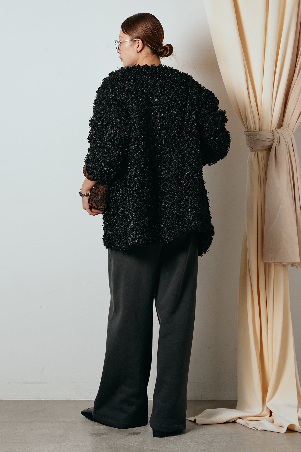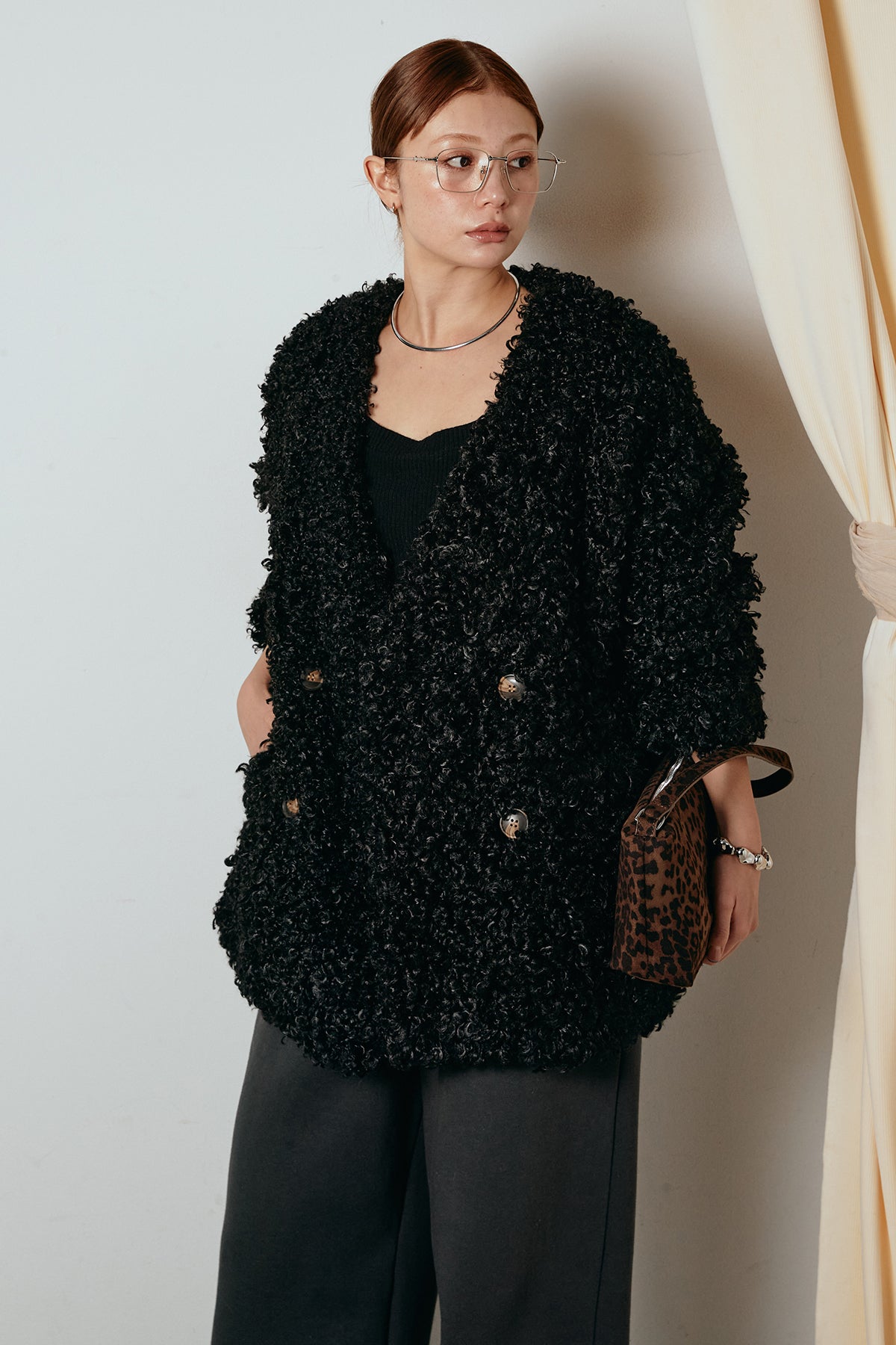 ふんわりとしたシープ調のファーが、優しいボリューム感とあたたかなムードを演出するファージャケット。柔らかな毛足が立体的な表情をつくり、シンプルなスタイリングにも存在感を添えます。前立てはすっきりとしたV開きで、インナーを問わず合わせやすいバランスに。軽やかな着心地ながらもしっかりと暖かく、デイリーからお出かけまで幅広く活躍。羽織るだけで季節感のあるスタイルが完成する一枚です。