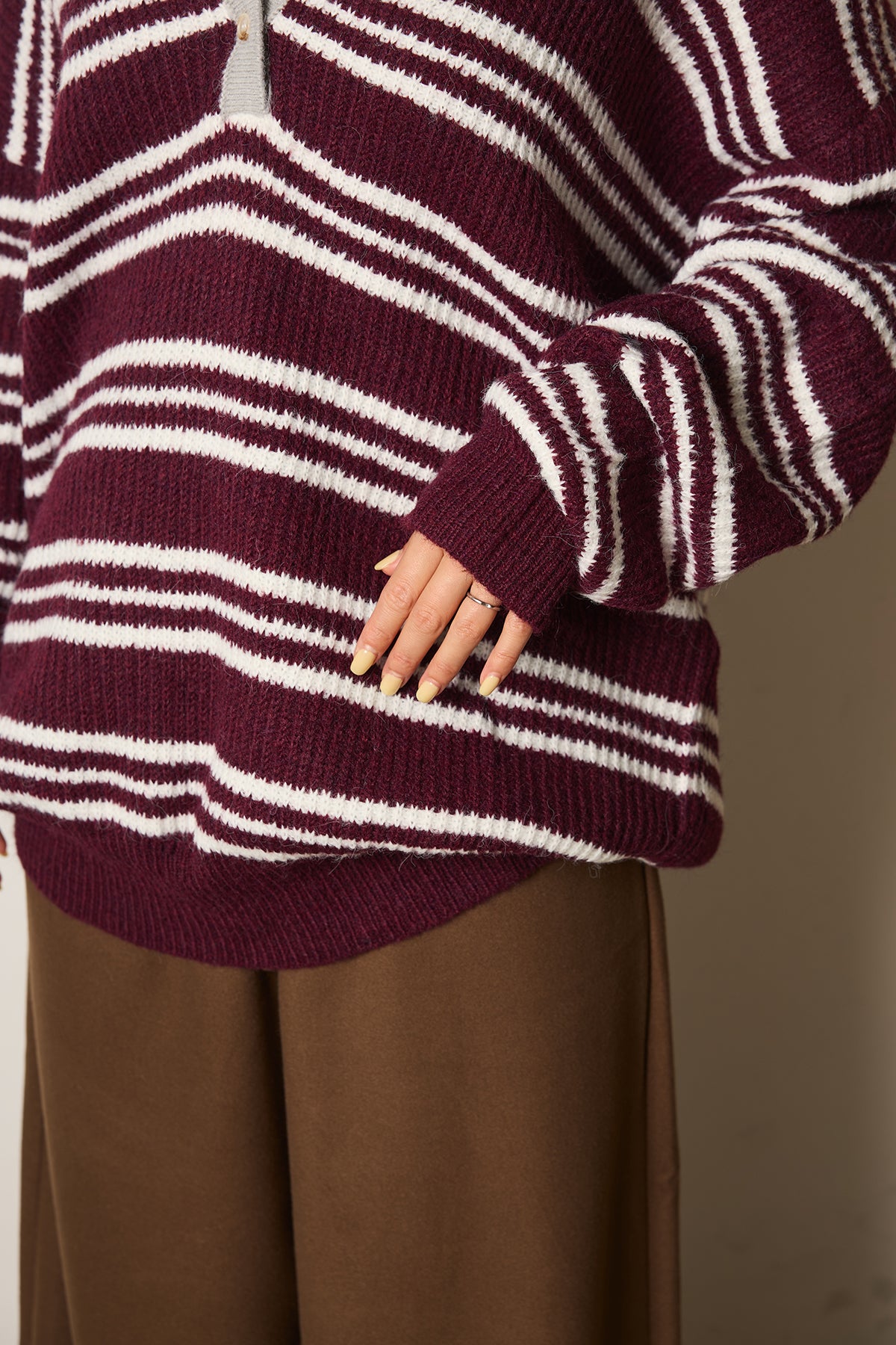大胆なマルチボーダーが目を引くニットポロトップス。ほどよい深さのネックラインが抜け感を与え、ゆとりのあるシルエットでリラックス感のある着こなしを叶えます。カジュアルな中にも洗練された雰囲気が漂い、デニムからスカートまで幅広いスタイリングに活躍する一枚です。