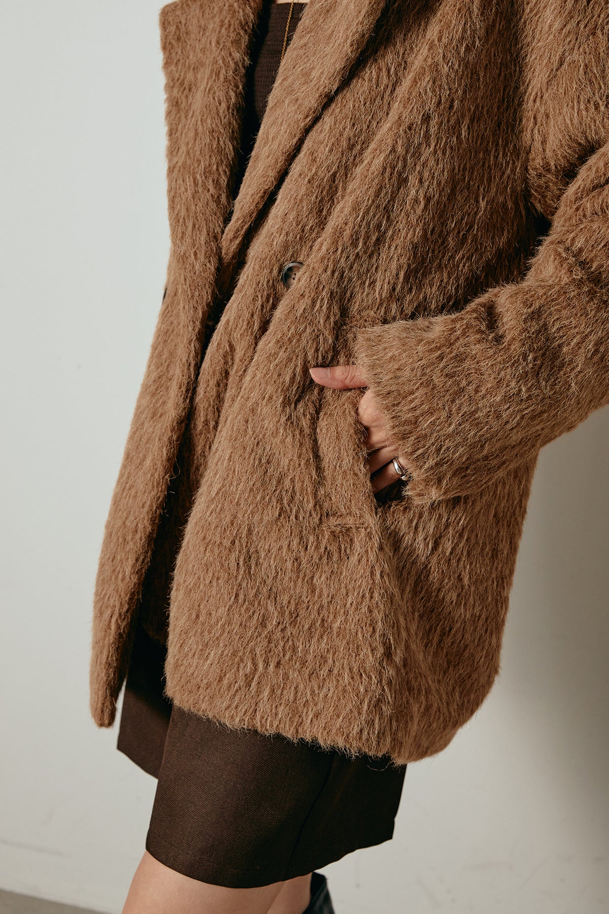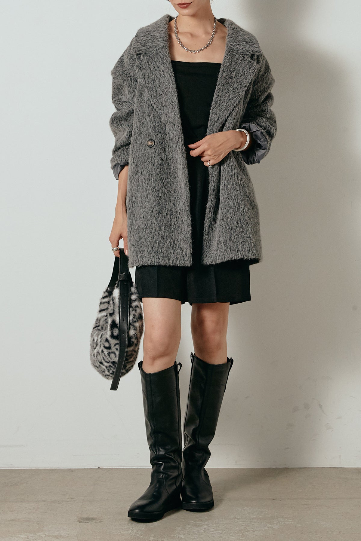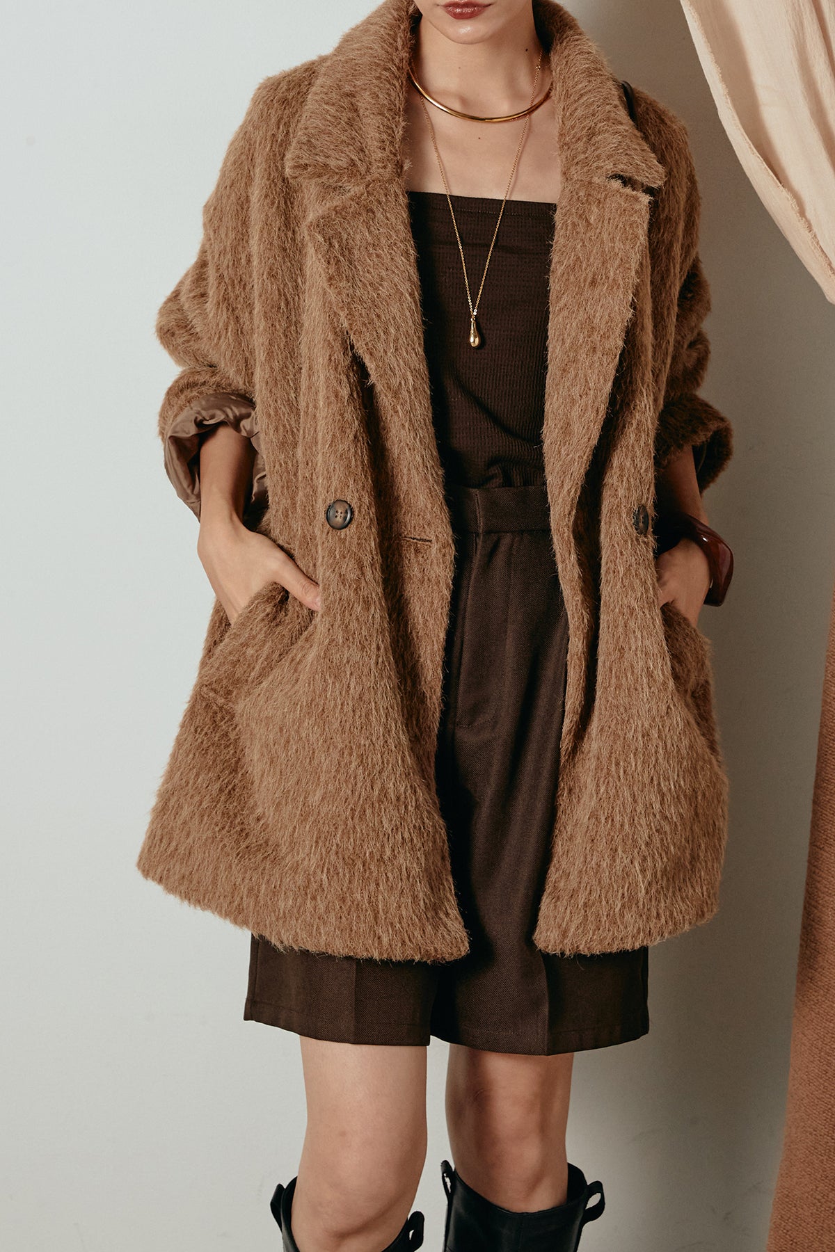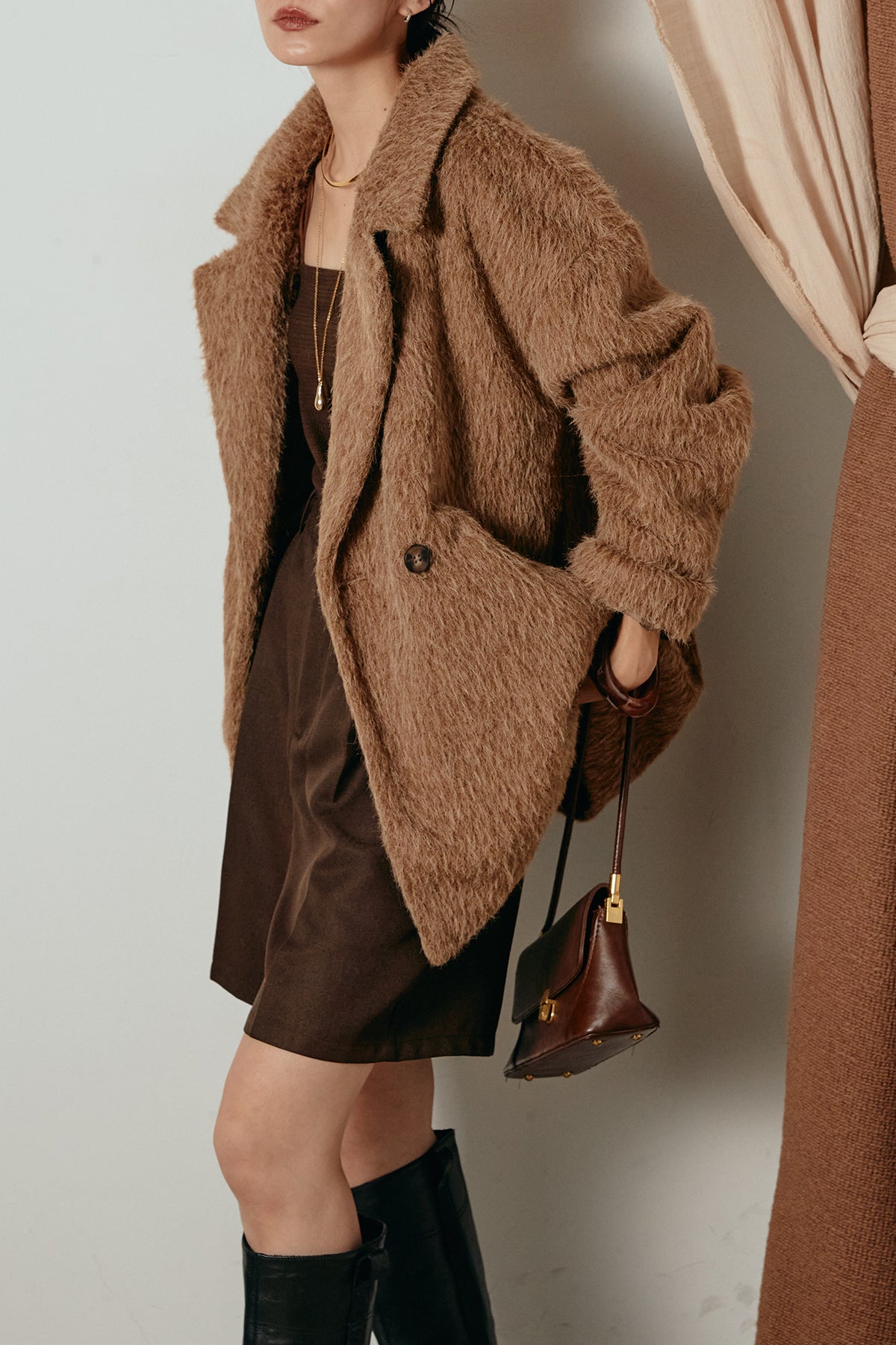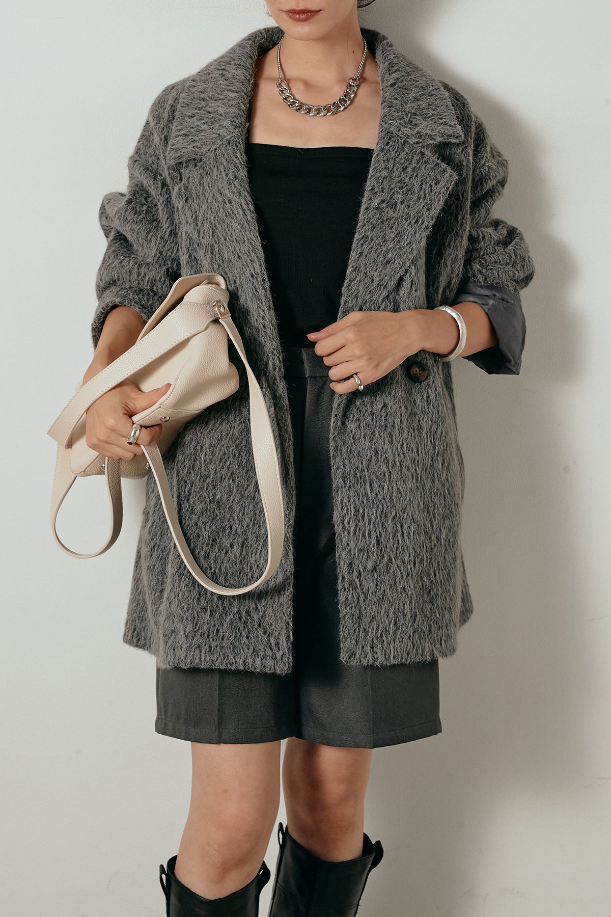 シャギー感のある起毛素材で仕上げたジャケットコート。ふっくらとした質感が暖かみを添え、シンプルなスタイルにプラスするだけで上品な雰囲気を演出します。ミドル丈のシルエットで全体のバランスが取りやすく、コーディネートの主役としても活躍します。