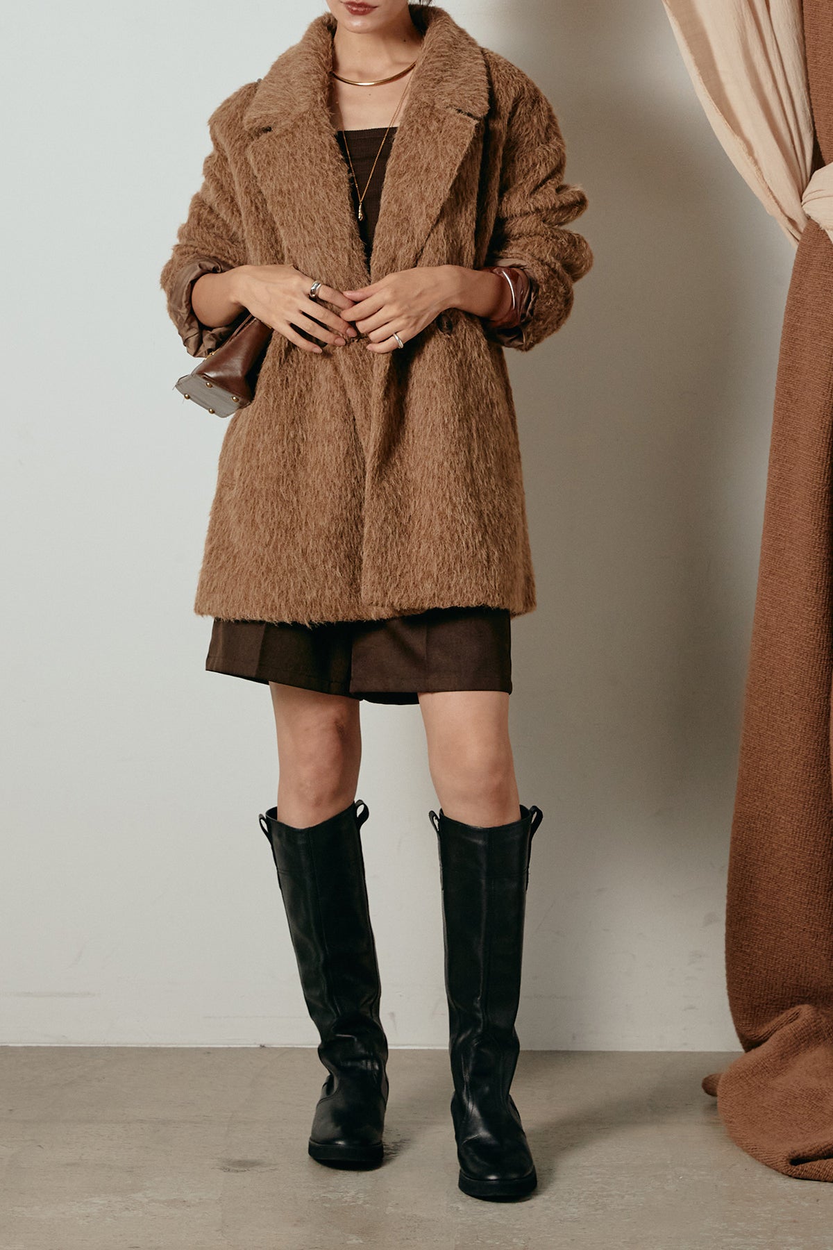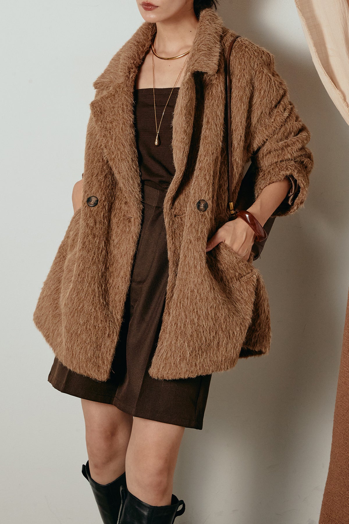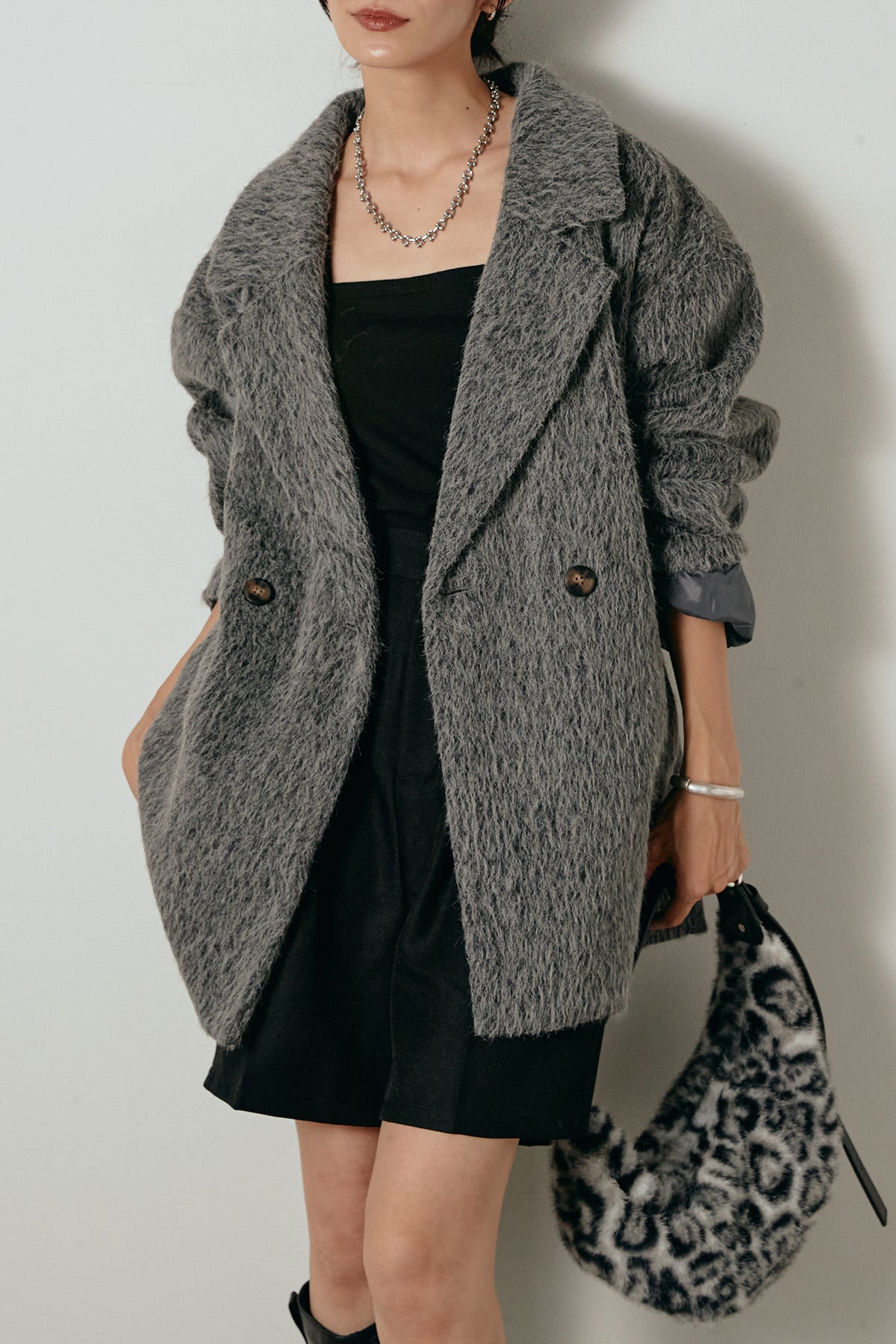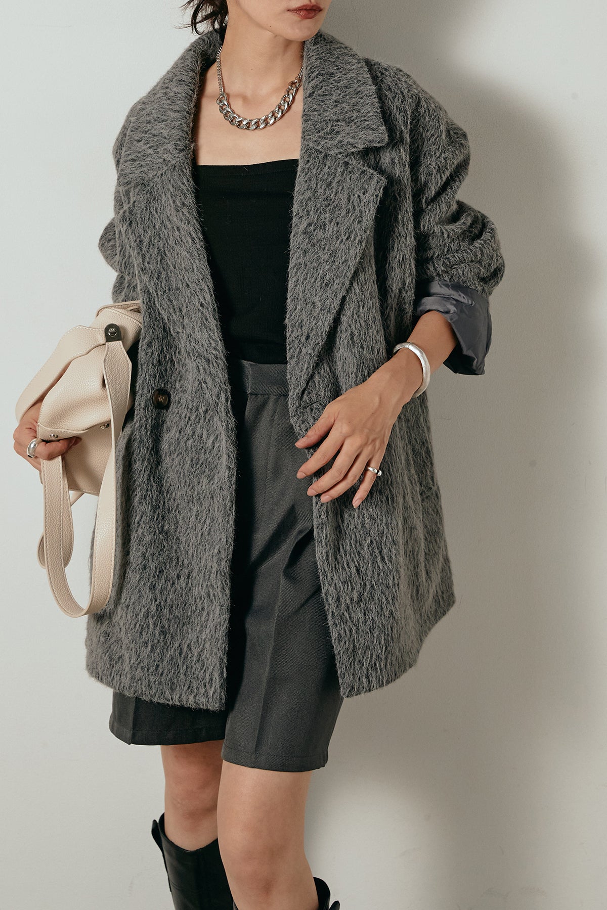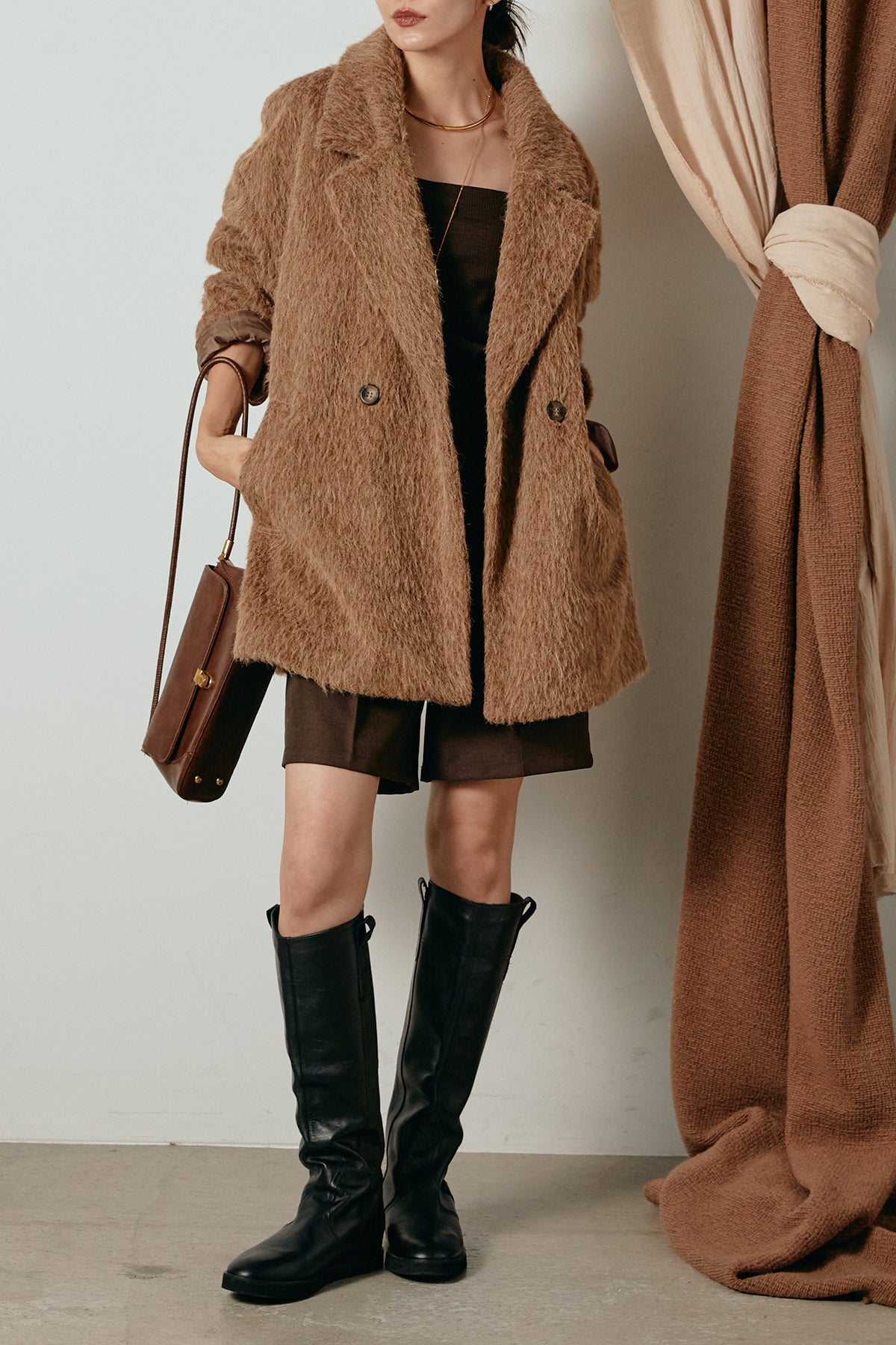 シャギー感のある起毛素材で仕上げたジャケットコート。ふっくらとした質感が暖かみを添え、シンプルなスタイルにプラスするだけで上品な雰囲気を演出します。ミドル丈のシルエットで全体のバランスが取りやすく、コーディネートの主役としても活躍します。