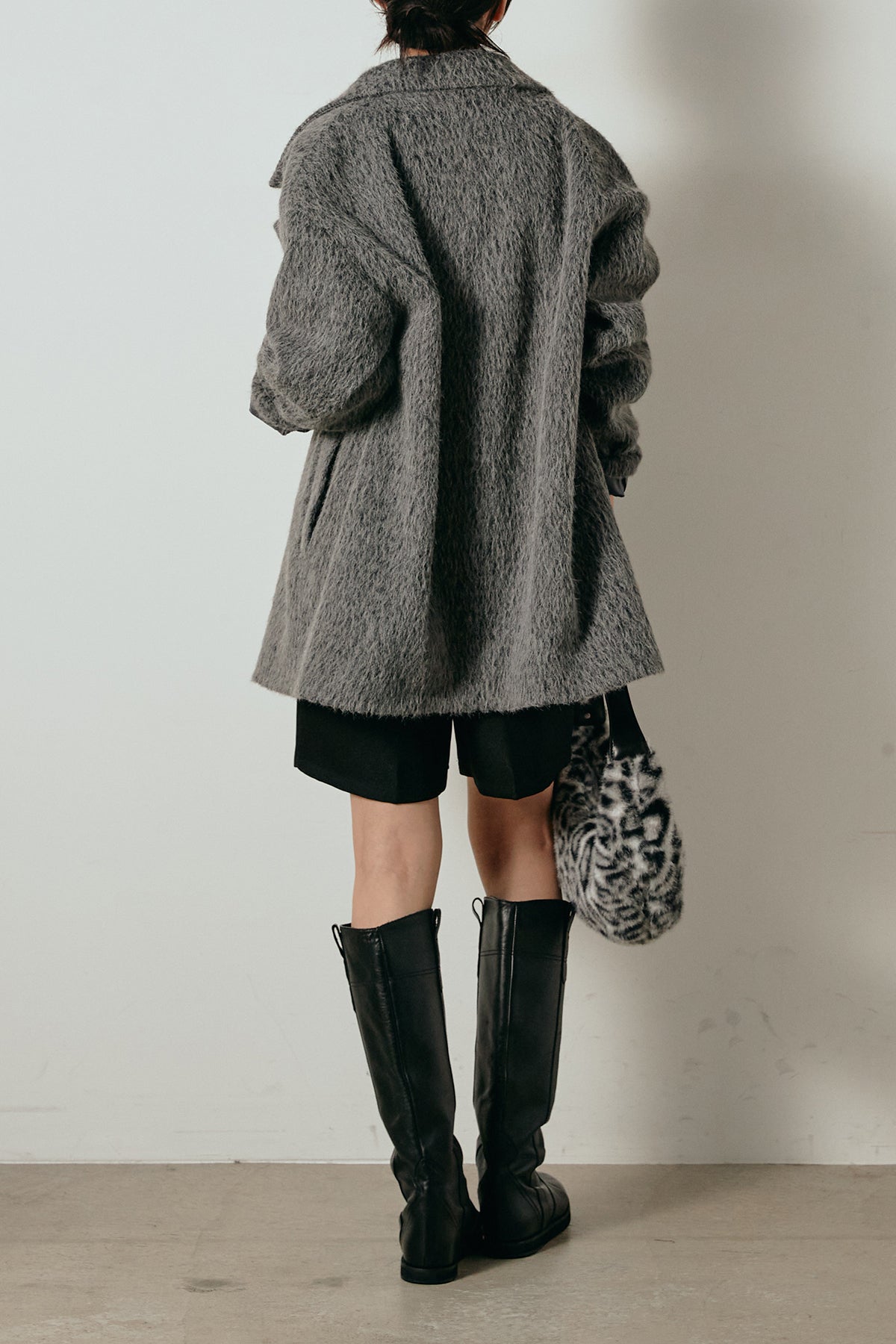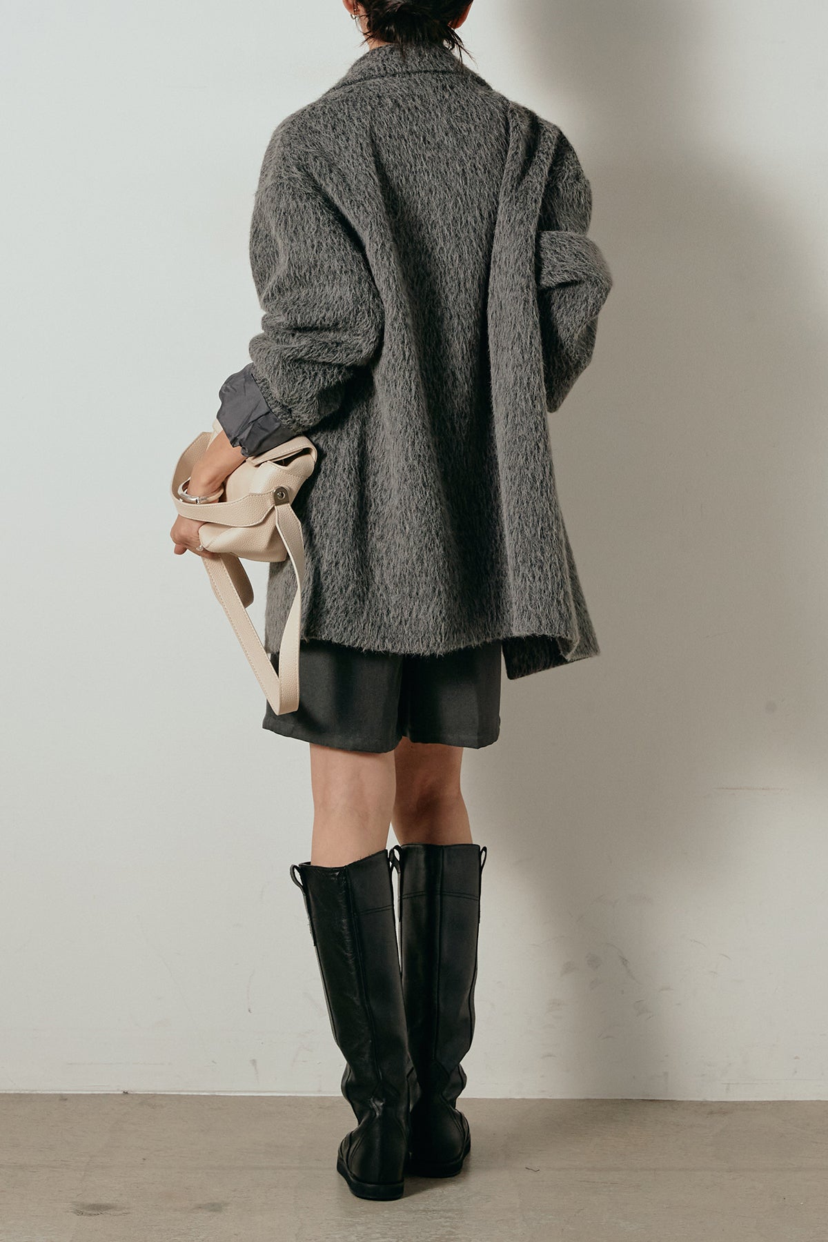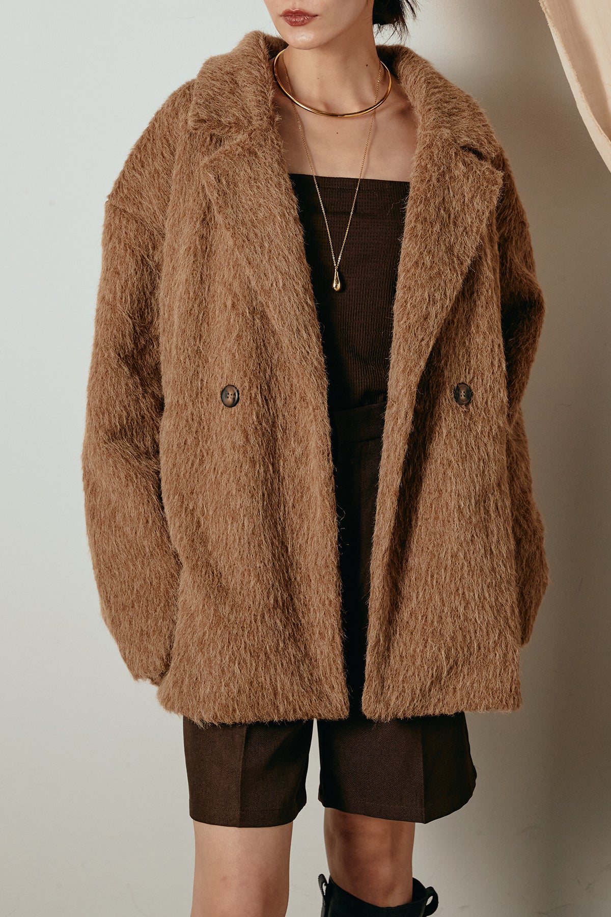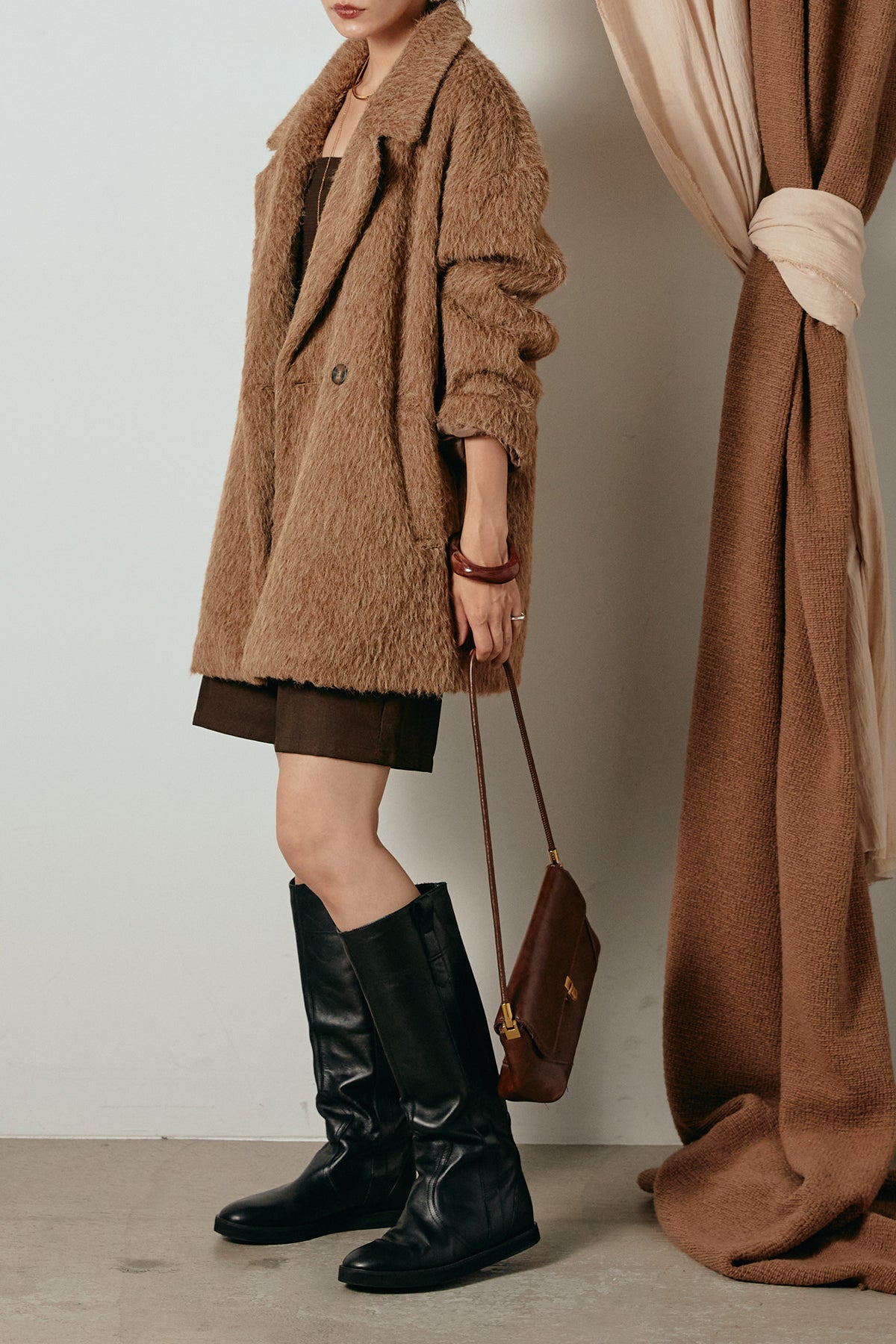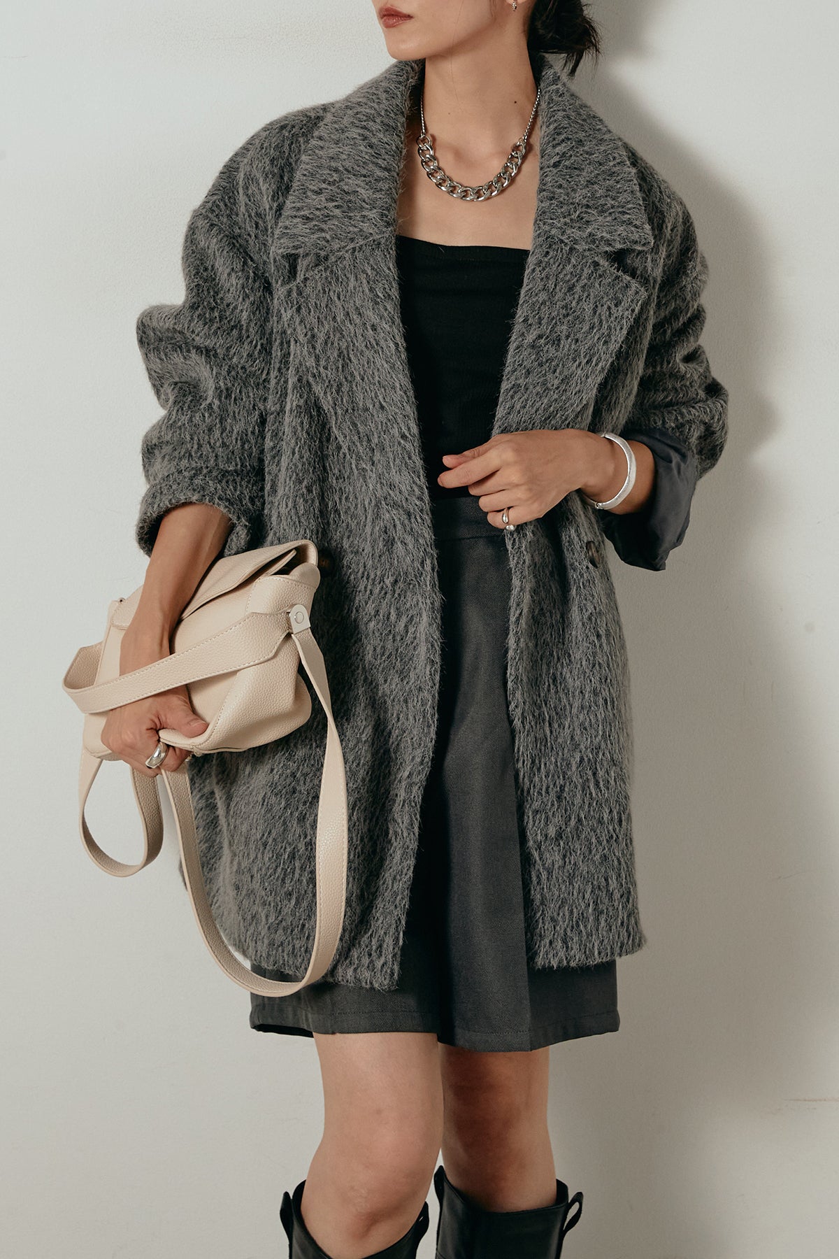 シャギー感のある起毛素材で仕上げたジャケットコート。ふっくらとした質感が暖かみを添え、シンプルなスタイルにプラスするだけで上品な雰囲気を演出します。ミドル丈のシルエットで全体のバランスが取りやすく、コーディネートの主役としても活躍します。
