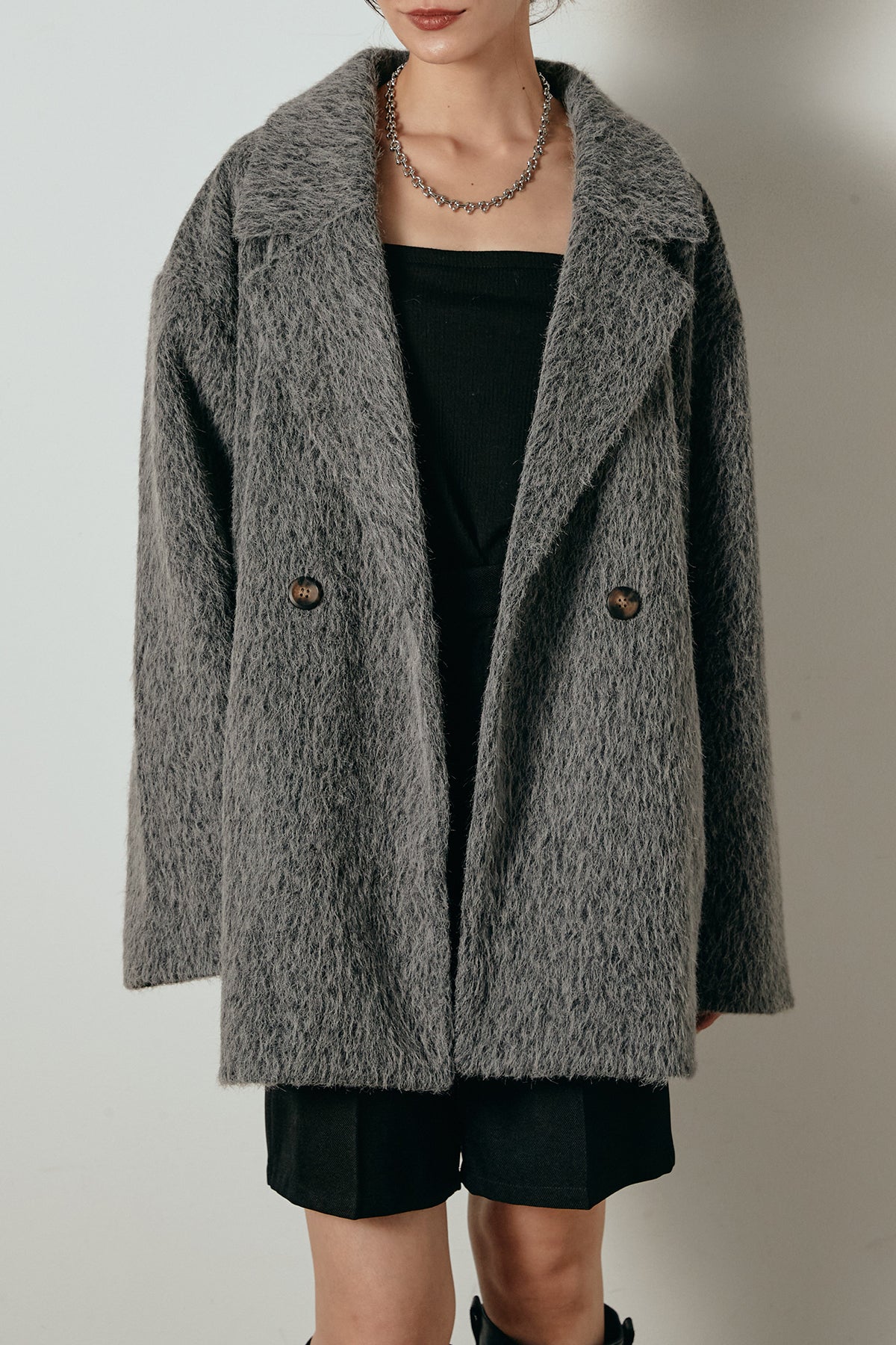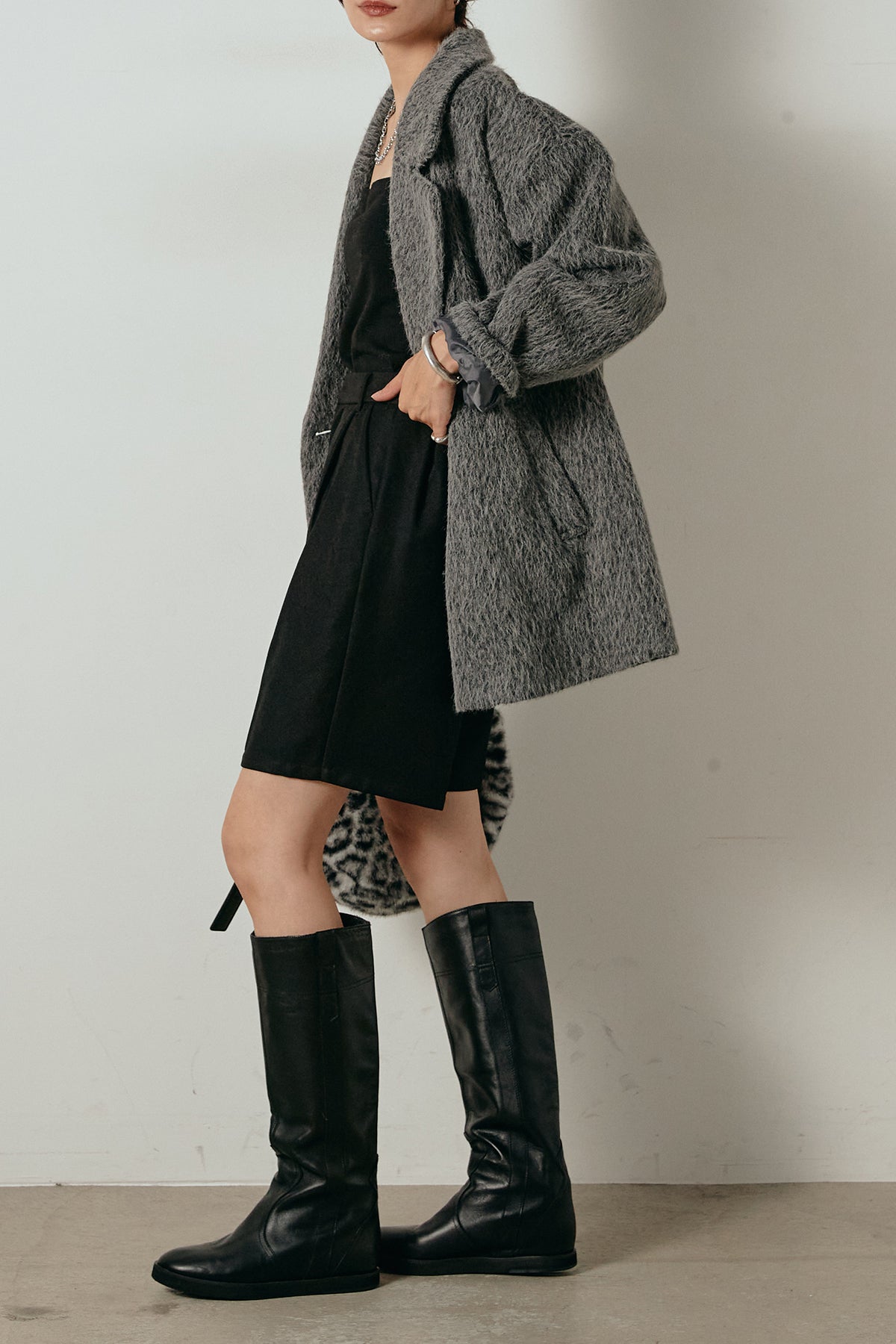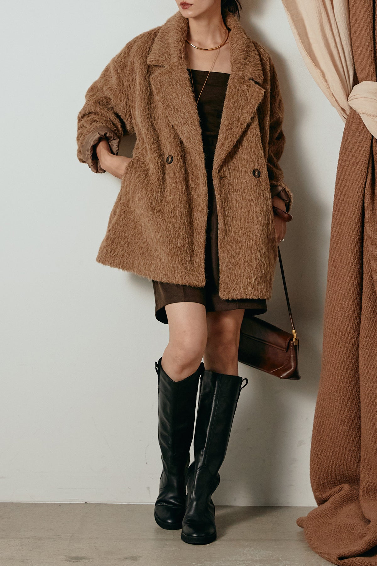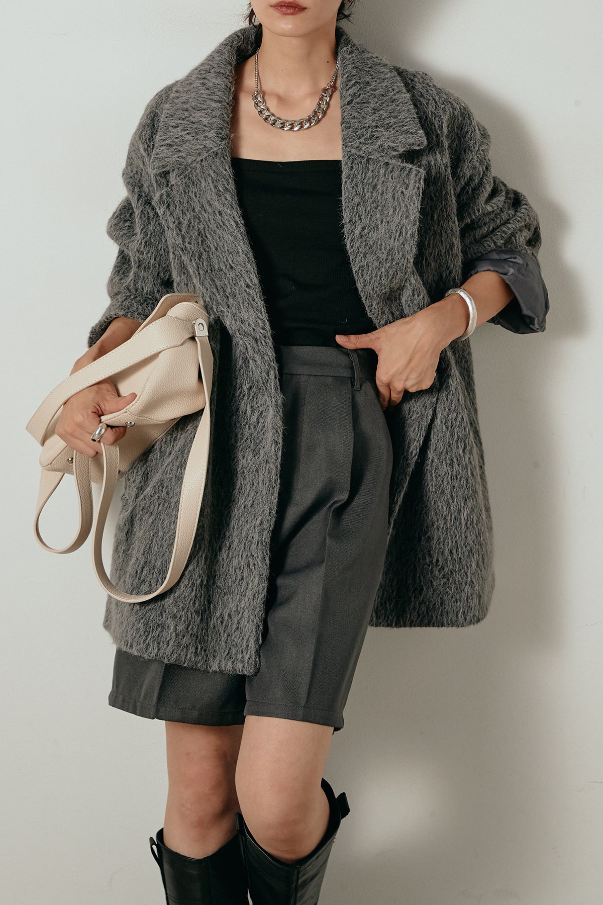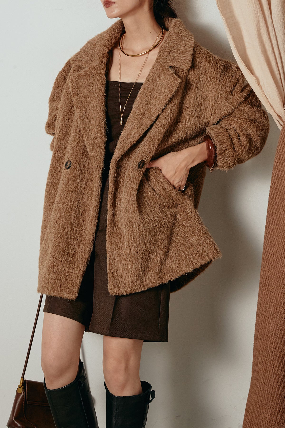 シャギー感のある起毛素材で仕上げたジャケットコート。ふっくらとした質感が暖かみを添え、シンプルなスタイルにプラスするだけで上品な雰囲気を演出します。ミドル丈のシルエットで全体のバランスが取りやすく、コーディネートの主役としても活躍します。