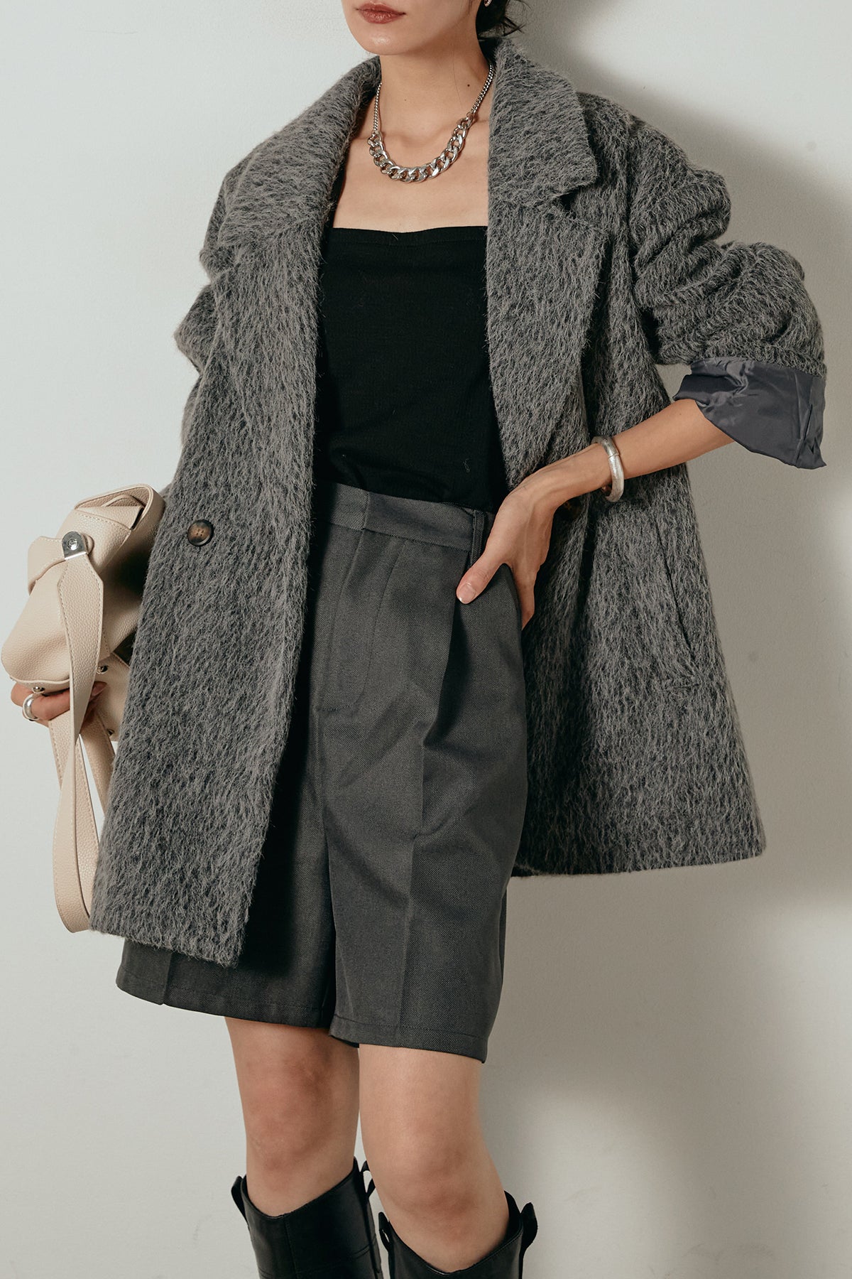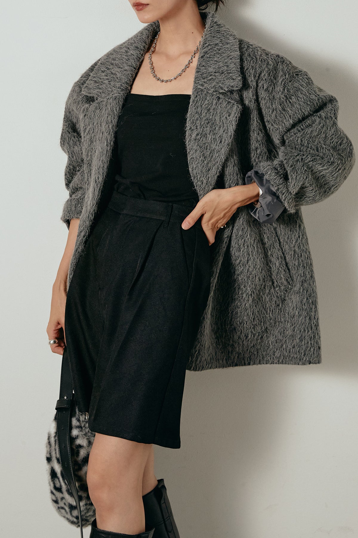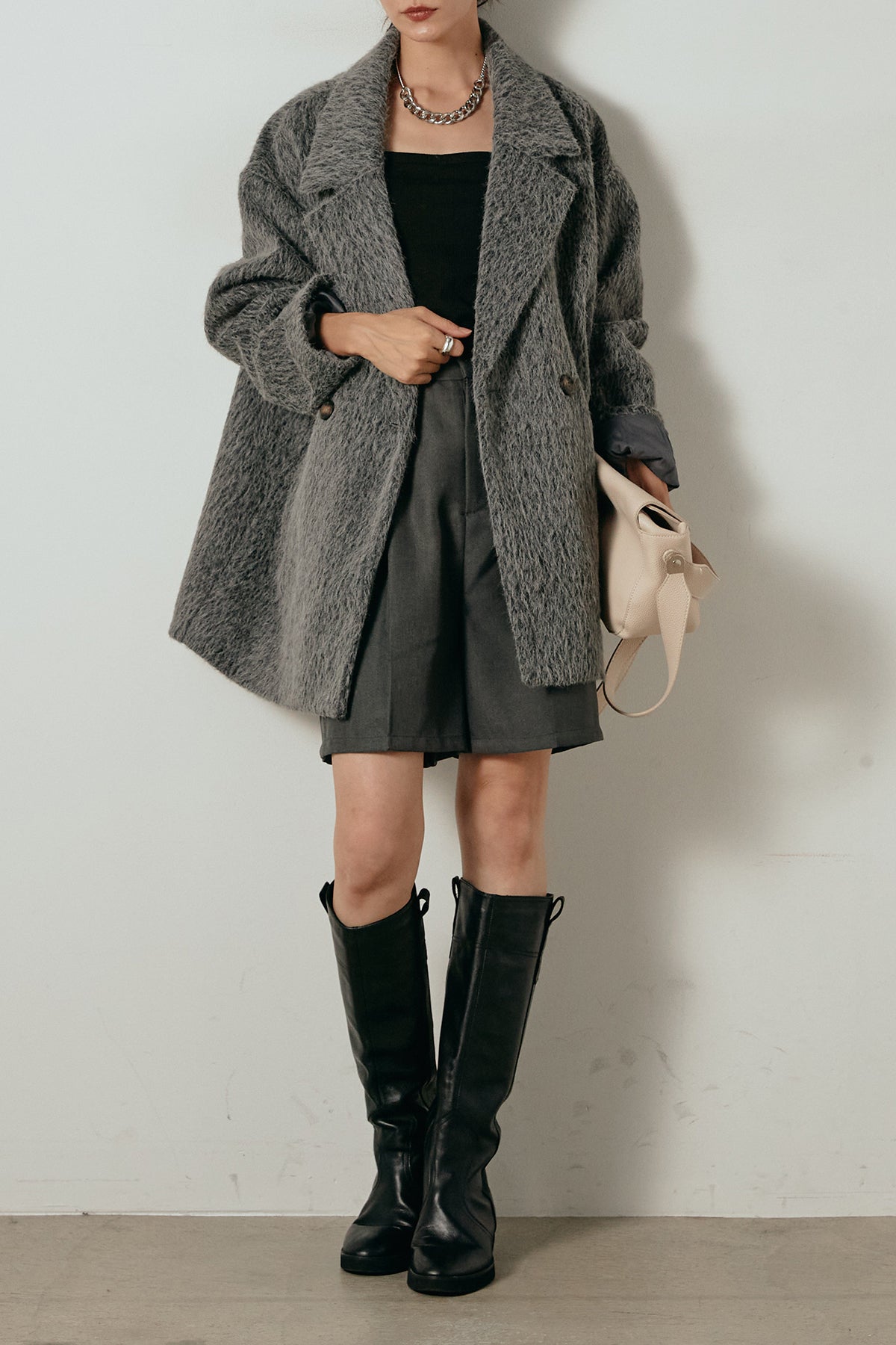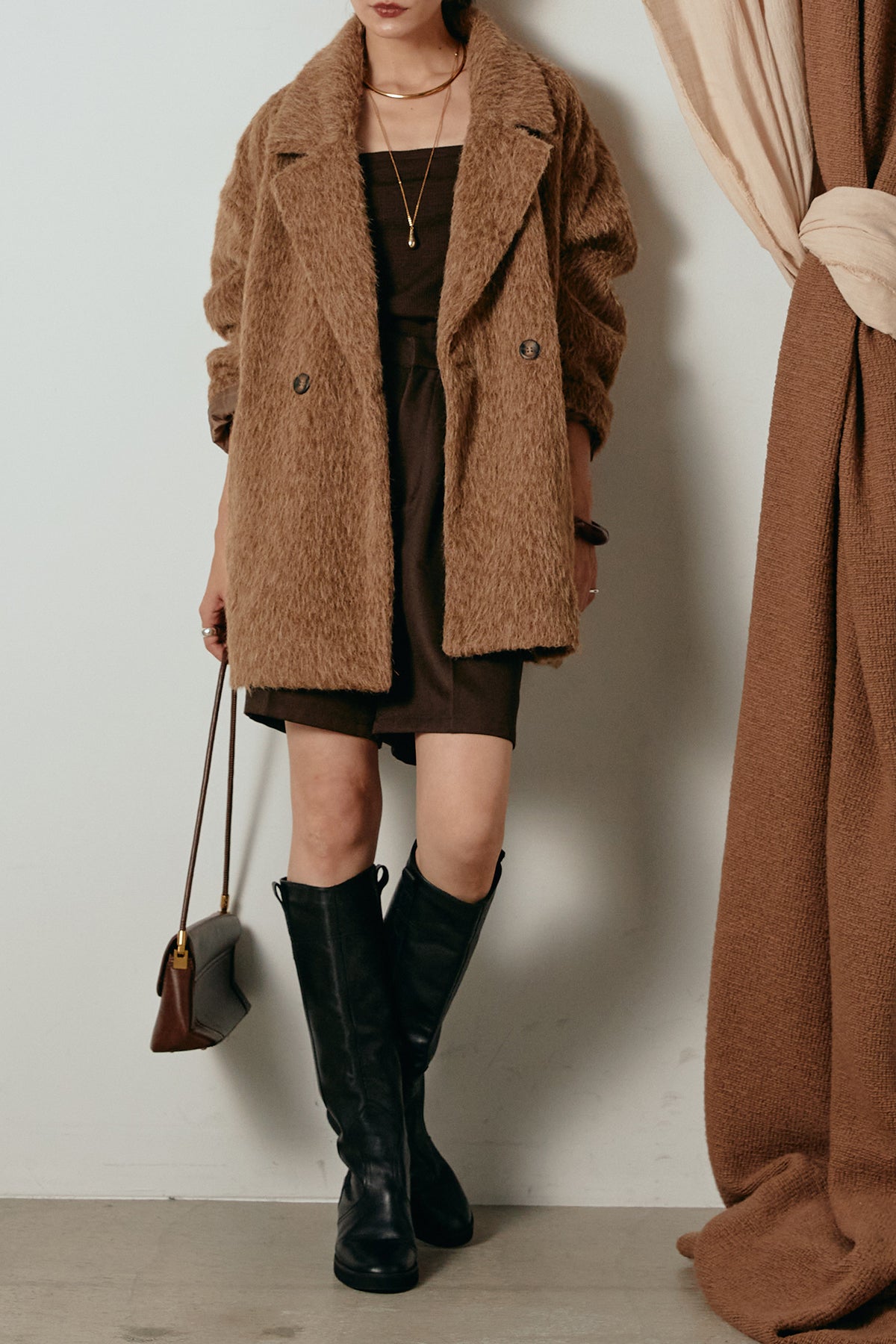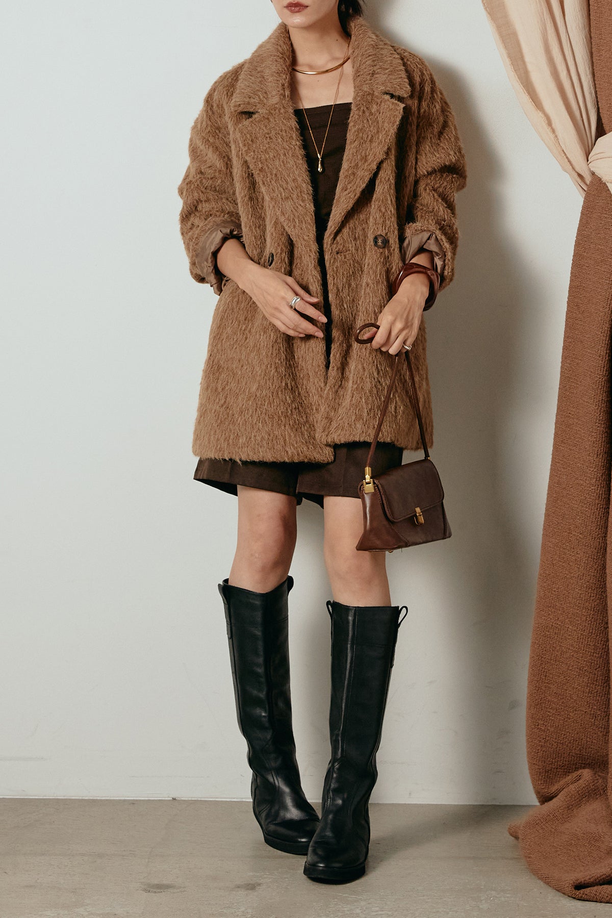 シャギー感のある起毛素材で仕上げたジャケットコート。ふっくらとした質感が暖かみを添え、シンプルなスタイルにプラスするだけで上品な雰囲気を演出します。ミドル丈のシルエットで全体のバランスが取りやすく、コーディネートの主役としても活躍します。
