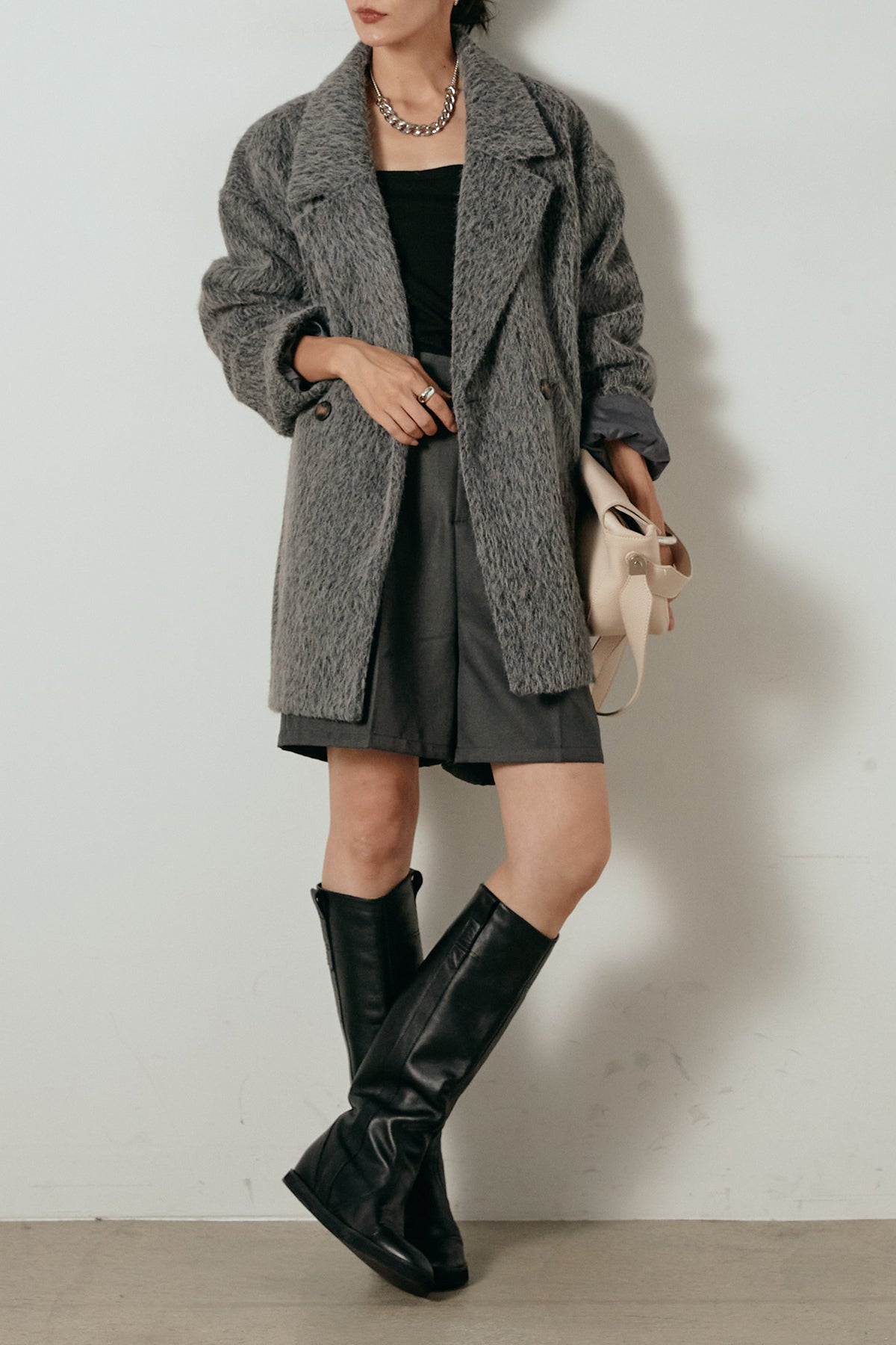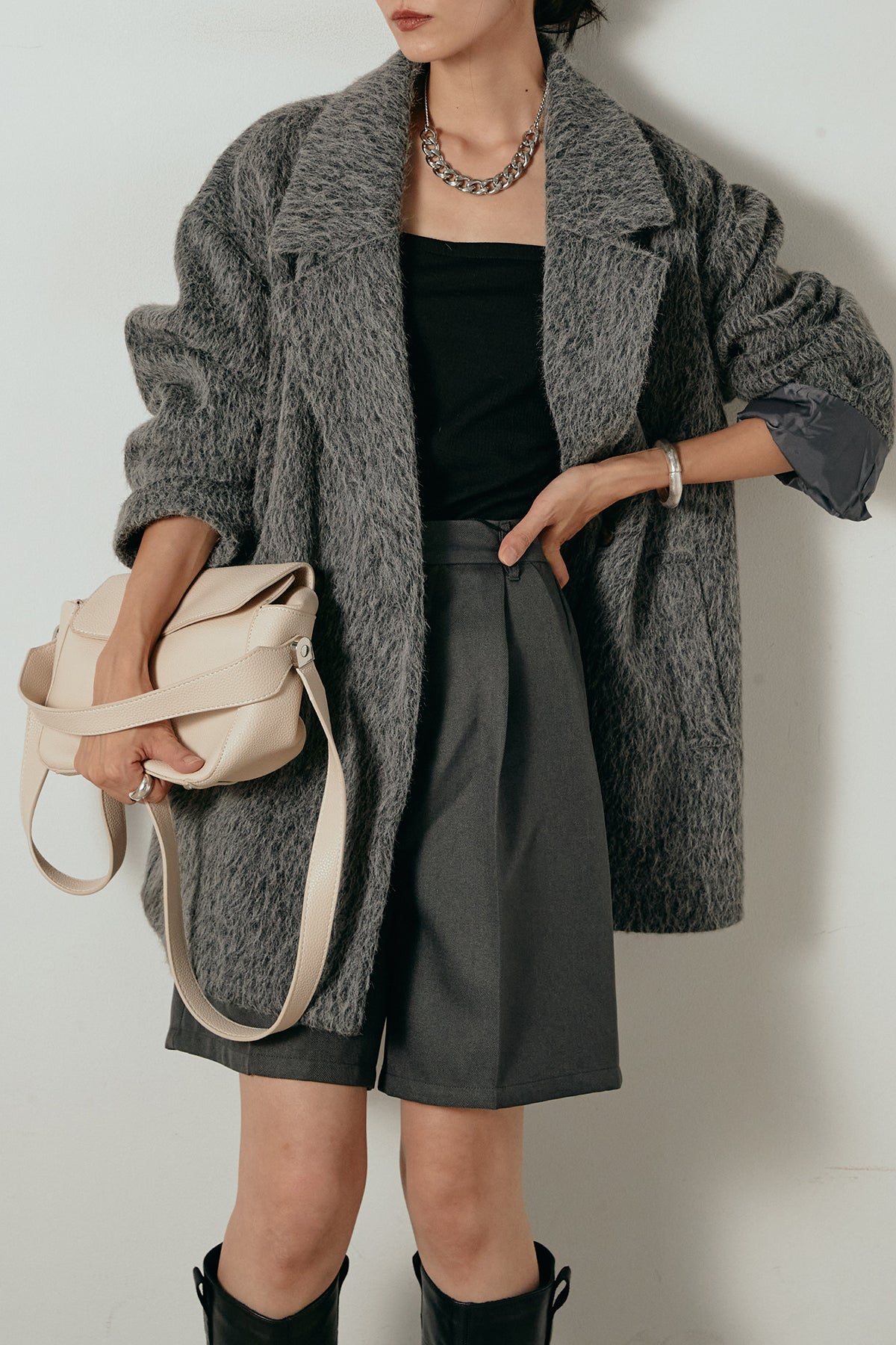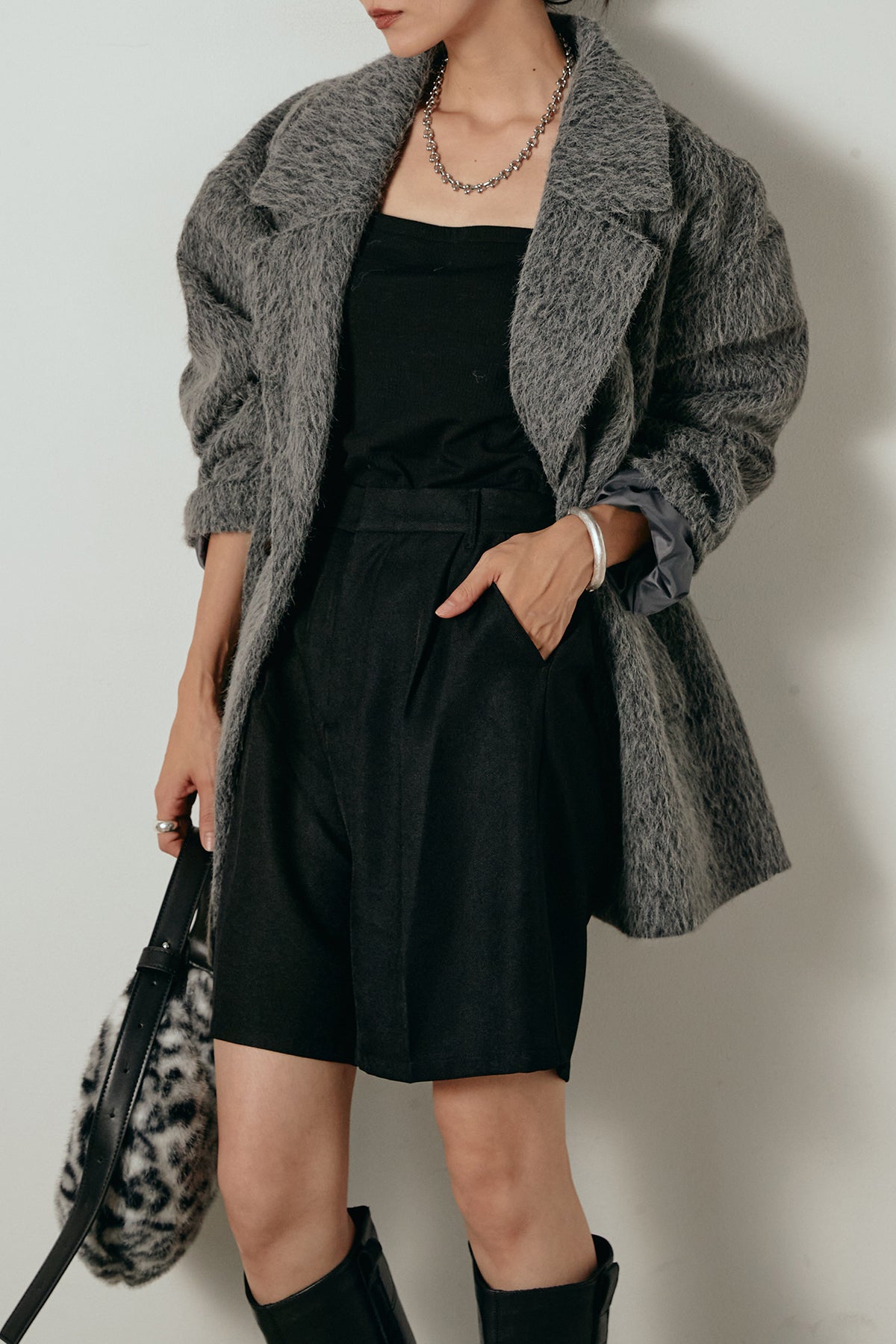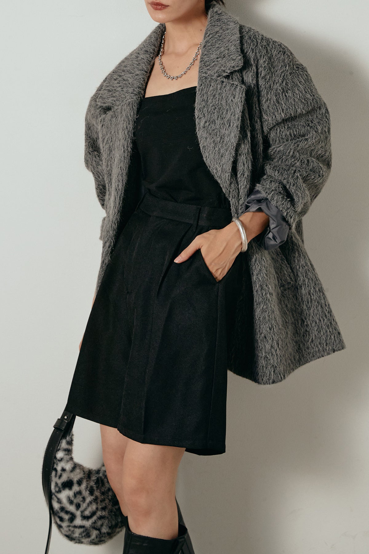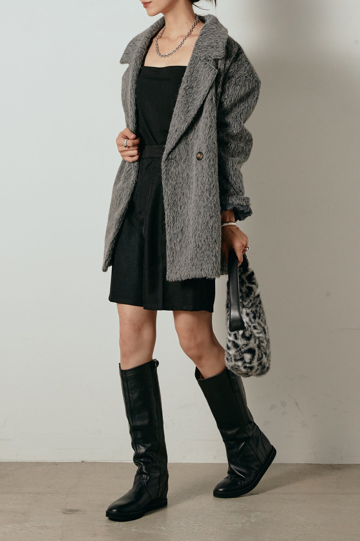 シャギー感のある起毛素材で仕上げたジャケットコート。ふっくらとした質感が暖かみを添え、シンプルなスタイルにプラスするだけで上品な雰囲気を演出します。ミドル丈のシルエットで全体のバランスが取りやすく、コーディネートの主役としても活躍します。