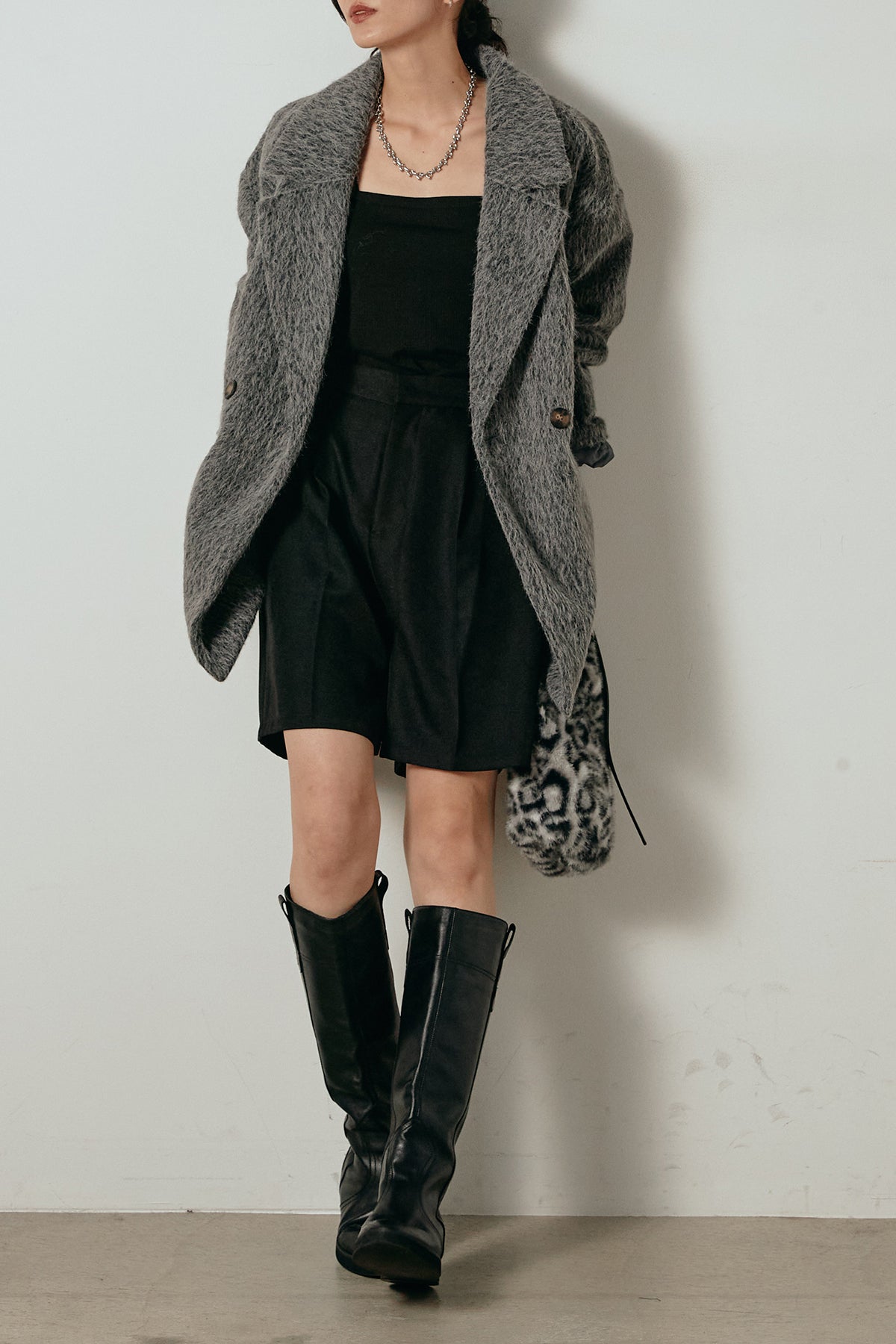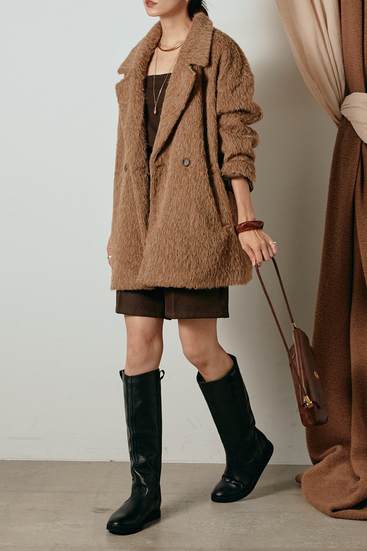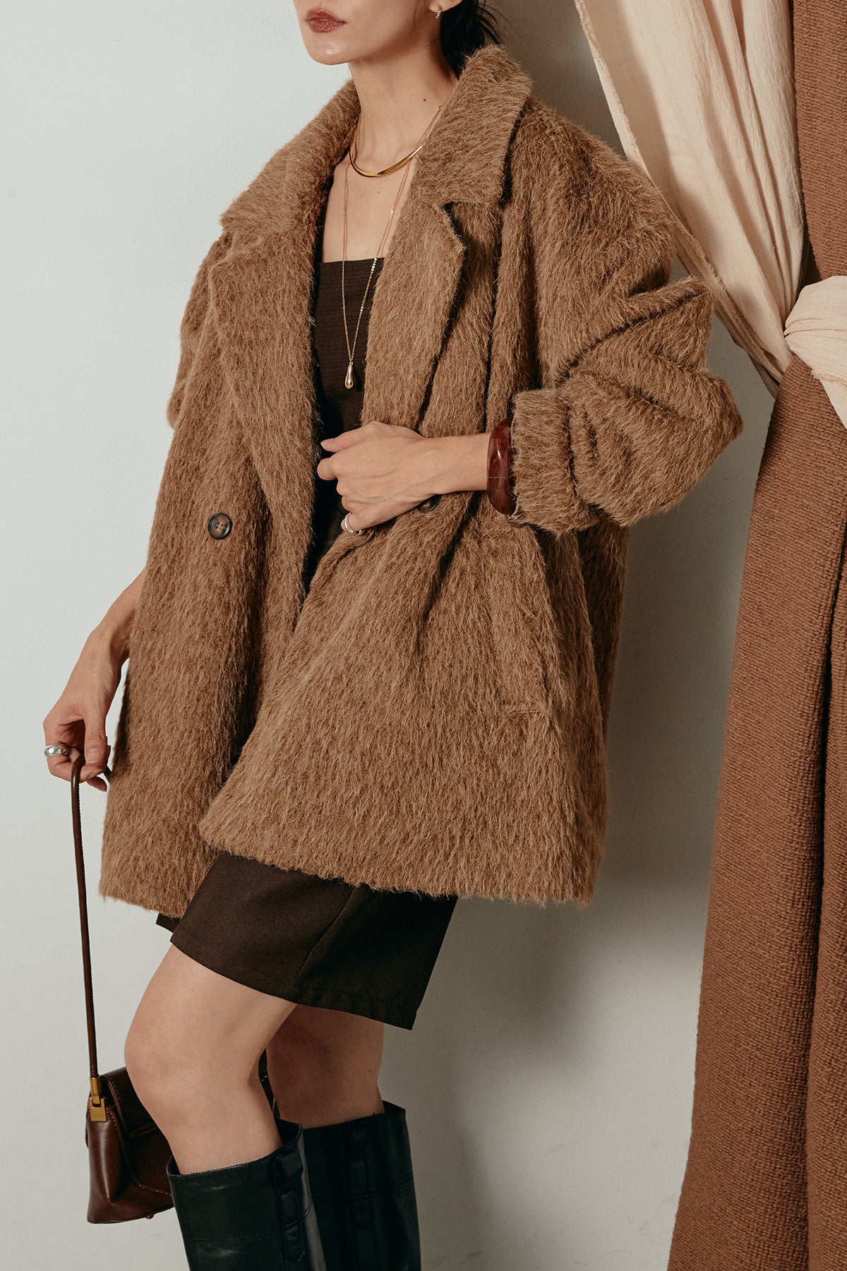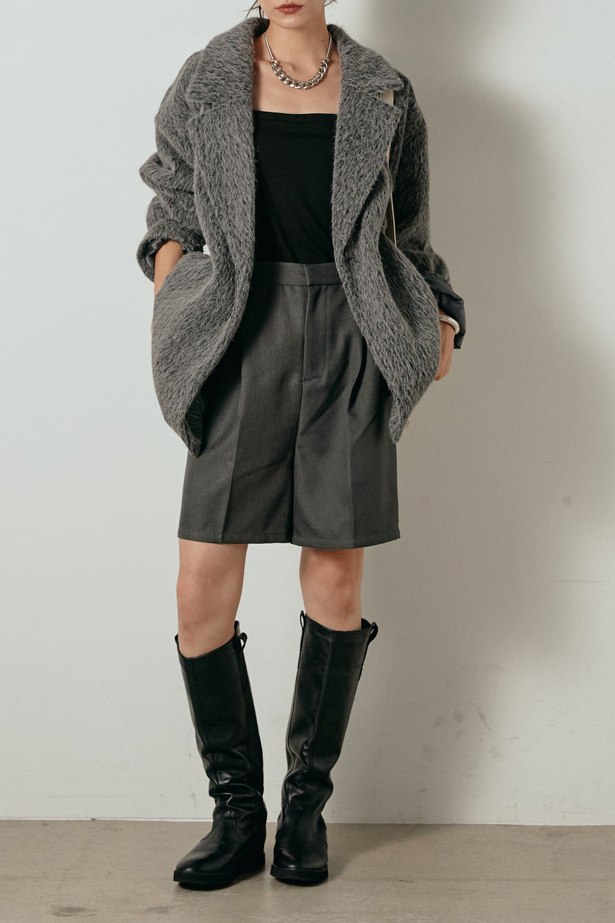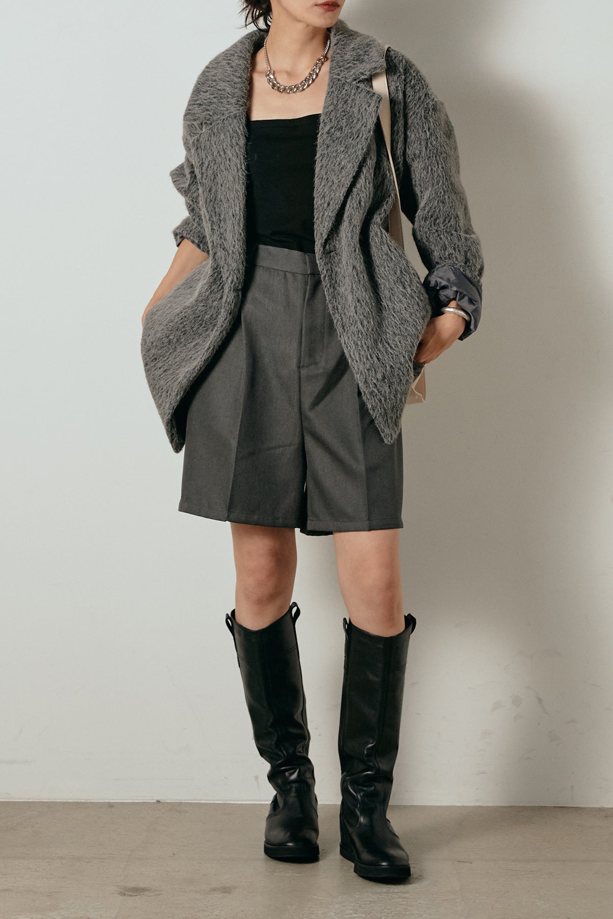 シャギー感のある起毛素材で仕上げたジャケットコート。ふっくらとした質感が暖かみを添え、シンプルなスタイルにプラスするだけで上品な雰囲気を演出します。ミドル丈のシルエットで全体のバランスが取りやすく、コーディネートの主役としても活躍します。