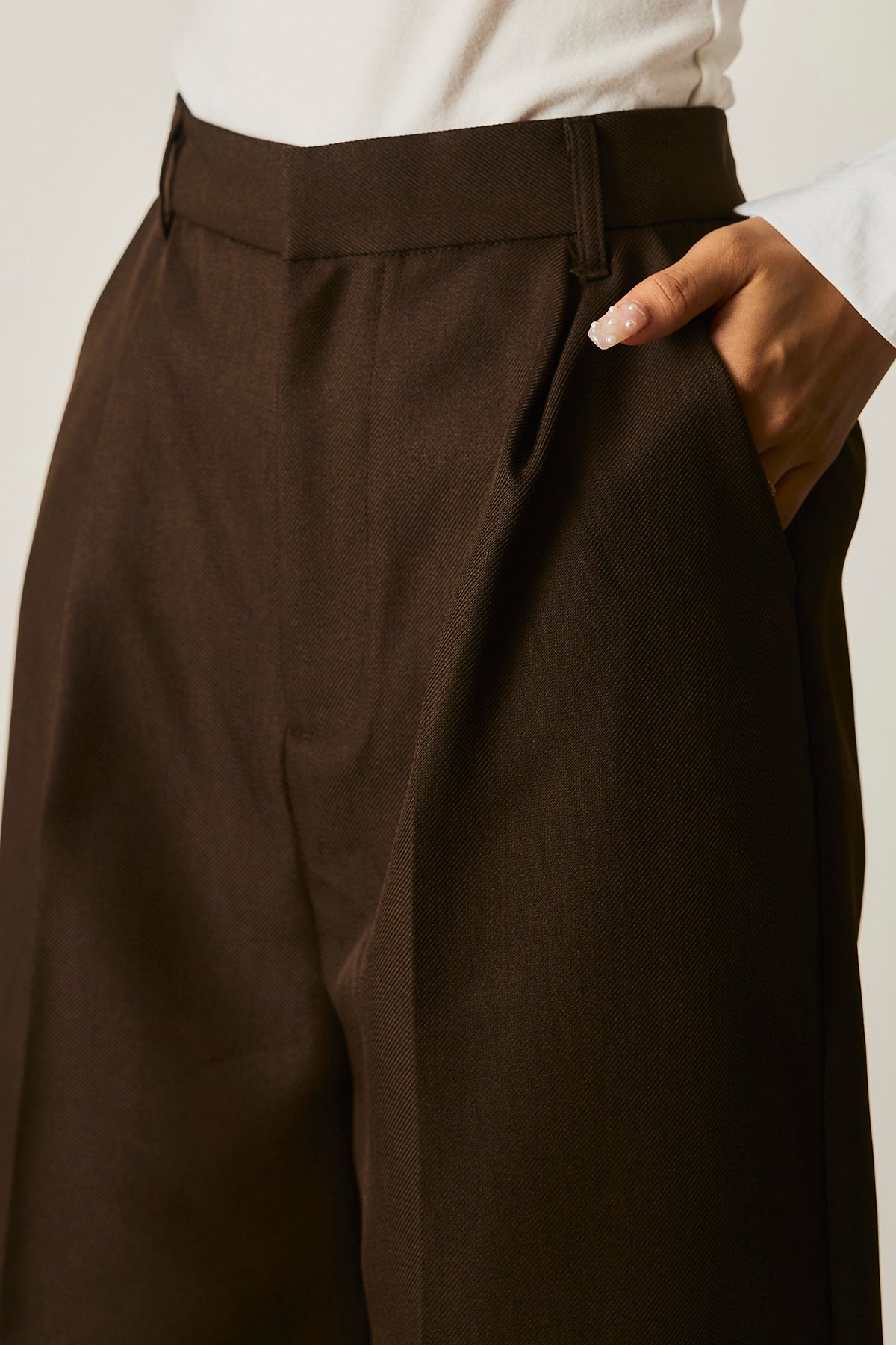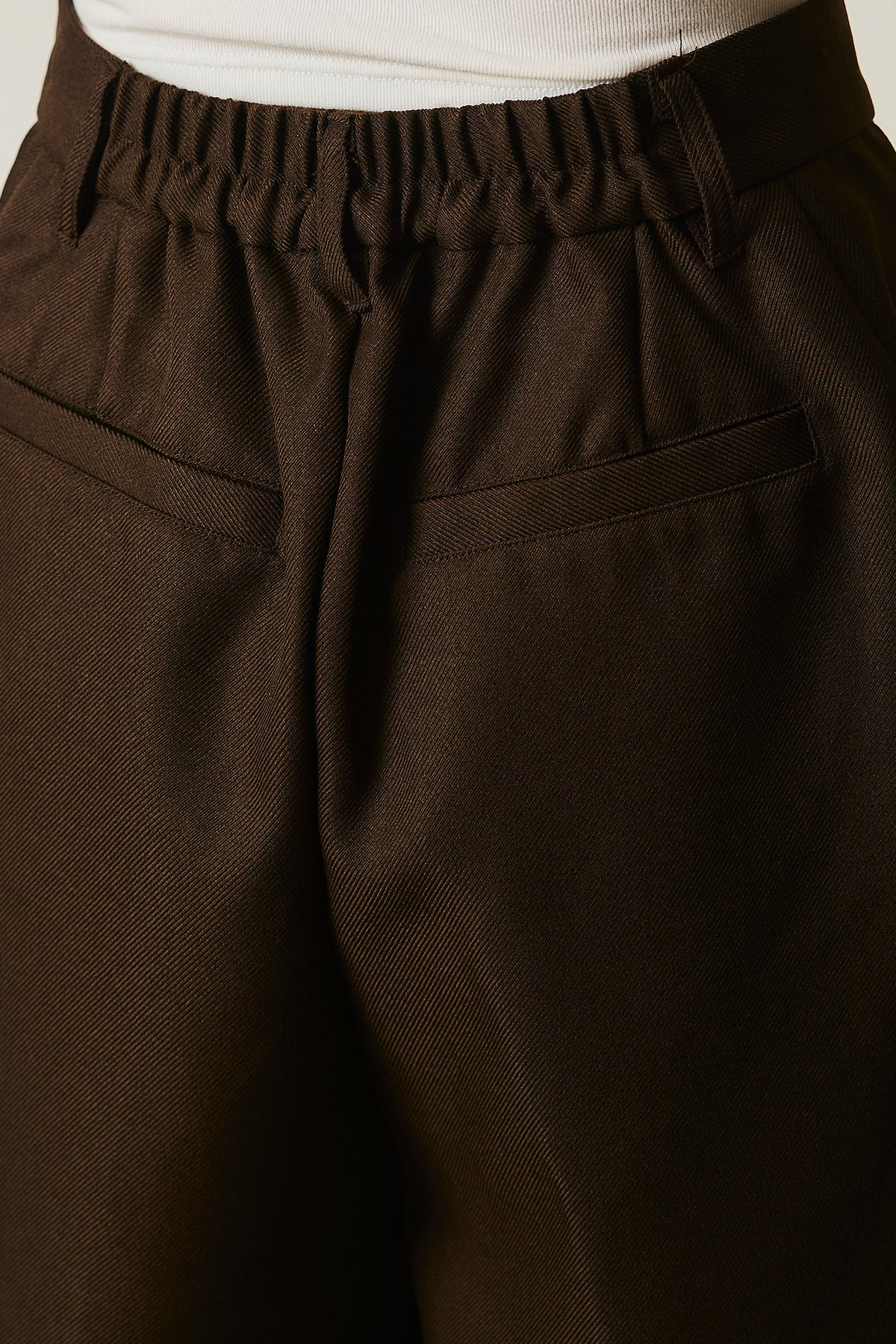 フロントに施されたタックが立体感を生み出し、腰回りをすっきりと見せながら、程よいゆとりで快適な穿き心地を叶えます。