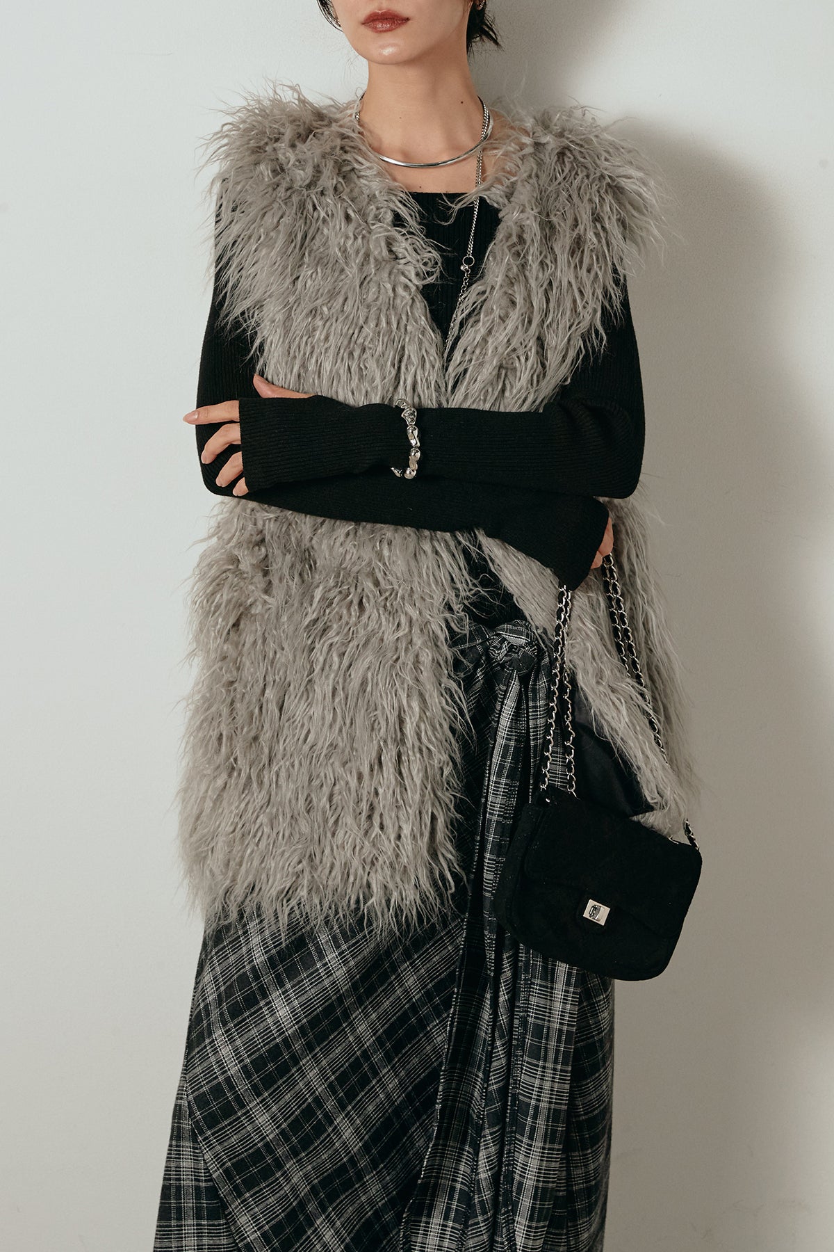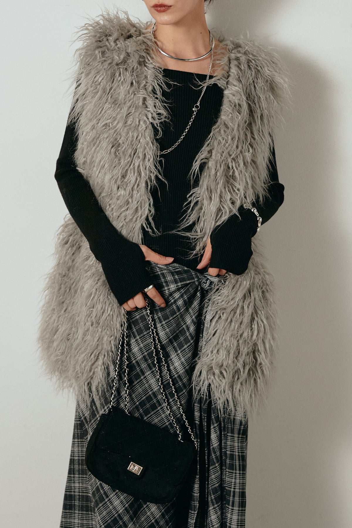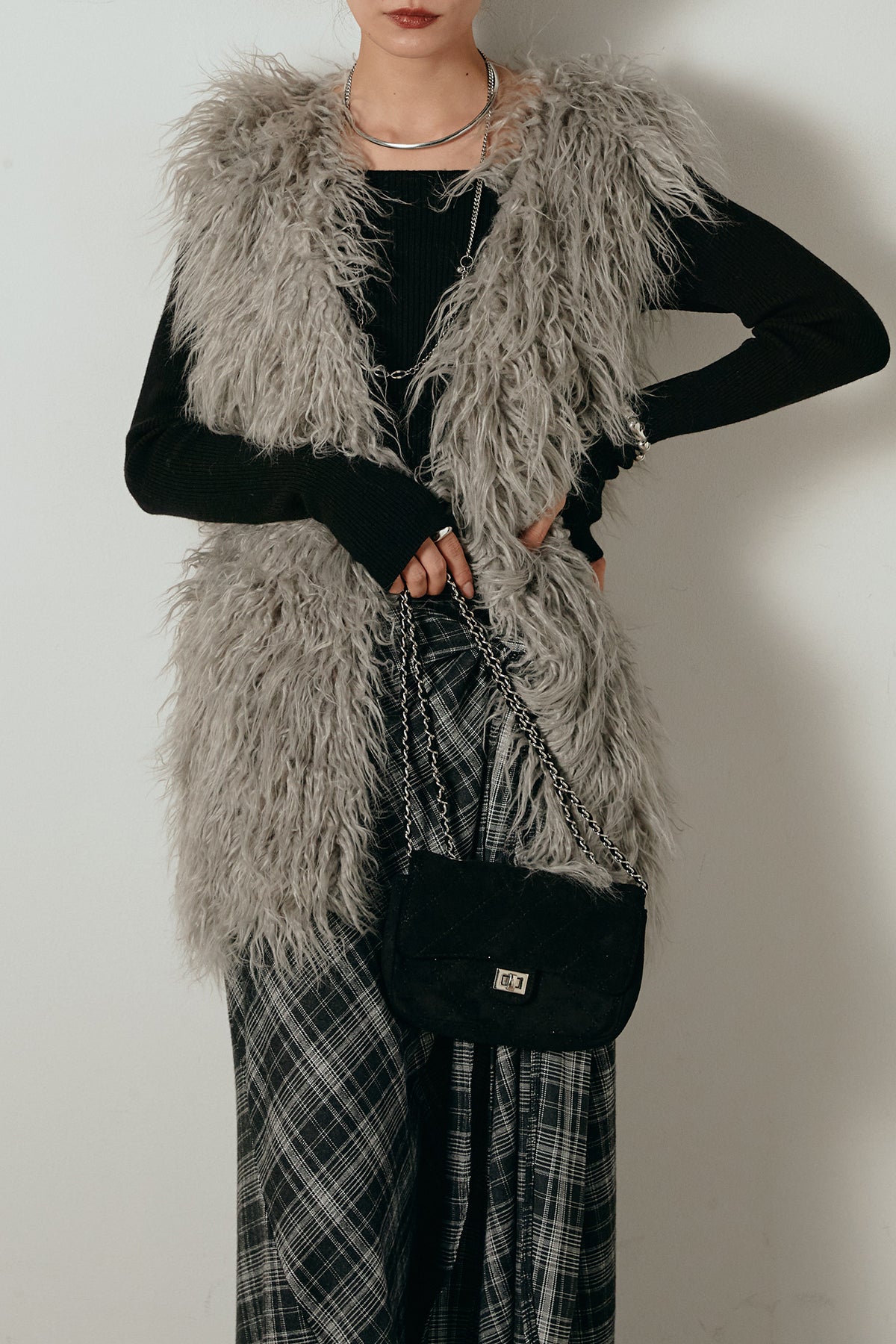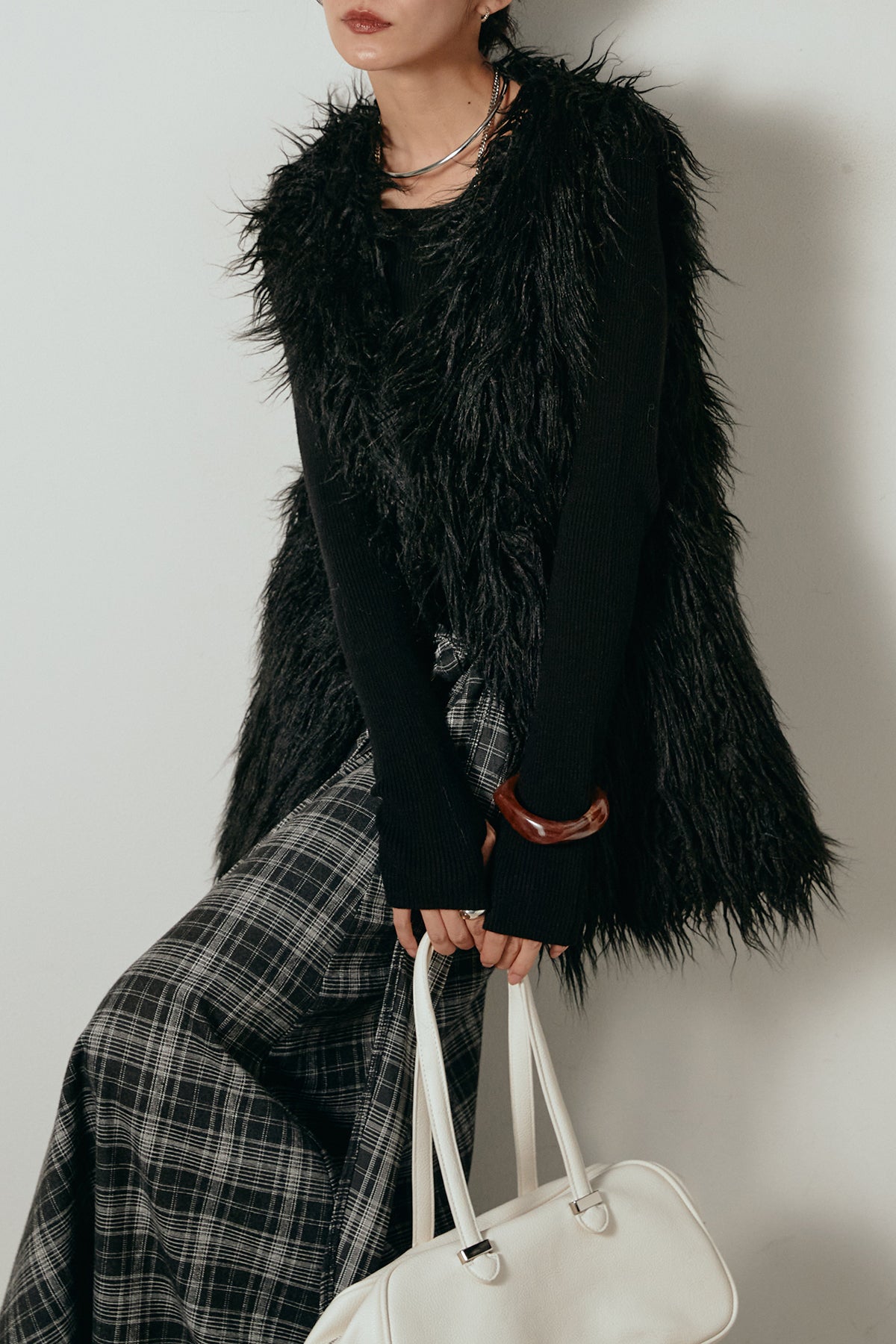 存在感のある毛足の長いエコファーを使用したベスト。ふんわりとしたボリューム感がスタイリングに華やかさを加え、羽織るだけでシーズンムードを高めてくれます。ロング丈のバランスが縦のラインを強調し、パンツやワンピースとの相性も抜群。デイリーから特別なシーンまで幅広く活躍するアイテムです。