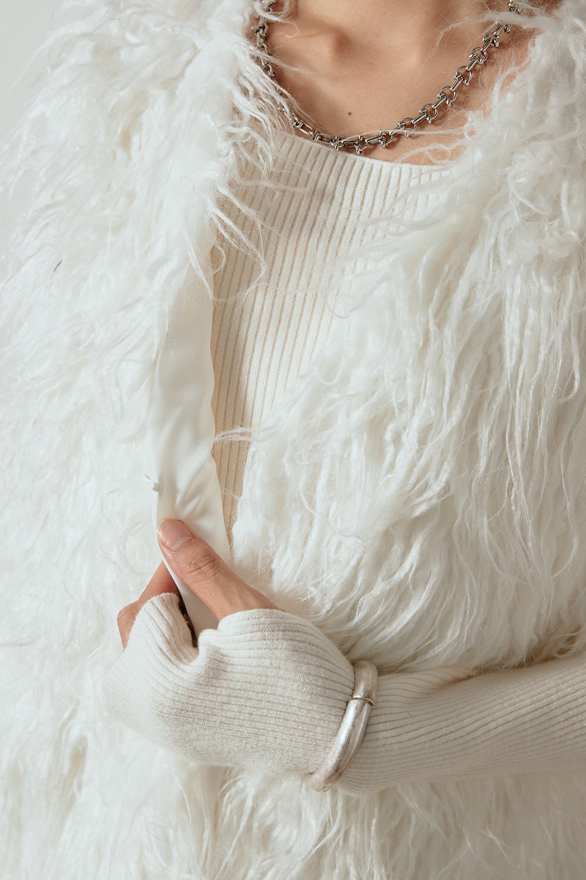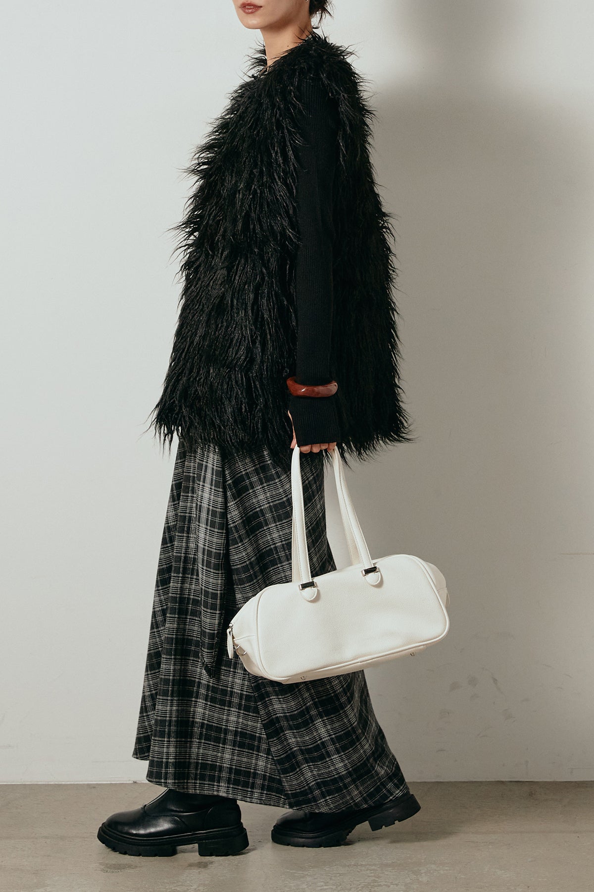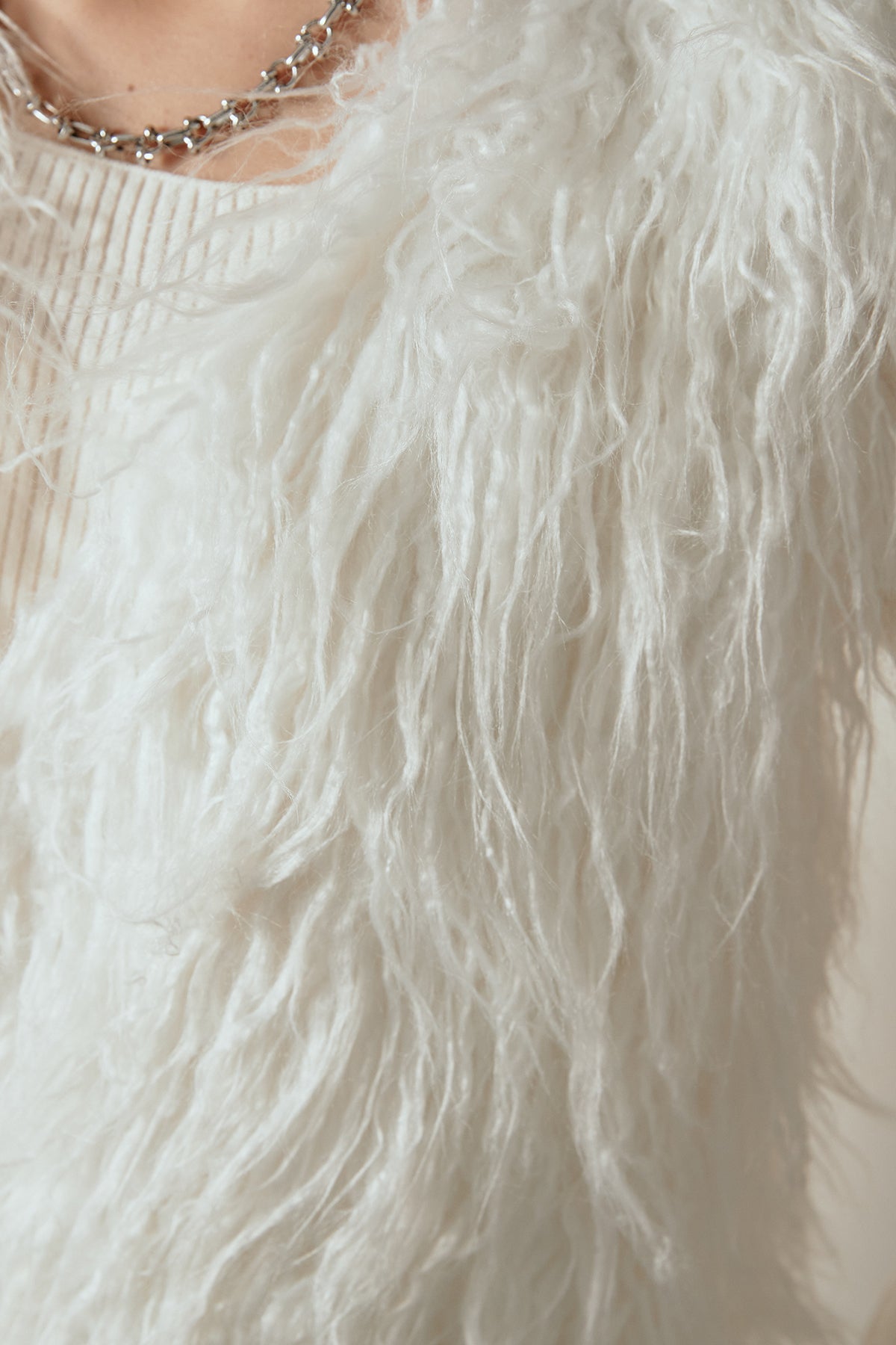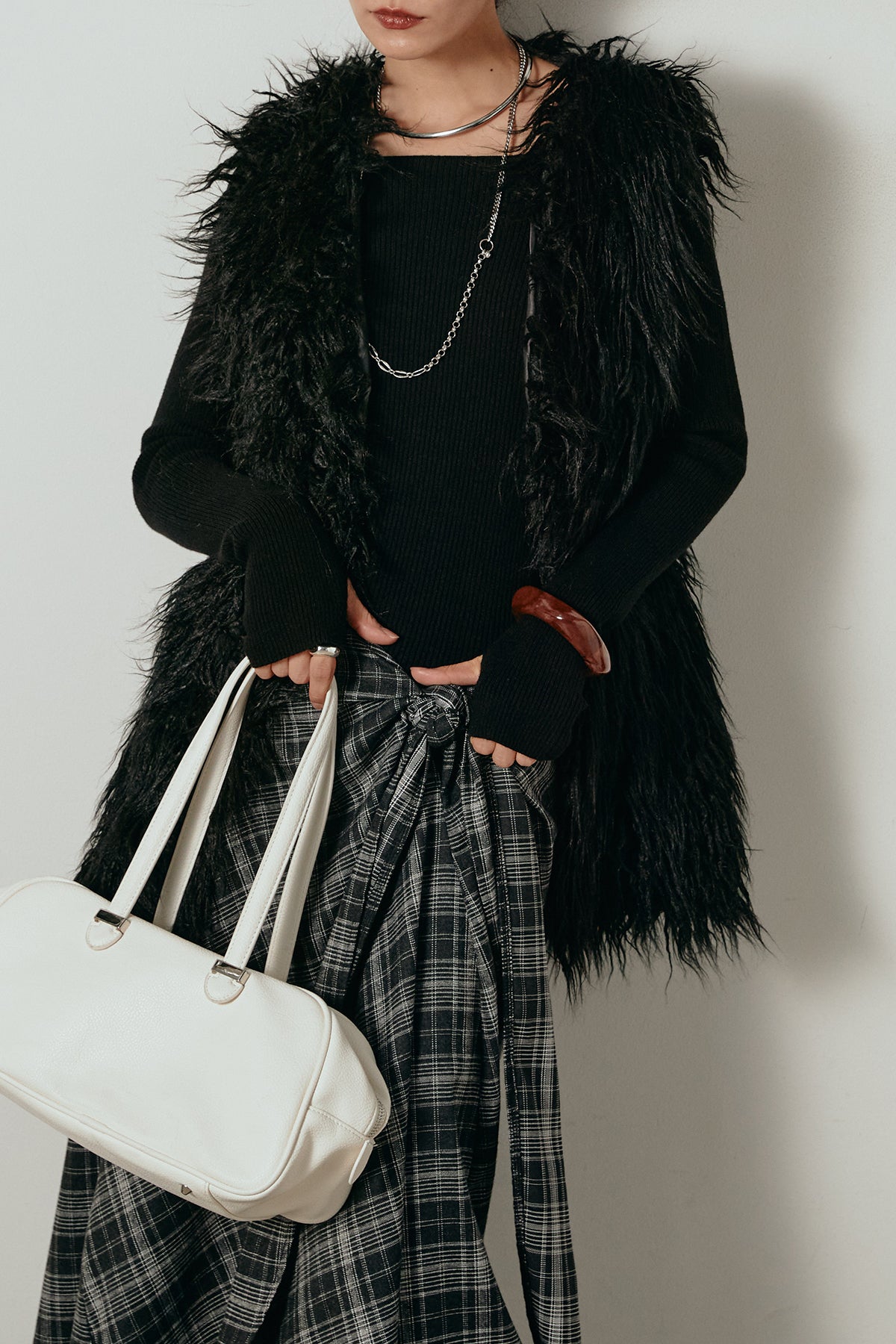 存在感のある毛足の長いエコファーを使用したベスト。ふんわりとしたボリューム感がスタイリングに華やかさを加え、羽織るだけでシーズンムードを高めてくれます。ロング丈のバランスが縦のラインを強調し、パンツやワンピースとの相性も抜群。デイリーから特別なシーンまで幅広く活躍するアイテムです。