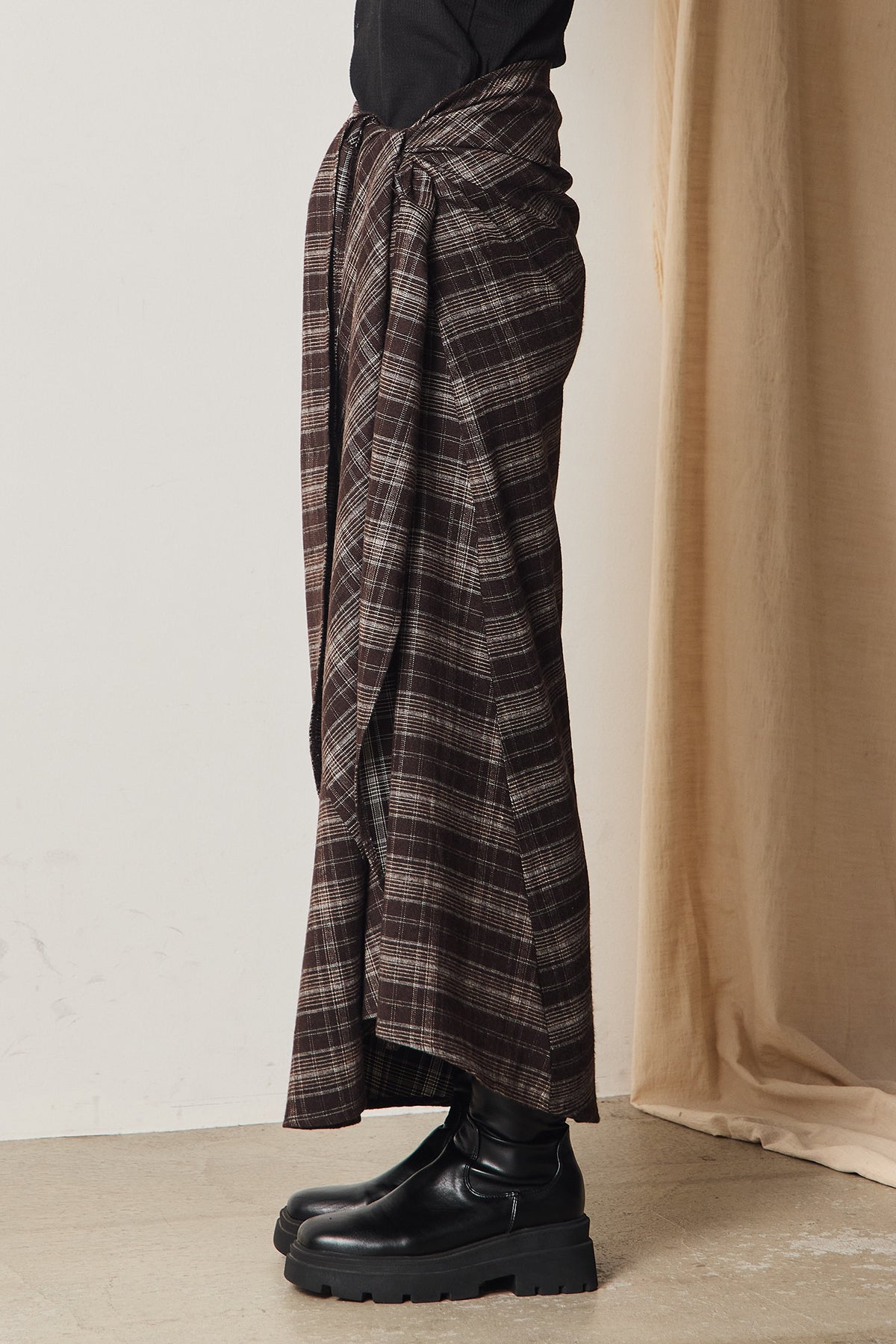 タータンチェックの落ち着いた配色が大人の雰囲気を演出するラップ風スカート。ウエストに重ねた巻きデザインが立体感を生み、シンプルなトップス合わせでも存在感のある着こなしに仕上がります。ほどよいAラインシルエットが脚のラインを美しく見せ、ブーツやスニーカーなど幅広いシューズとも好相性。季節を問わず、トップス次第でさまざまなスタイリングを楽しめる一枚です。