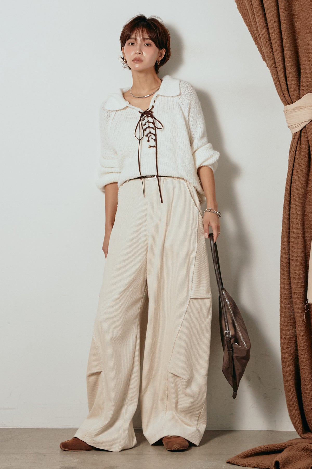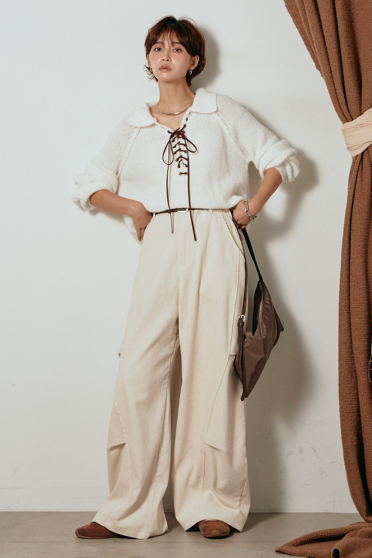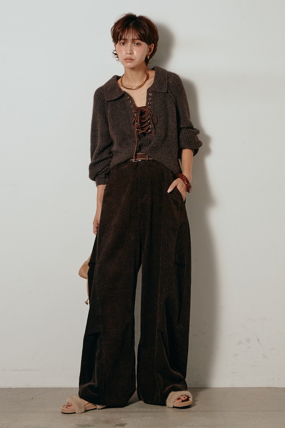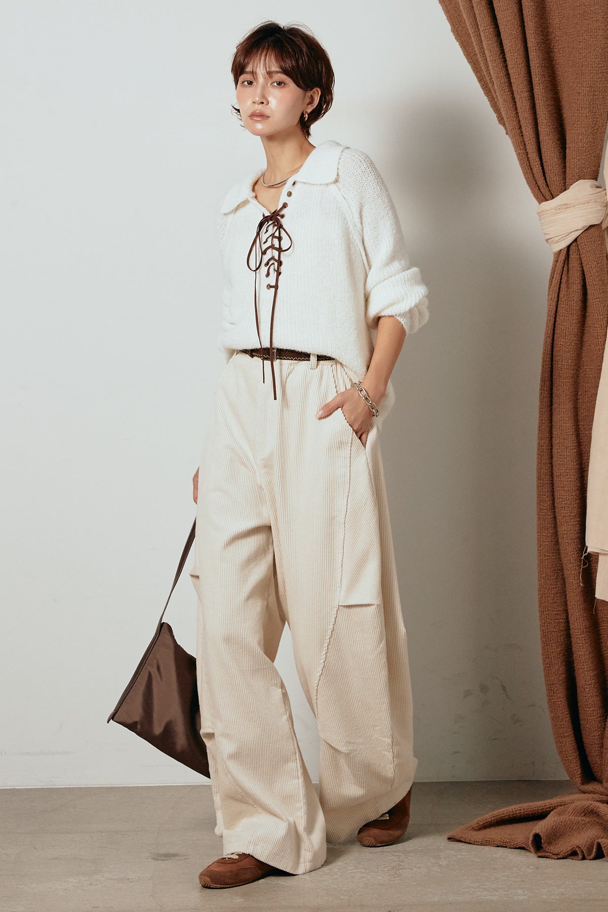 [SET]襟付きレースアップニットトップス+タック入りコーデュロイワイドパンツ(2set)