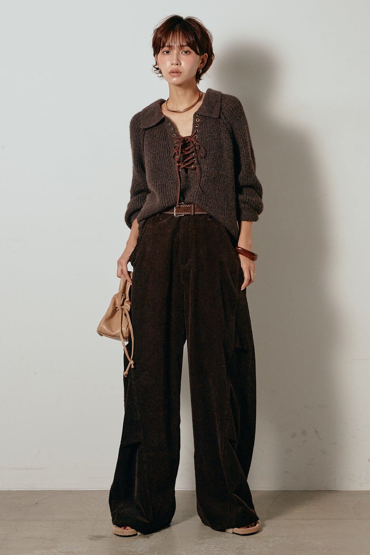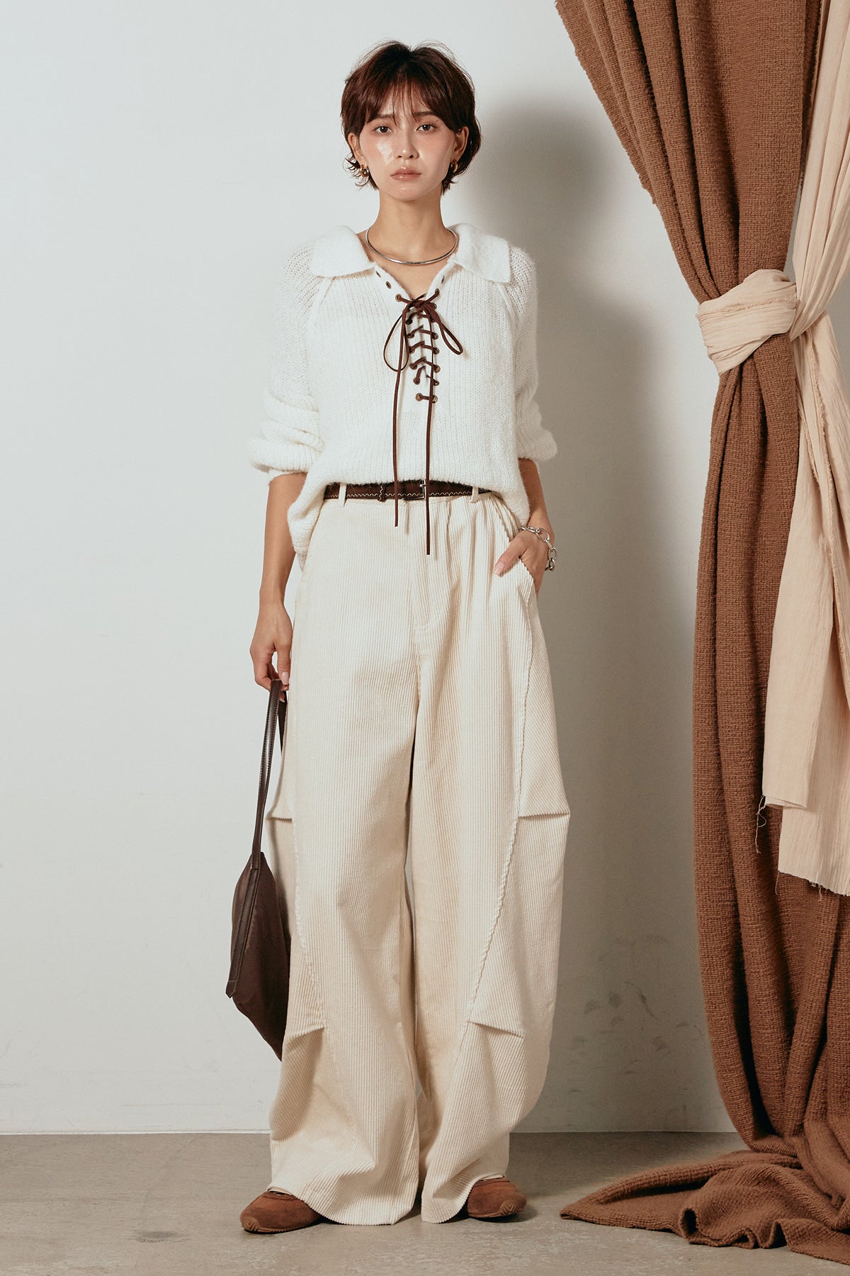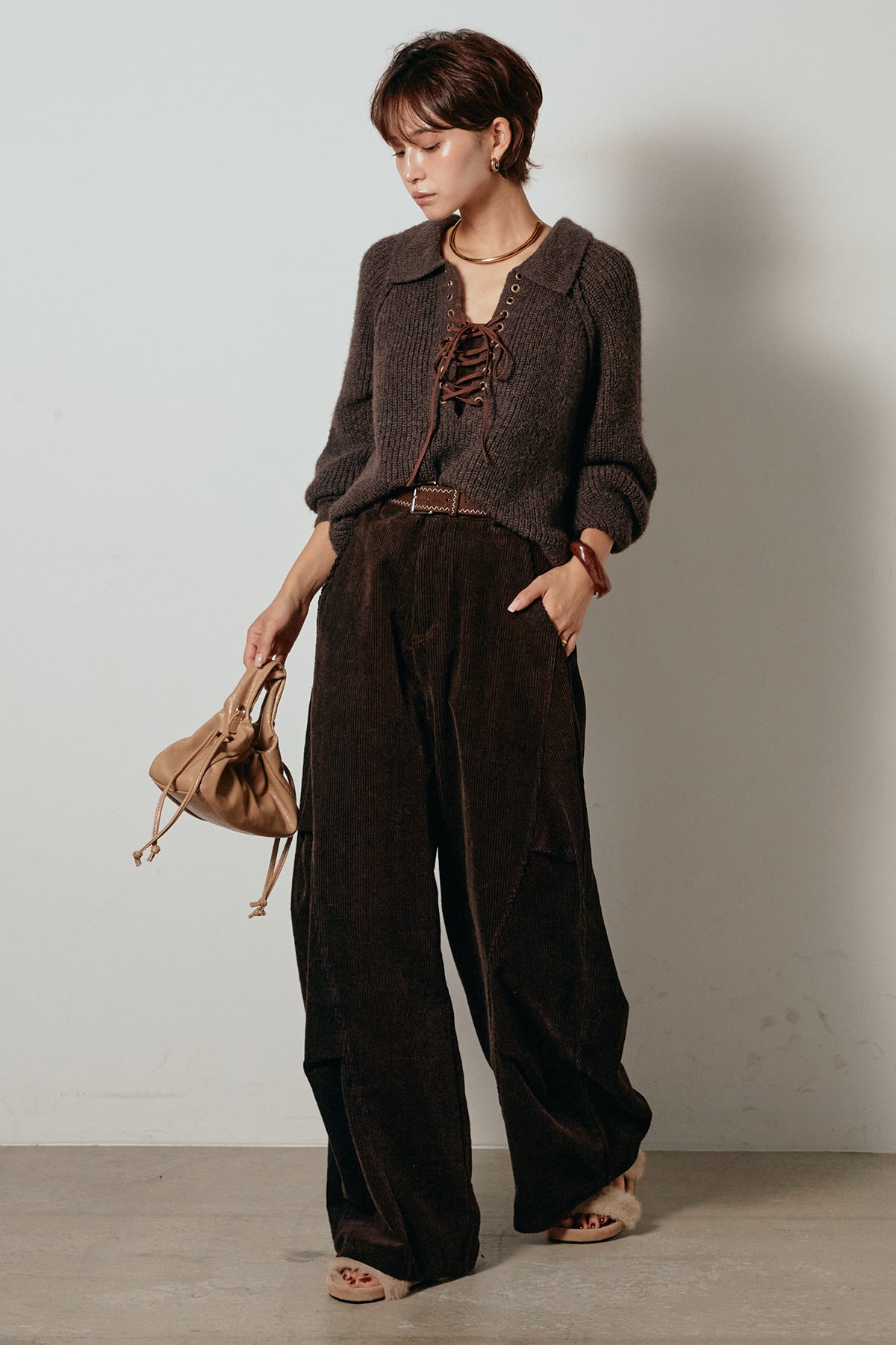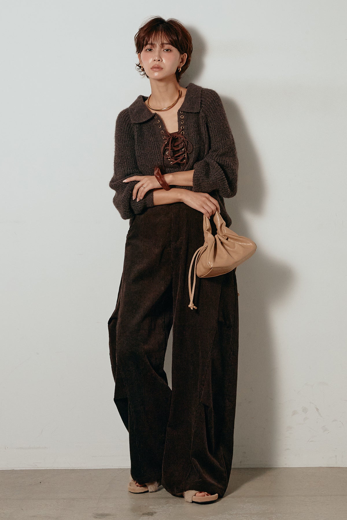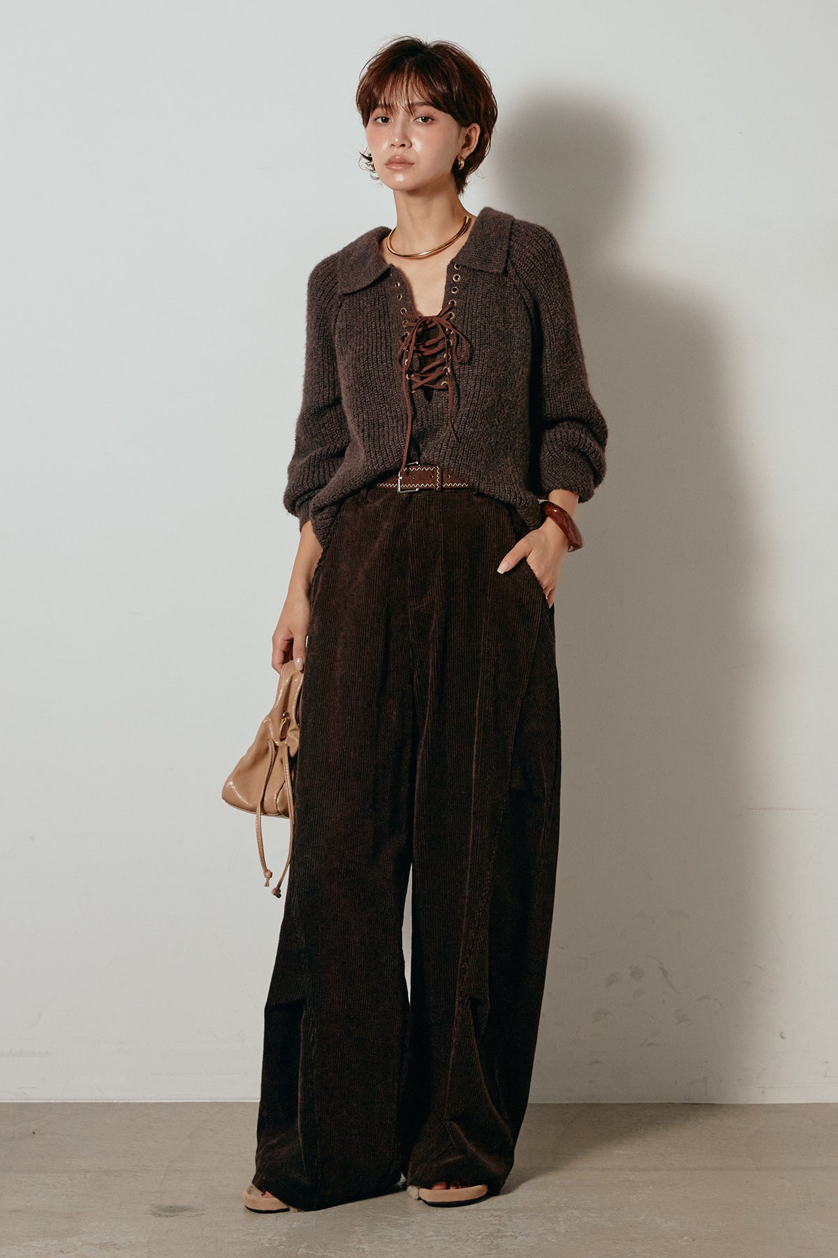 [SET]襟付きレースアップニットトップス+タック入りコーデュロイワイドパンツ(2set)