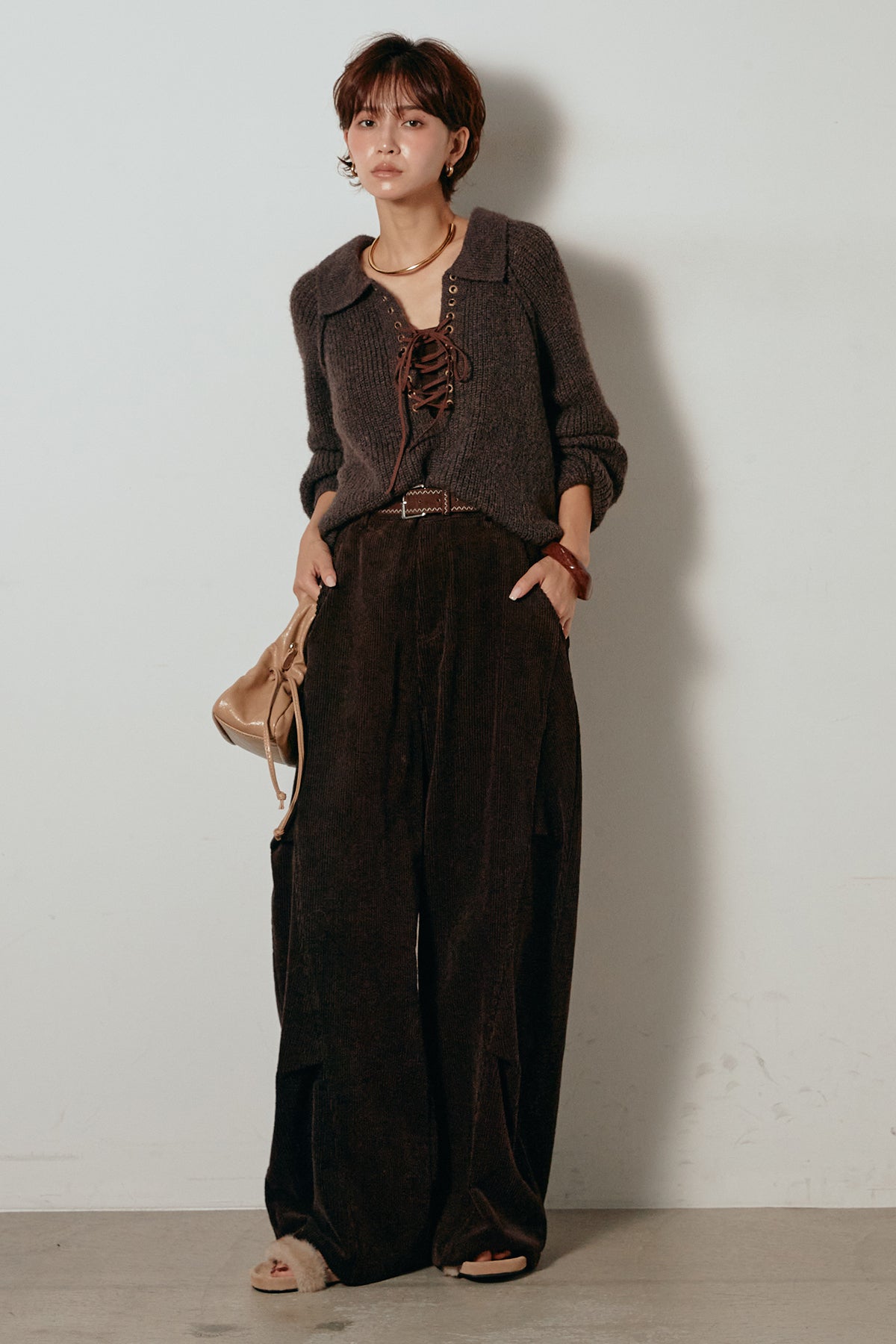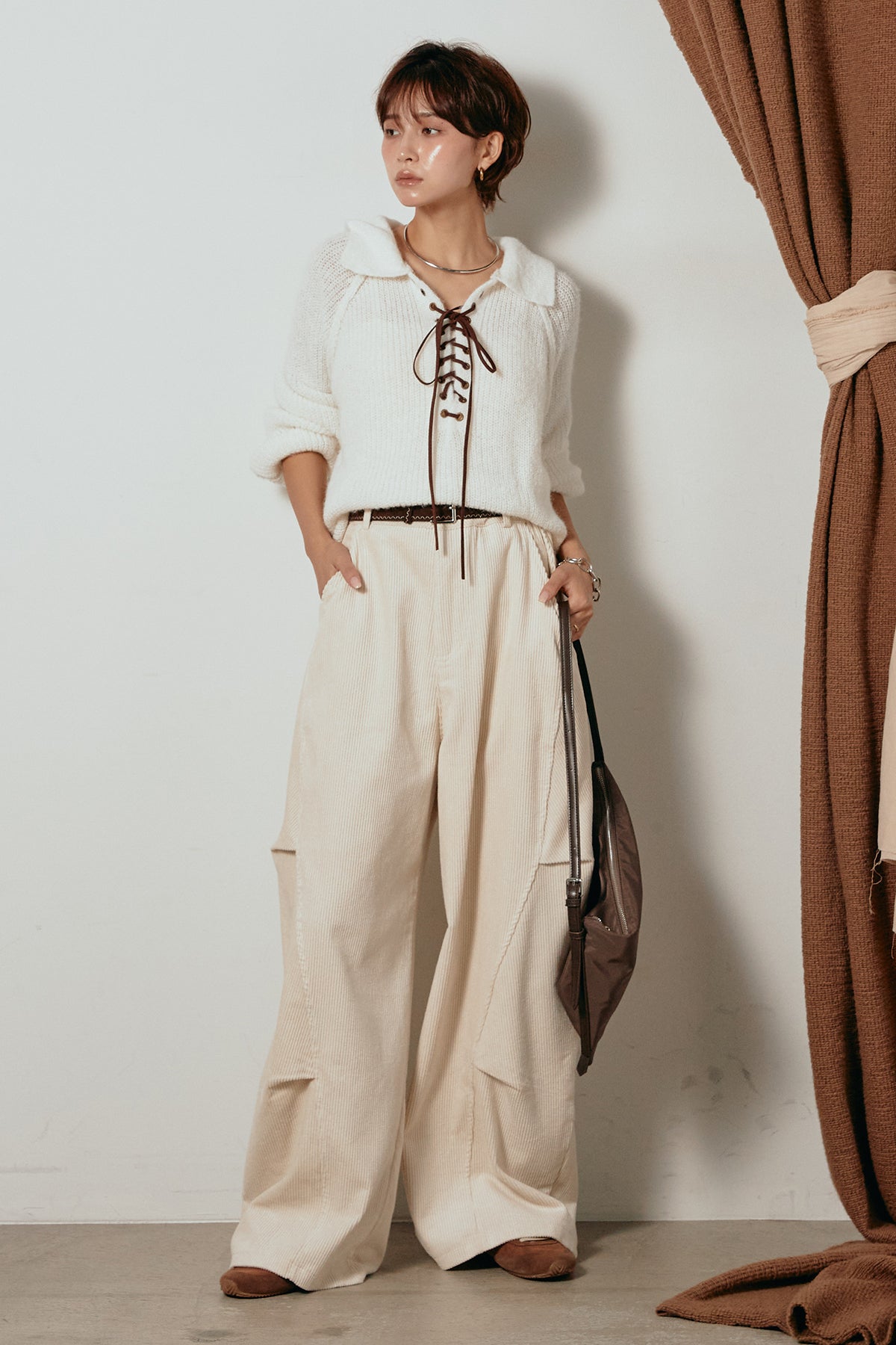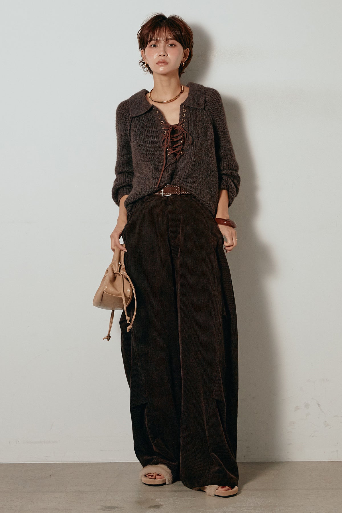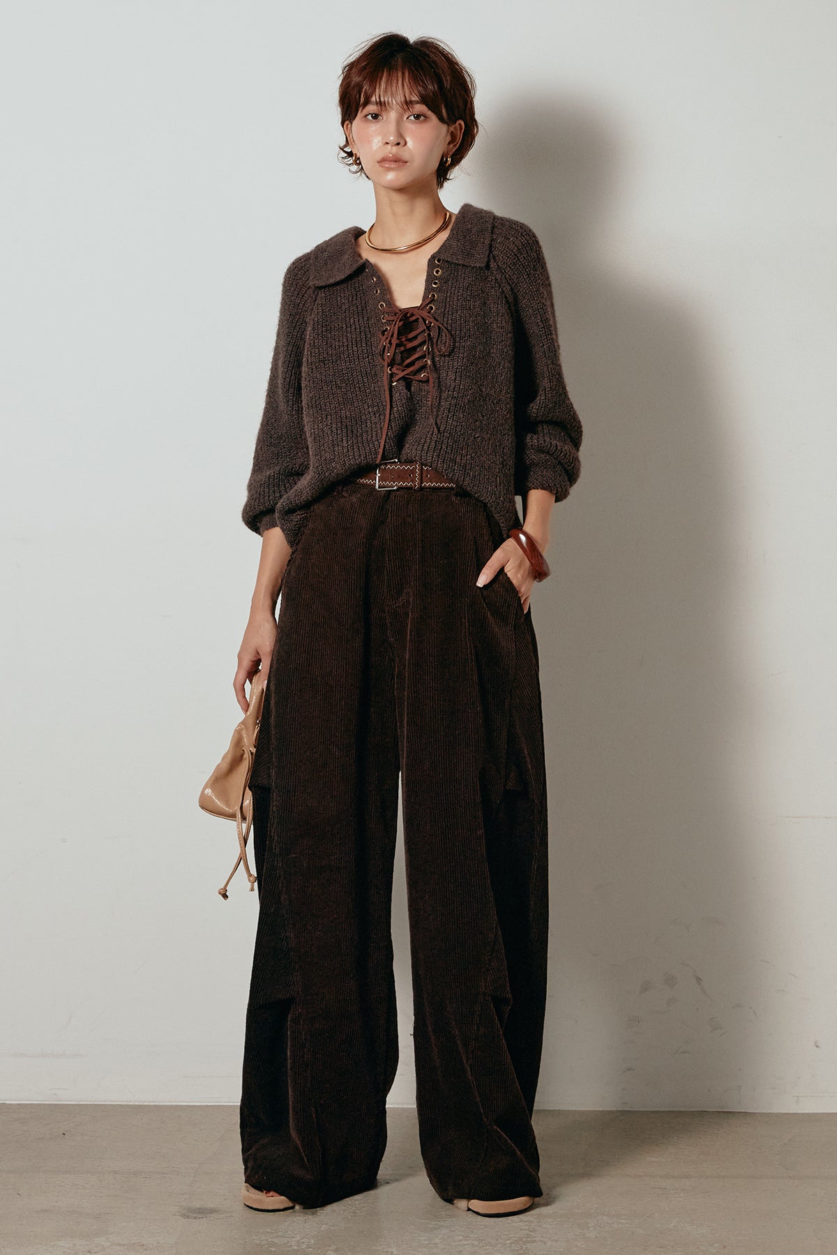 [SET]襟付きレースアップニットトップス+タック入りコーデュロイワイドパンツ(2set)