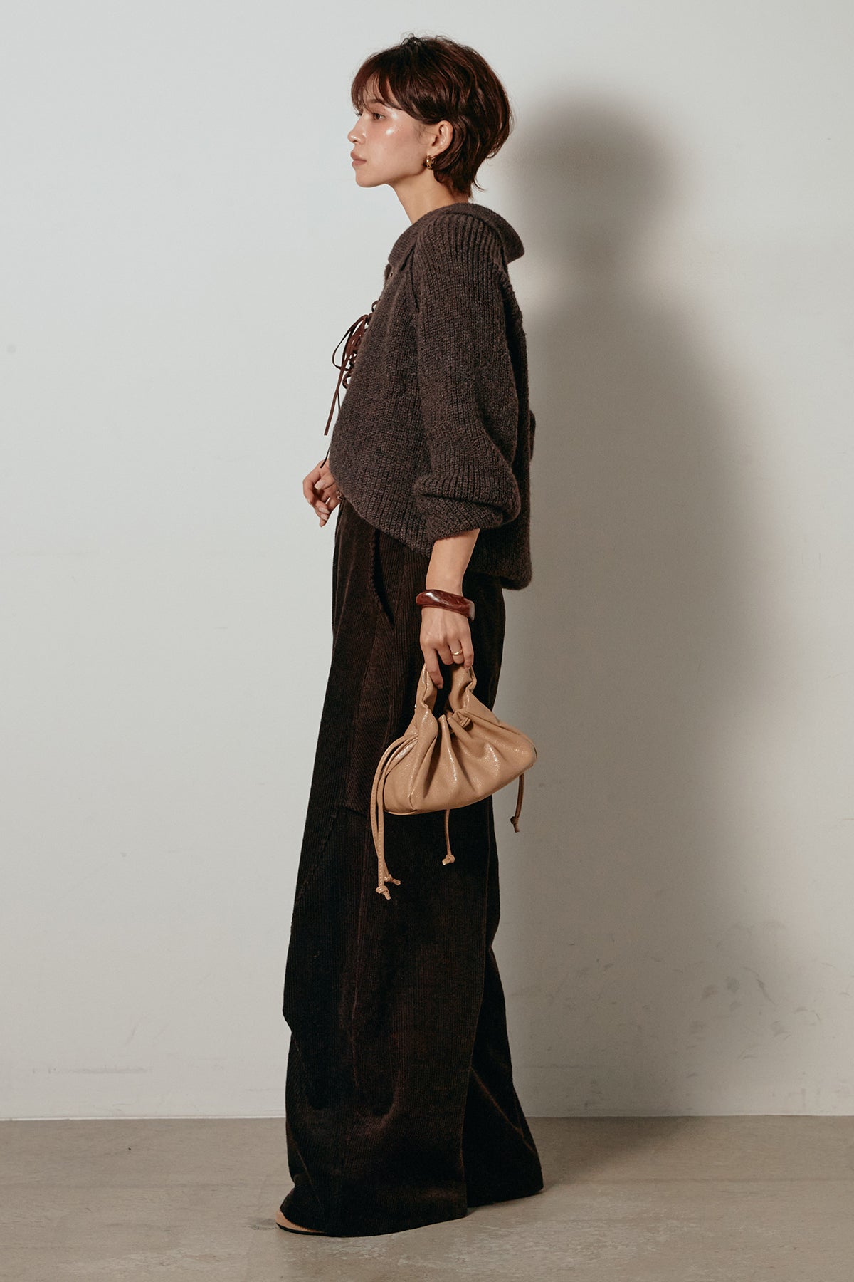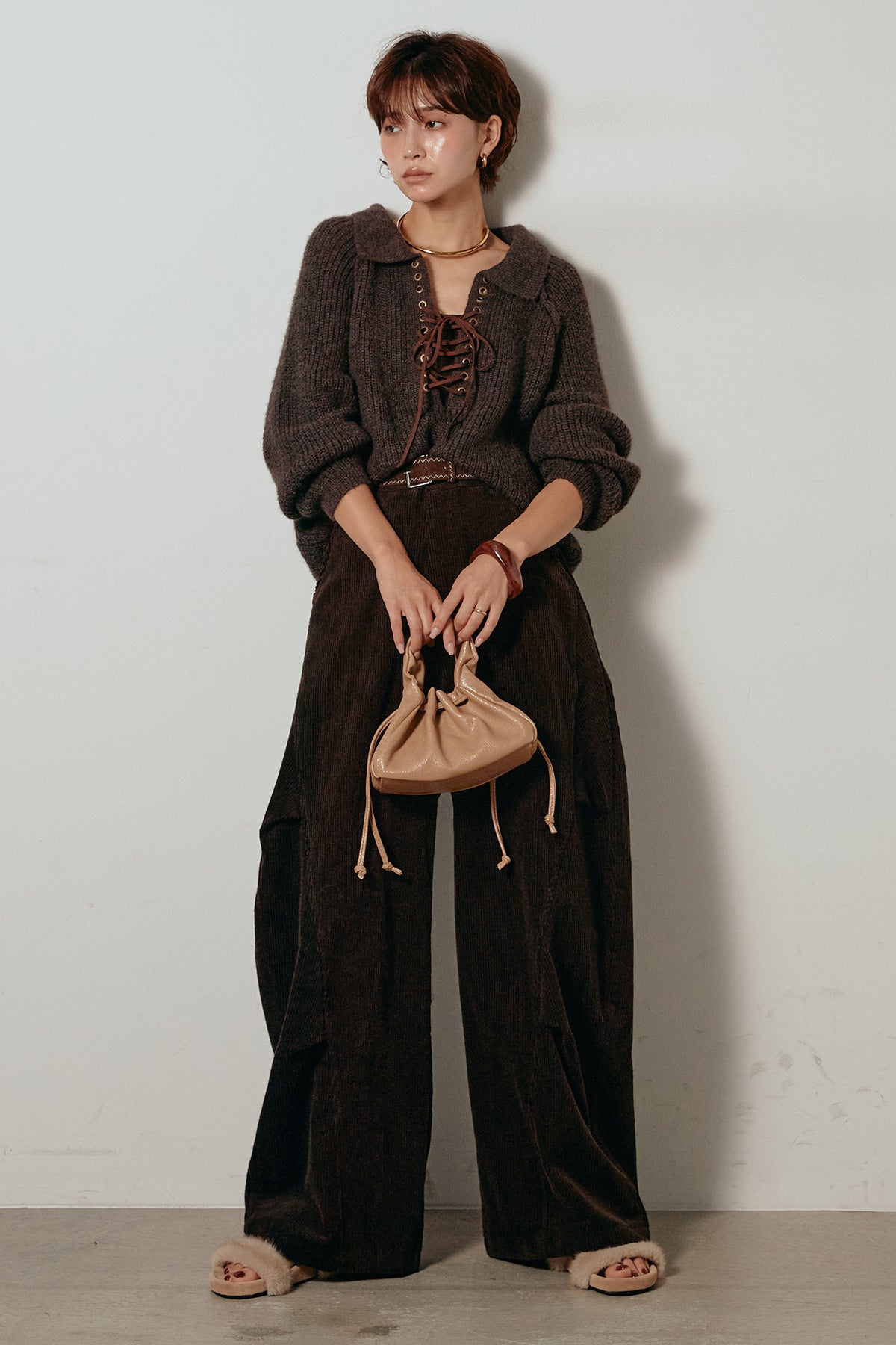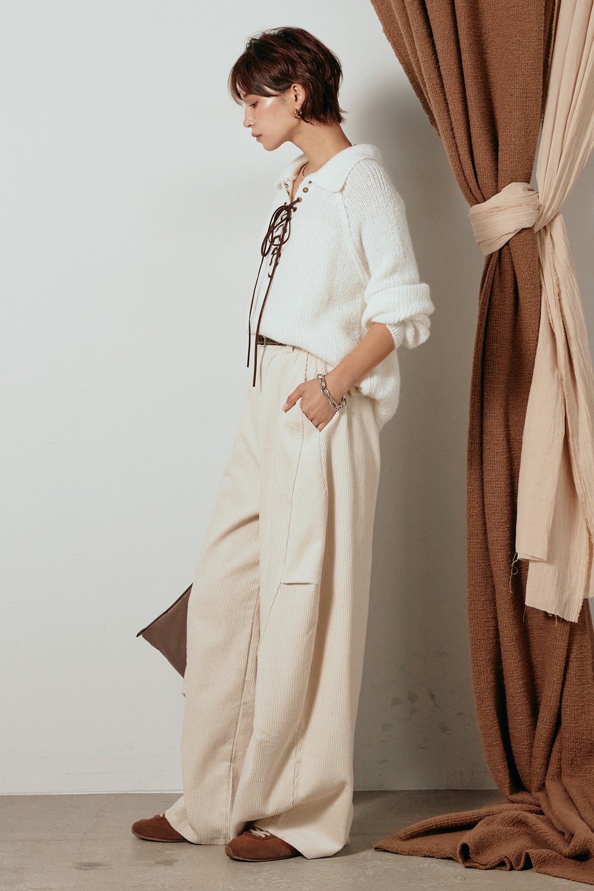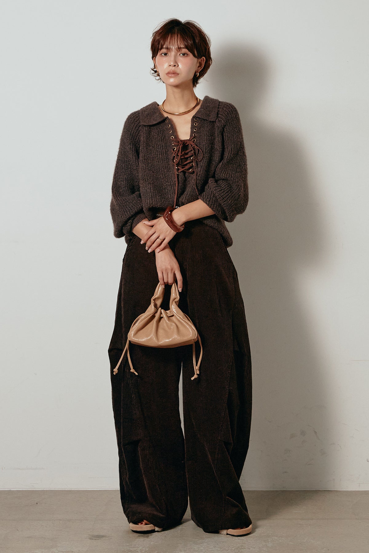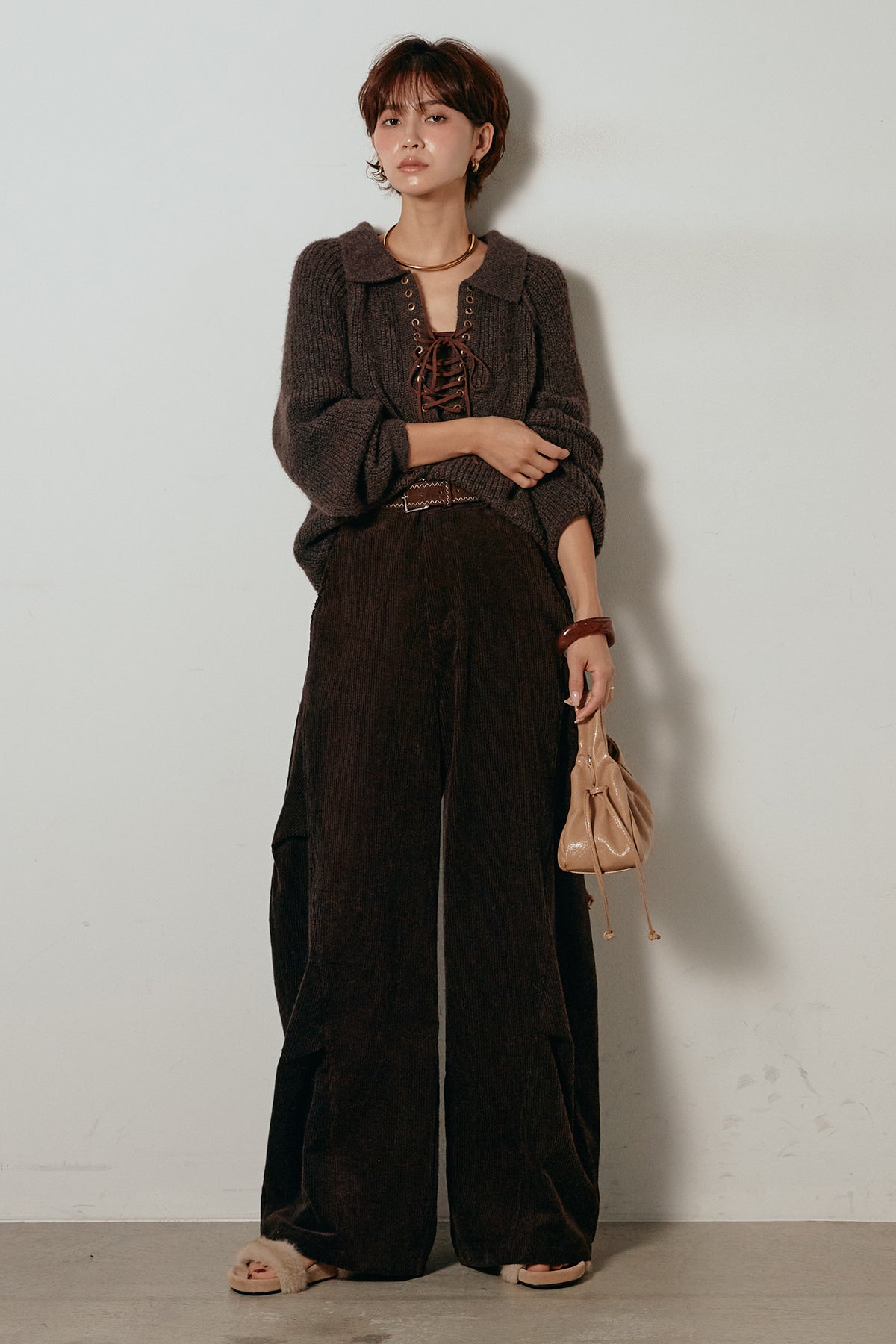 [SET]襟付きレースアップニットトップス+タック入りコーデュロイワイドパンツ(2set)