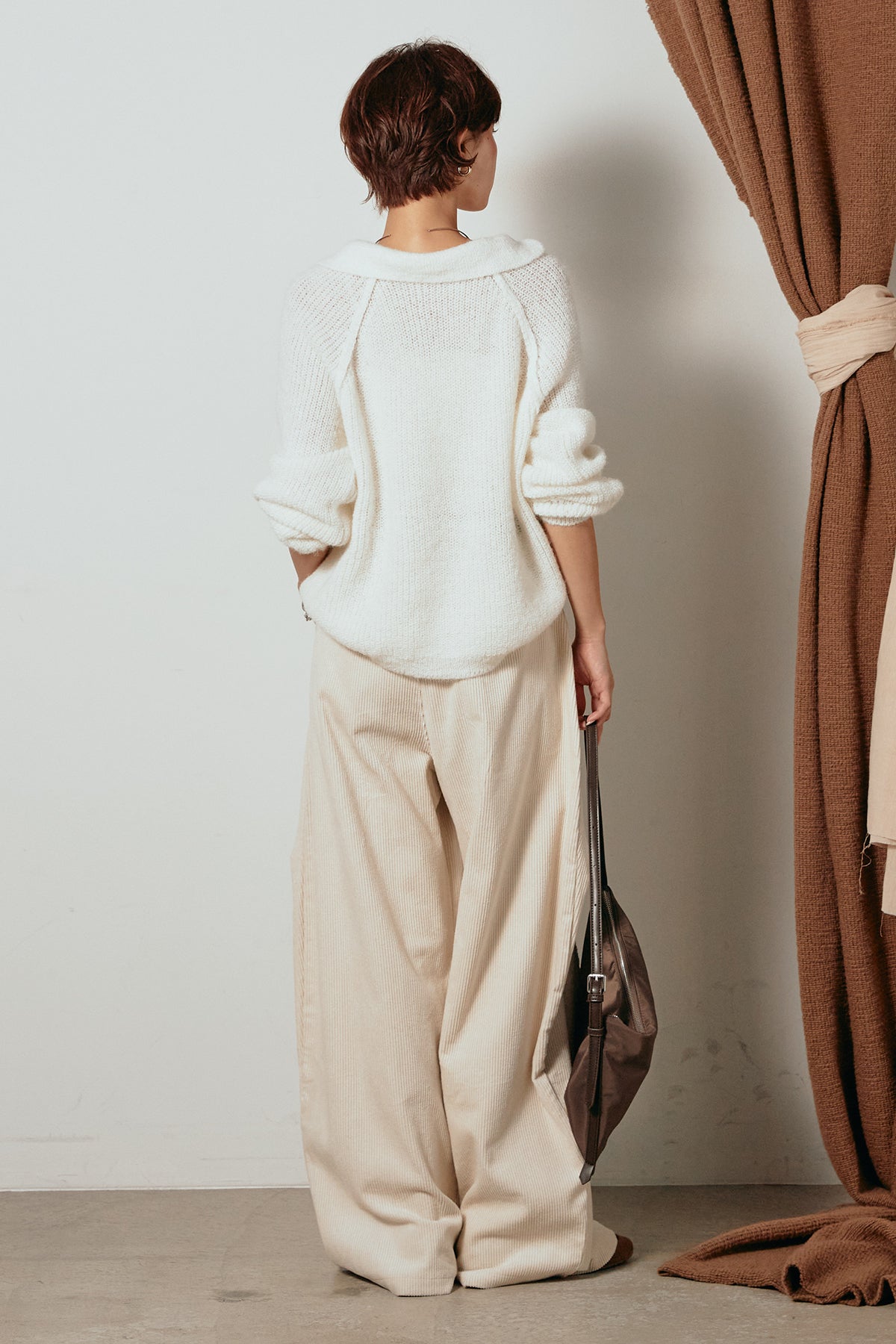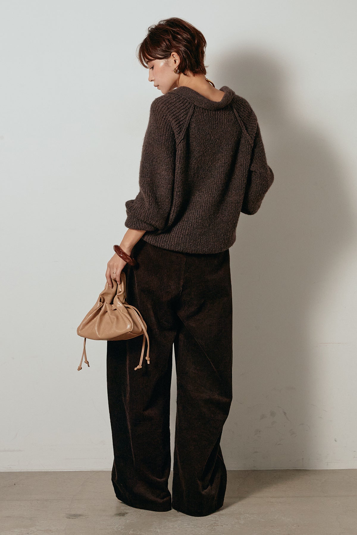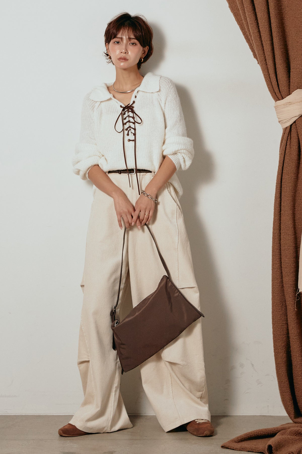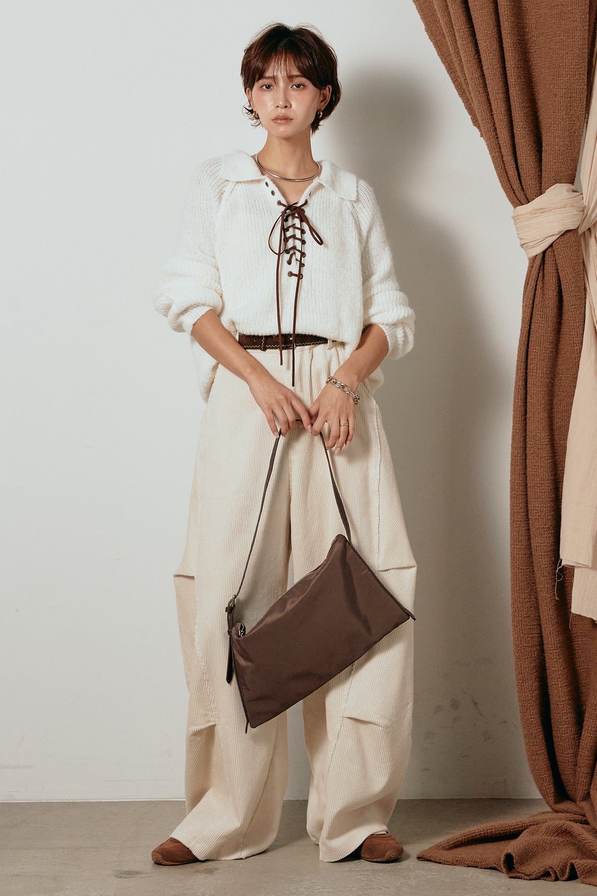 [SET]襟付きレースアップニットトップス+タック入りコーデュロイワイドパンツ(2set)