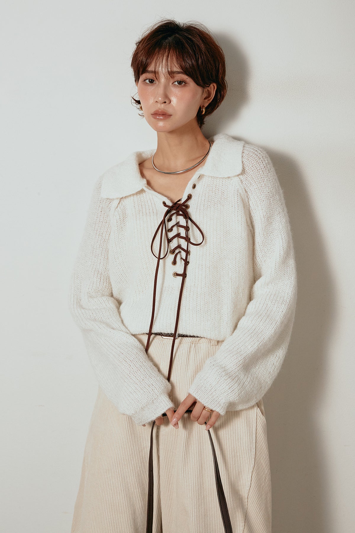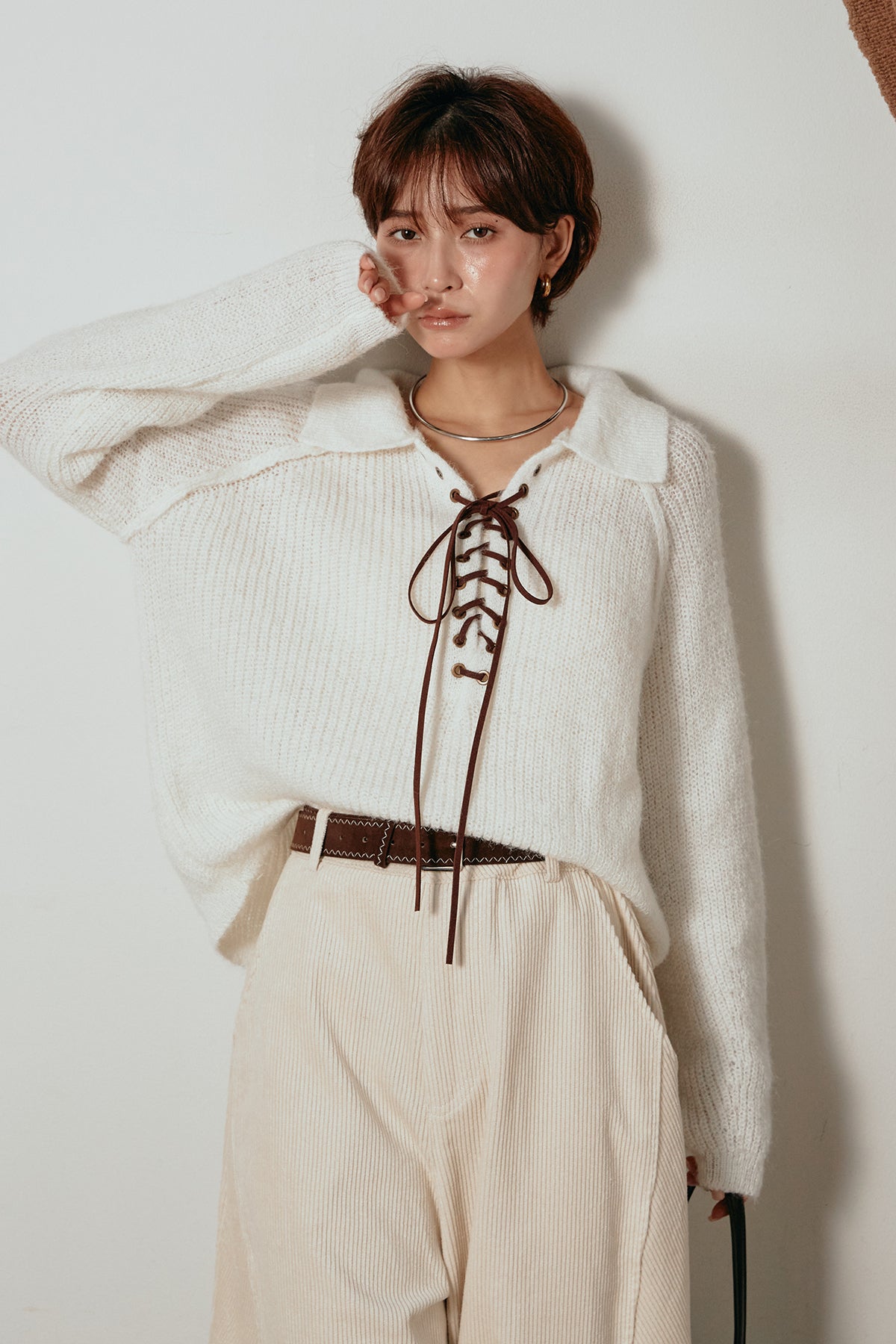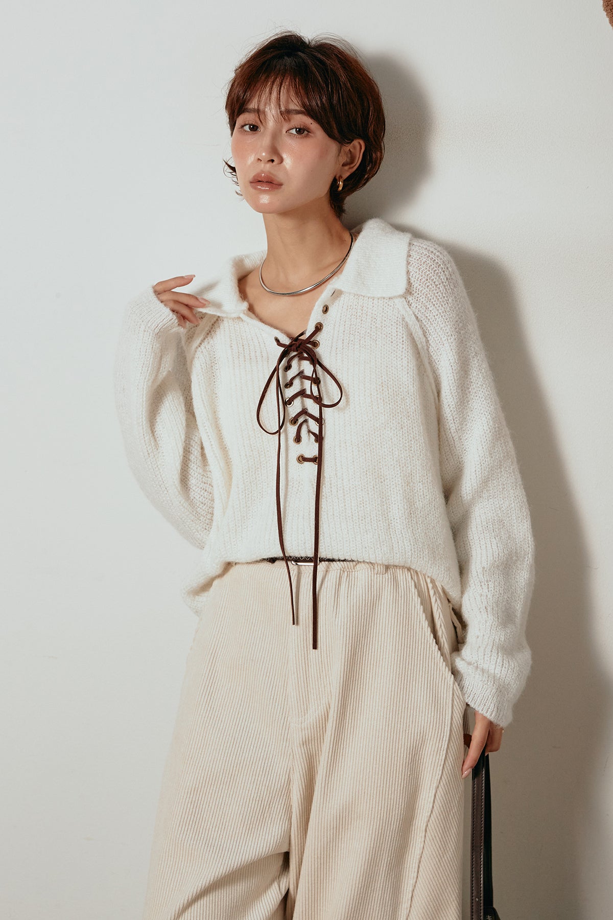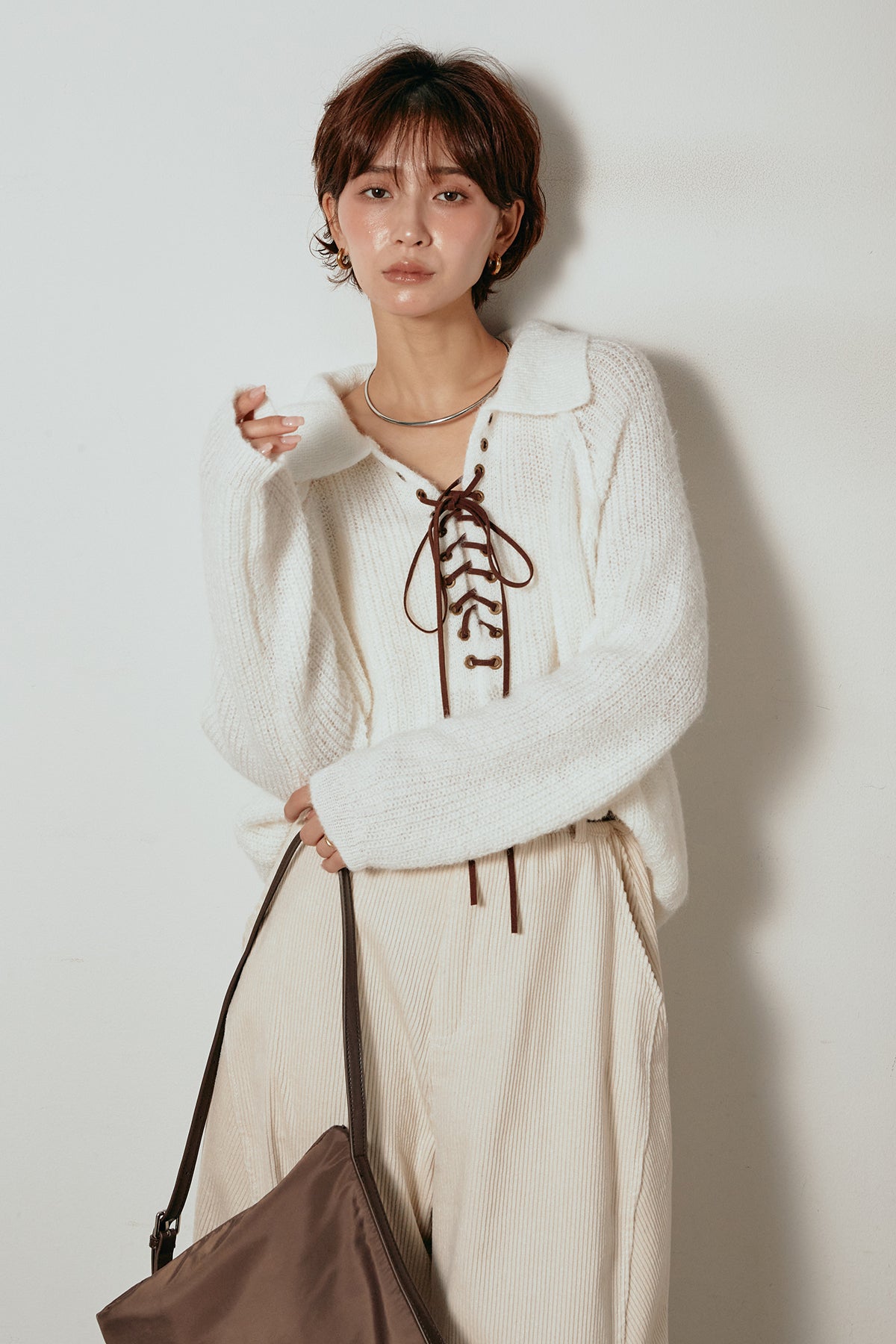 襟付きデザインとレースアップのディテールが印象的なニットトップス。胸元のレースアップが抜け感をプラスし、程よいボリュームのある袖が柔らかな印象を与えます。ざっくりとした編み地が季節感を高め、1枚で着ても存在感のあるスタイルに。パンツにもスカートにも合わせやすく、カジュアルからモードまで幅広く着回せるアイテムです。