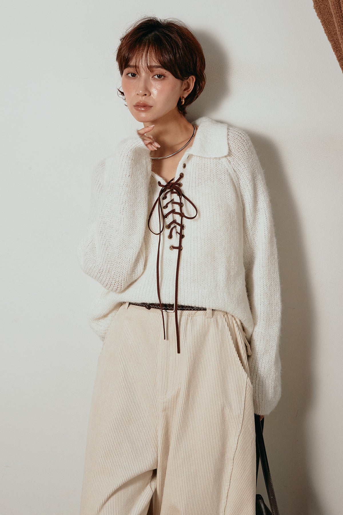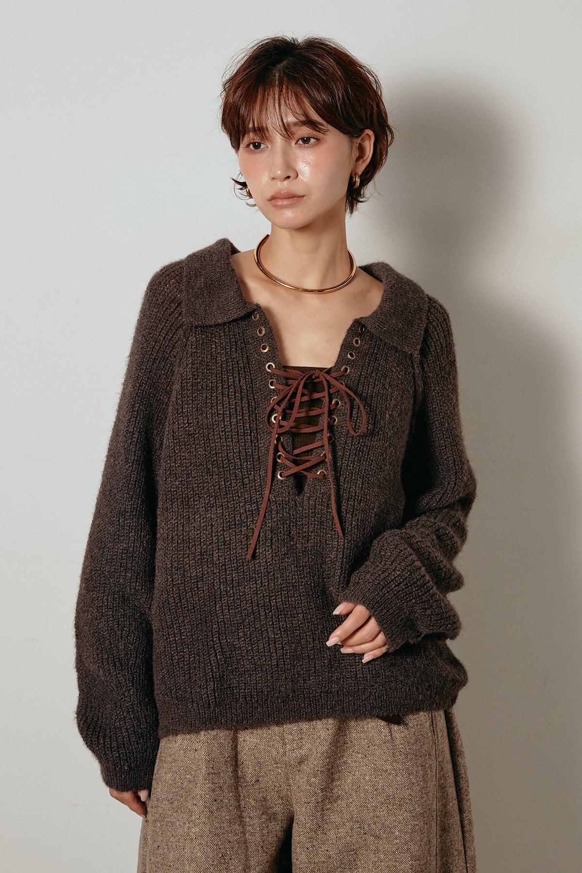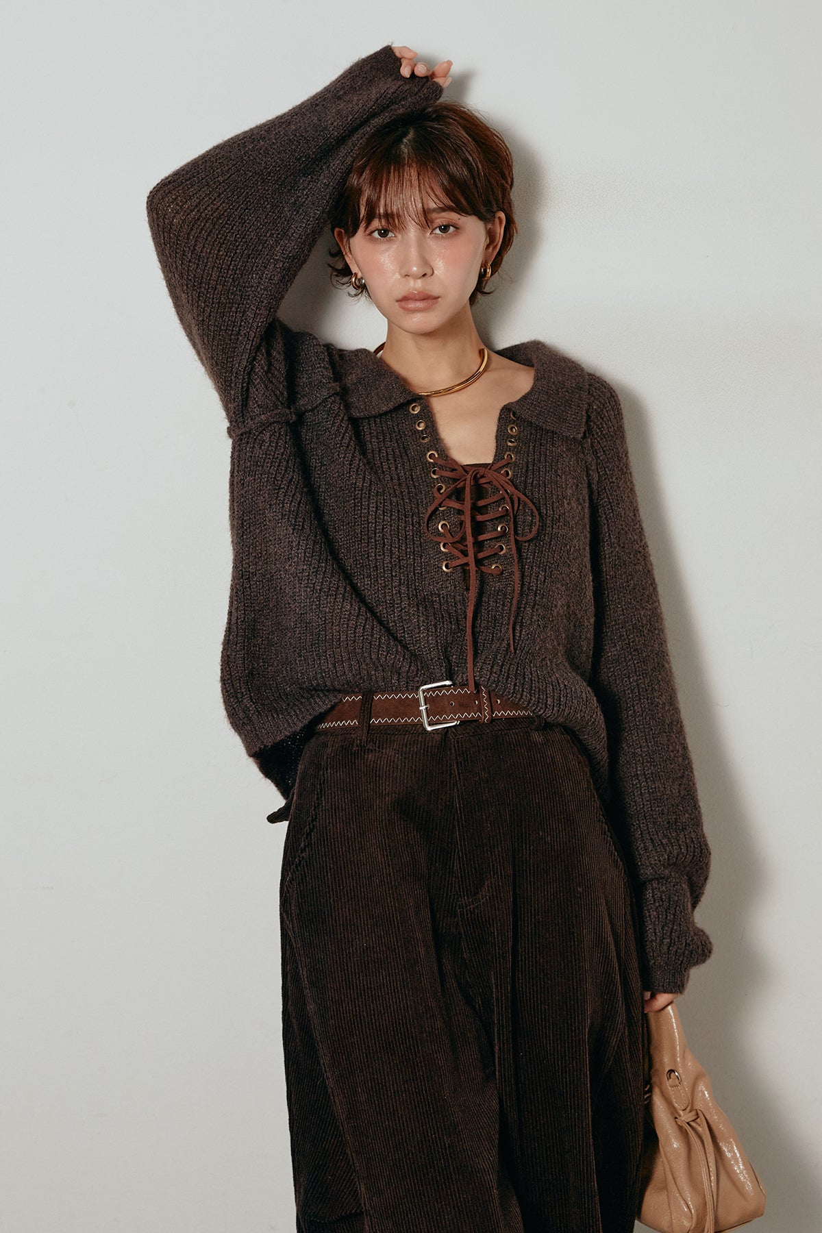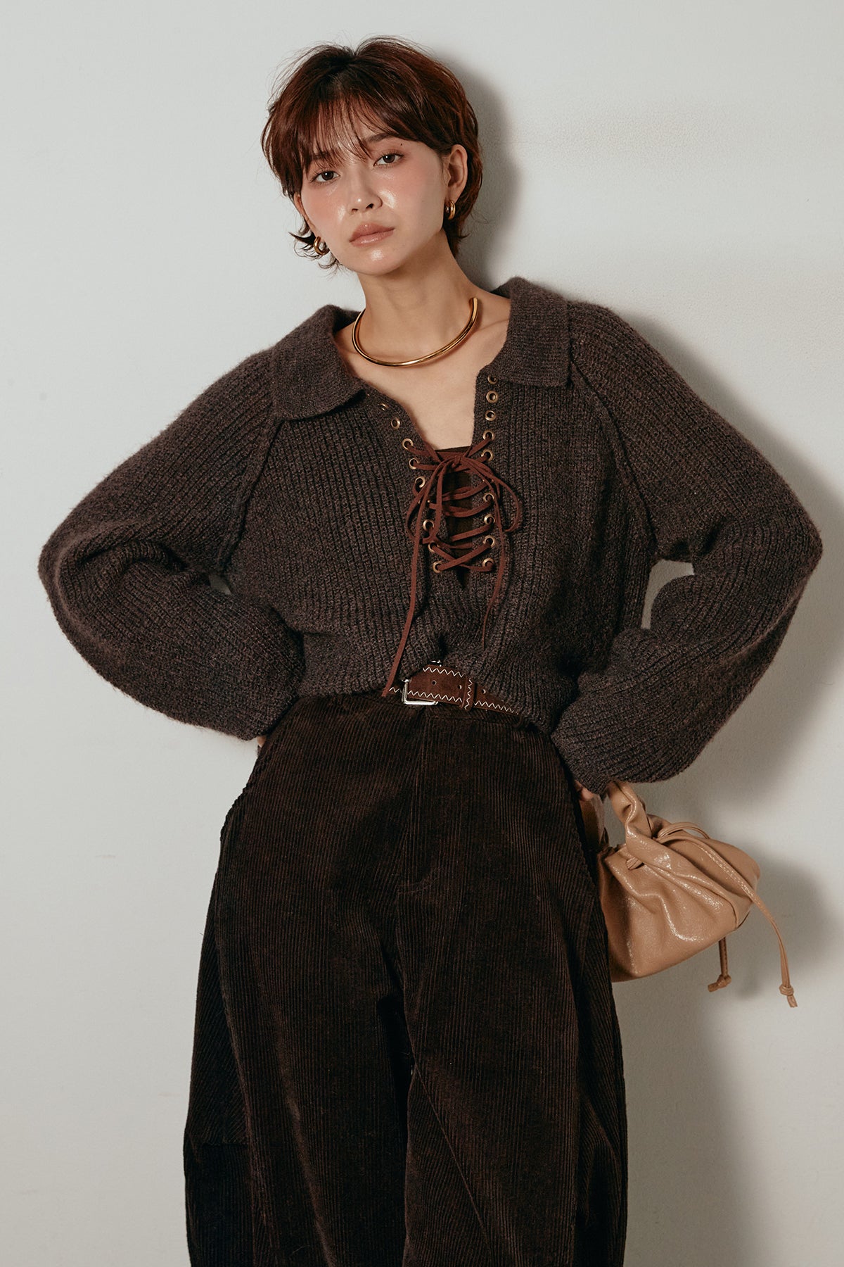 襟付きデザインとレースアップのディテールが印象的なニットトップス。胸元のレースアップが抜け感をプラスし、程よいボリュームのある袖が柔らかな印象を与えます。ざっくりとした編み地が季節感を高め、1枚で着ても存在感のあるスタイルに。パンツにもスカートにも合わせやすく、カジュアルからモードまで幅広く着回せるアイテムです。
