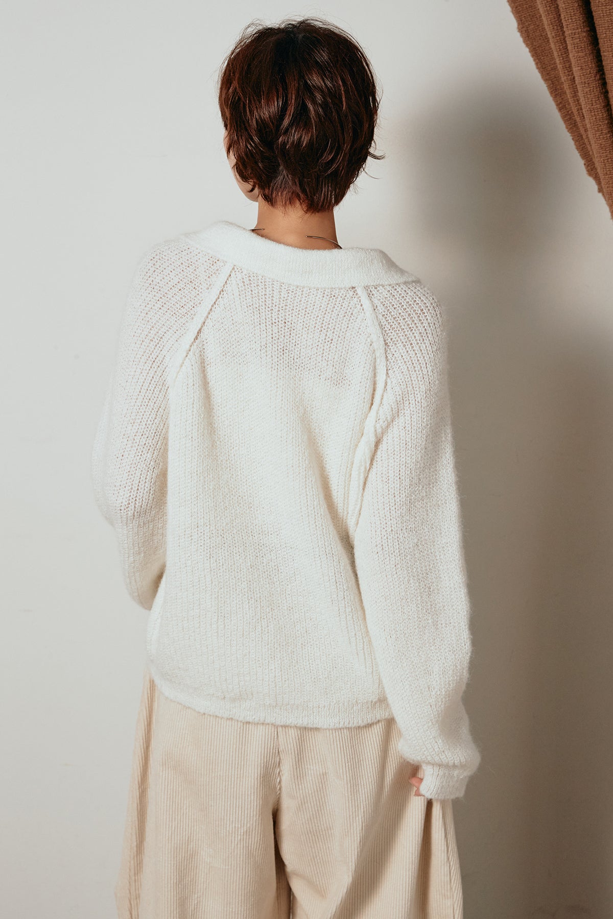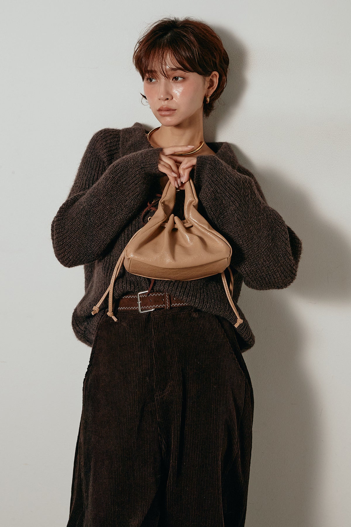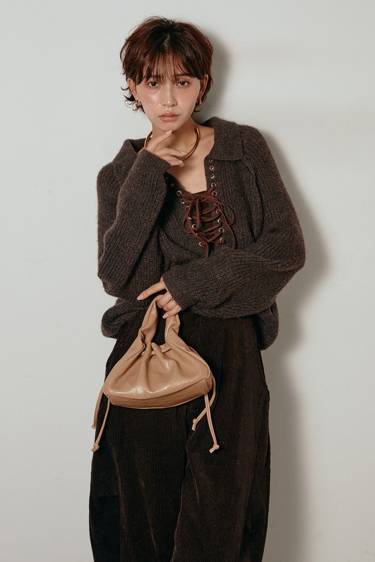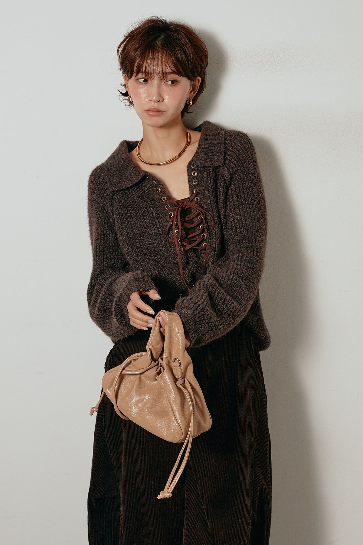 襟付きデザインとレースアップのディテールが印象的なニットトップス。胸元のレースアップが抜け感をプラスし、程よいボリュームのある袖が柔らかな印象を与えます。ざっくりとした編み地が季節感を高め、1枚で着ても存在感のあるスタイルに。パンツにもスカートにも合わせやすく、カジュアルからモードまで幅広く着回せるアイテムです。