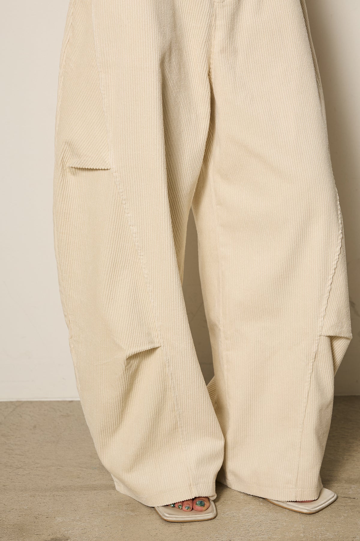 程よくボリュームのあるシルエットが魅力のコーデュロイカーブパンツ。ステッチデザインが立体感を引き立て、カジュアルながらも洗練された印象に。付属のベルトでウエストマークすれば、バランスの取れたスタイルが完成します。柔らかなコーデュロイ素材で穿き心地も良く、秋冬のデイリースタイルにぴったりの一本です。