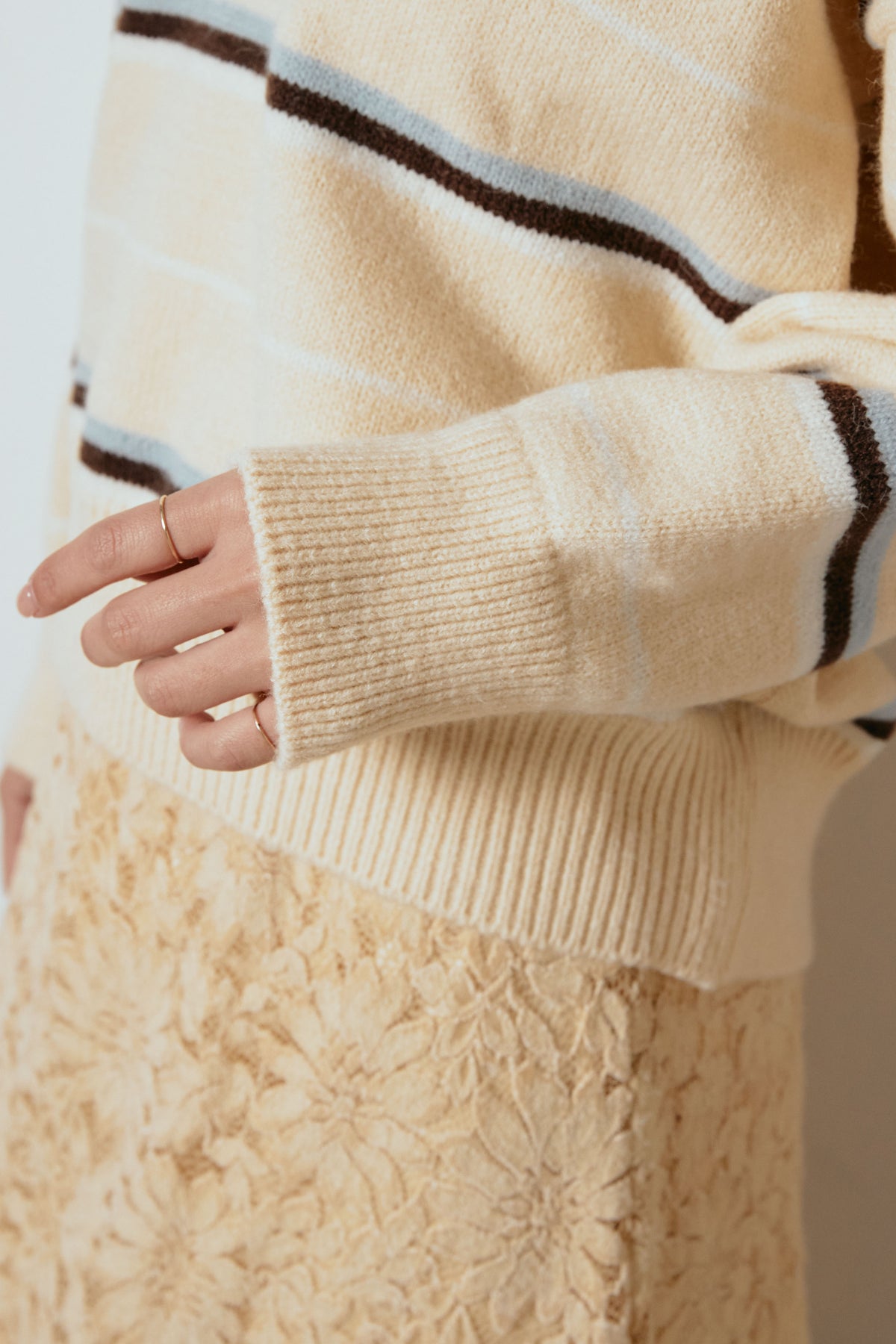 落ち着いたトーンの中にアクセントカラーを効かせたマルチボーダーニットトップス。