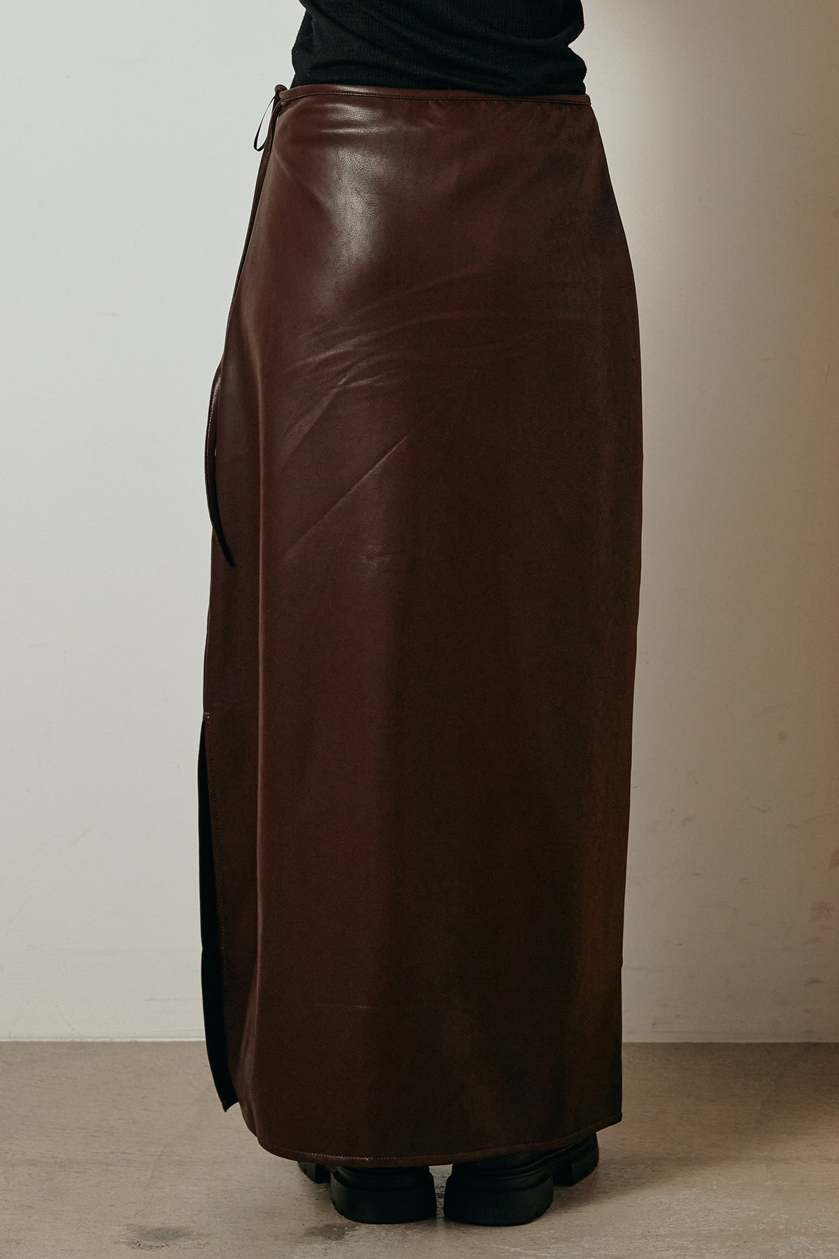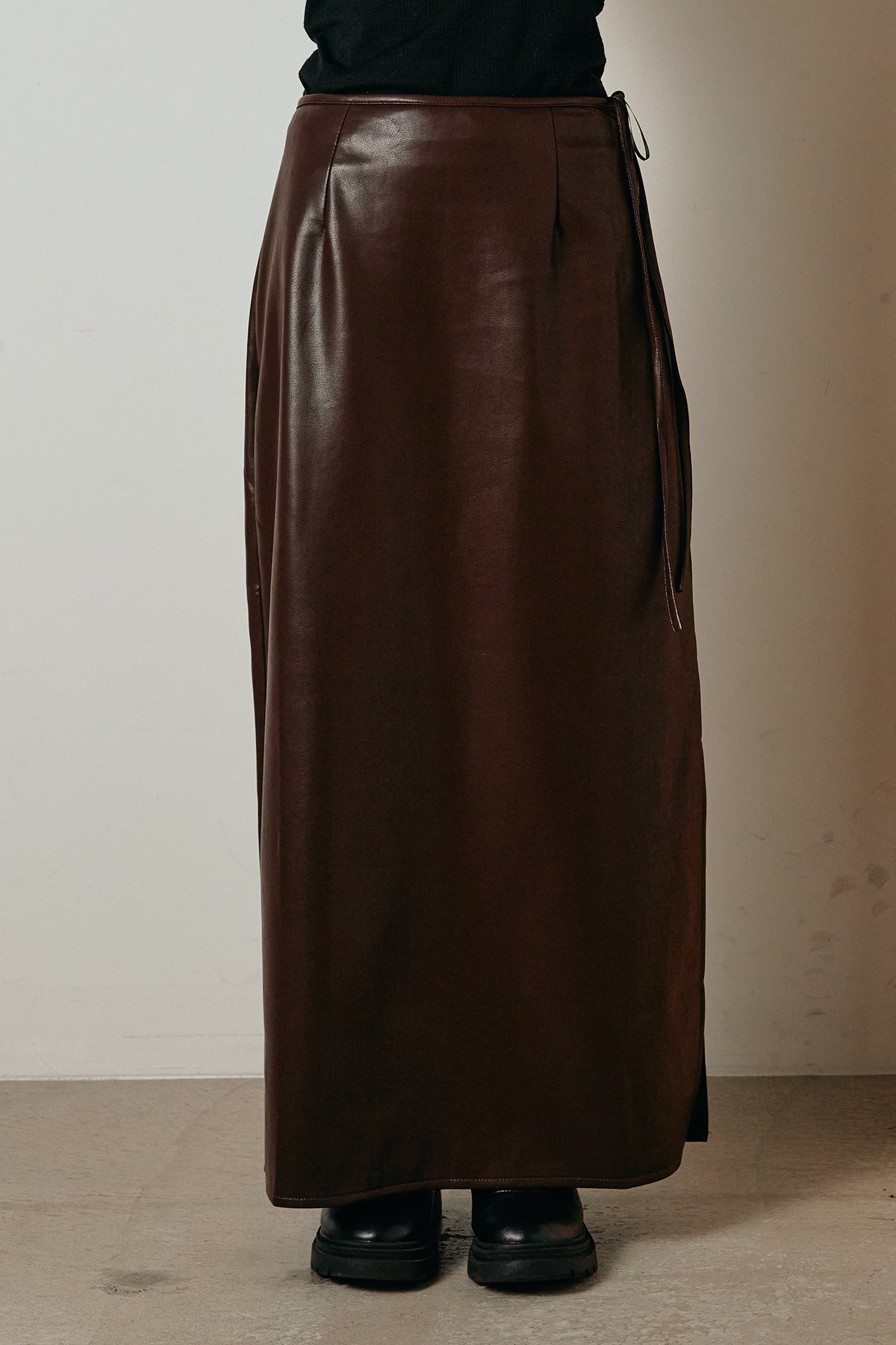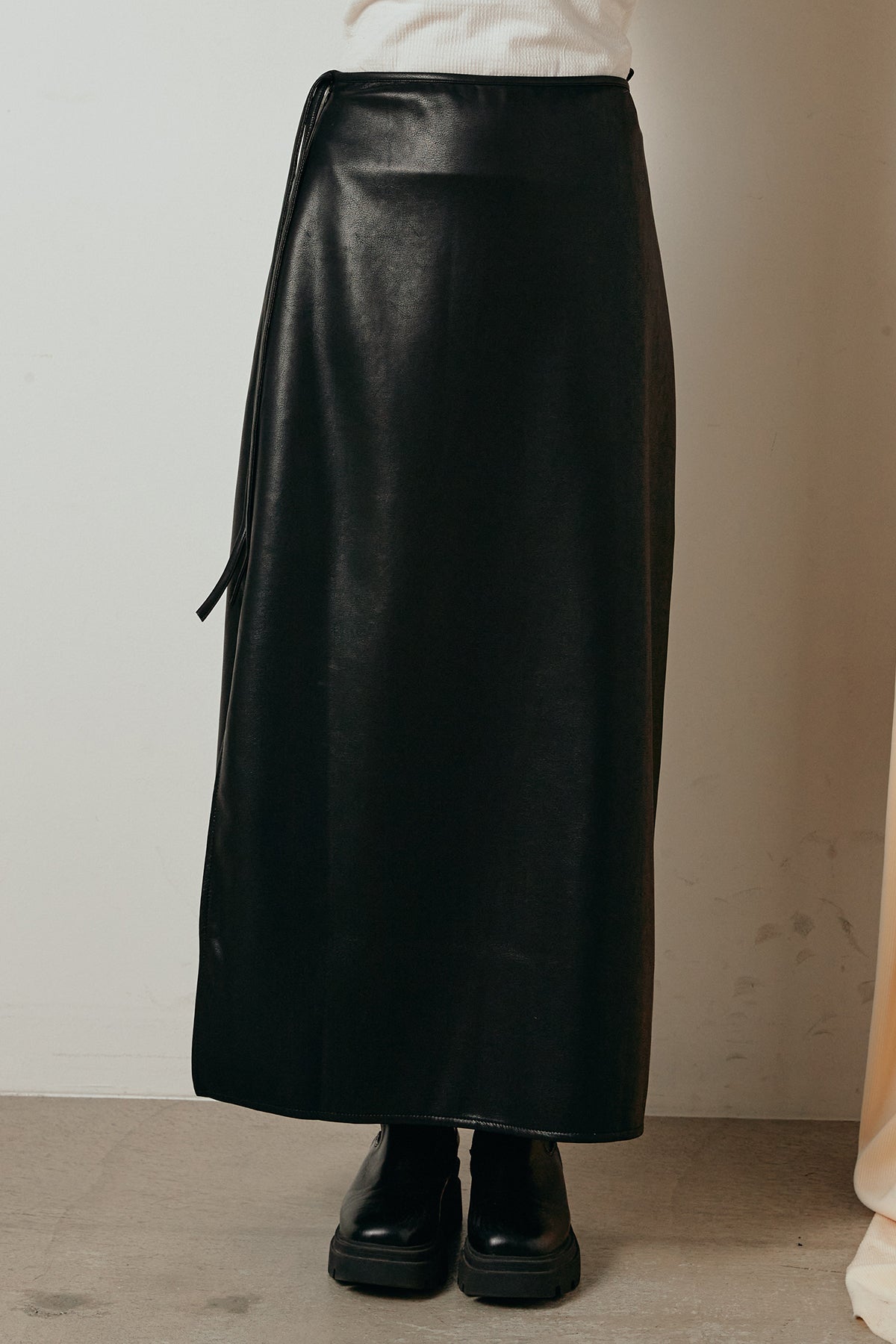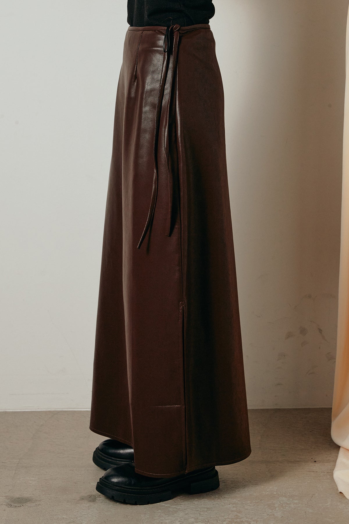 艶感のあるフェイクレザー素材が存在感を放つワイドスカート。ウエストの紐デザインがアクセントとなり、シルエットに動きをプラスします。しなやかな質感で落ち感が美しく、トップスをインするだけでモードなスタイリングが完成。秋冬のコーディネートに取り入れたい一枚です。