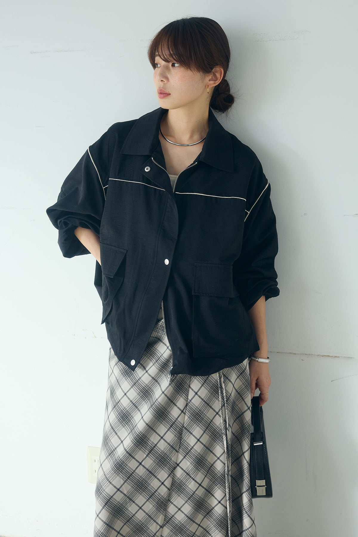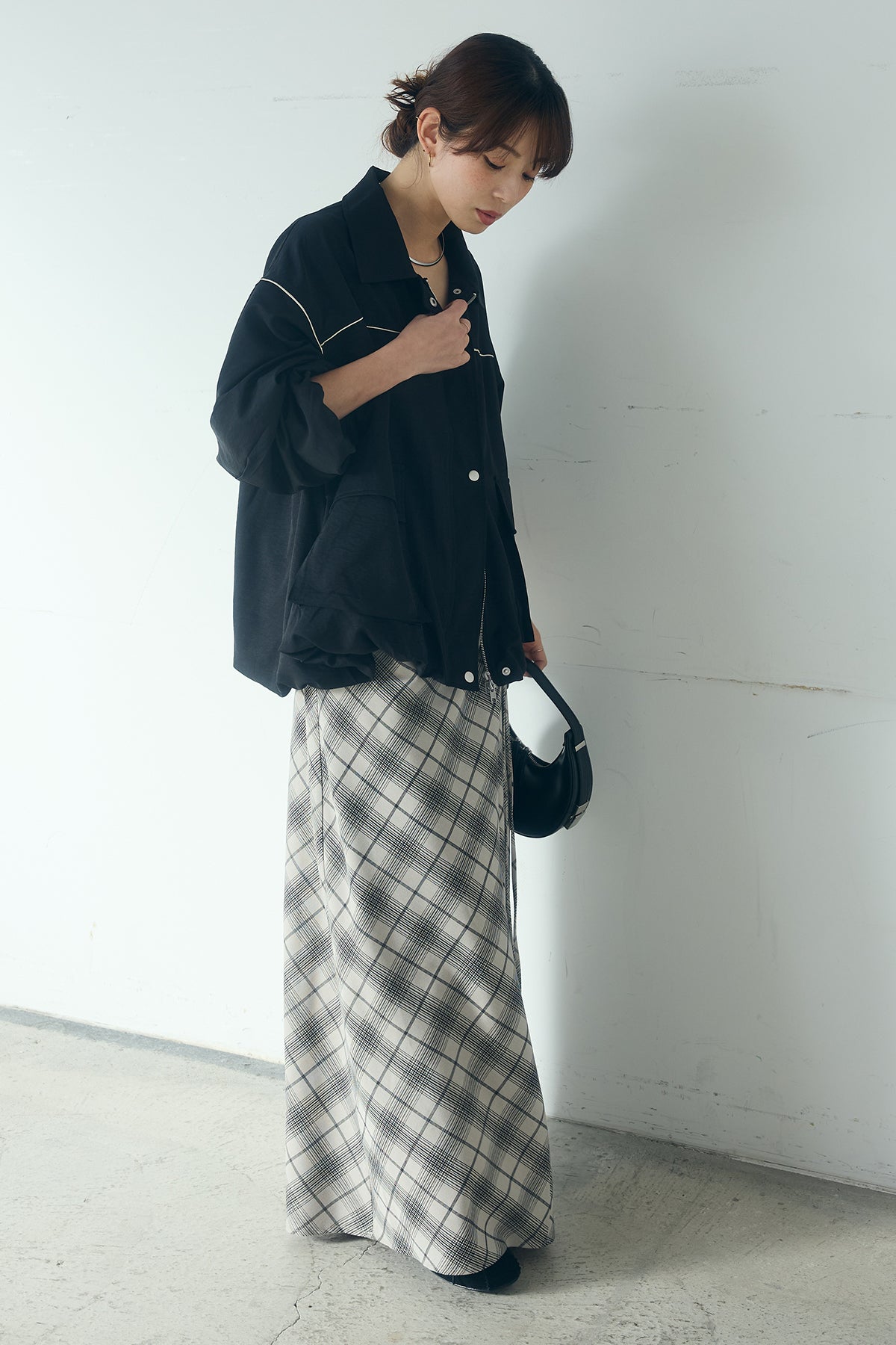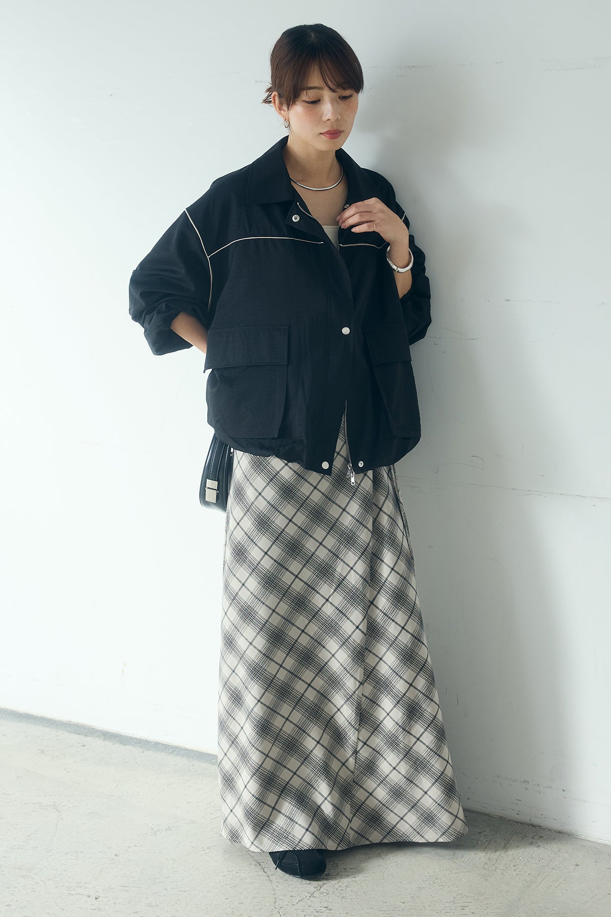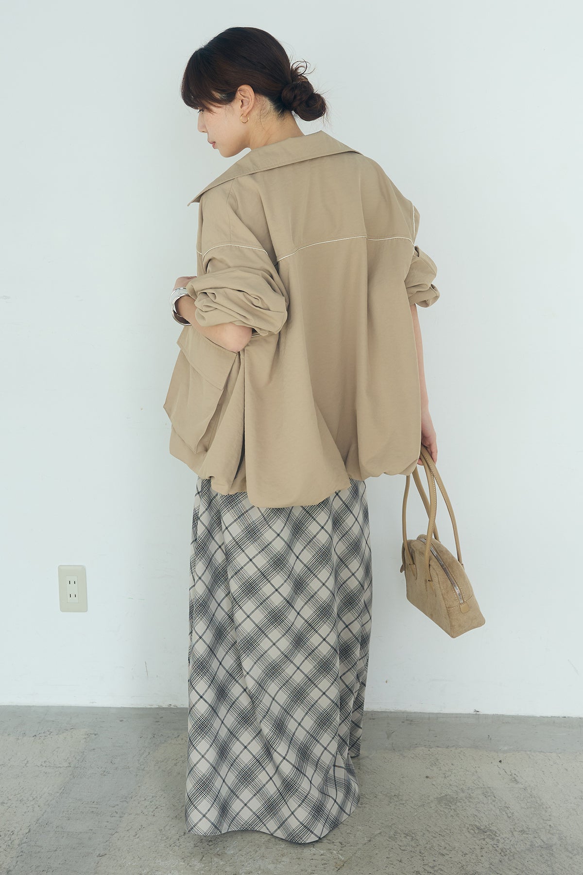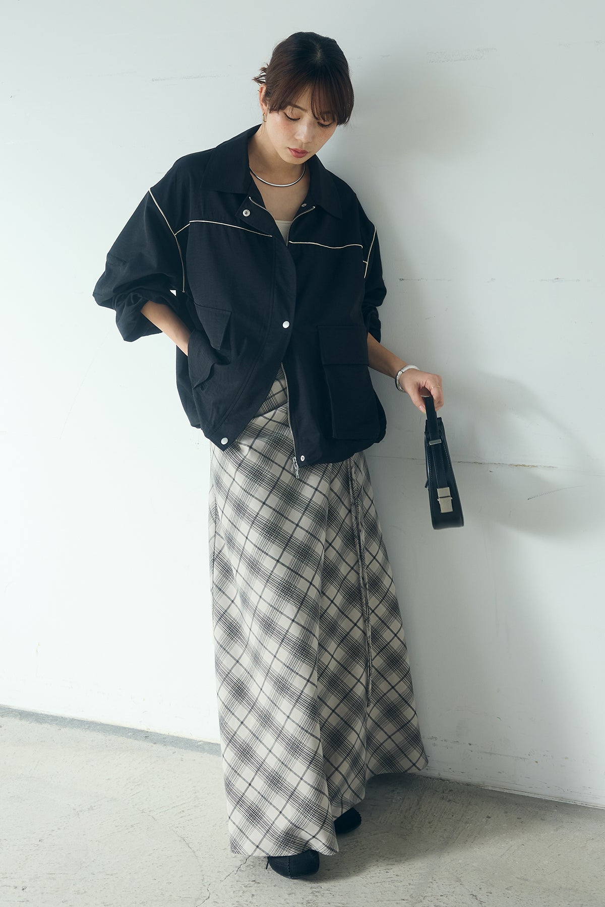 [SET]合繊ツイルバルーンジャケット+タータンチェック柄フロントデザインスカート(2set)