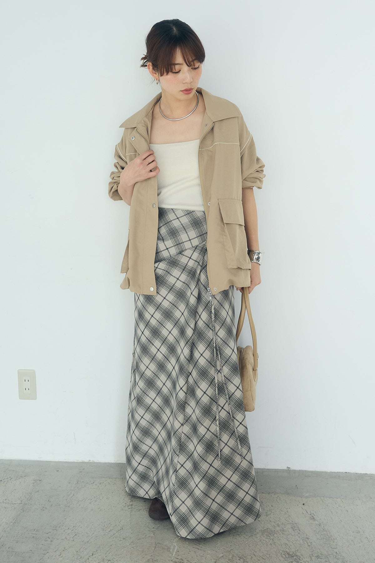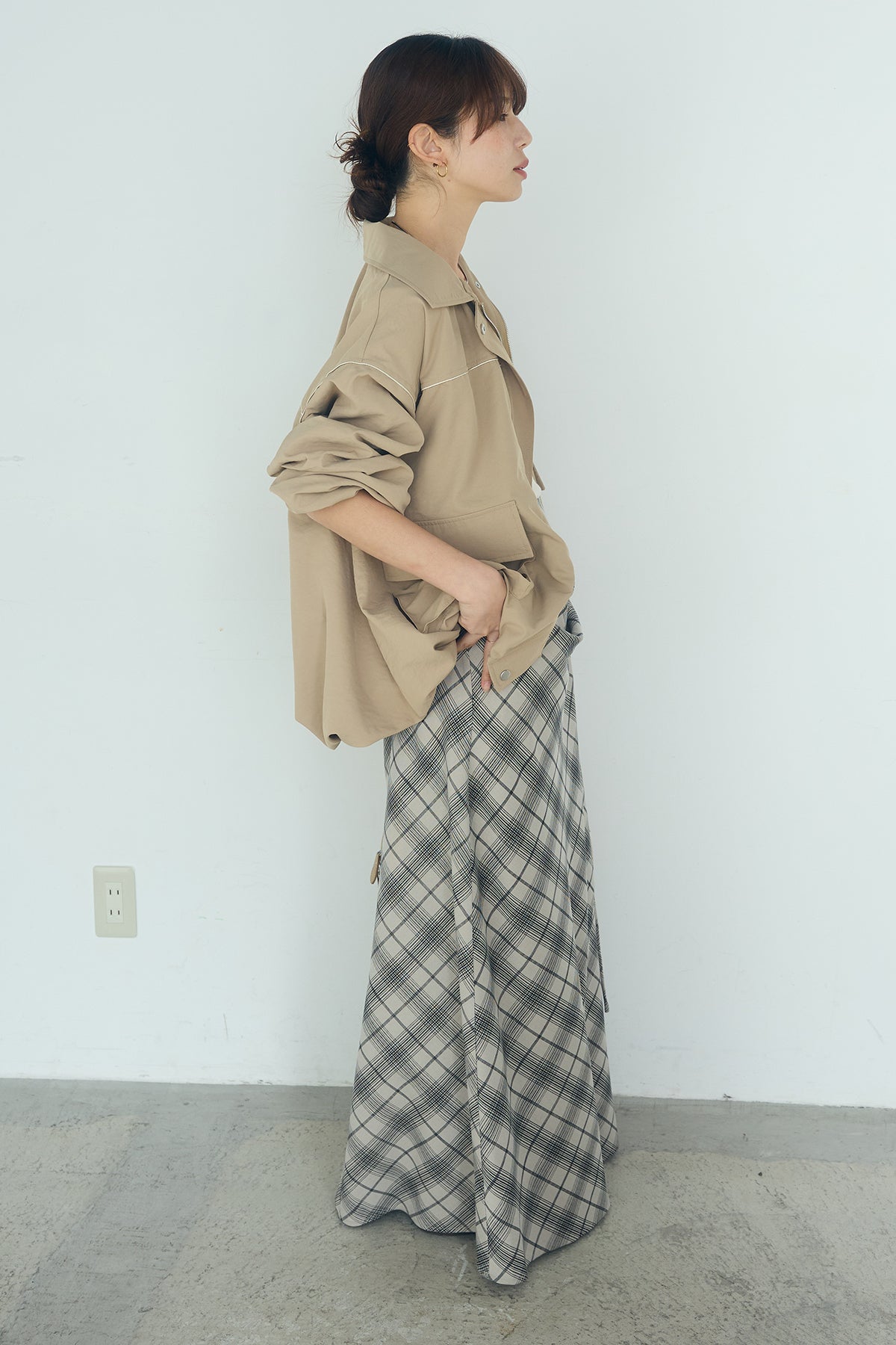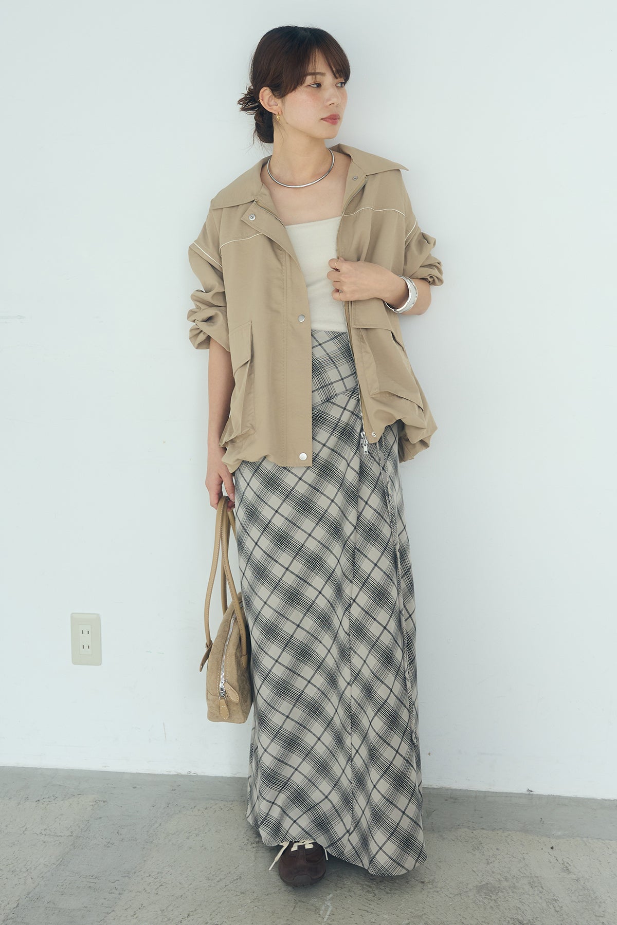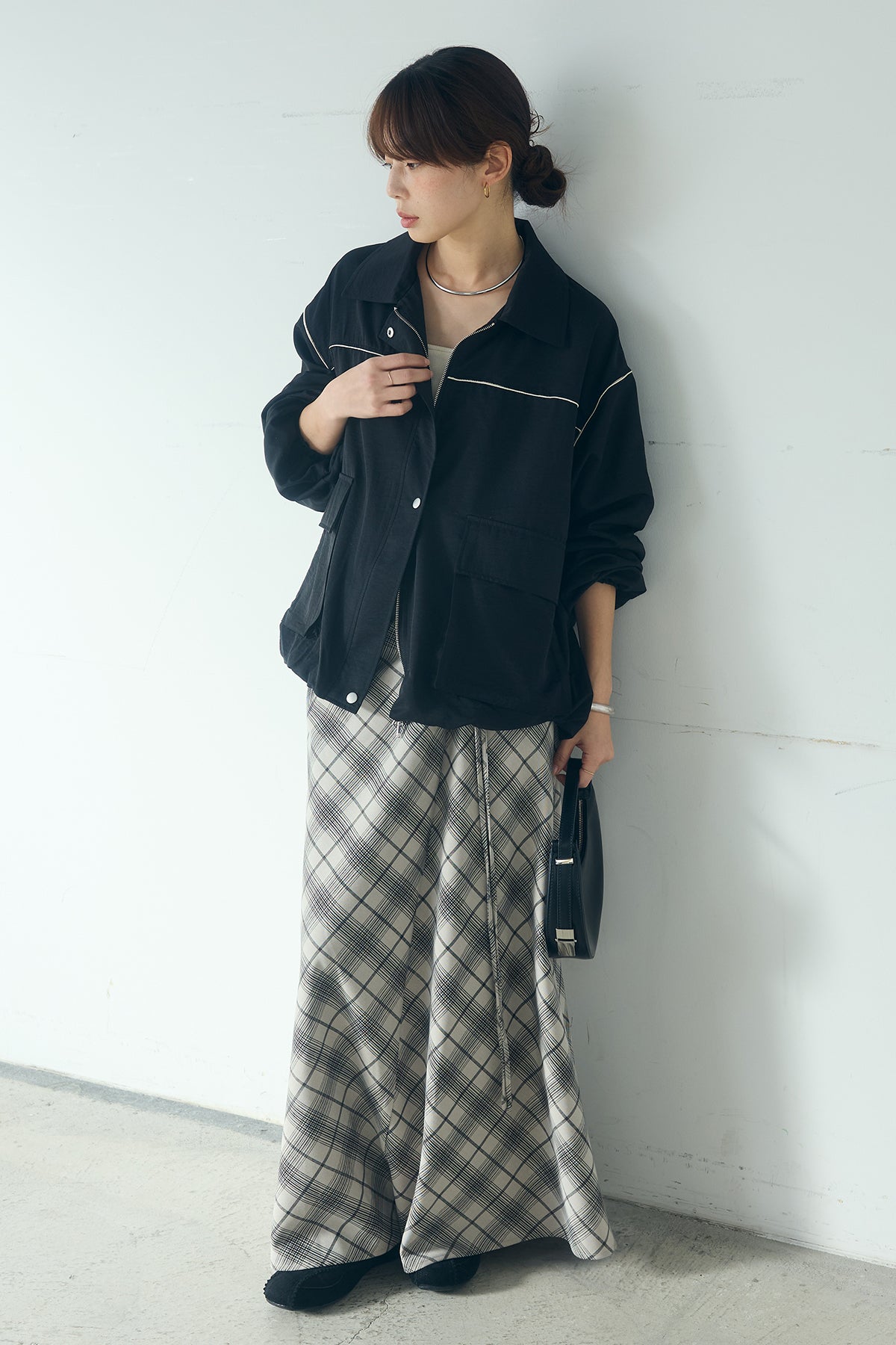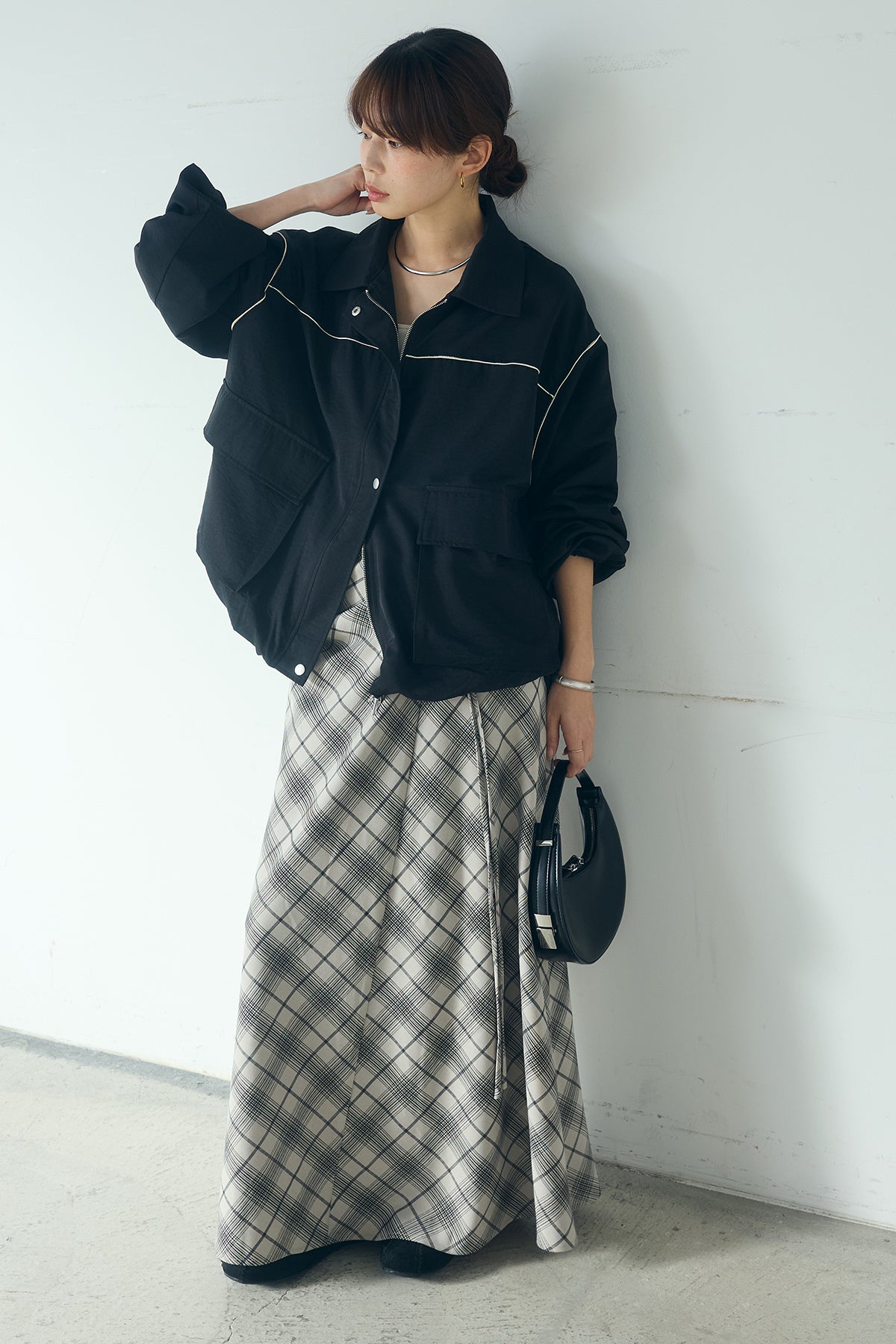 [SET]合繊ツイルバルーンジャケット+タータンチェック柄フロントデザインスカート(2set)