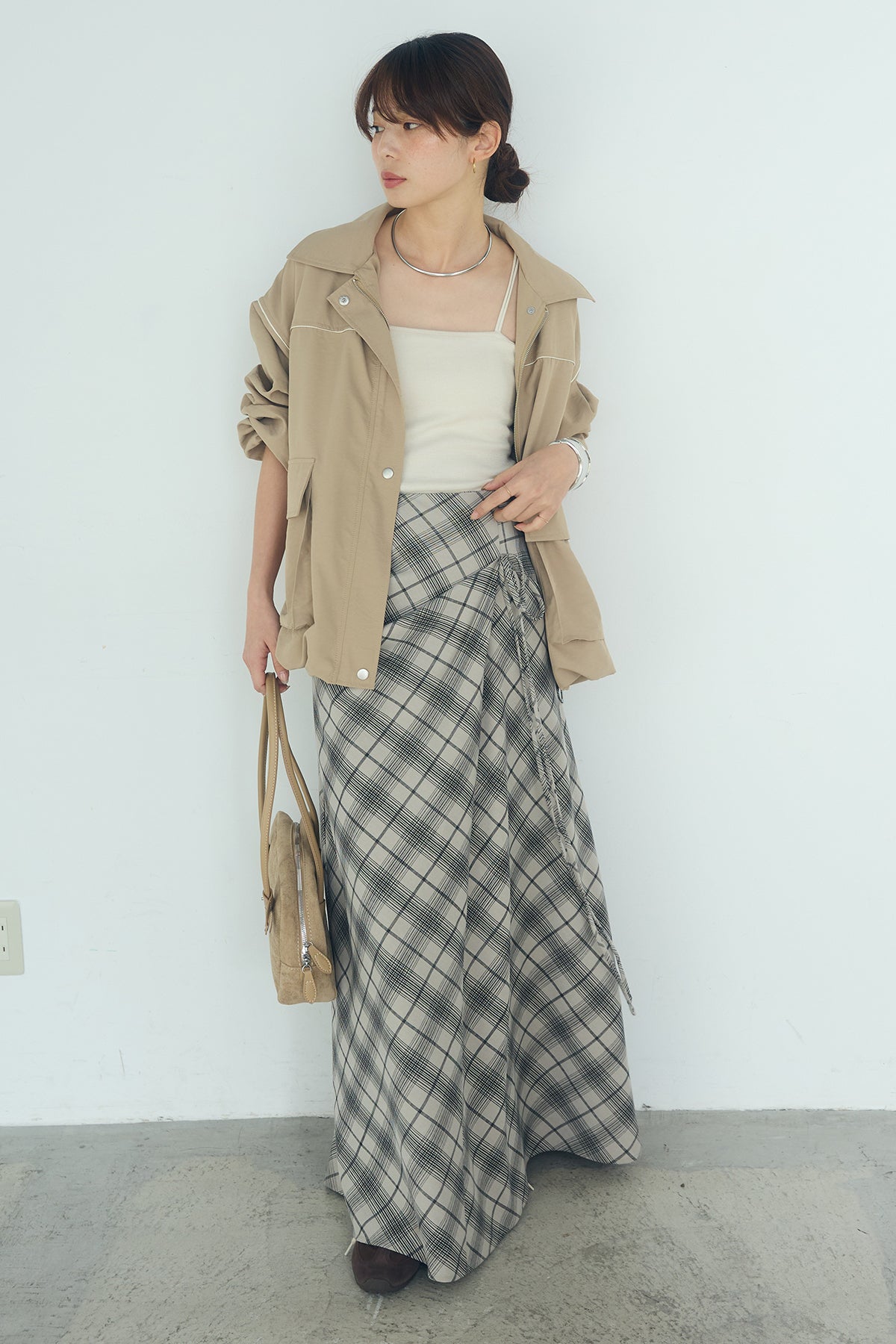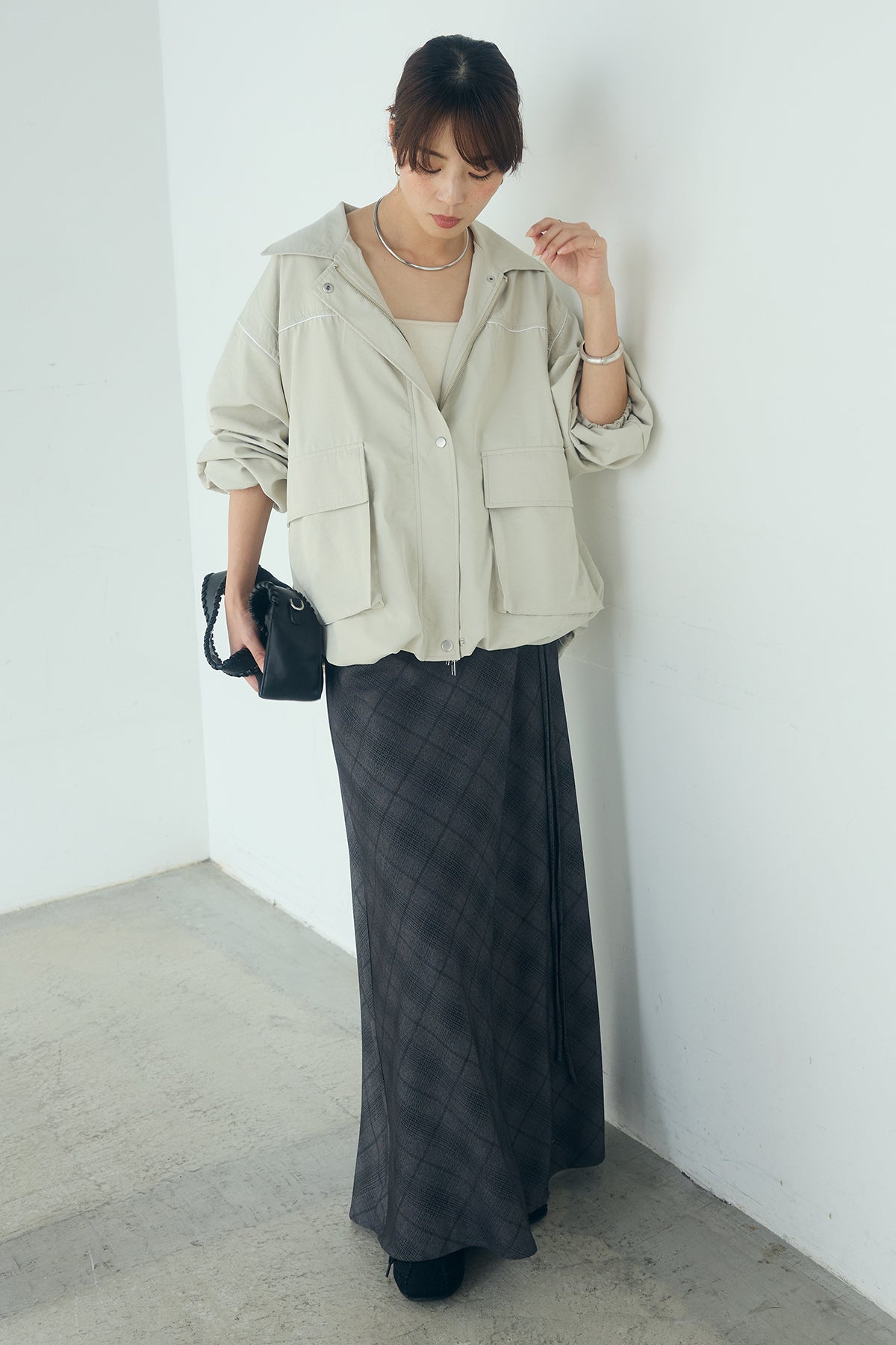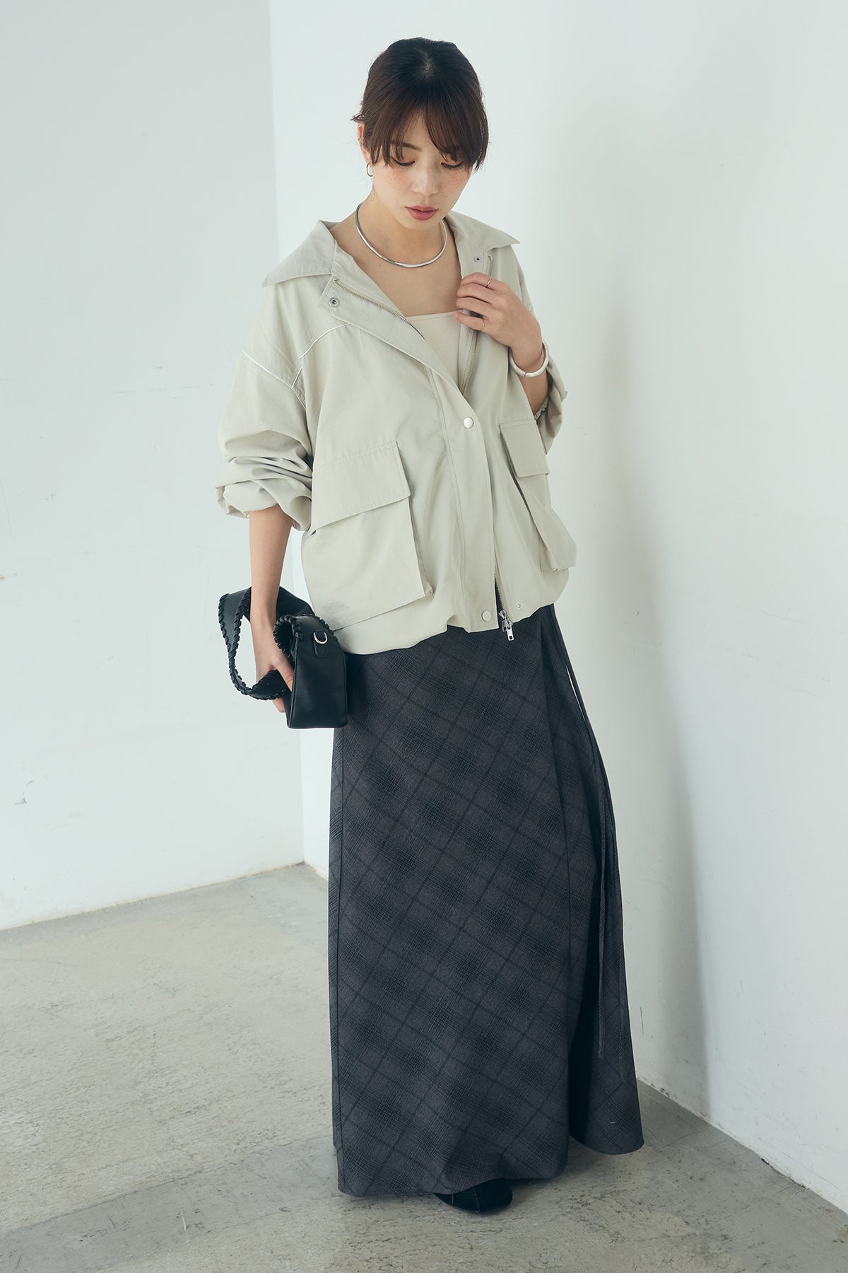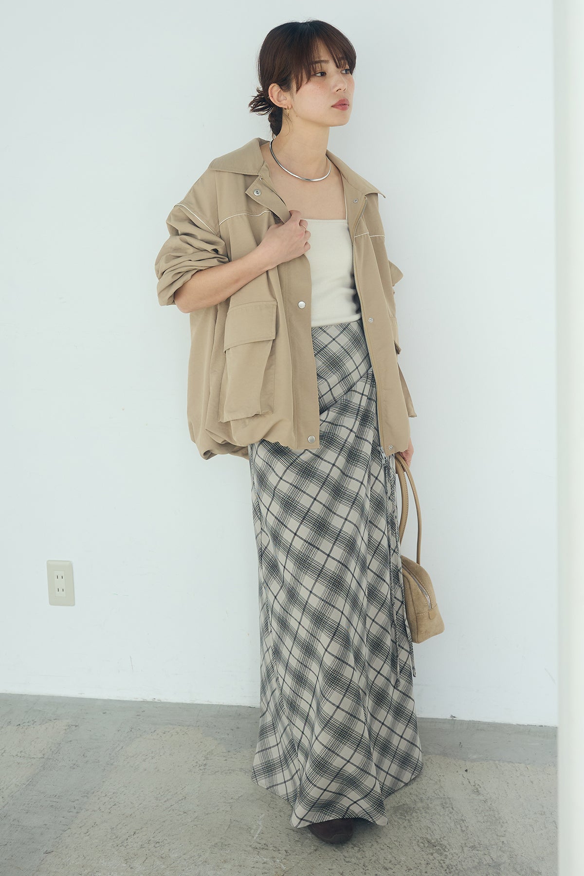 [SET]合繊ツイルバルーンジャケット+タータンチェック柄フロントデザインスカート(2set)