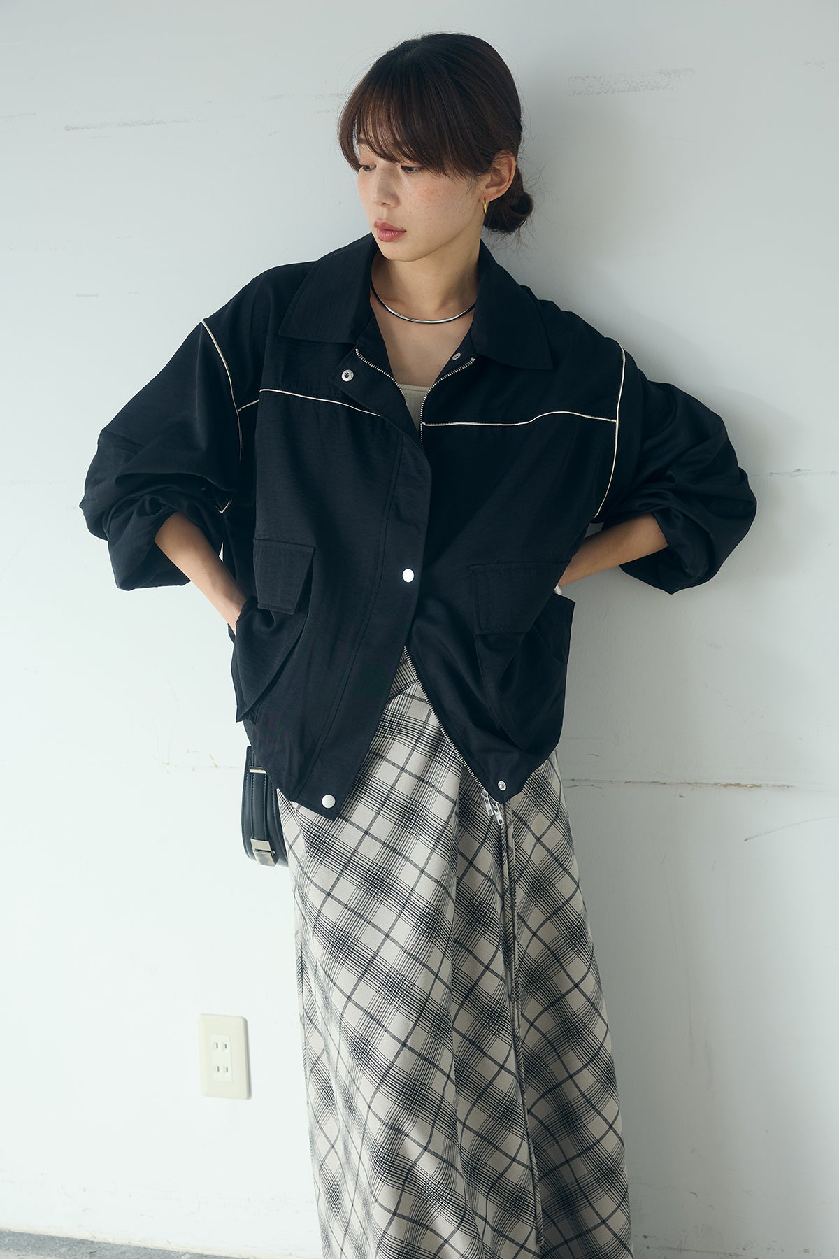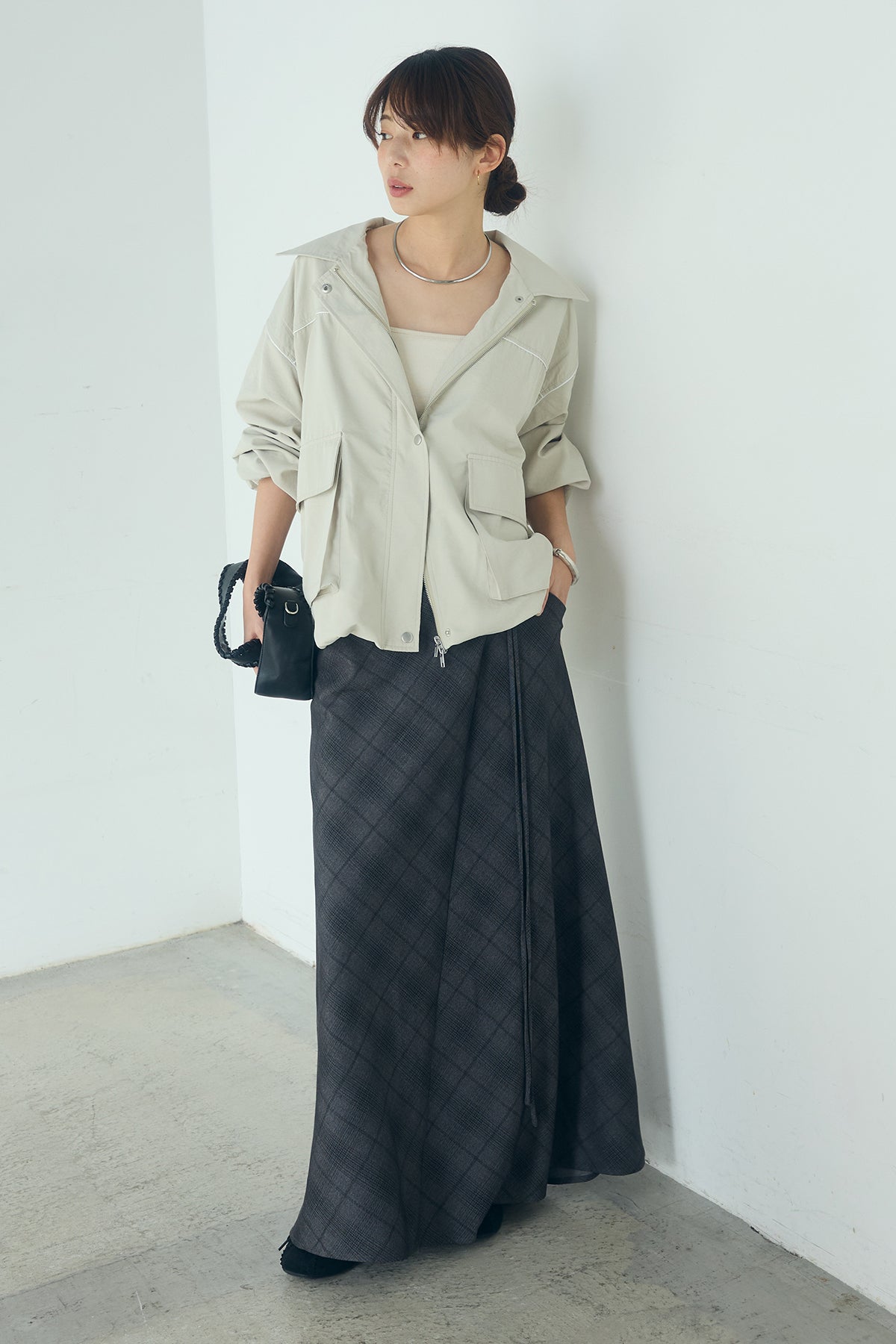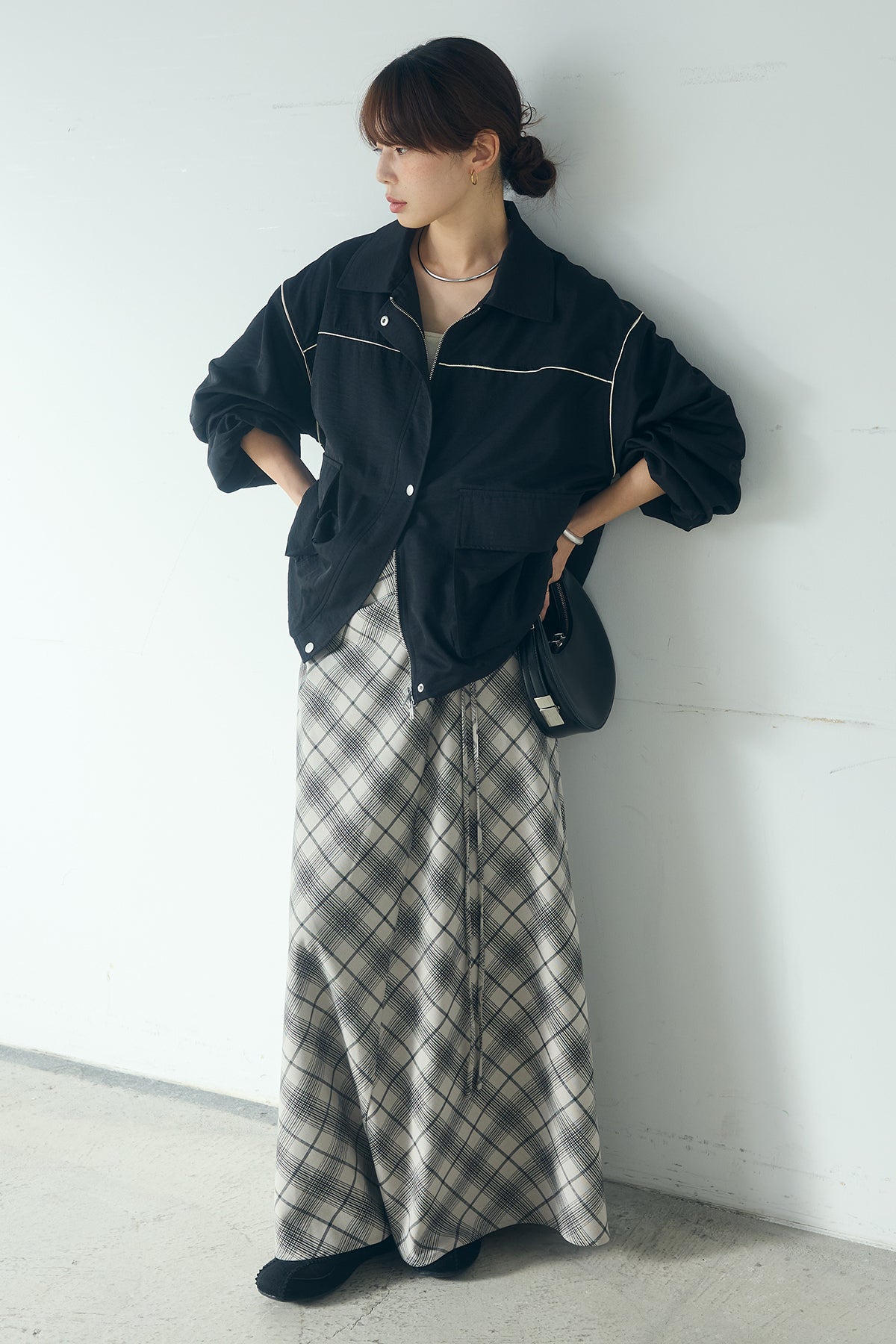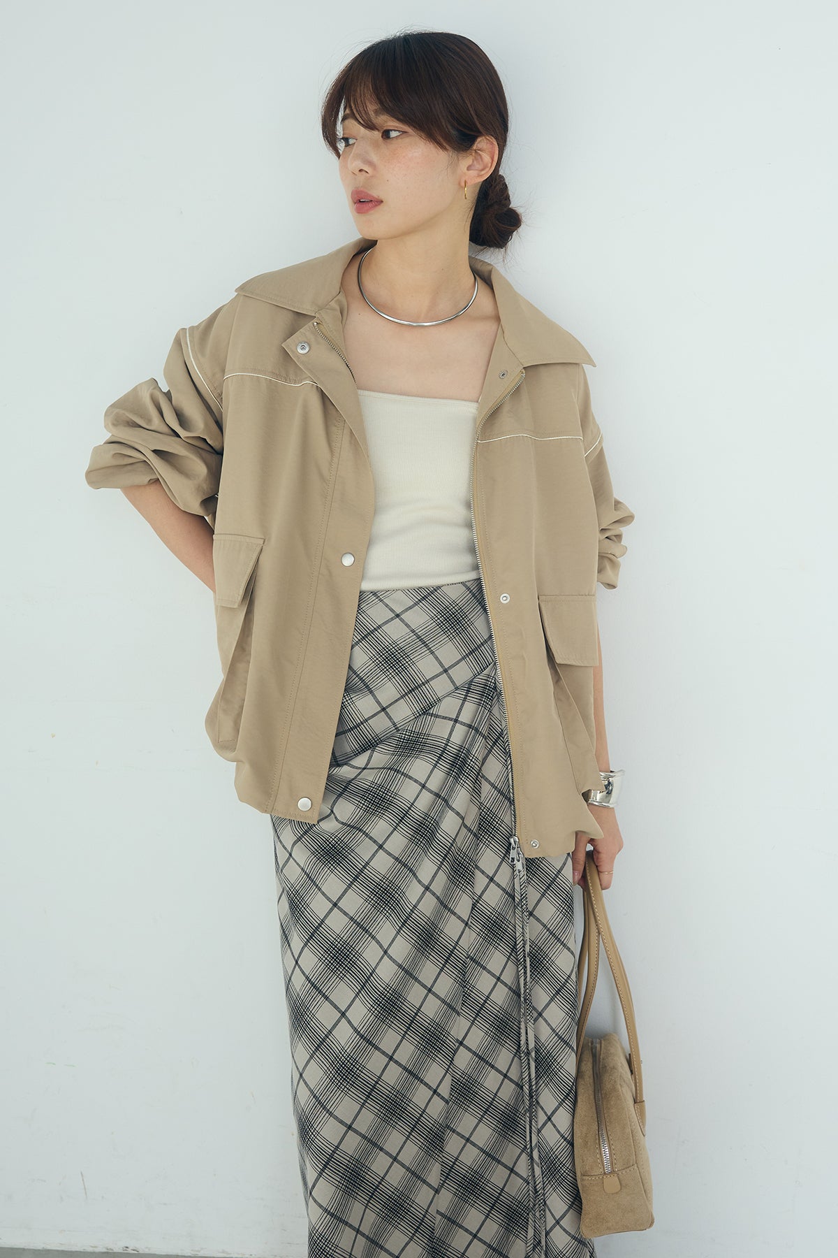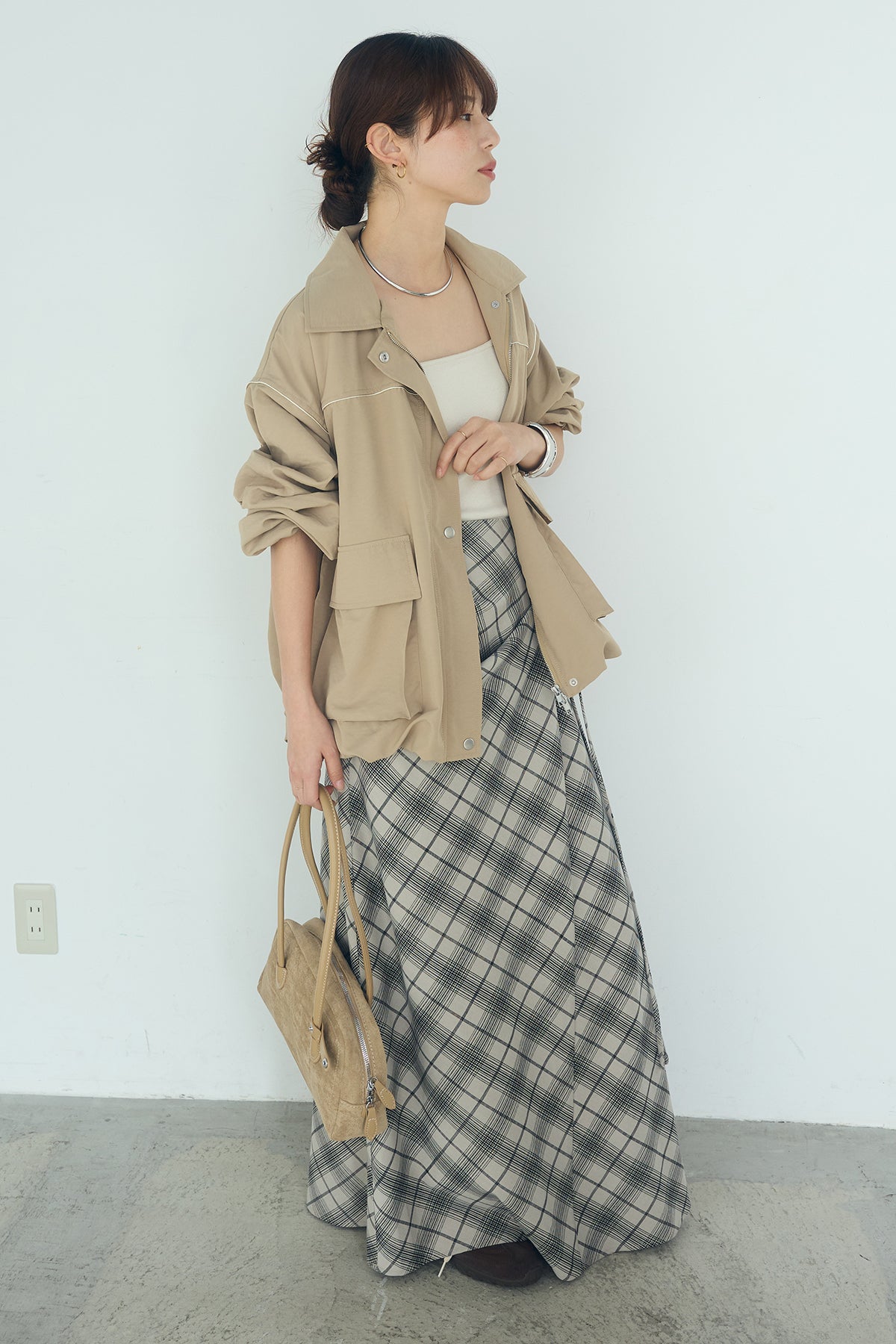 [SET]合繊ツイルバルーンジャケット+タータンチェック柄フロントデザインスカート(2set)