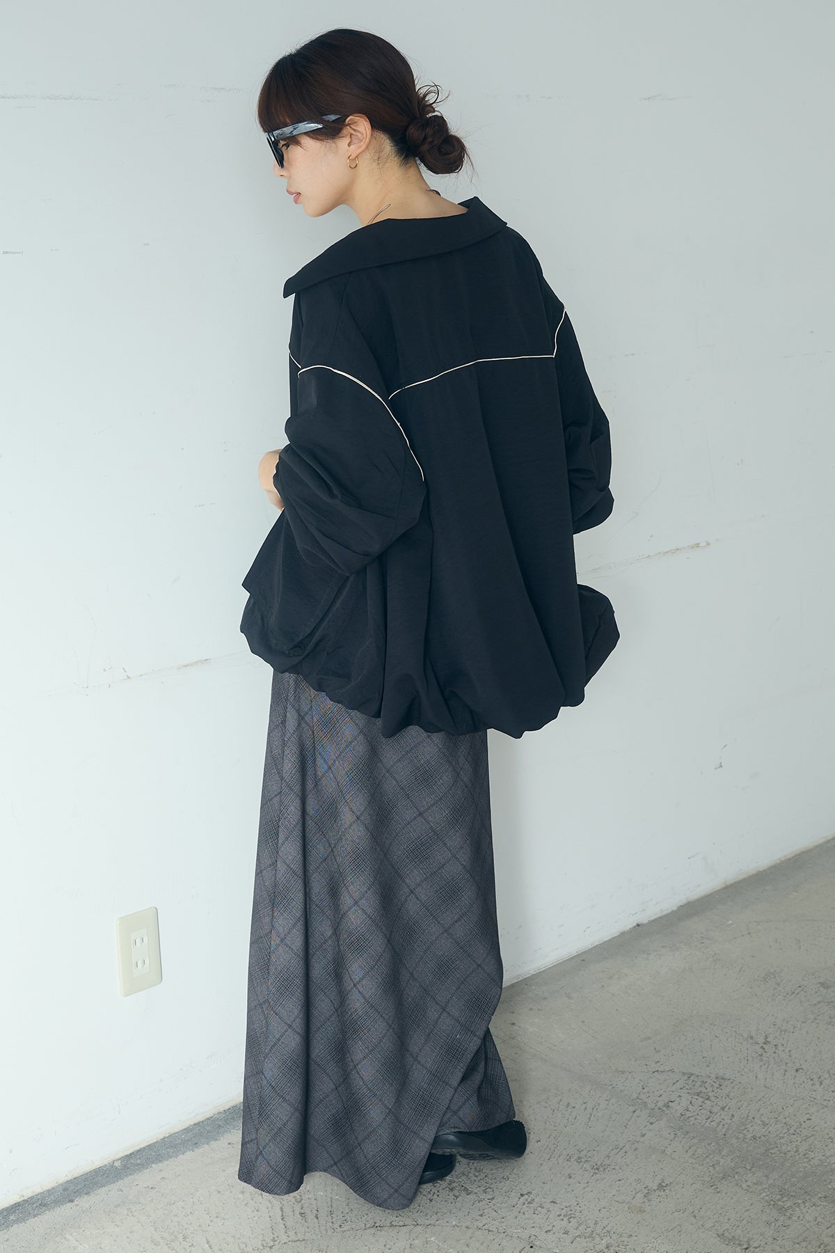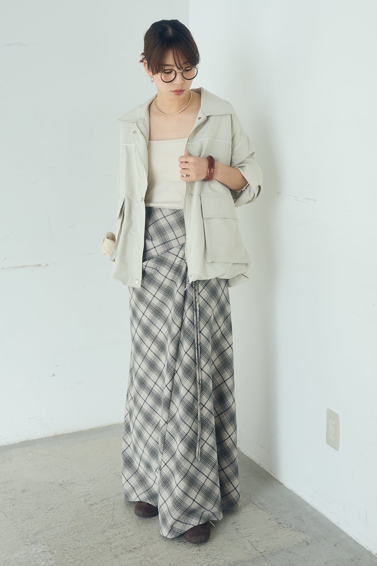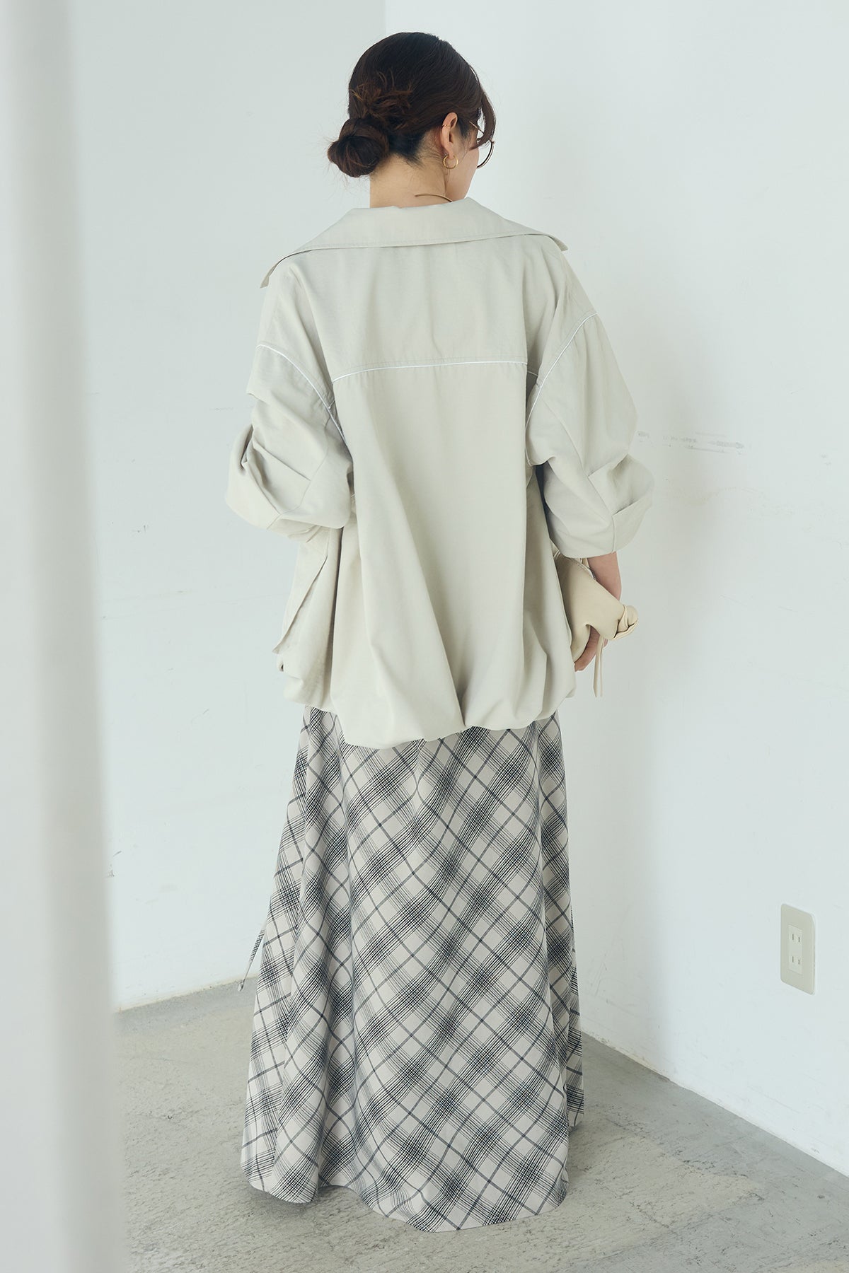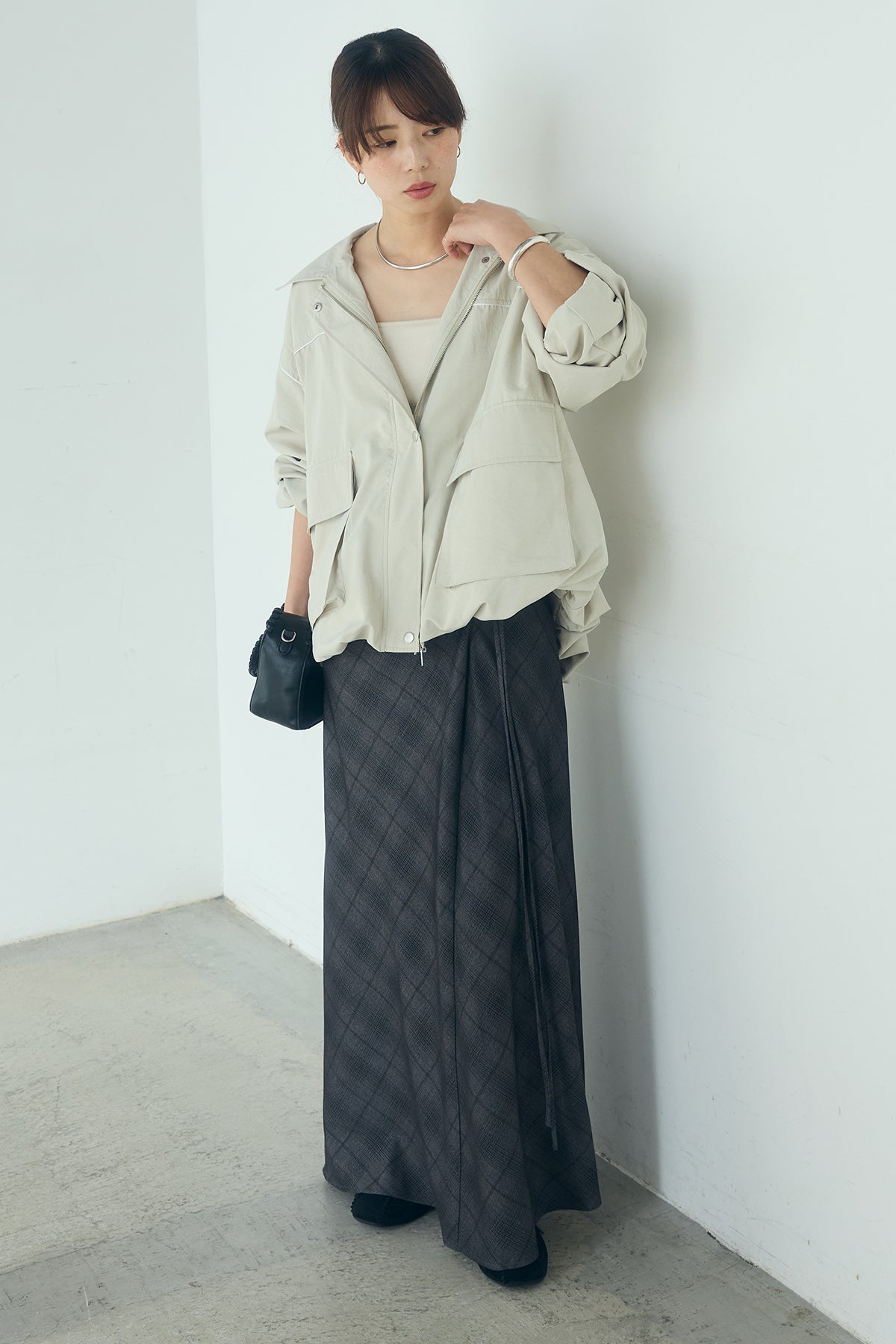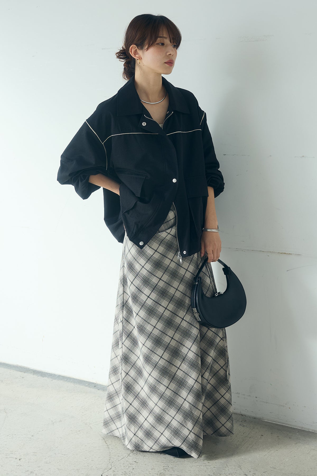 [SET]合繊ツイルバルーンジャケット+タータンチェック柄フロントデザインスカート(2set)