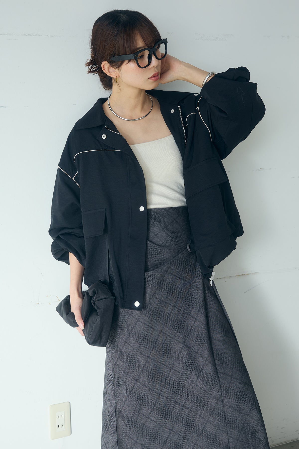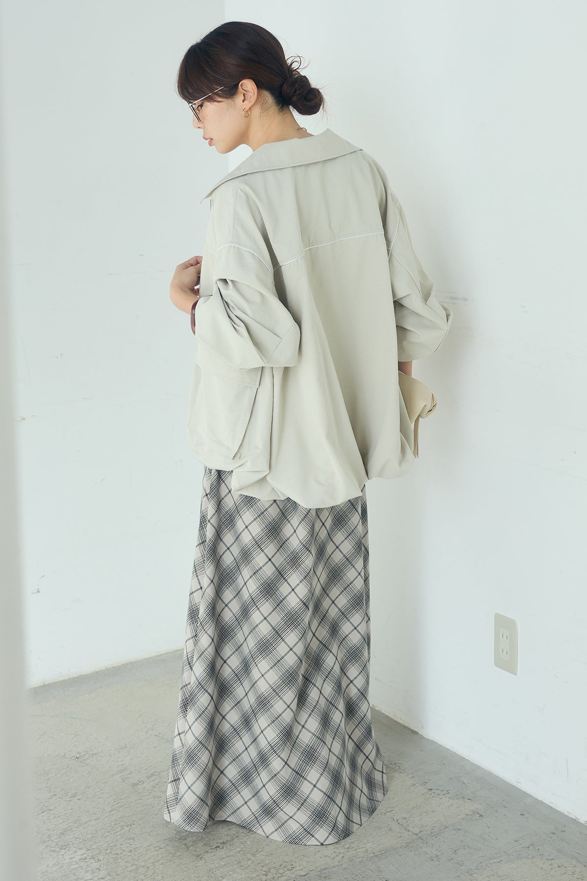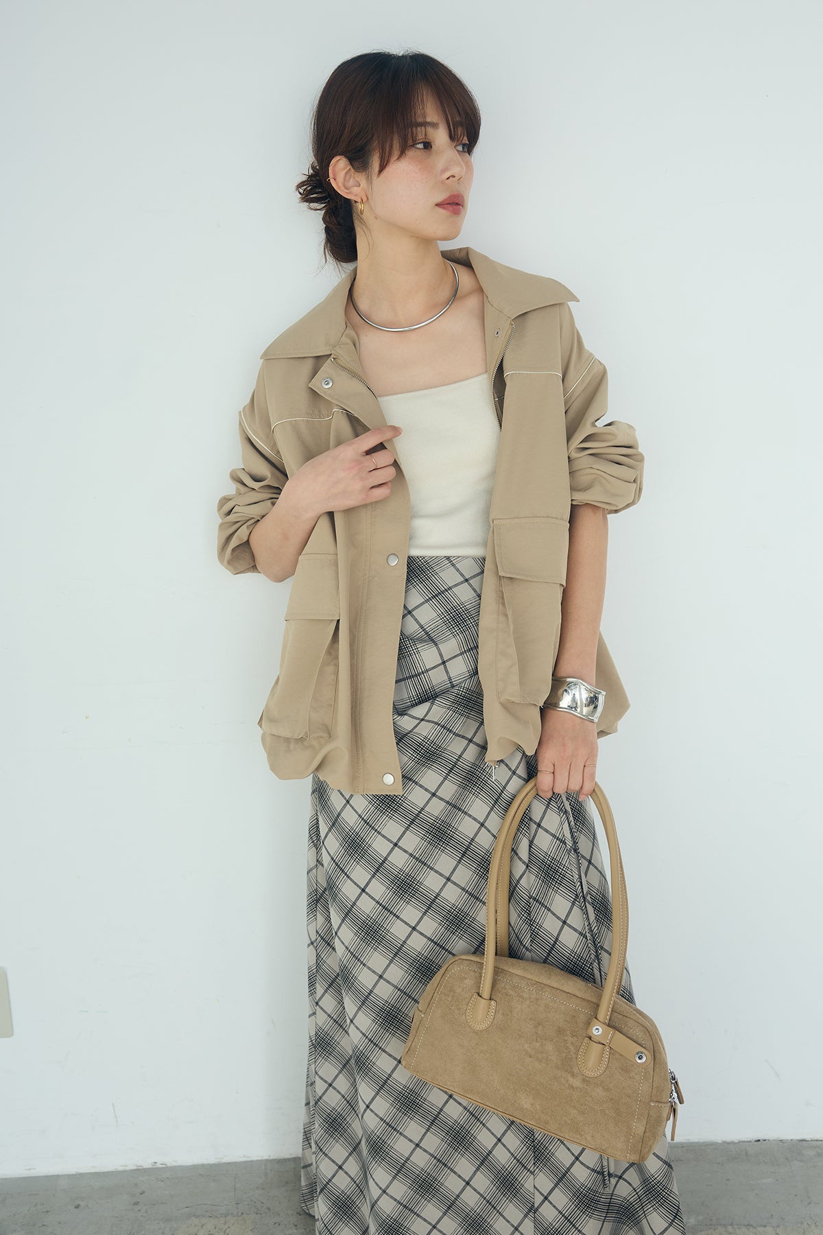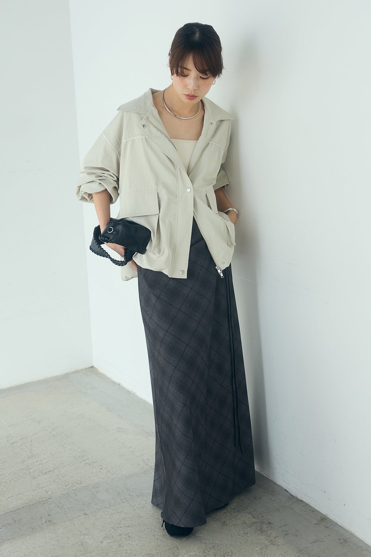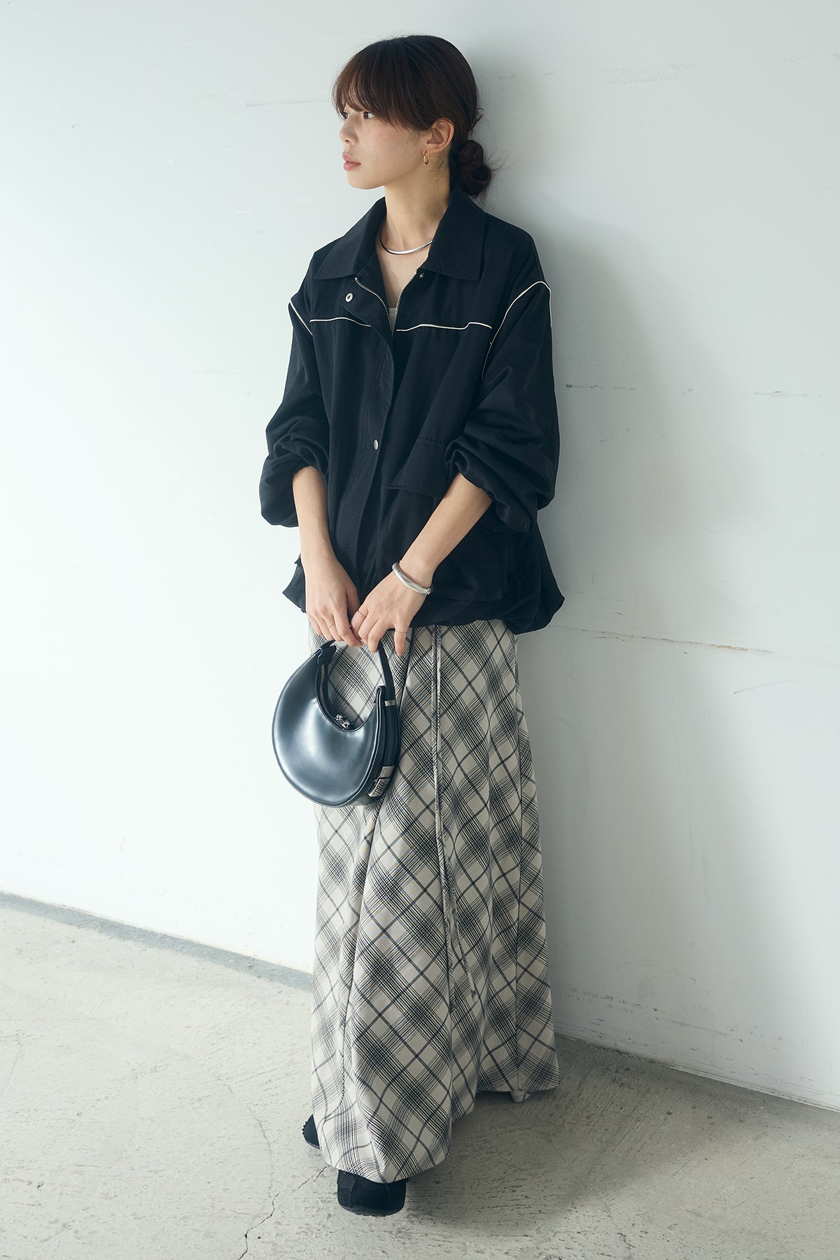 [SET]合繊ツイルバルーンジャケット+タータンチェック柄フロントデザインスカート(2set)
