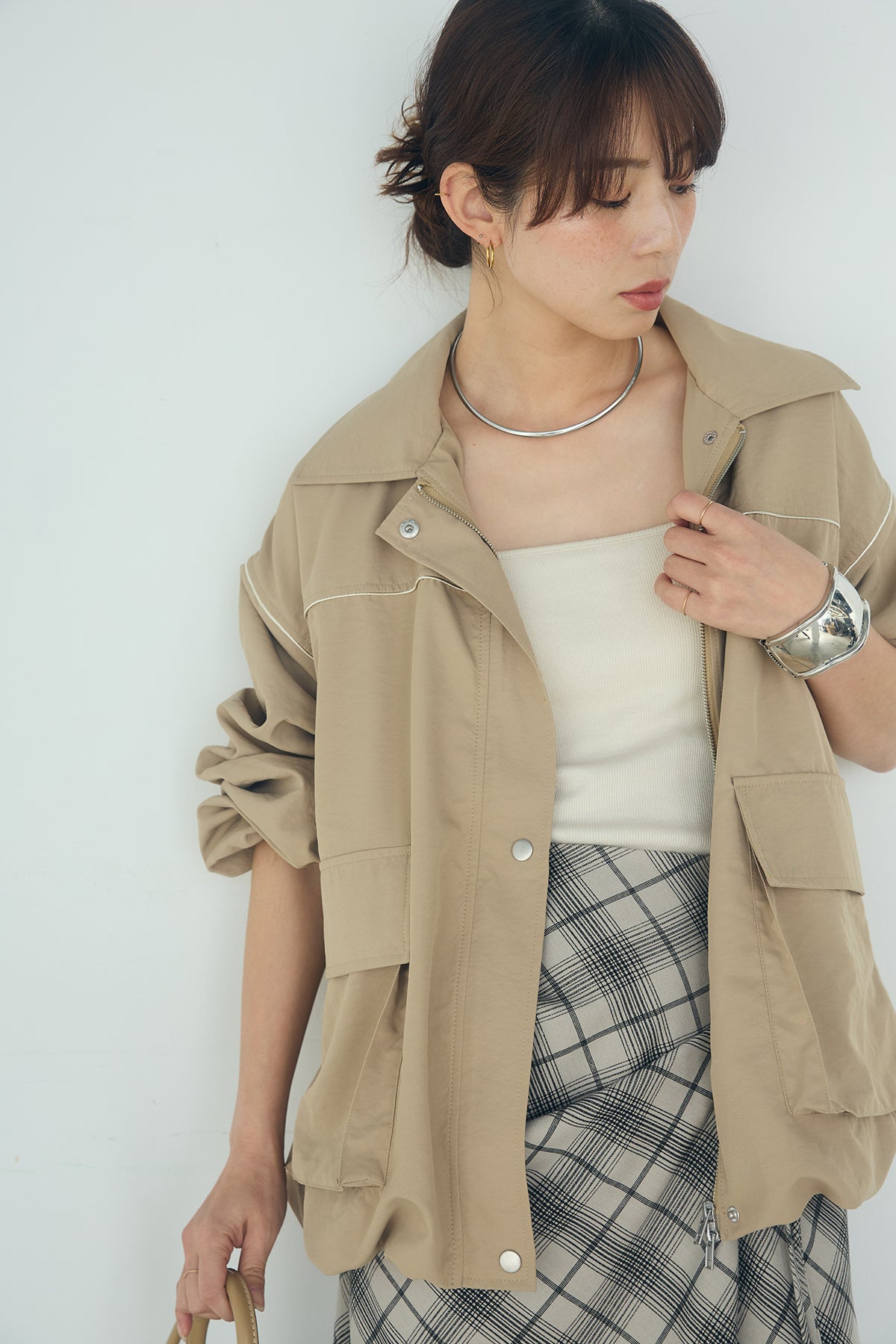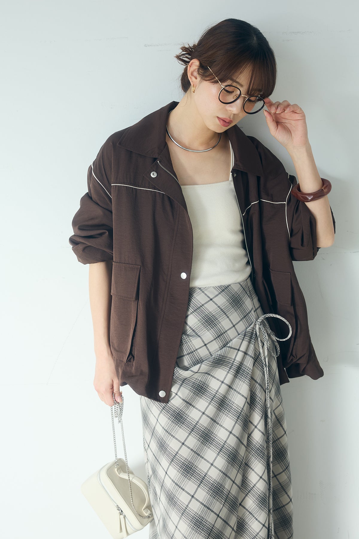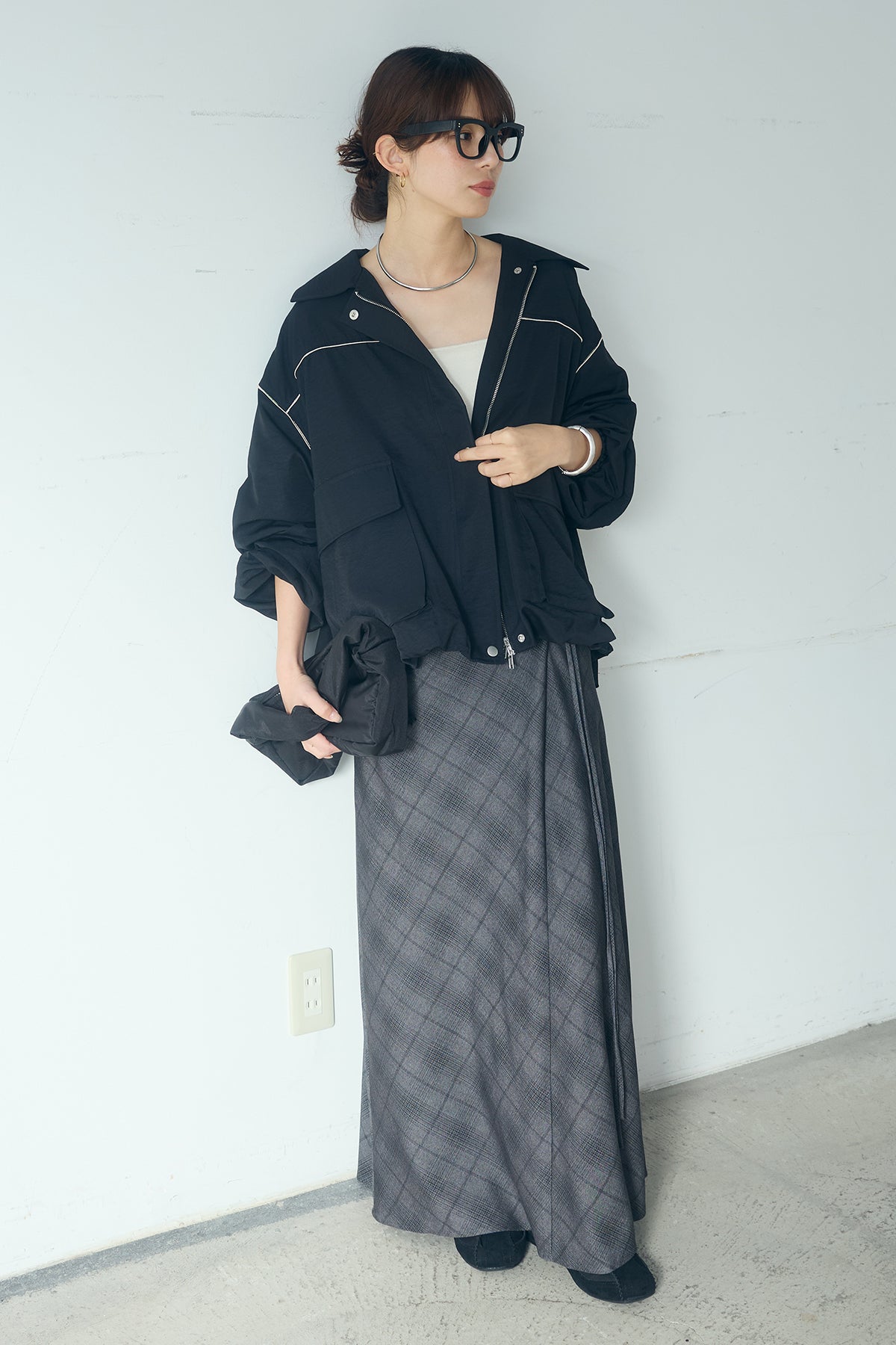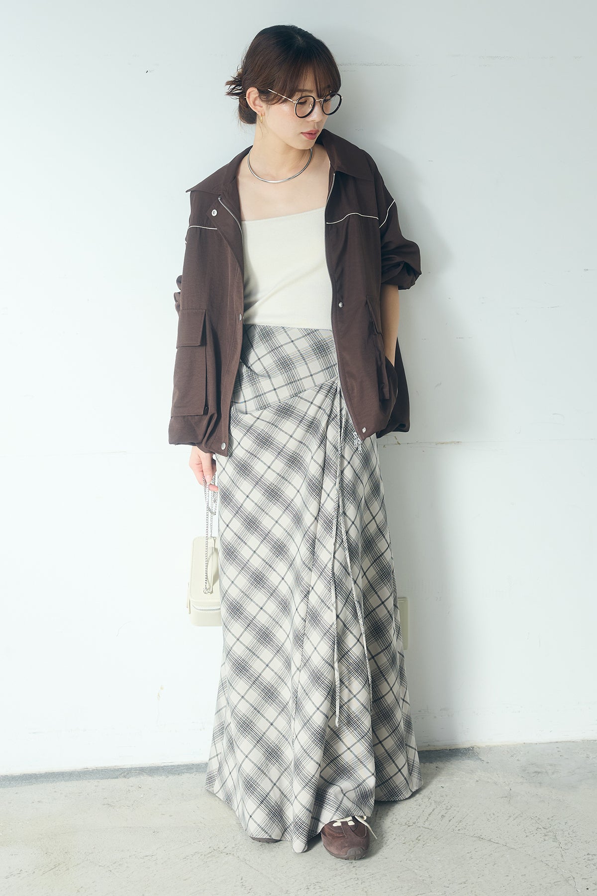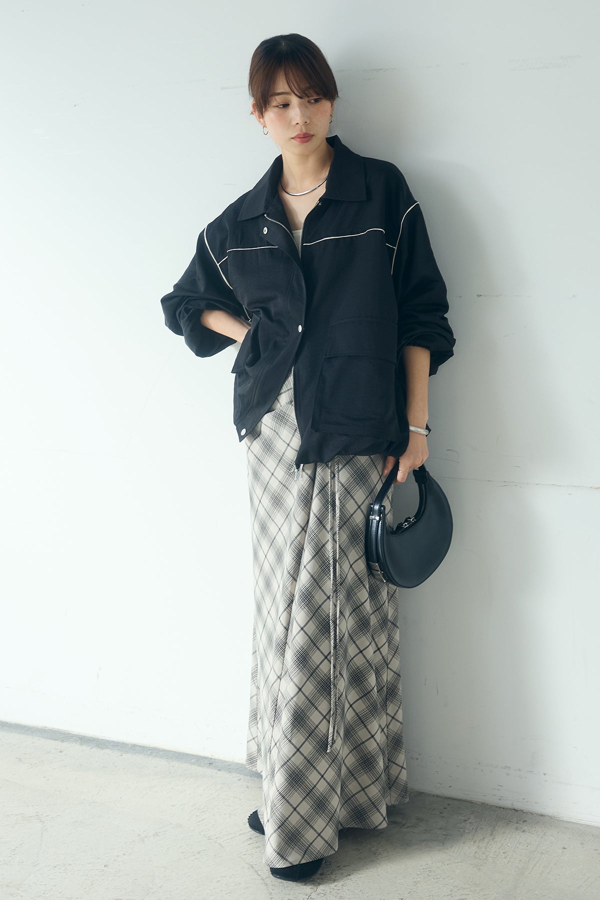 [SET]合繊ツイルバルーンジャケット+タータンチェック柄フロントデザインスカート(2set)