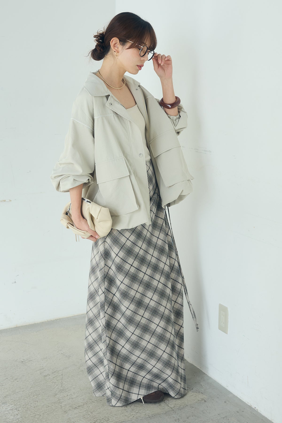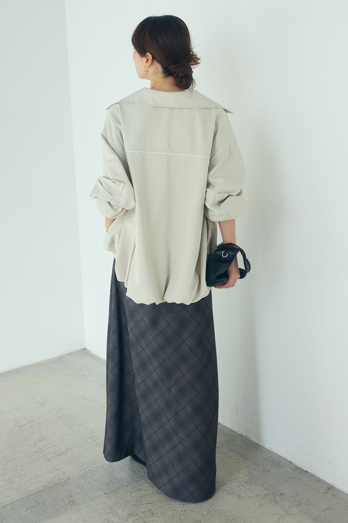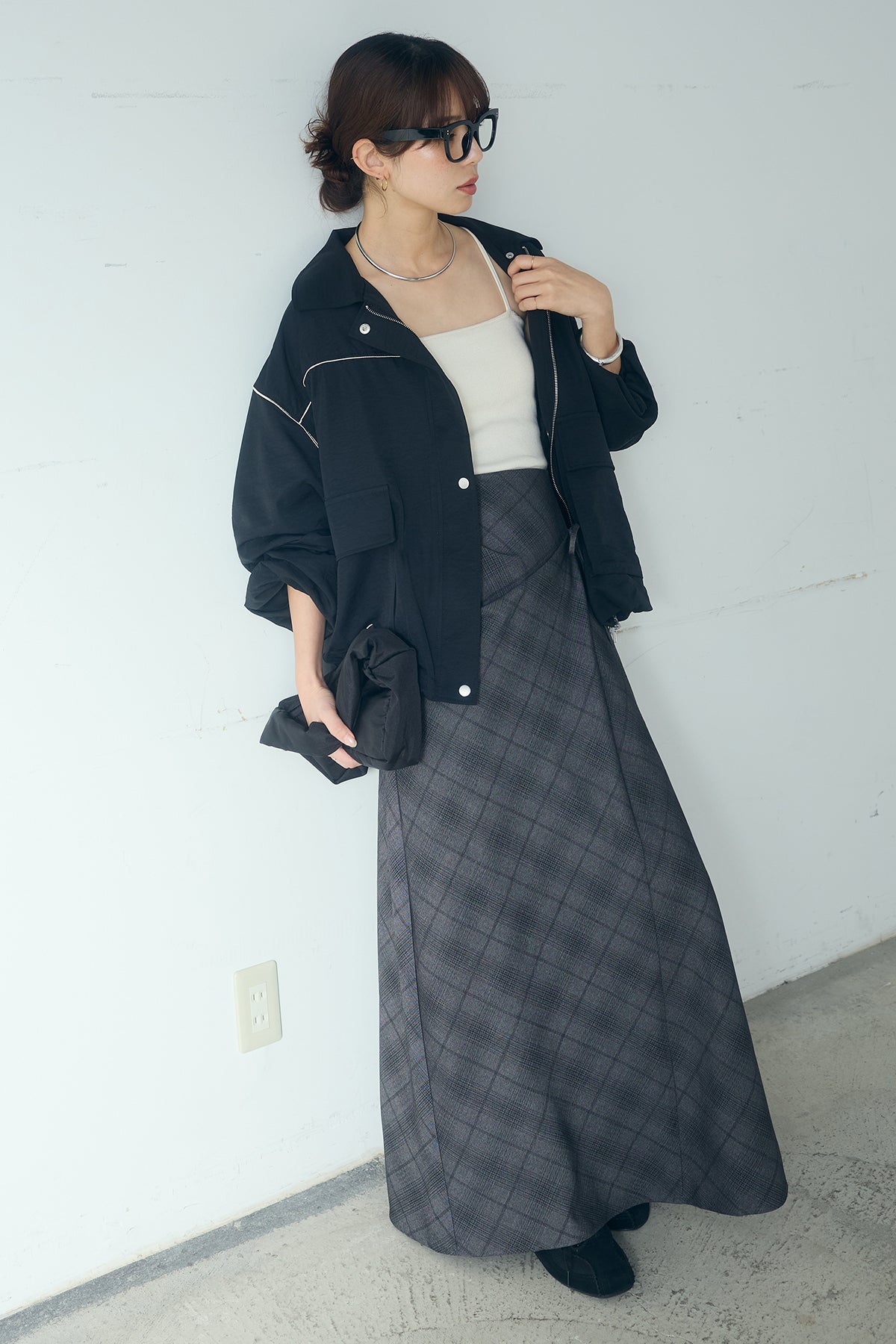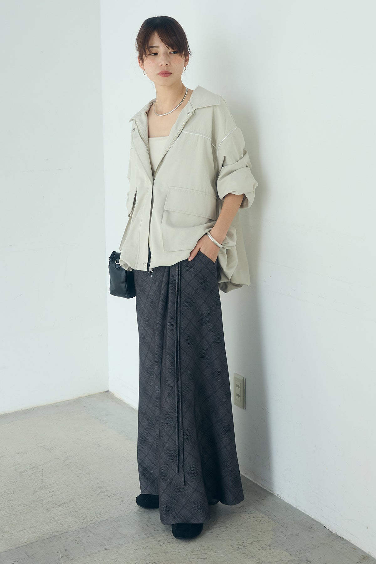[SET]合繊ツイルバルーンジャケット+タータンチェック柄フロントデザインスカート(2set)