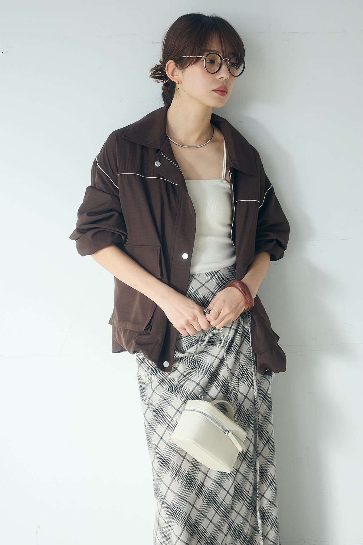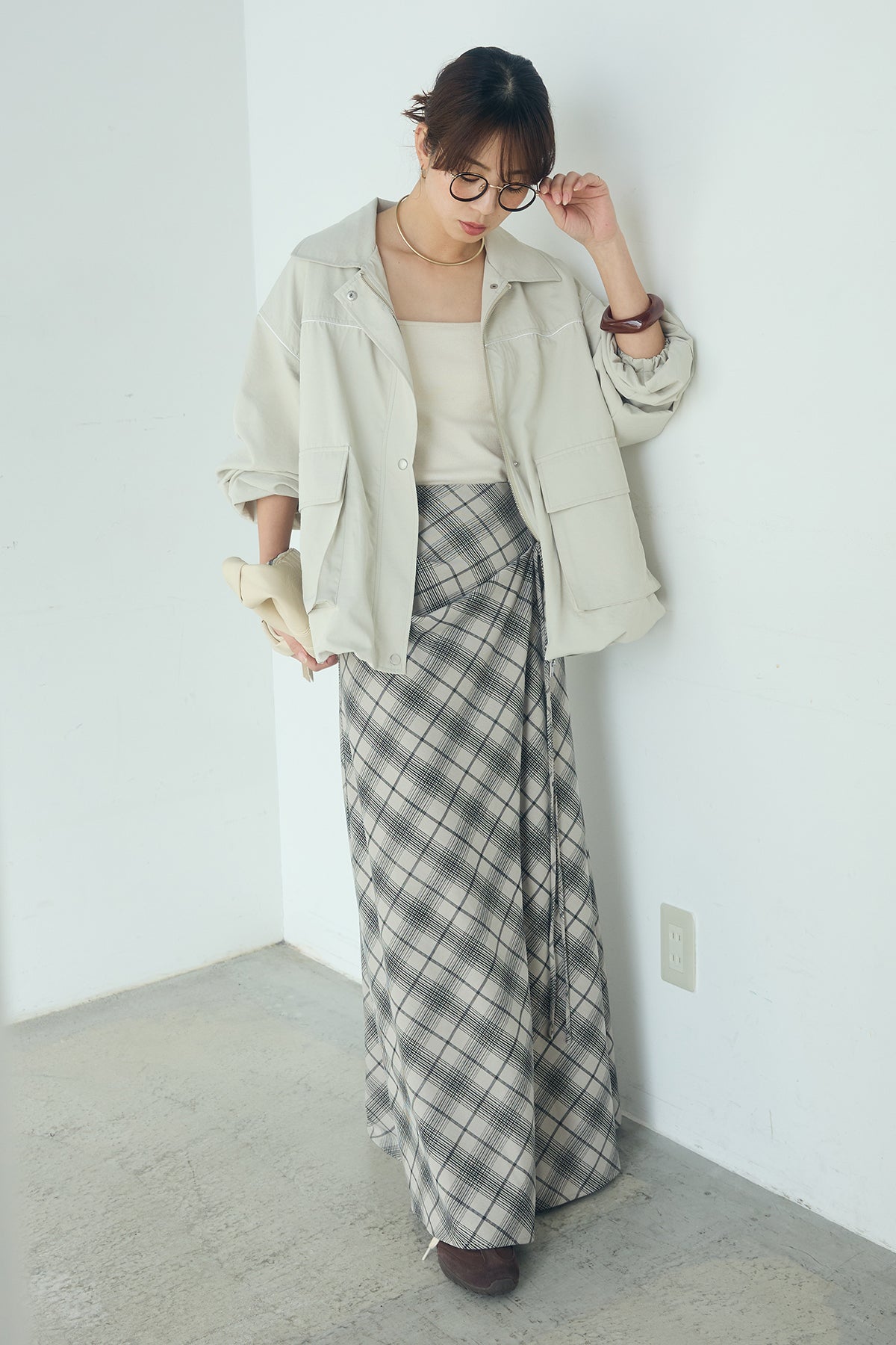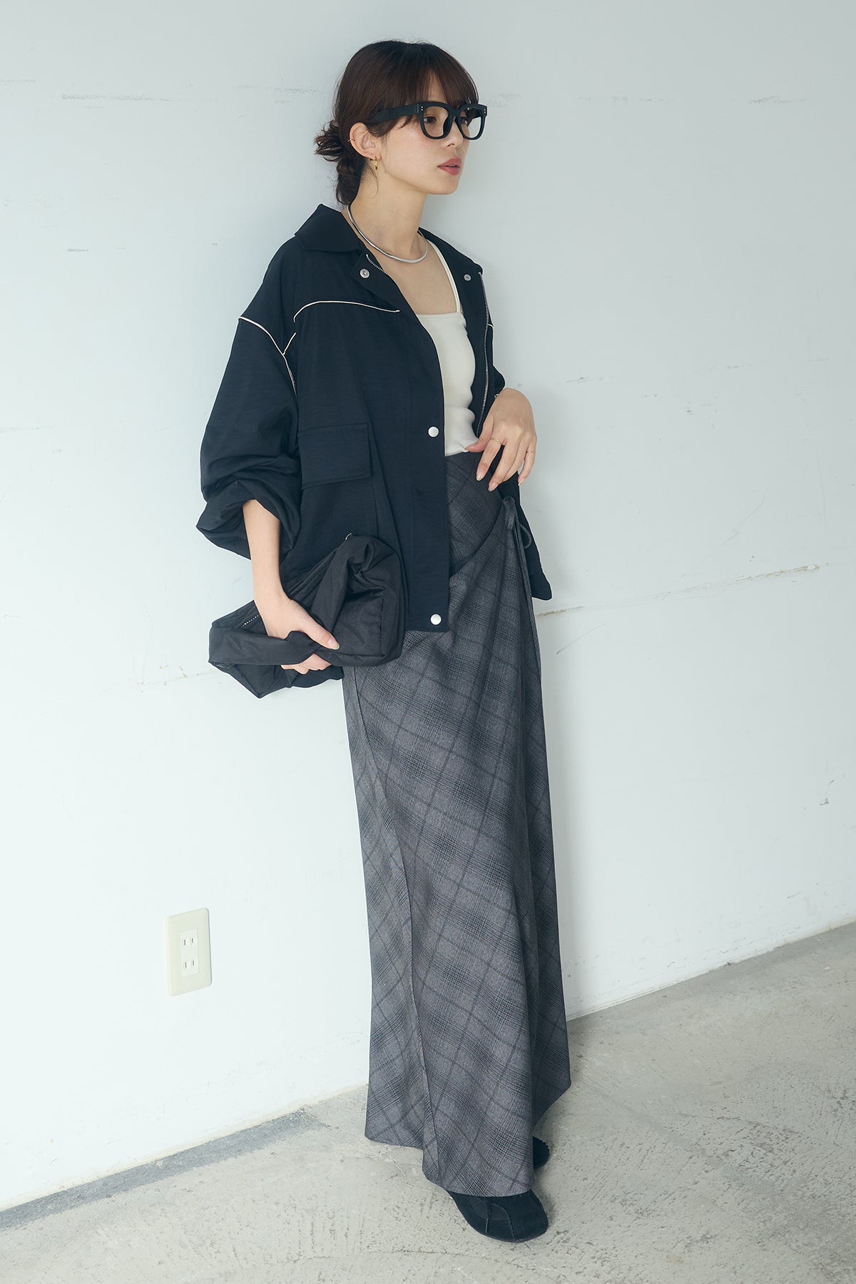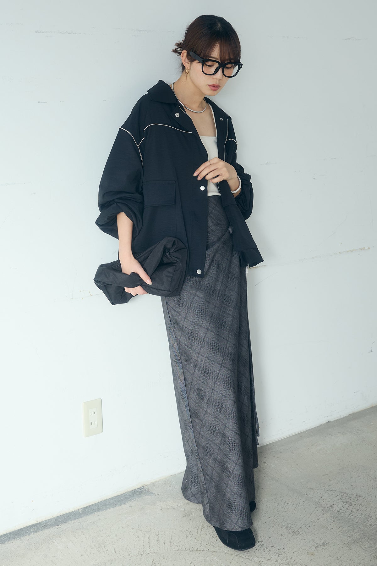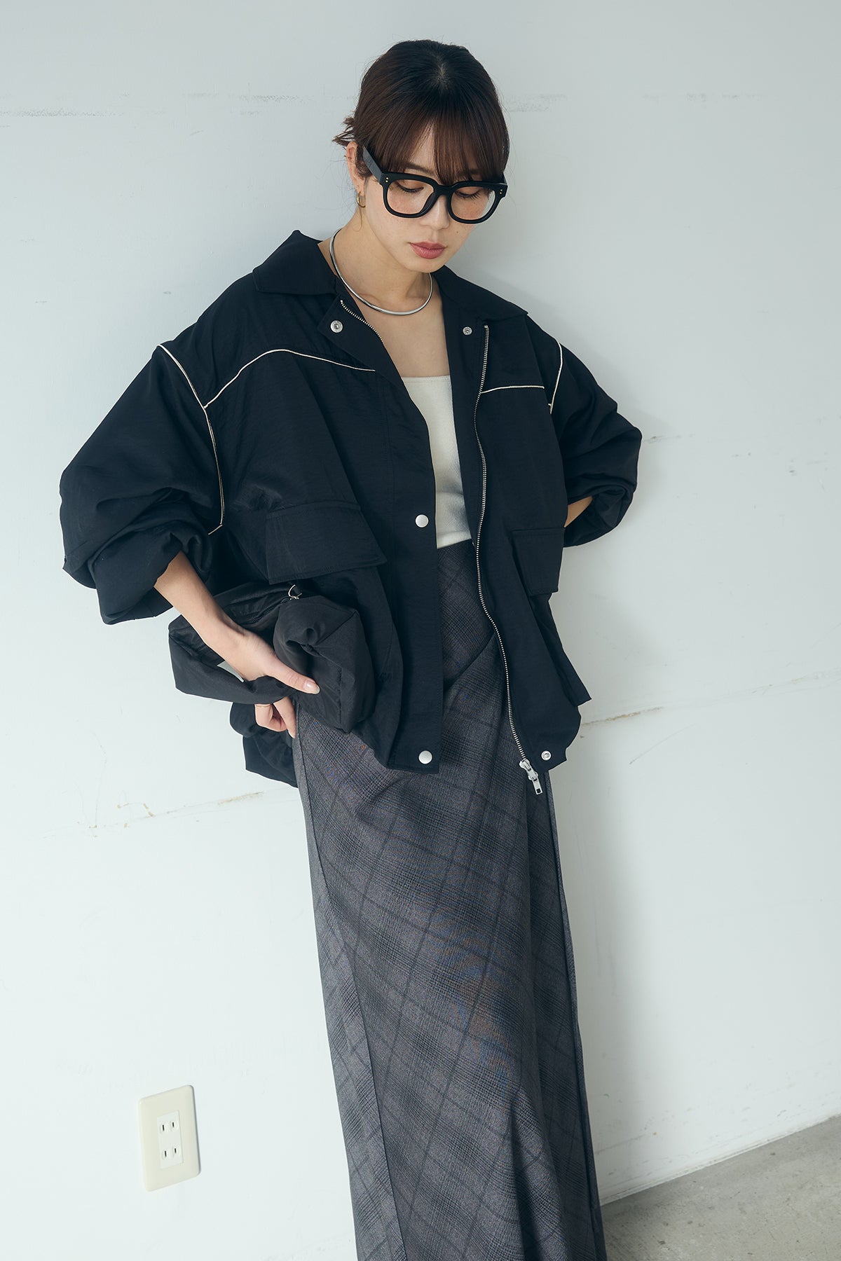 [SET]合繊ツイルバルーンジャケット+タータンチェック柄フロントデザインスカート(2set)