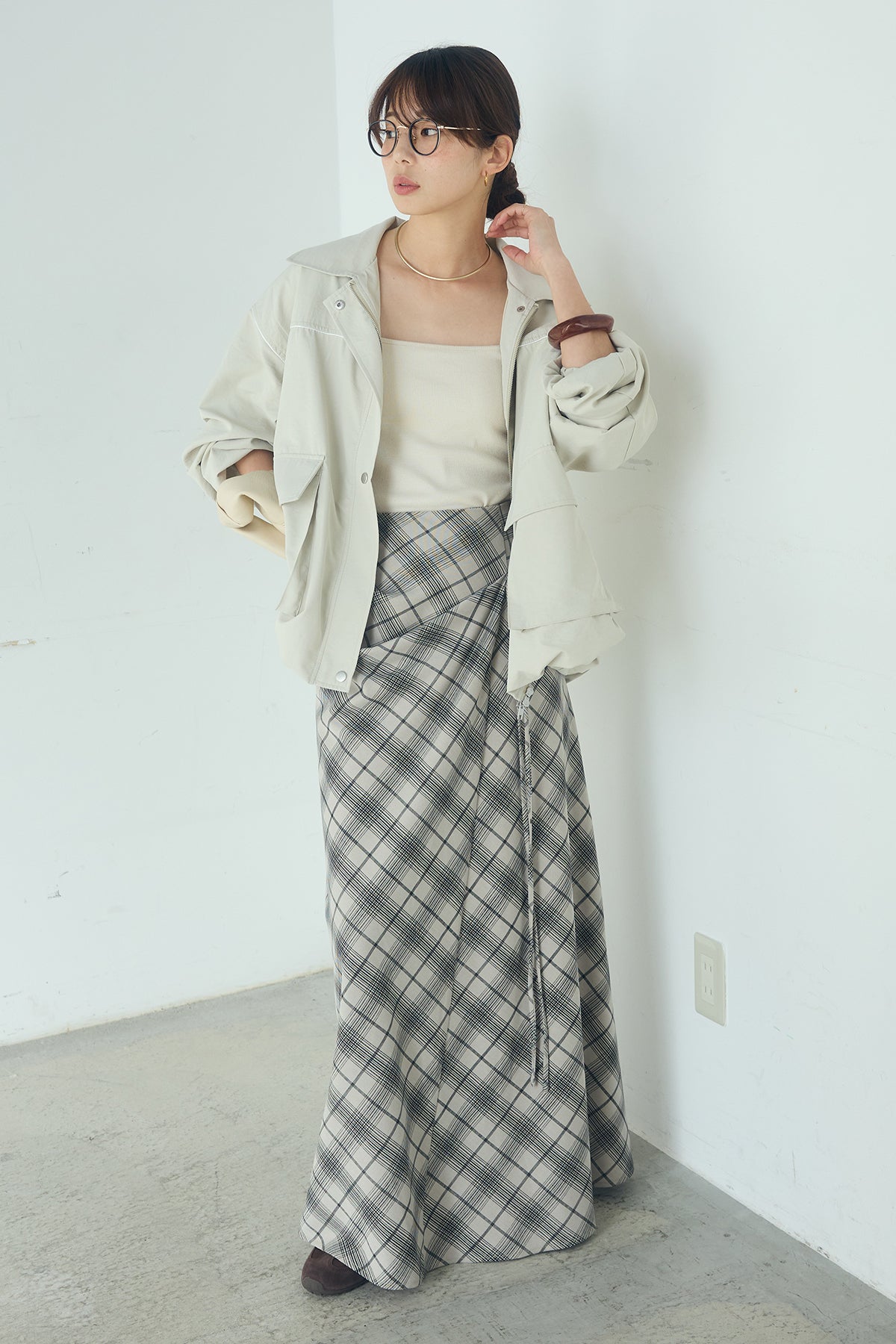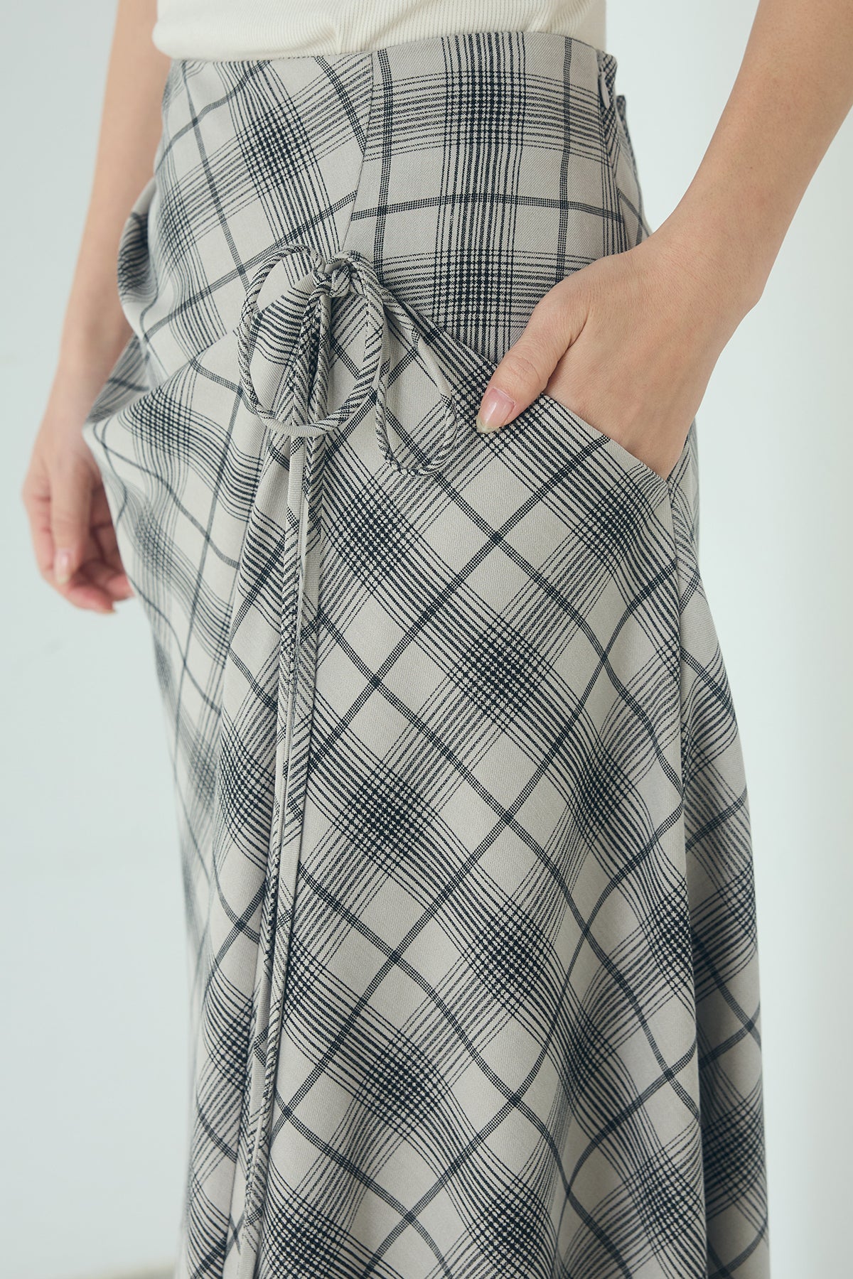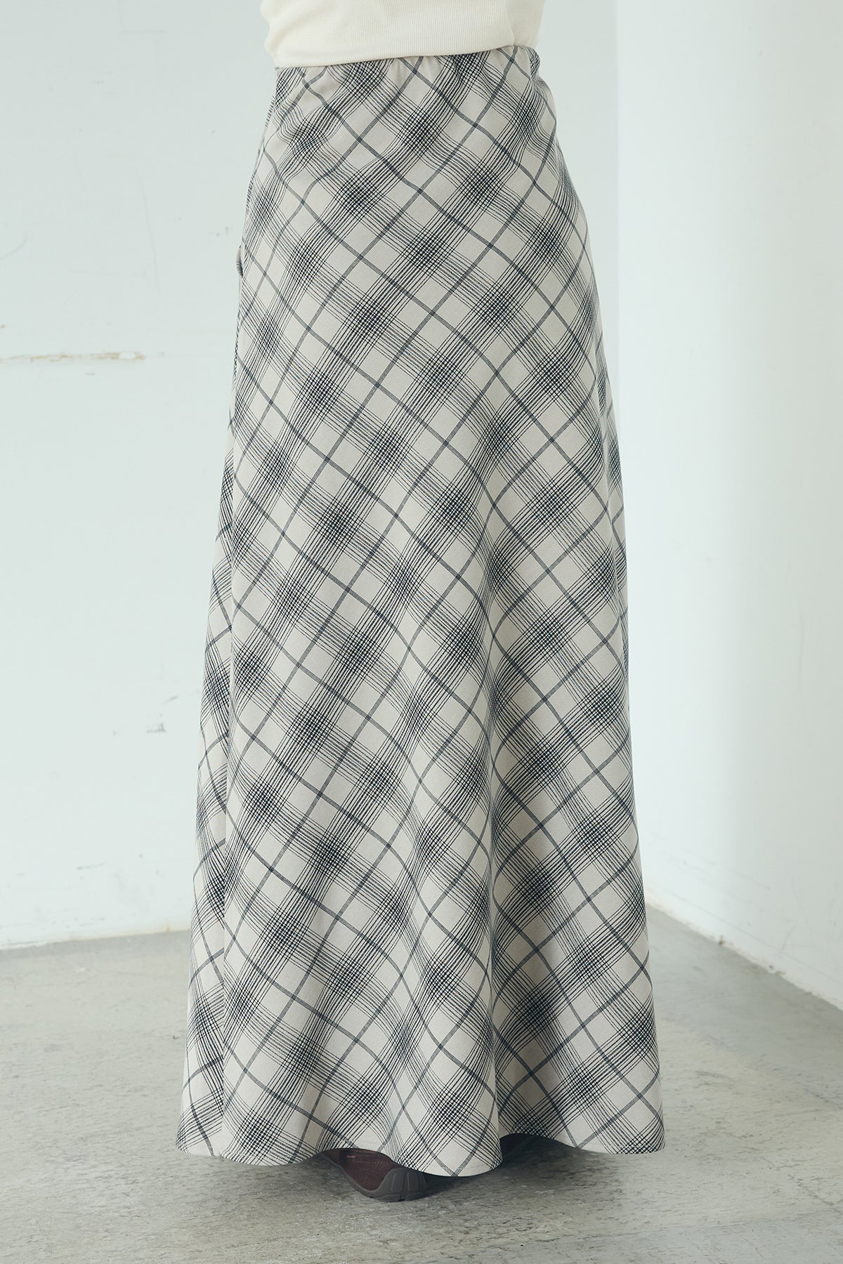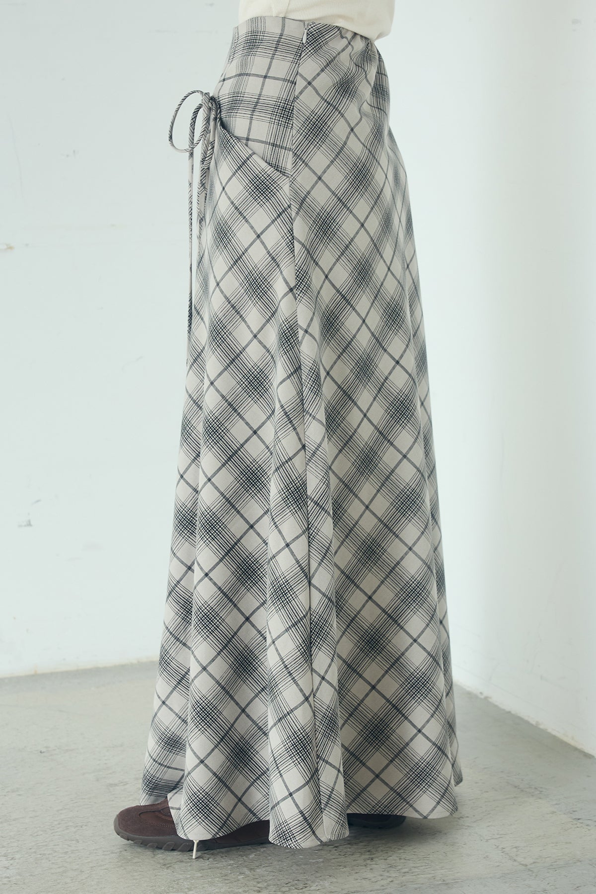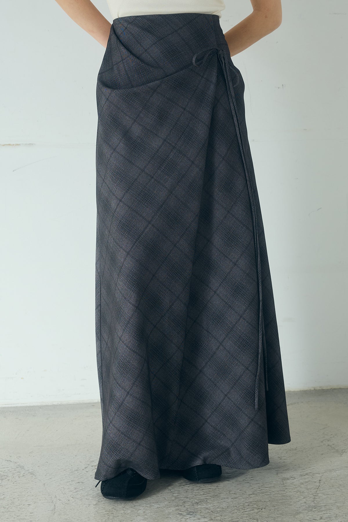 タータンチェック柄フロントデザインスカート フロントに施した立体的なドレープが印象的なロングスカート。 タータンチェック柄が程よい存在感を放ち、シンプルなトップスと合わせるだけでスタイリングに奥行きをプラスします。腰まわりはすっきりと見せつつ、裾にかけて広がるシルエットが自然な動きを演出。きれいめにもカジュアルにも取り入れやすい一枚です。