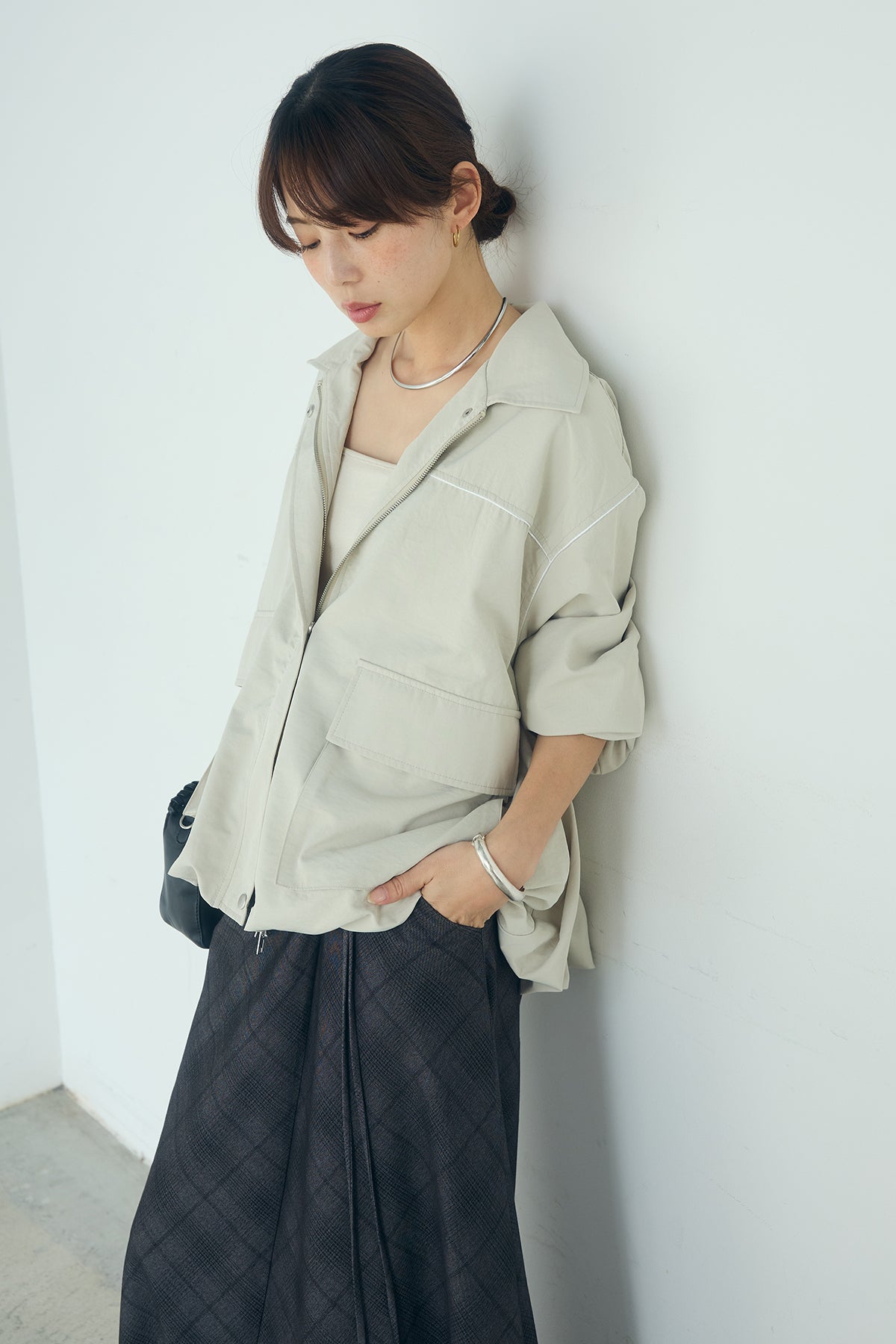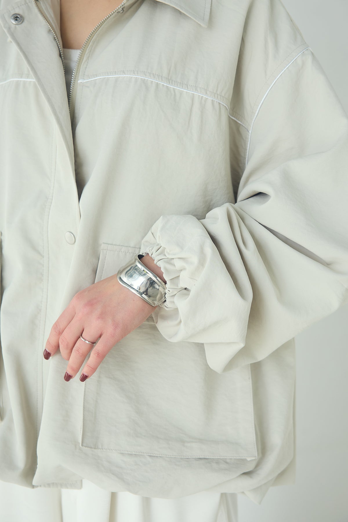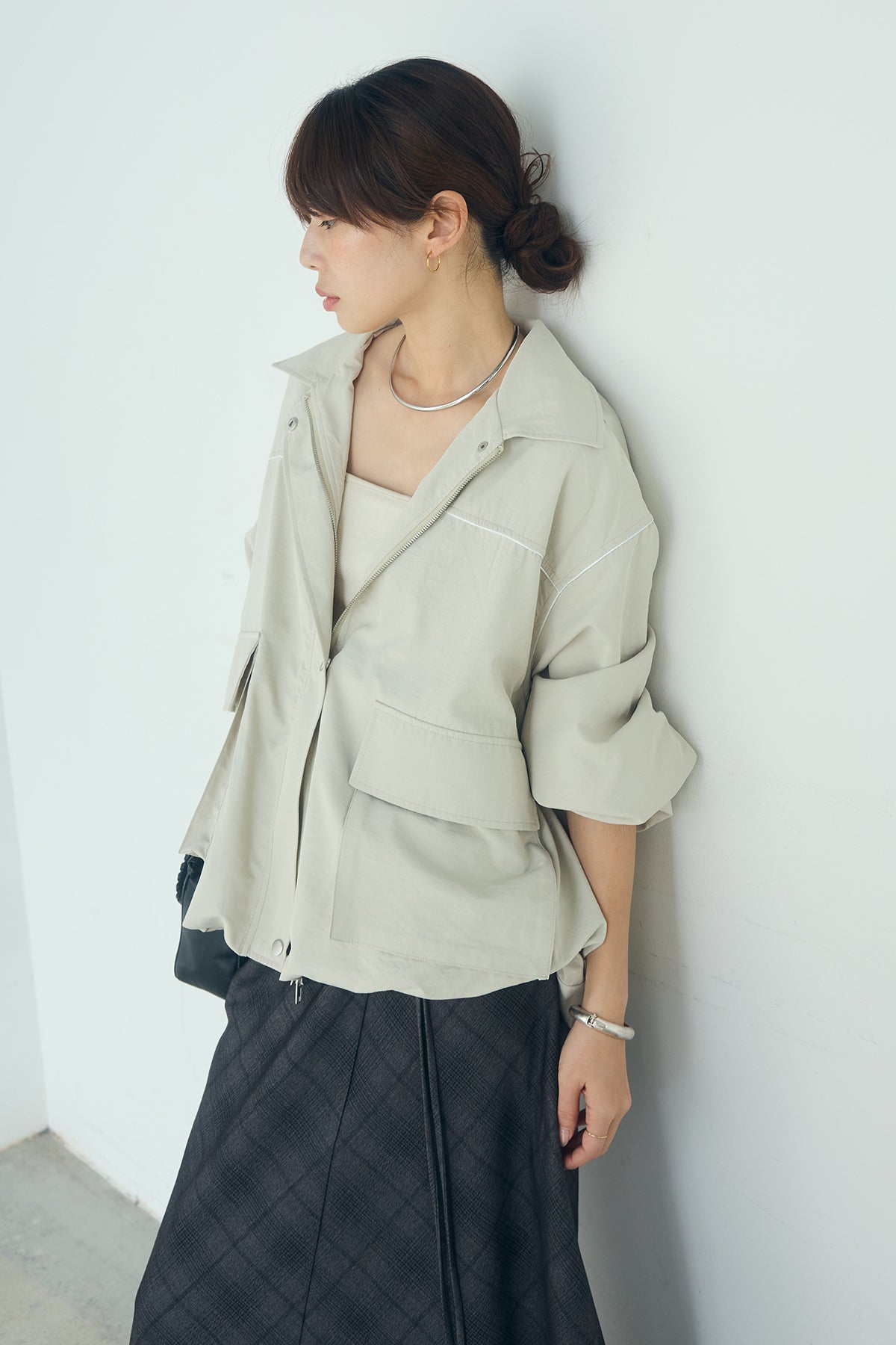 合繊ツイルバルーンジャケット ほどよくハリのある合繊ツイルが立体的なバルーンシルエットを引き立てる一着。 ゆとりのあるフォルムと大きめポケットが程よいアクセントになり、シンプルな中にも奥行きのある印象に仕上がっています。軽やかな着心地で羽織りやすく、トップスの上からさっと重ねるだけでコーディネートに動きが生まれるのもポイント。きれいめにもラフにも取り入れやすい、汎用性の高いジャケットです。