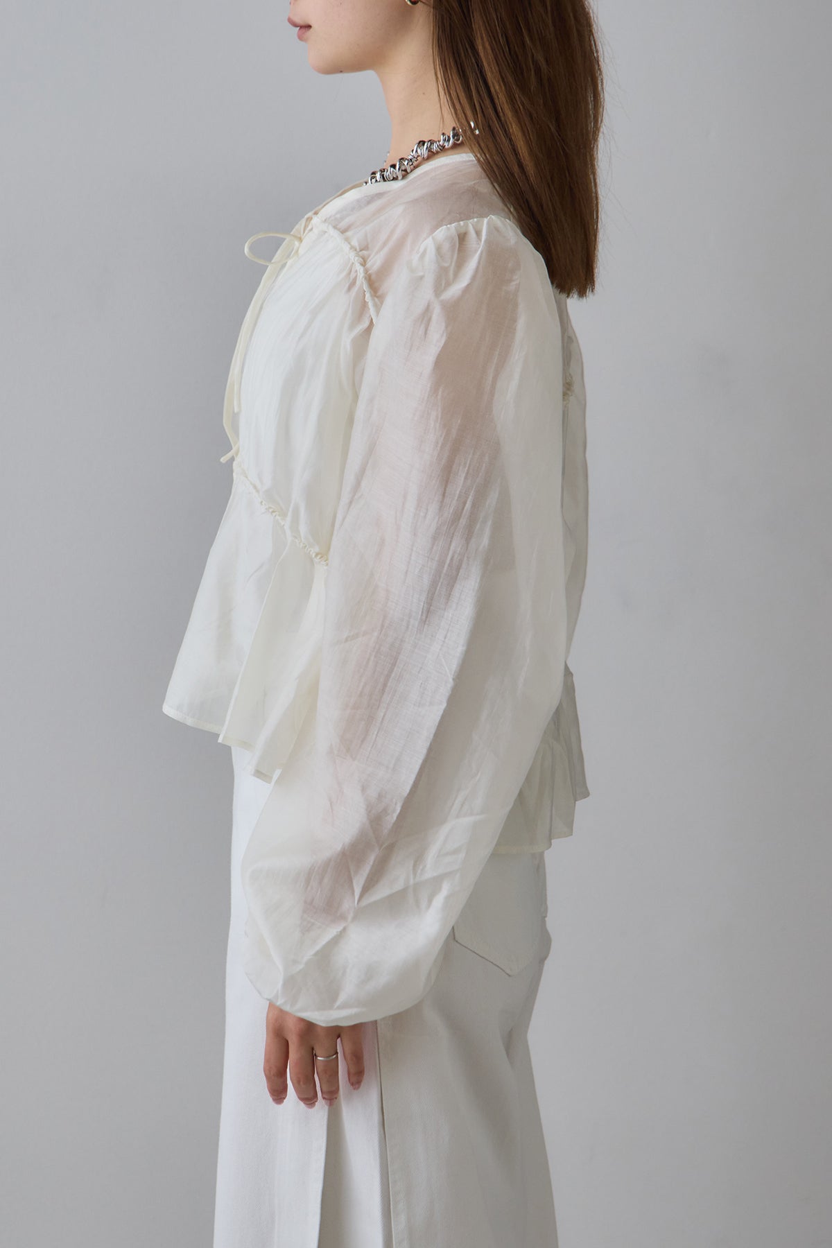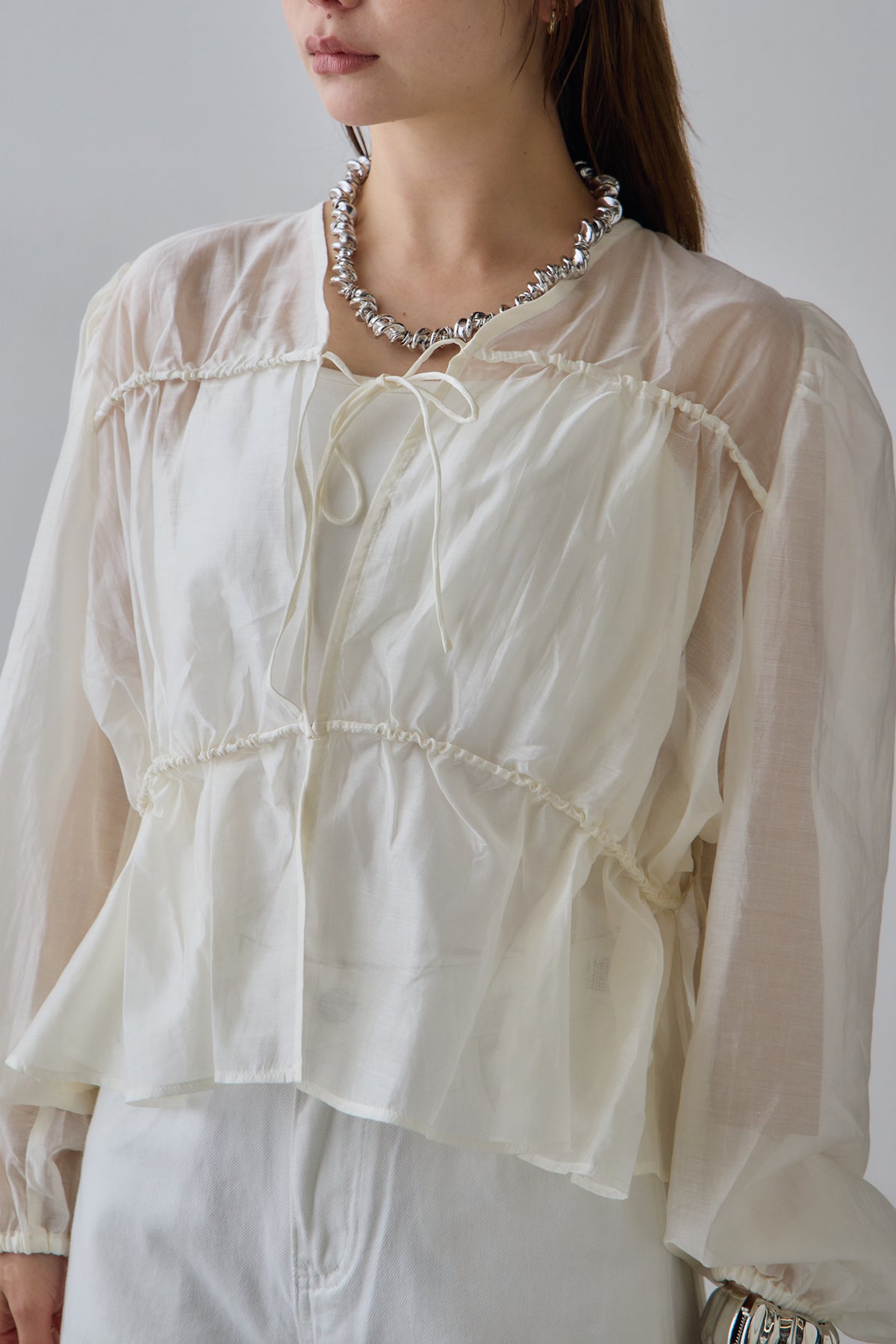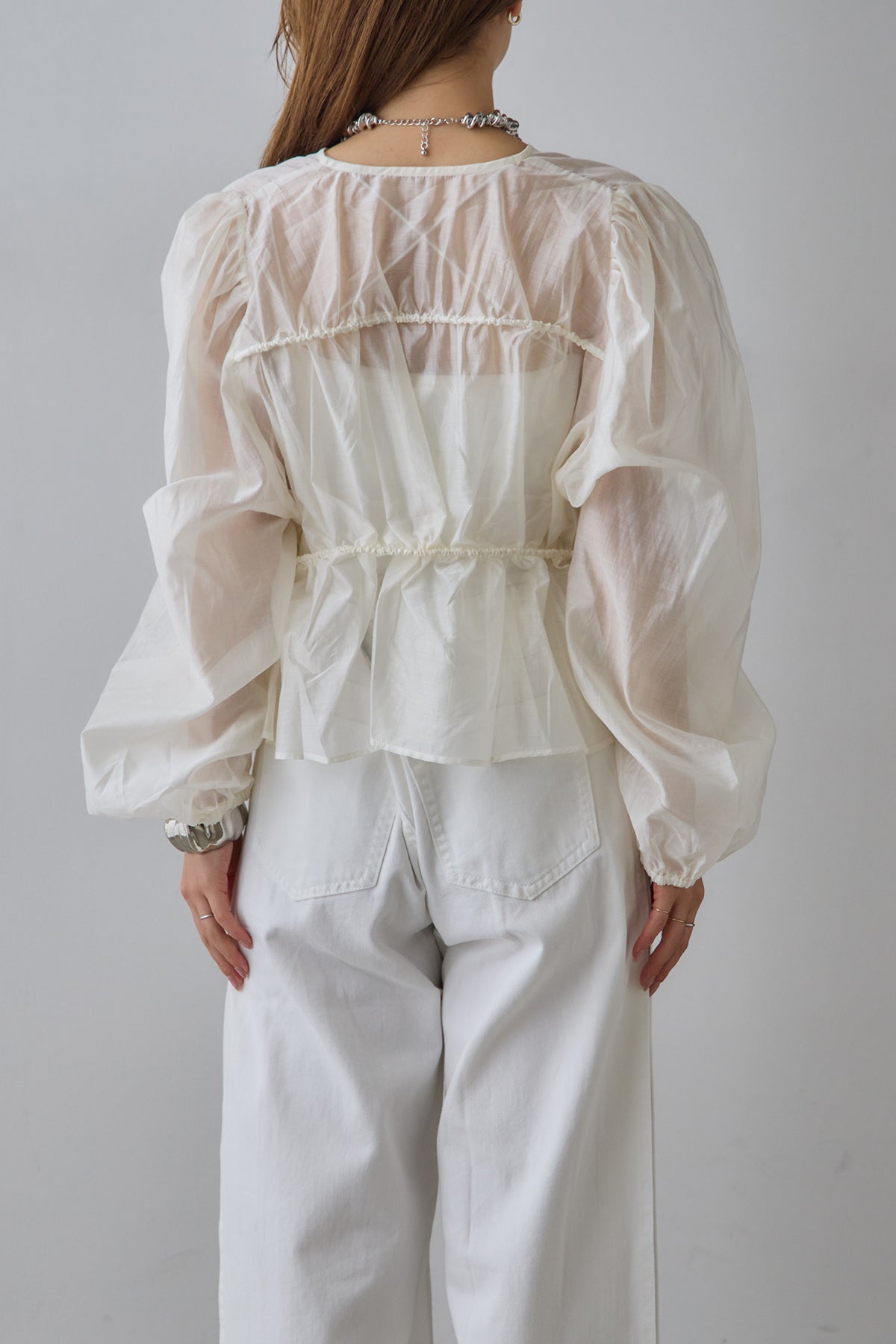 軽やかなシフォン素材が魅力のウエストドロストブラウス。透け感のあるエアリーな質感が女性らしさを引き立て、ふんわりとしたシルエットがやさしい印象に。ウエスト部分はドローストリング仕様で、絞り具合によってシルエットの変化を楽しめます。デニムやスカートとも相性抜群の、着回し力の高い一枚です。